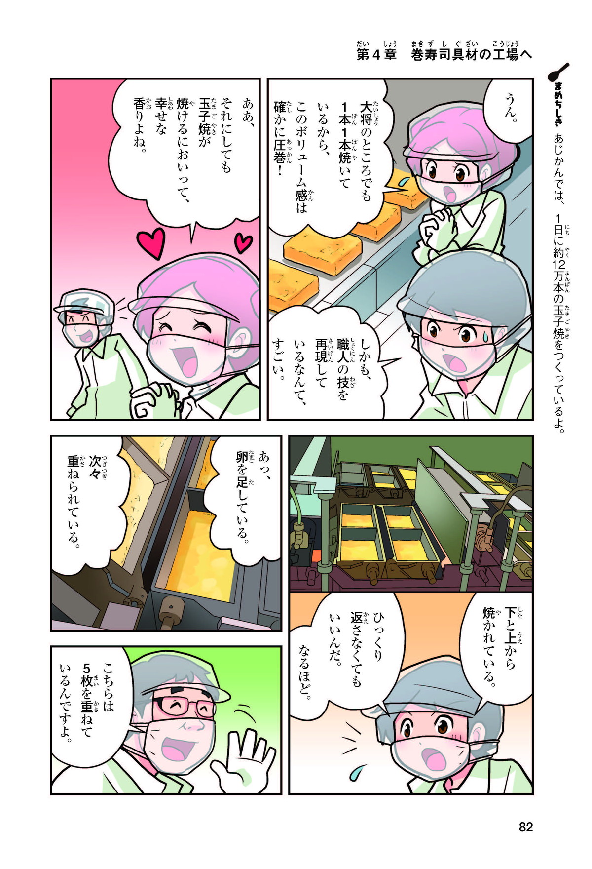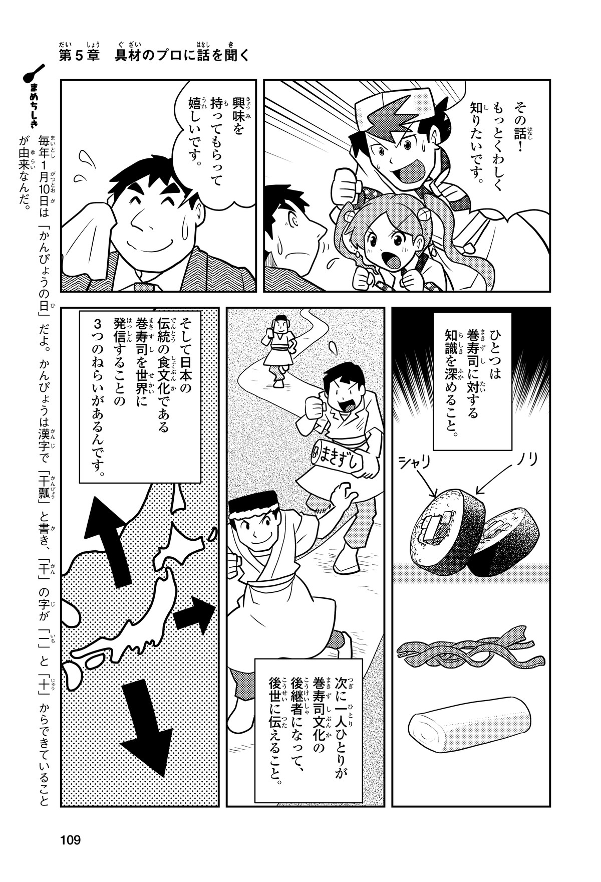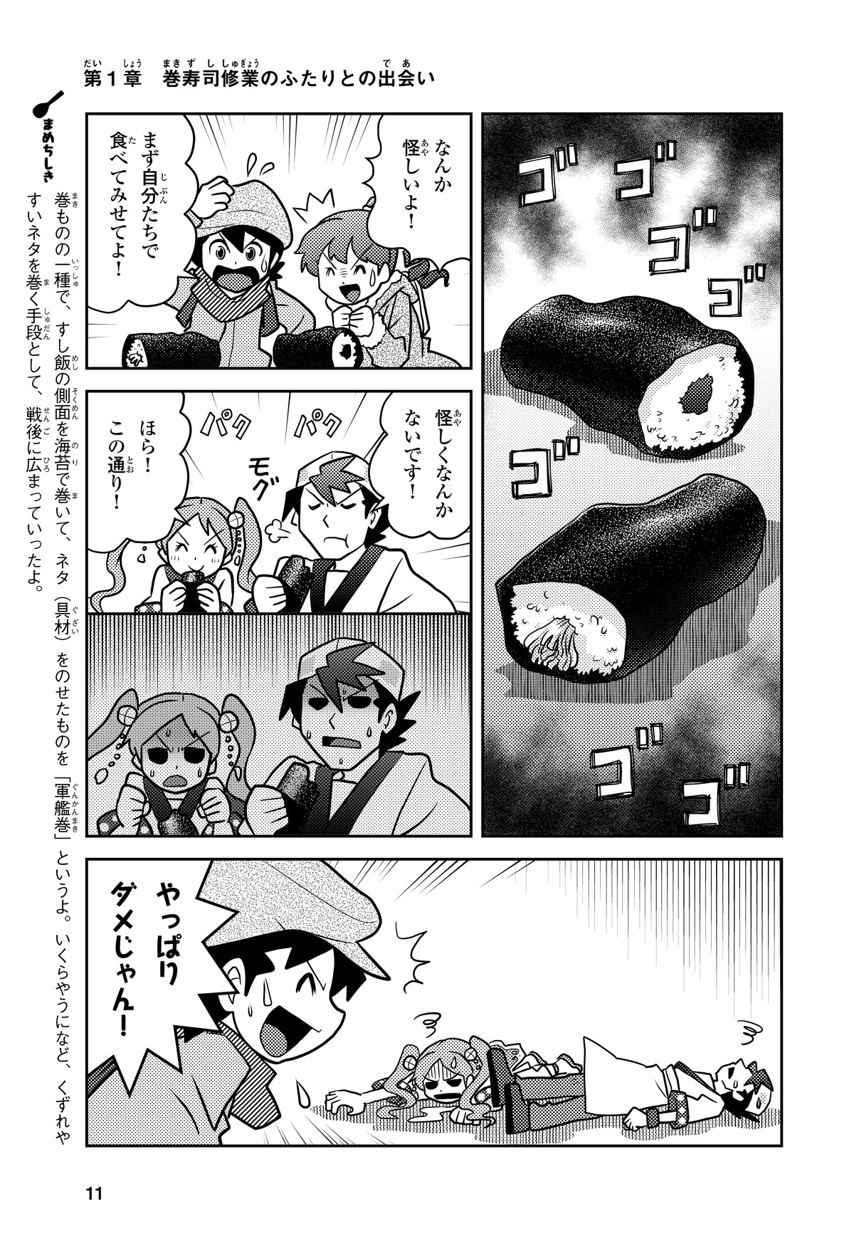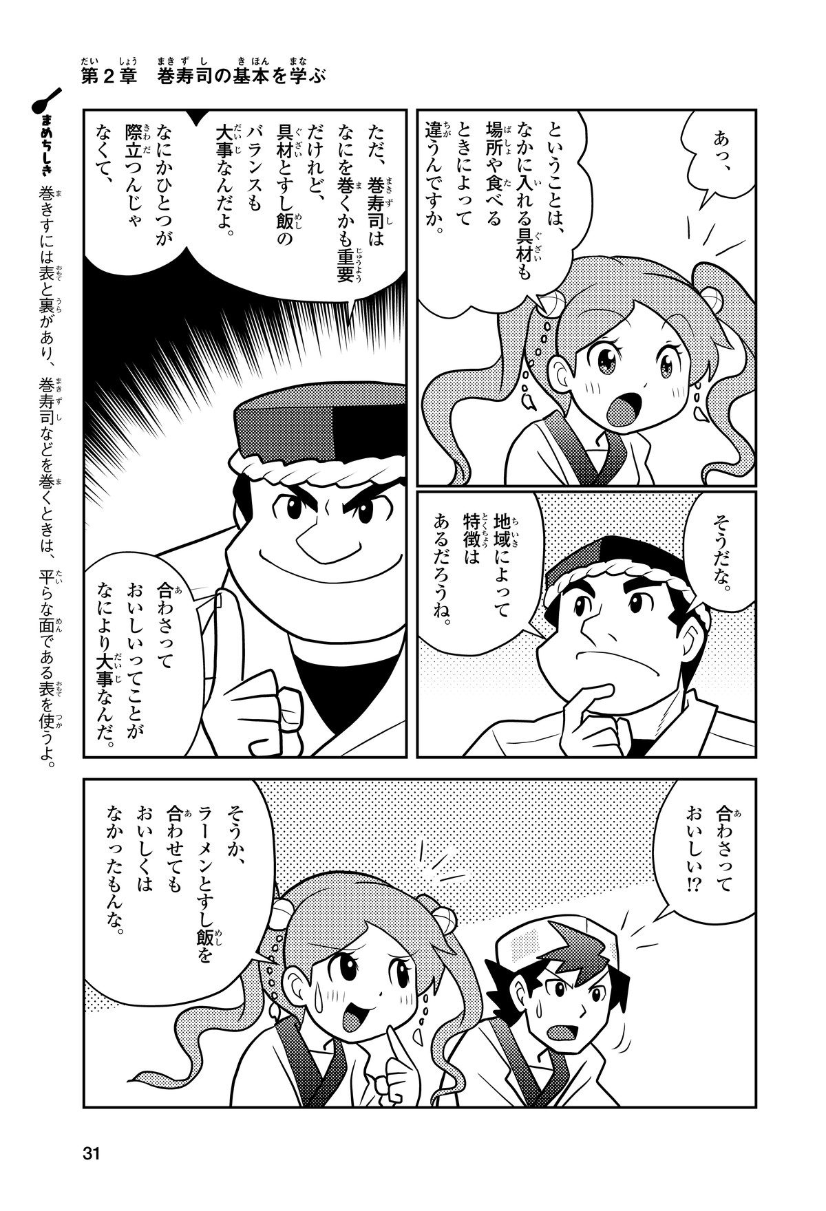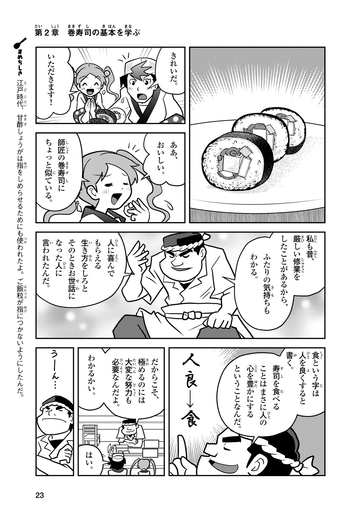 ツカサとマキは小学5年生。ツカサの家はお寿司屋さんをやっているよ。ある日、ふたりが下校していると、中国から巻寿司(まきずし)作りの修業(しゅぎょう)のためにやってきたリ・ノリとリ・シャリの兄妹(きょうだい)に遭遇(そうぐう)! ノリとシャリの兄妹が修業先を探して困っているのを見かねたツカサは、お寿司屋さんの大将をやっているお父さんに、ふたりに修業をつけてくれるようにお願いするよ。さっそくお父さんか巻寿司の歴史や、巻寿司作りの基本を教わったツカサ、マキ、ノリ、シャリの4人は、日本各地の個性(こせい)ある巻寿司をたずねたり、巻寿司の具材(ぐざい)の工場を見学しに行ったりと、本格的な巻寿司作りの修業をスタート! おいしい巻寿司作りのひみつをみつけていくよ!
