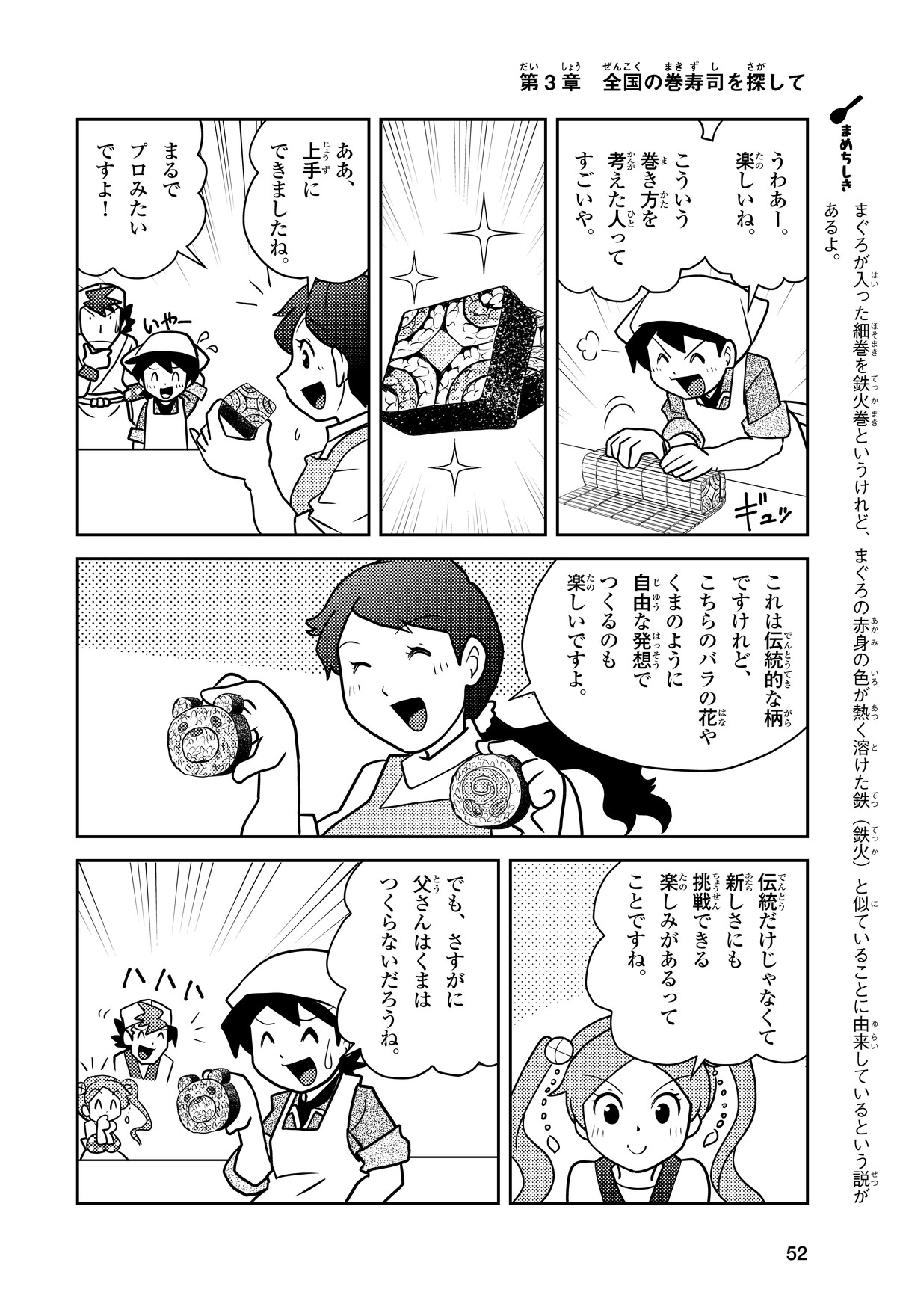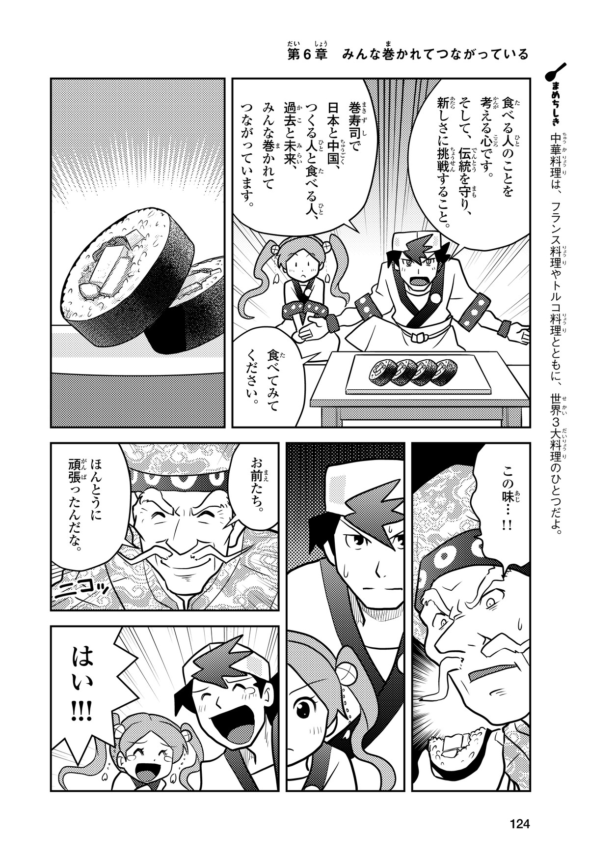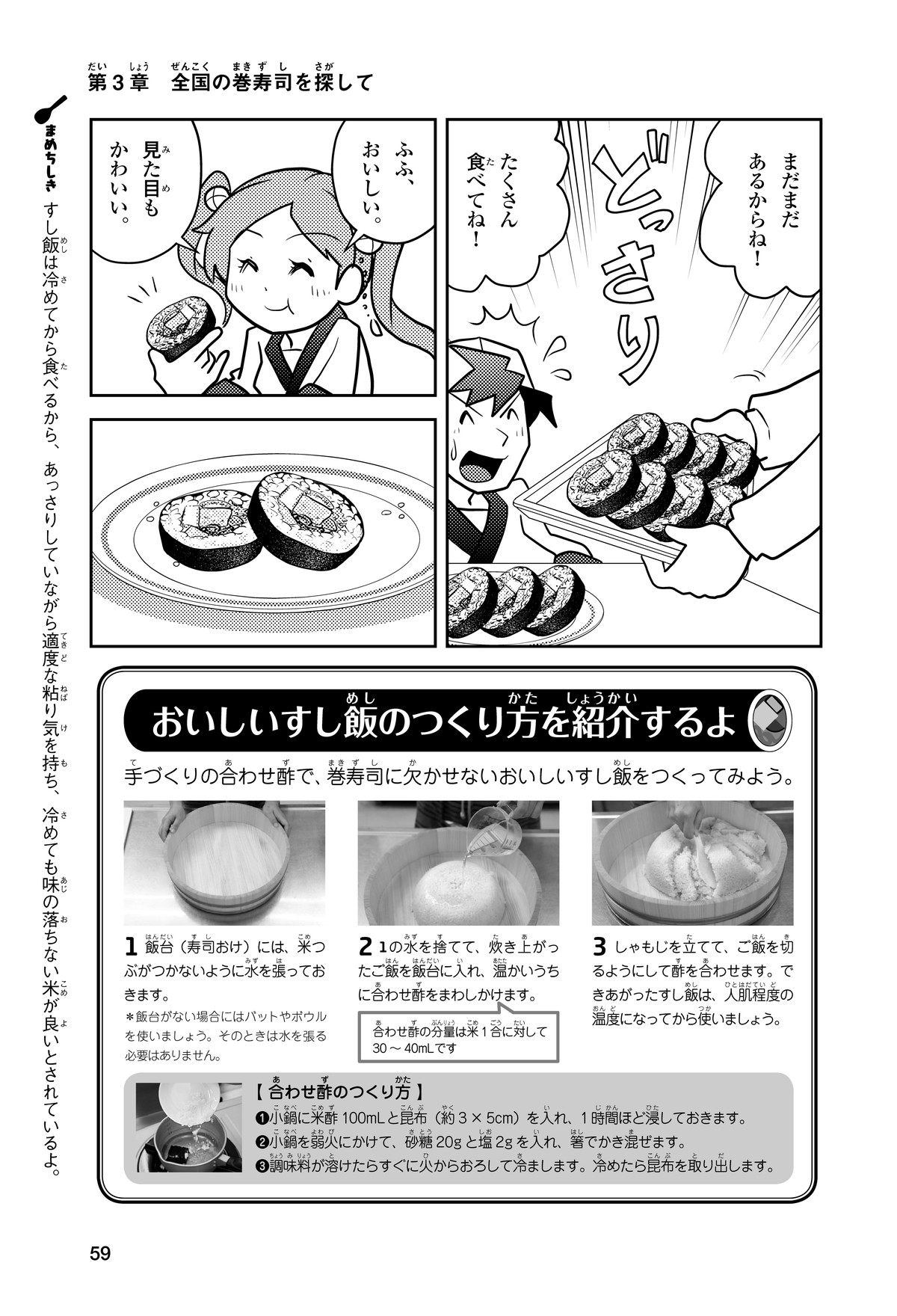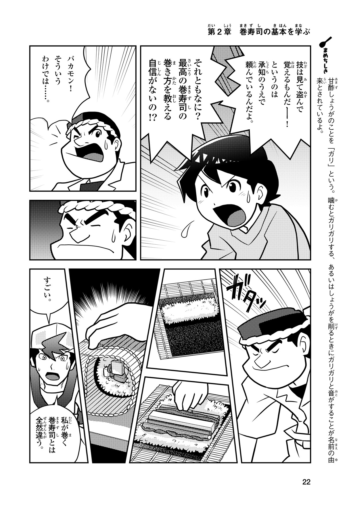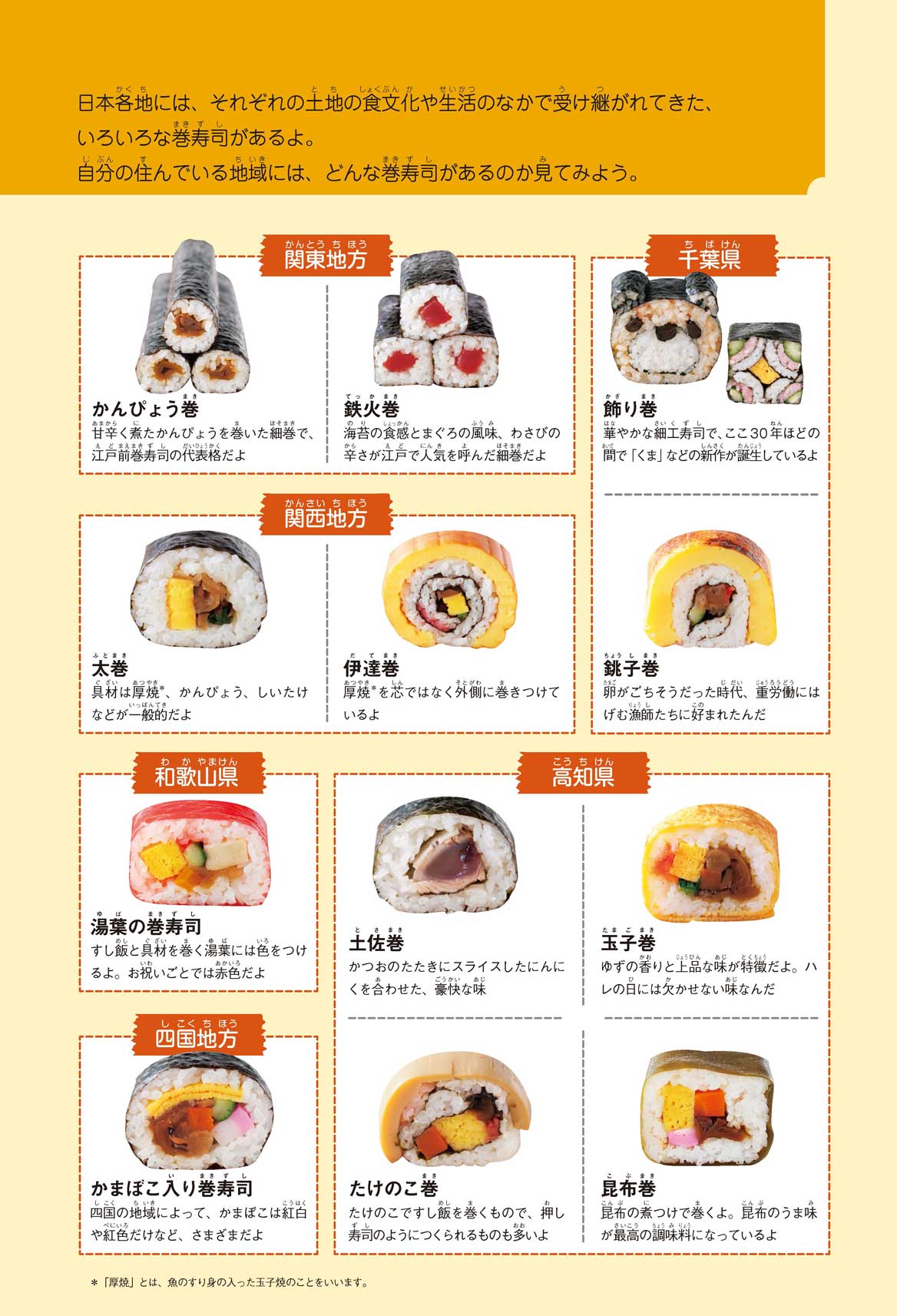 ツカサとマキは小学5年生。ツカサの家はお寿司屋さんをやっているよ。ある日、ふたりが下校していると、中国から巻寿司(まきずし)作りの修業(しゅぎょう)のためにやってきたリ・ノリとリ・シャリの兄妹(きょうだい)に遭遇(そうぐう)! ノリとシャリの兄妹が修業先を探して困っているのを見かねたツカサは、お寿司屋さんの大将をやっているお父さんに、ふたりに修業をつけてくれるようにお願いするよ。さっそくお父さんか巻寿司の歴史や、巻寿司作りの基本を教わったツカサ、マキ、ノリ、シャリの4人は、日本各地の個性(こせい)ある巻寿司をたずねたり、巻寿司の具材(ぐざい)の工場を見学しに行ったりと、本格的な巻寿司作りの修業をスタート! おいしい巻寿司作りのひみつをみつけていくよ!