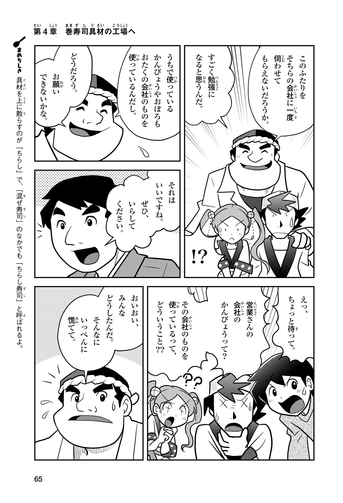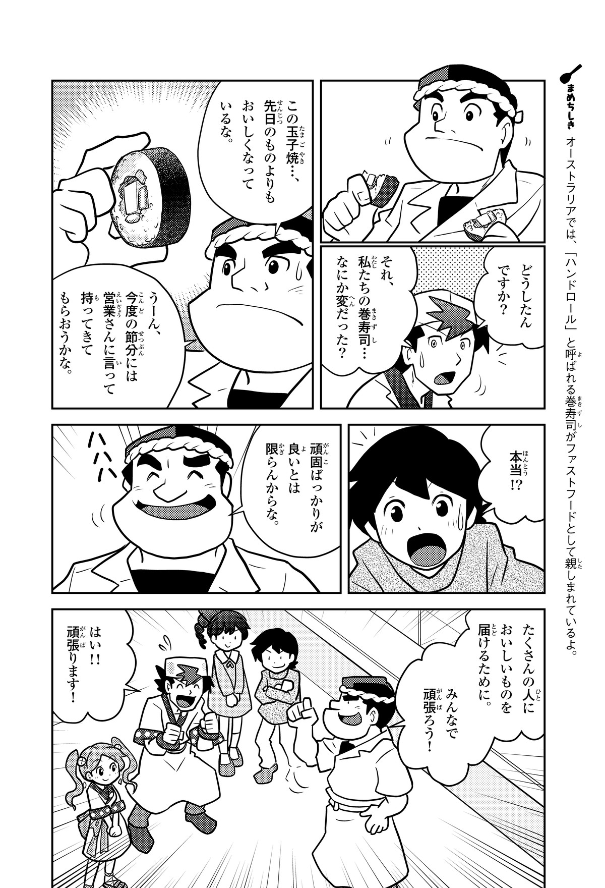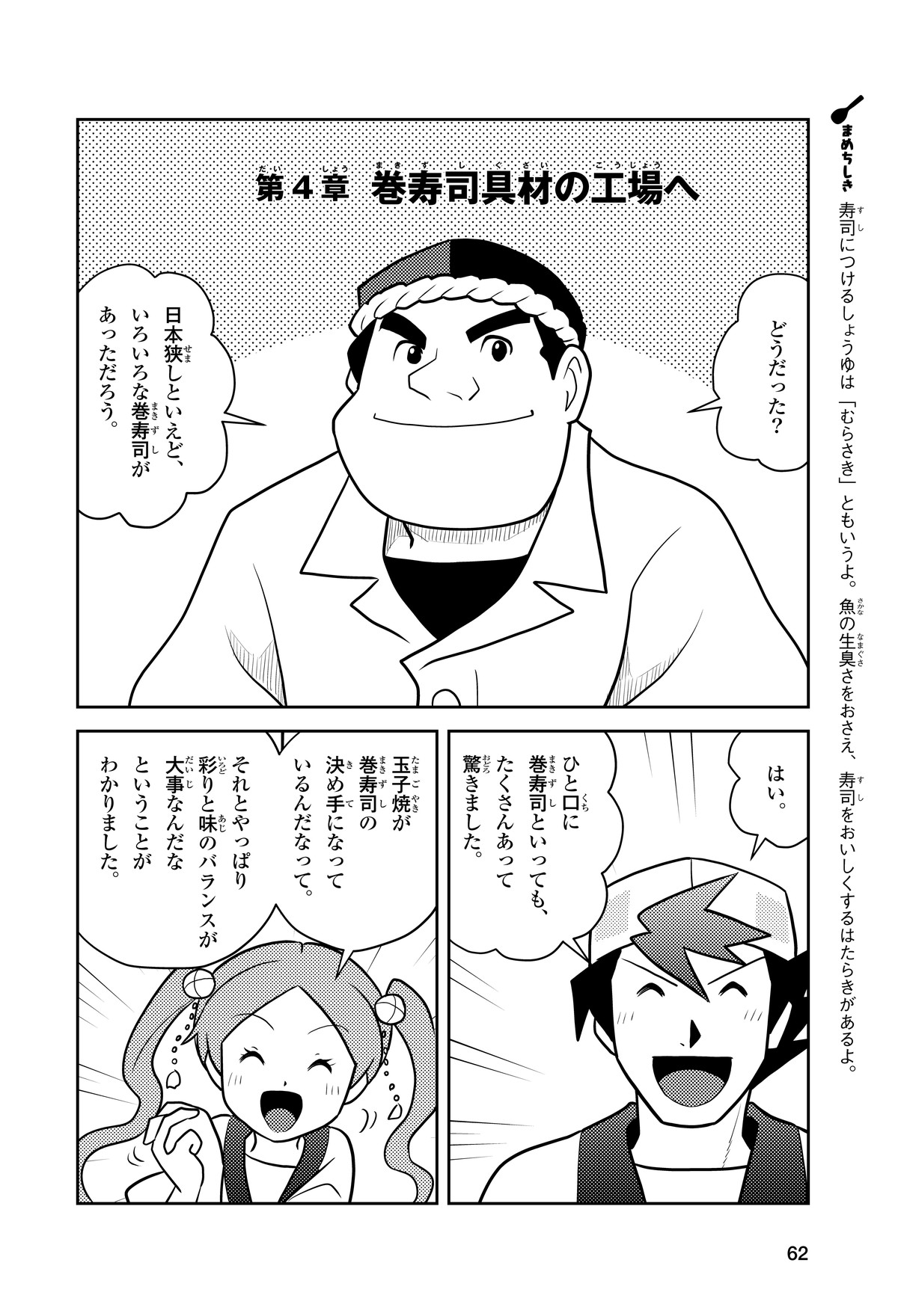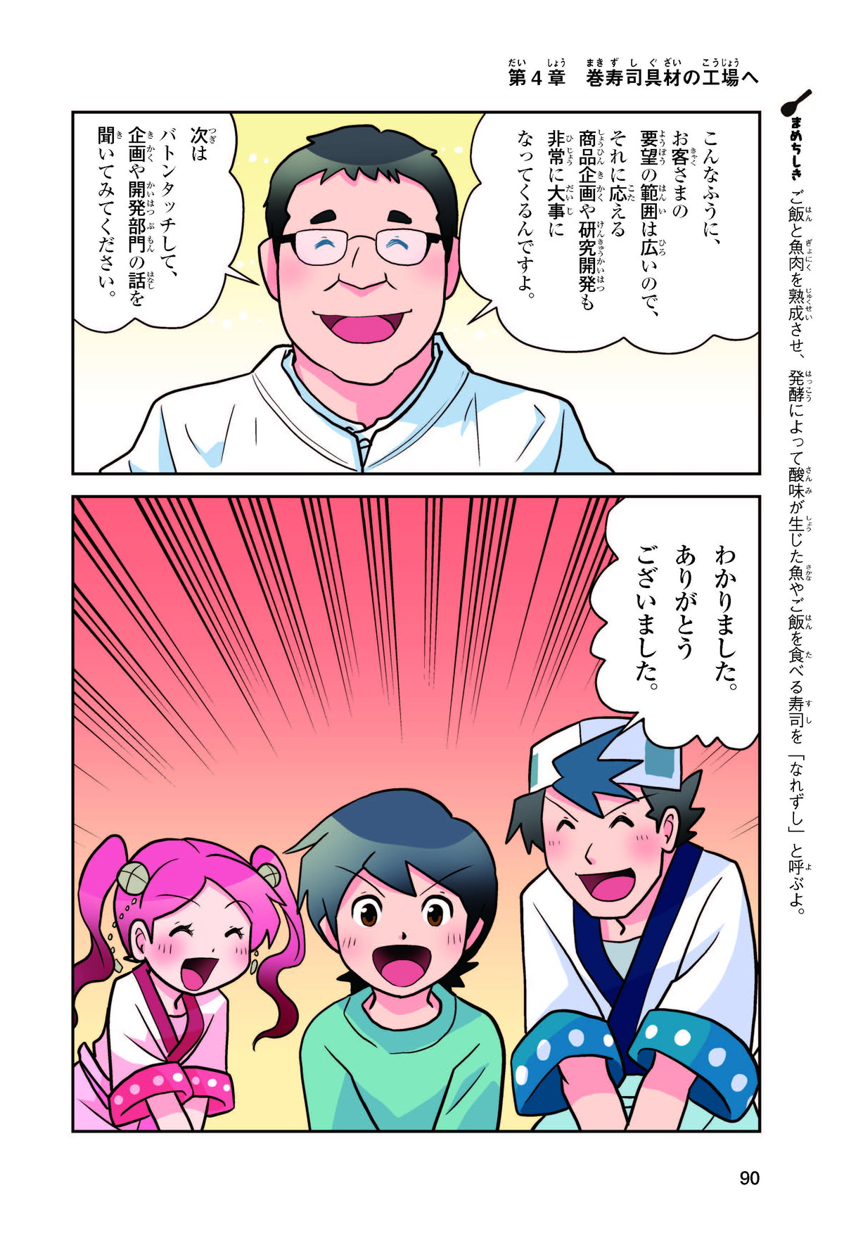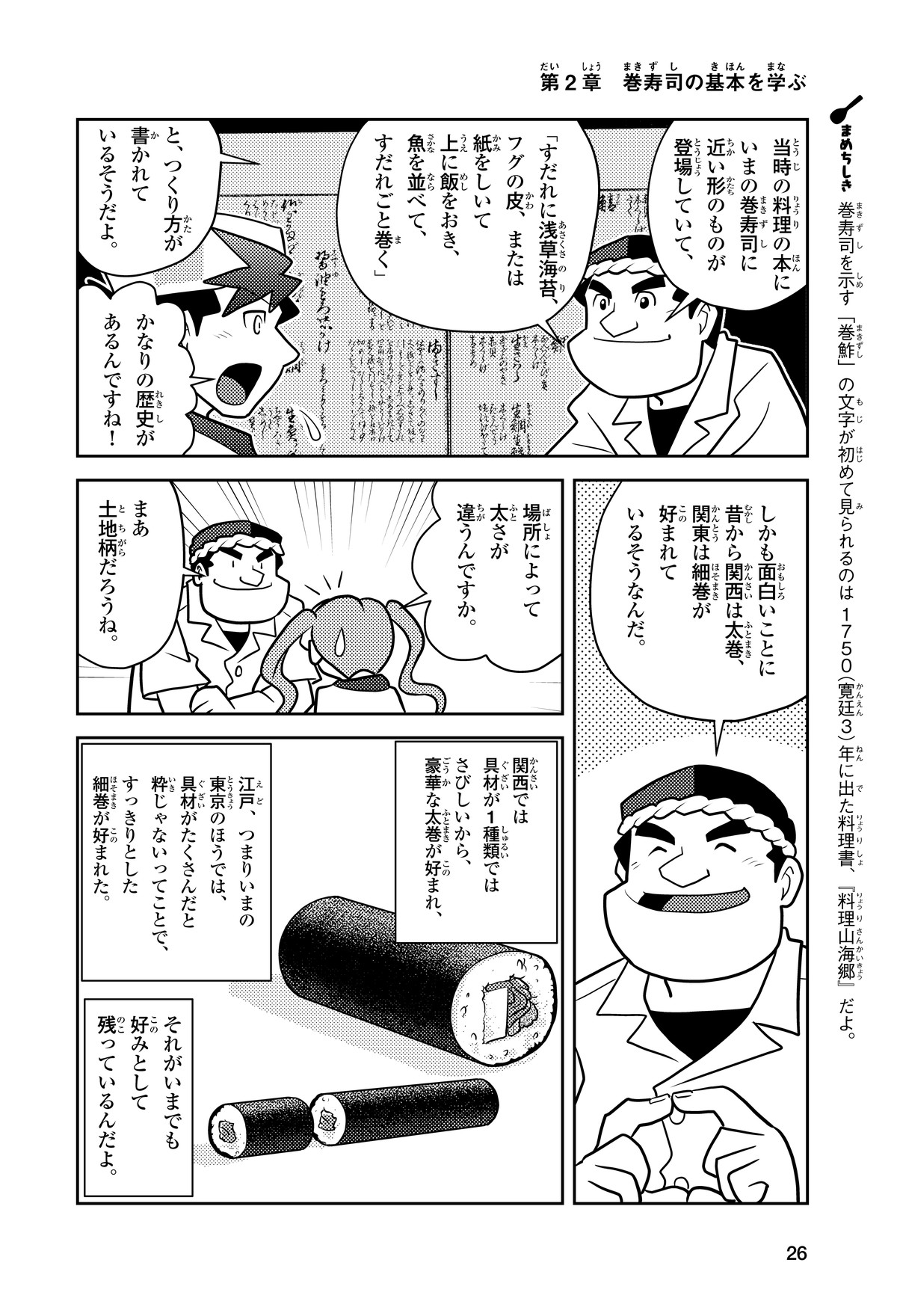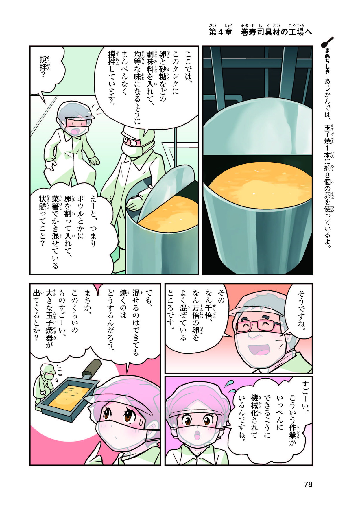 ツカサとマキは小学5年生。ツカサの家はお寿司屋さんをやっているよ。ある日、ふたりが下校していると、中国から巻寿司(まきずし)作りの修業(しゅぎょう)のためにやってきたリ・ノリとリ・シャリの兄妹(きょうだい)に遭遇(そうぐう)! ノリとシャリの兄妹が修業先を探して困っているのを見かねたツカサは、お寿司屋さんの大将をやっているお父さんに、ふたりに修業をつけてくれるようにお願いするよ。さっそくお父さんか巻寿司の歴史や、巻寿司作りの基本を教わったツカサ、マキ、ノリ、シャリの4人は、日本各地の個性(こせい)ある巻寿司をたずねたり、巻寿司の具材(ぐざい)の工場を見学しに行ったりと、本格的な巻寿司作りの修業をスタート! おいしい巻寿司作りのひみつをみつけていくよ!