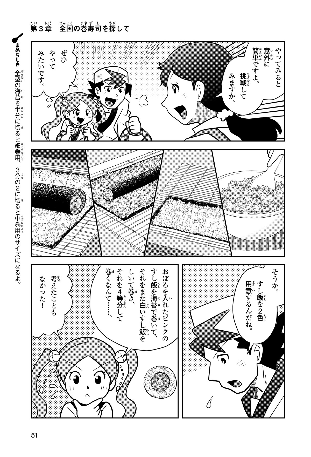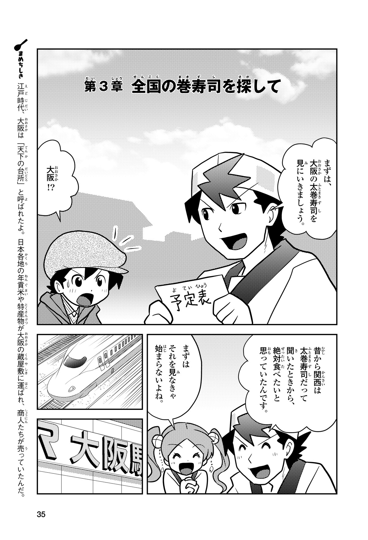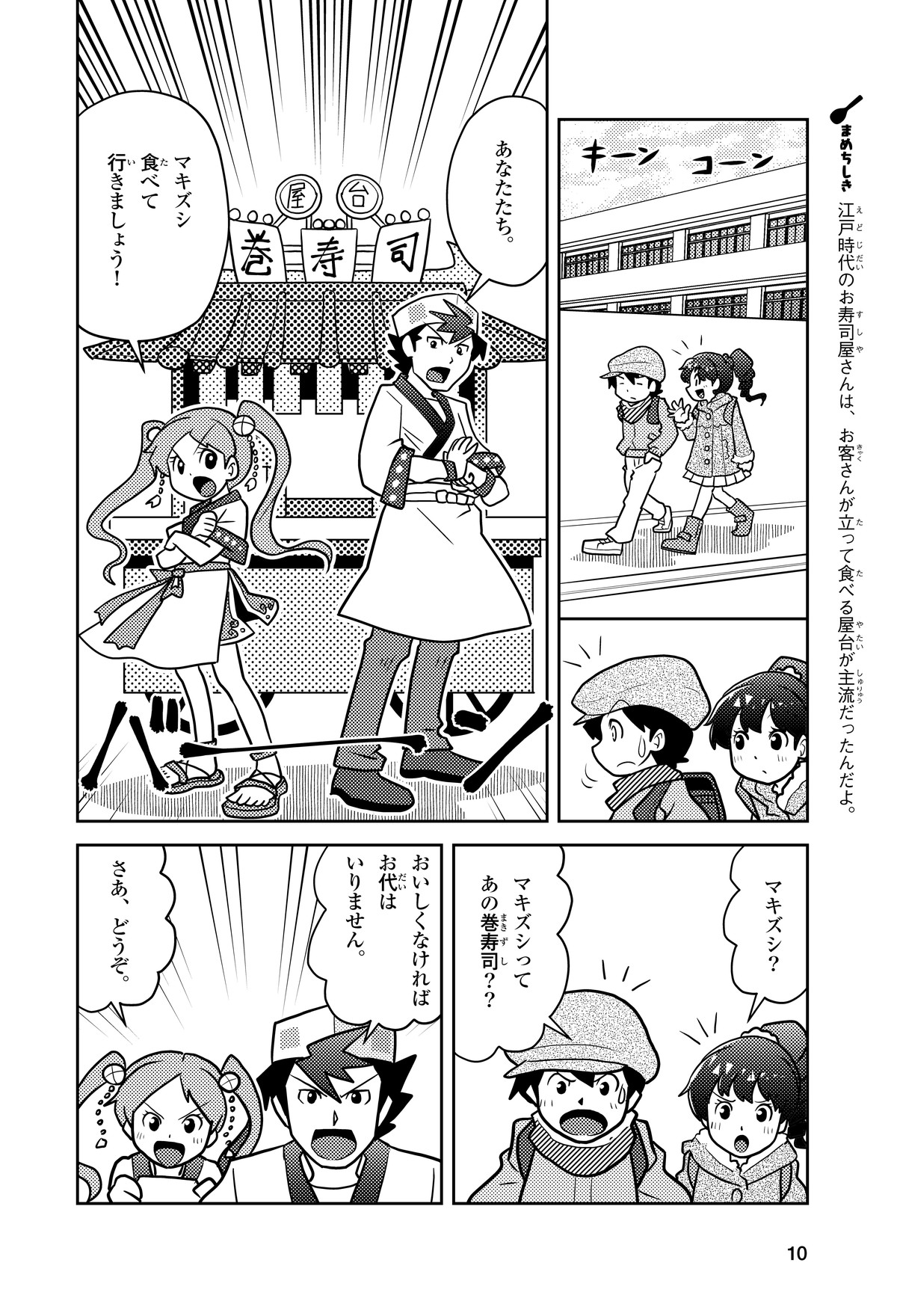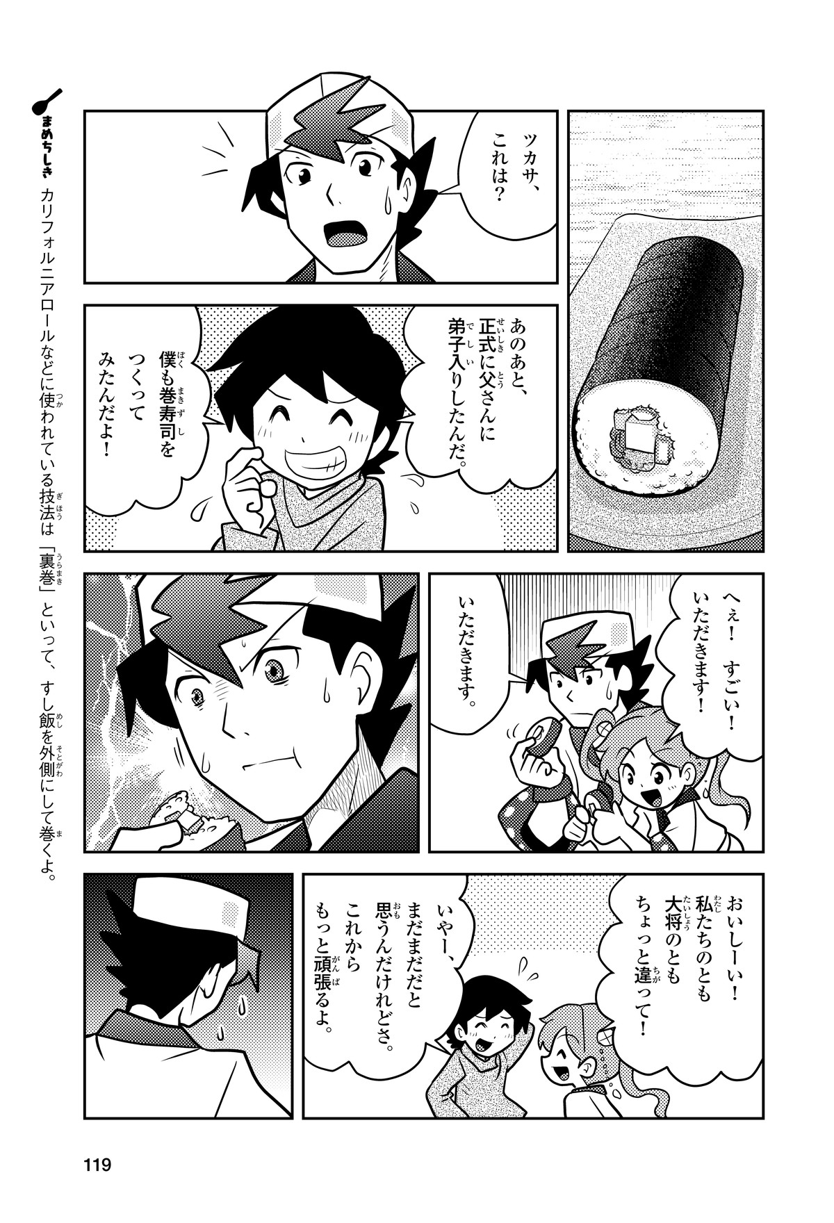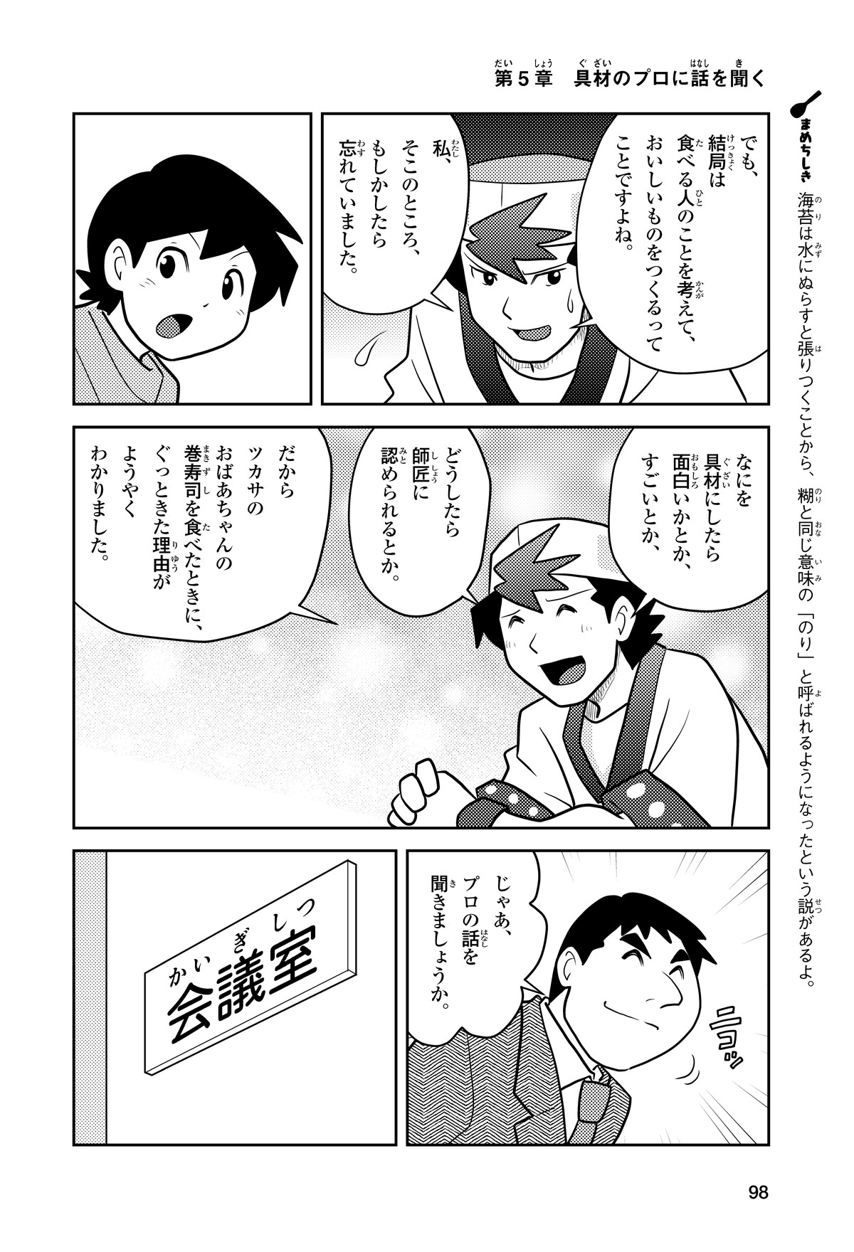 ツカサとマキは小学5年生。ツカサの家はお寿司屋さんをやっているよ。ある日、ふたりが下校していると、中国から巻寿司(まきずし)作りの修業(しゅぎょう)のためにやってきたリ・ノリとリ・シャリの兄妹(きょうだい)に遭遇(そうぐう)! ノリとシャリの兄妹が修業先を探して困っているのを見かねたツカサは、お寿司屋さんの大将をやっているお父さんに、ふたりに修業をつけてくれるようにお願いするよ。さっそくお父さんか巻寿司の歴史や、巻寿司作りの基本を教わったツカサ、マキ、ノリ、シャリの4人は、日本各地の個性(こせい)ある巻寿司をたずねたり、巻寿司の具材(ぐざい)の工場を見学しに行ったりと、本格的な巻寿司作りの修業をスタート! おいしい巻寿司作りのひみつをみつけていくよ!