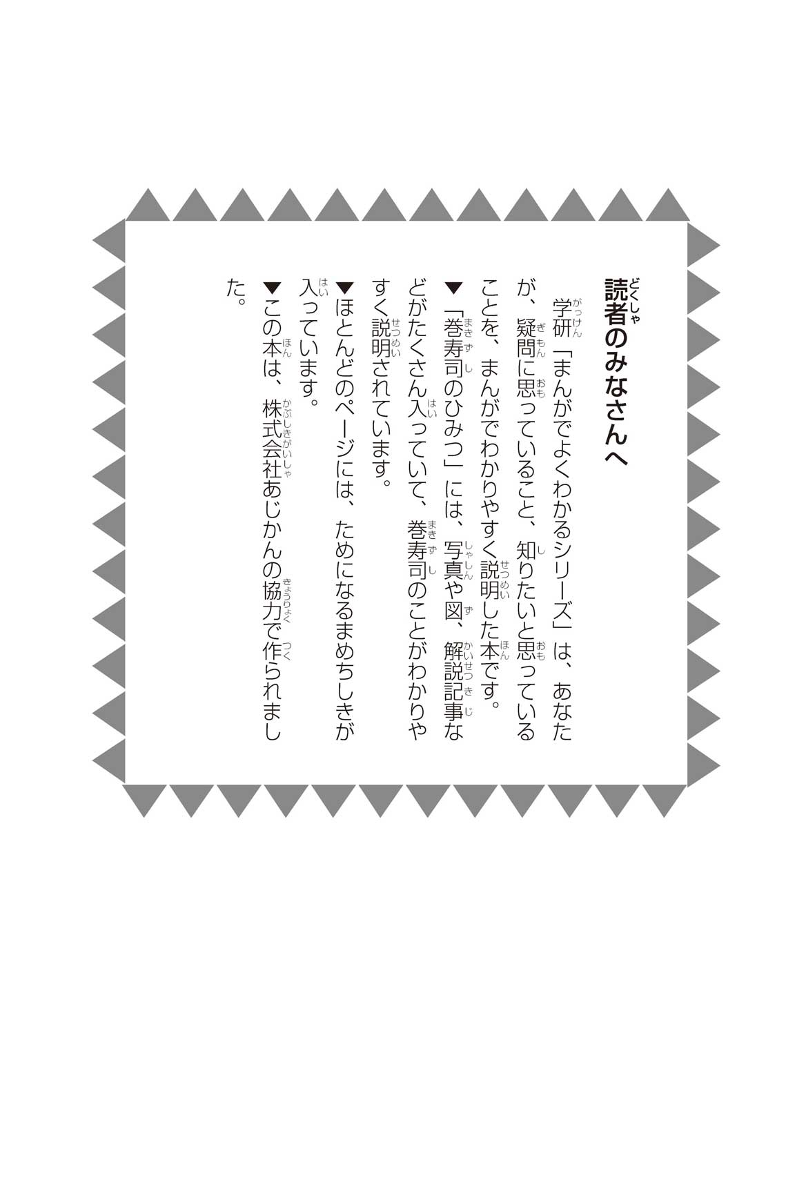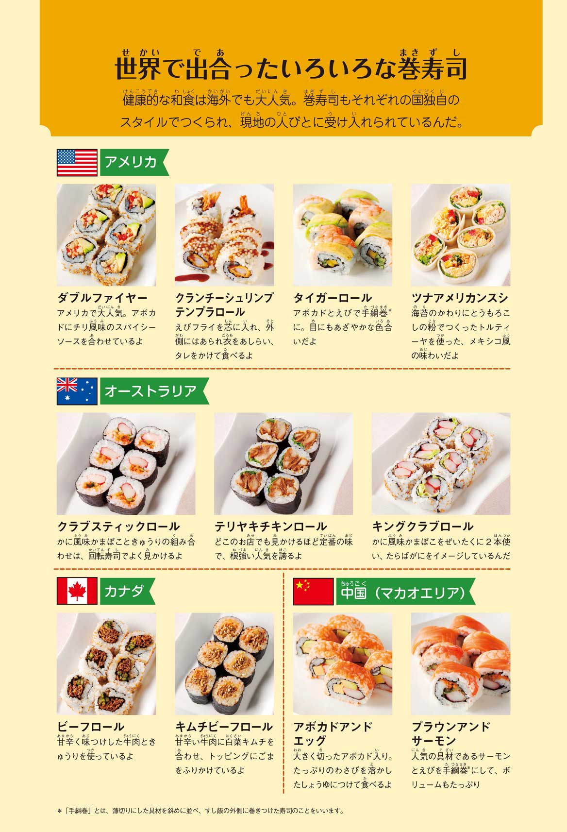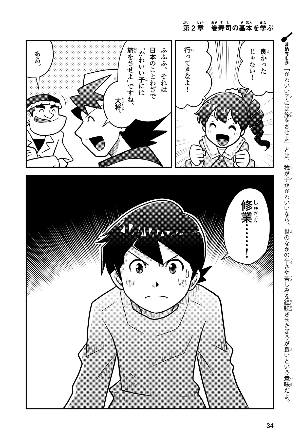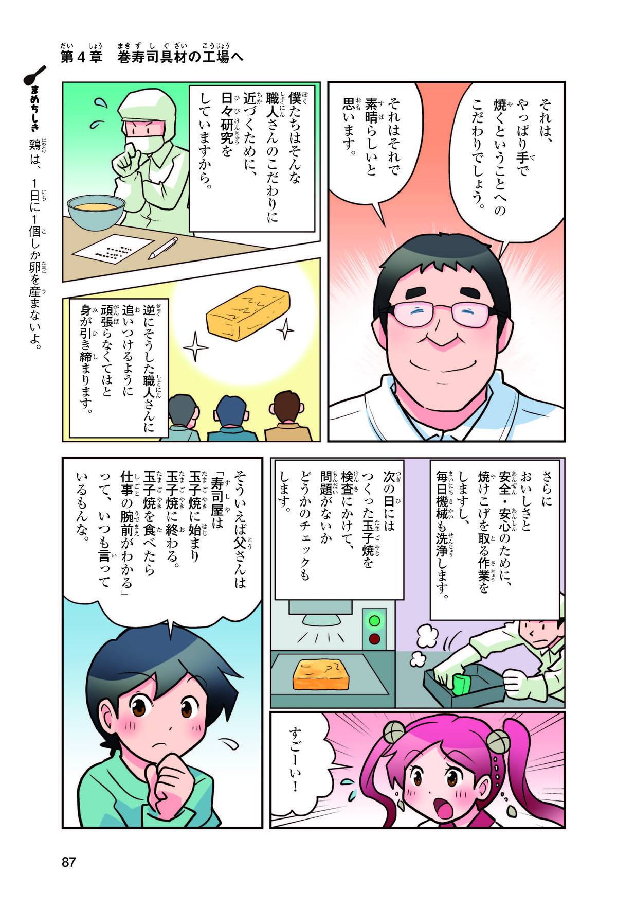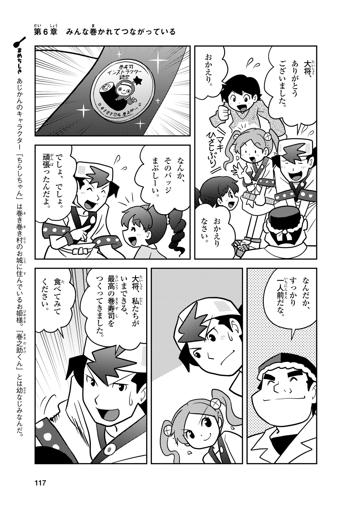 ツカサとマキは小学5年生。ツカサの家はお寿司屋さんをやっているよ。ある日、ふたりが下校していると、中国から巻寿司(まきずし)作りの修業(しゅぎょう)のためにやってきたリ・ノリとリ・シャリの兄妹(きょうだい)に遭遇(そうぐう)! ノリとシャリの兄妹が修業先を探して困っているのを見かねたツカサは、お寿司屋さんの大将をやっているお父さんに、ふたりに修業をつけてくれるようにお願いするよ。さっそくお父さんか巻寿司の歴史や、巻寿司作りの基本を教わったツカサ、マキ、ノリ、シャリの4人は、日本各地の個性(こせい)ある巻寿司をたずねたり、巻寿司の具材(ぐざい)の工場を見学しに行ったりと、本格的な巻寿司作りの修業をスタート! おいしい巻寿司作りのひみつをみつけていくよ!