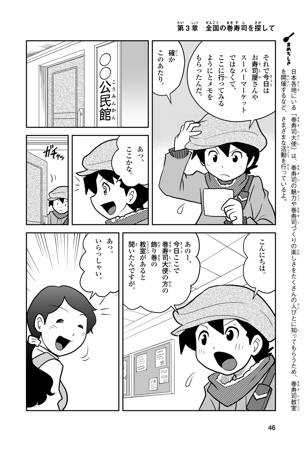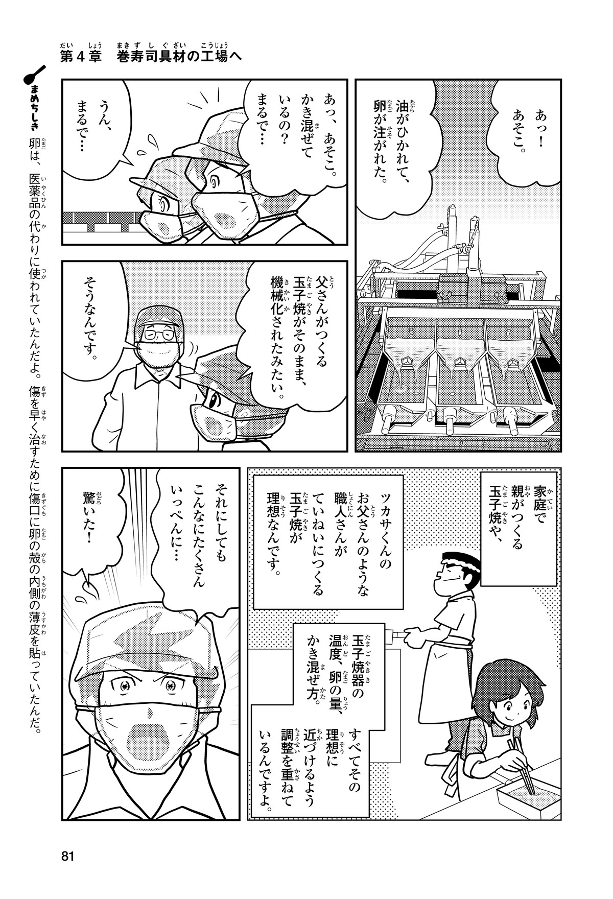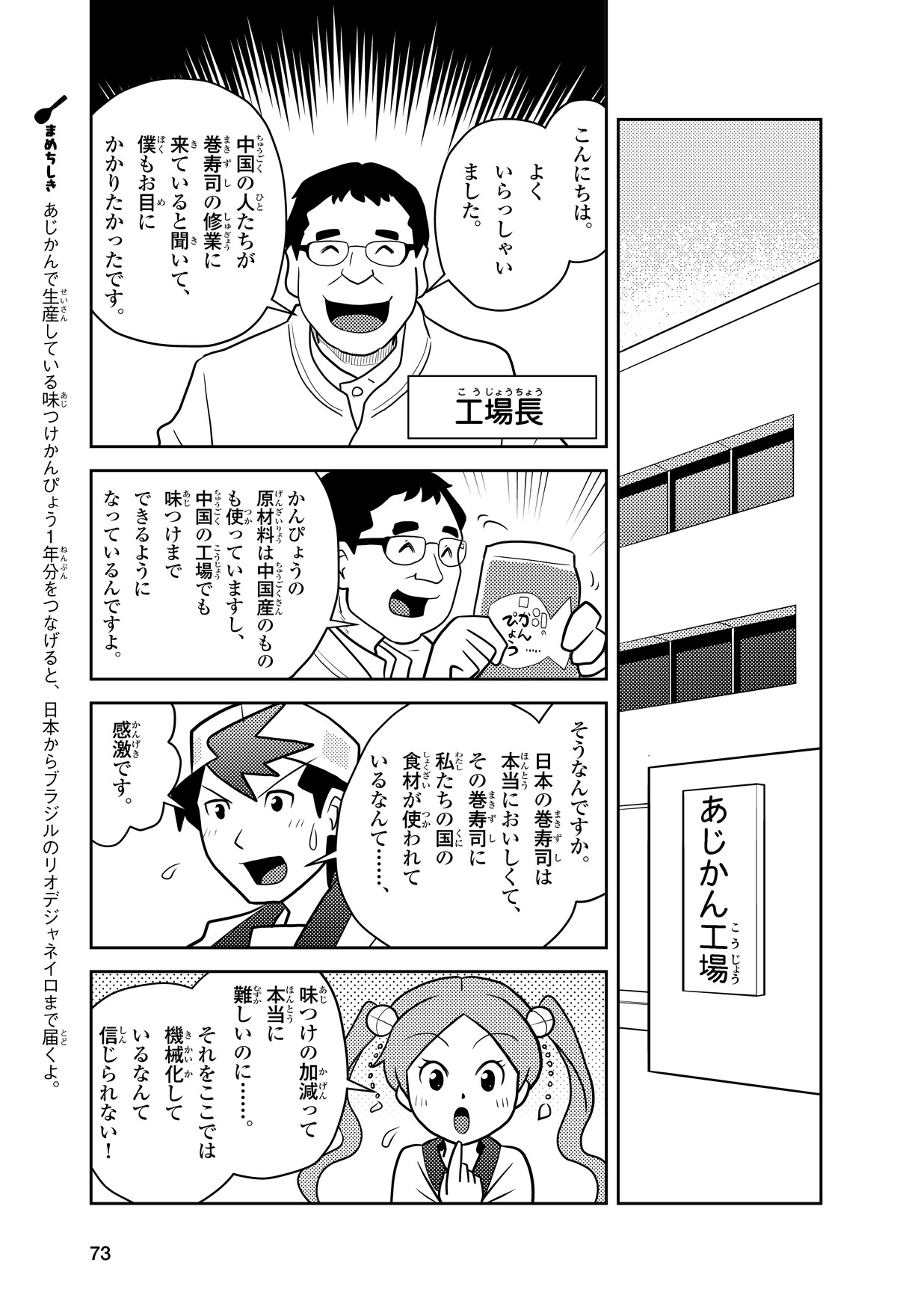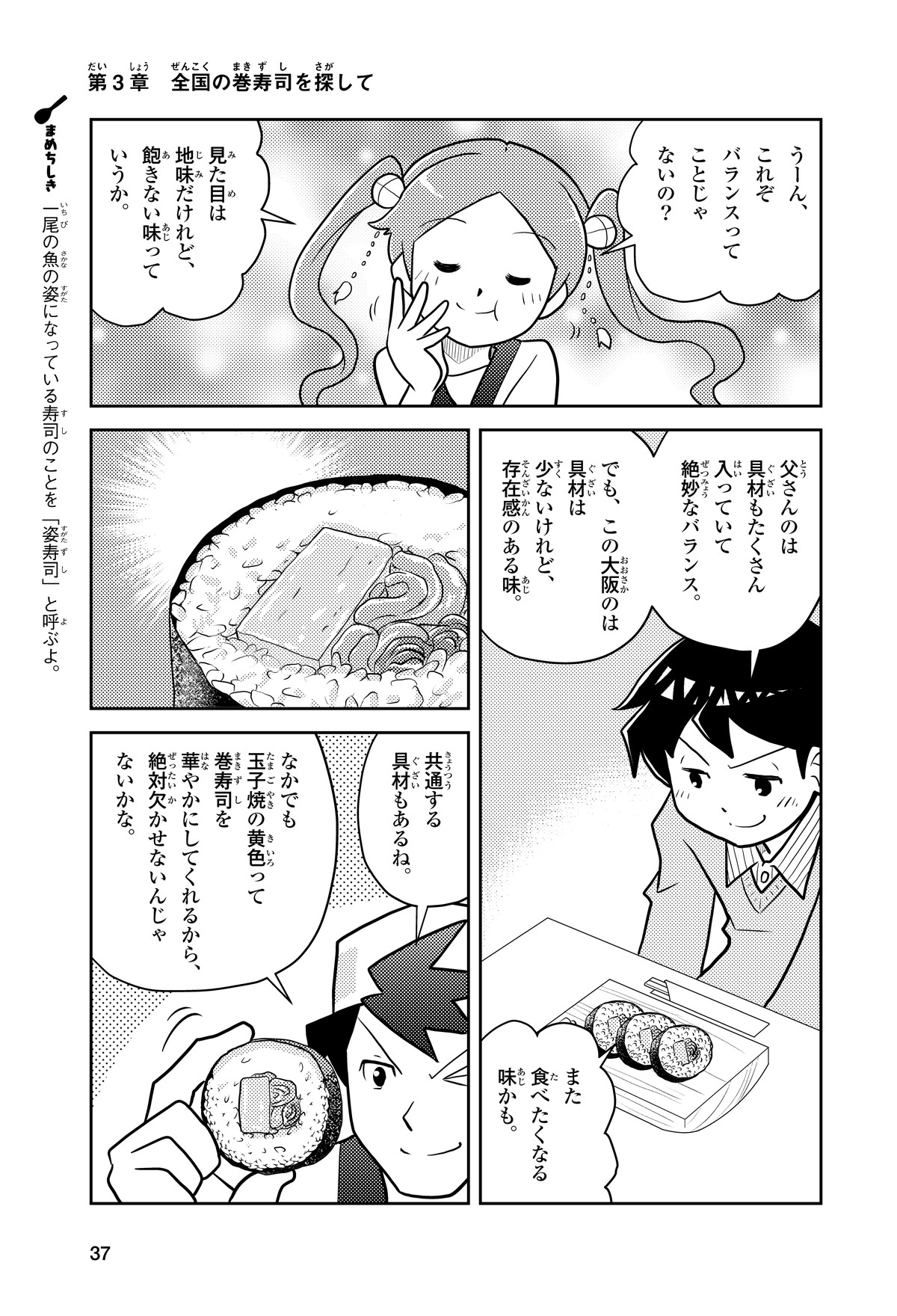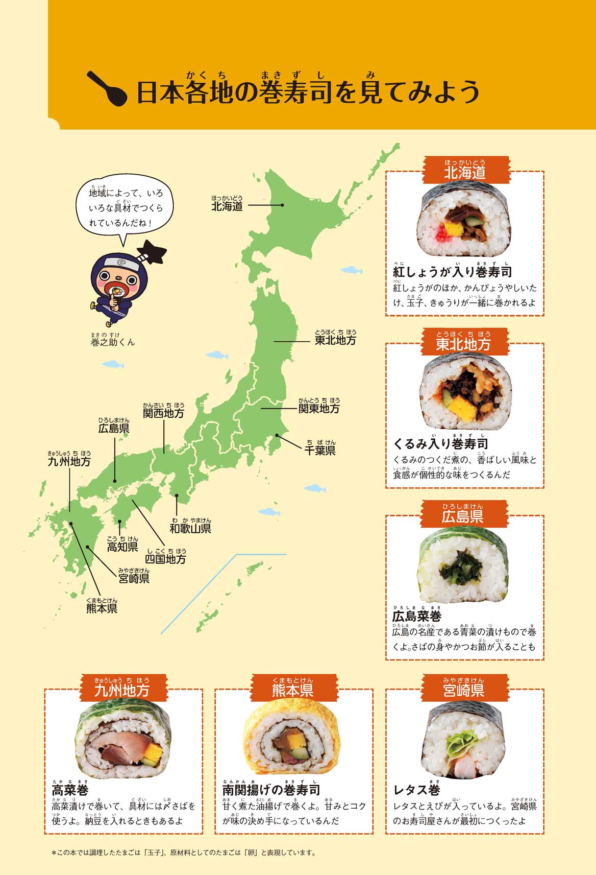 ツカサとマキは小学5年生。ツカサの家はお寿司屋さんをやっているよ。ある日、ふたりが下校していると、中国から巻寿司(まきずし)作りの修業(しゅぎょう)のためにやってきたリ・ノリとリ・シャリの兄妹(きょうだい)に遭遇(そうぐう)! ノリとシャリの兄妹が修業先を探して困っているのを見かねたツカサは、お寿司屋さんの大将をやっているお父さんに、ふたりに修業をつけてくれるようにお願いするよ。さっそくお父さんか巻寿司の歴史や、巻寿司作りの基本を教わったツカサ、マキ、ノリ、シャリの4人は、日本各地の個性(こせい)ある巻寿司をたずねたり、巻寿司の具材(ぐざい)の工場を見学しに行ったりと、本格的な巻寿司作りの修業をスタート! おいしい巻寿司作りのひみつをみつけていくよ!