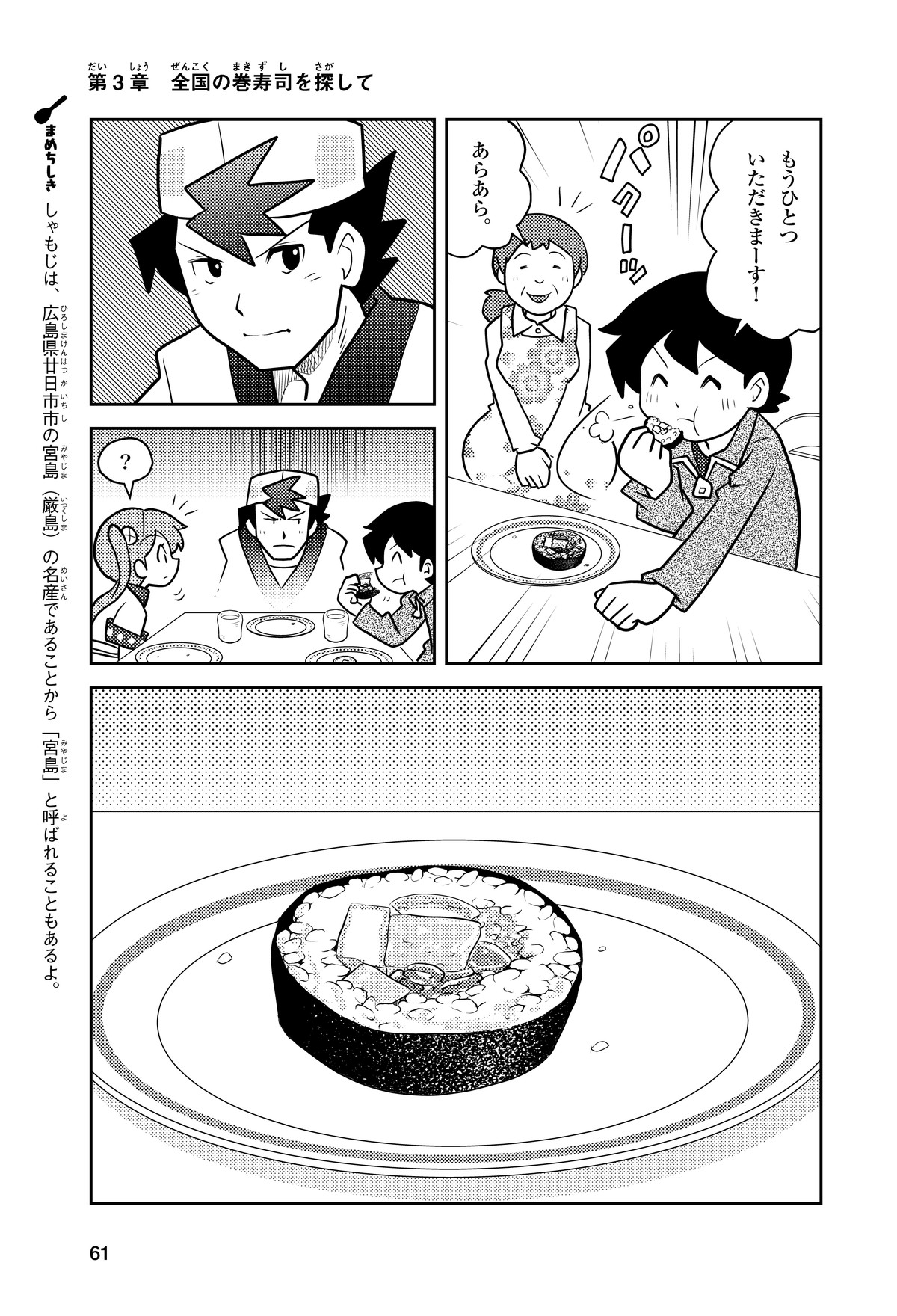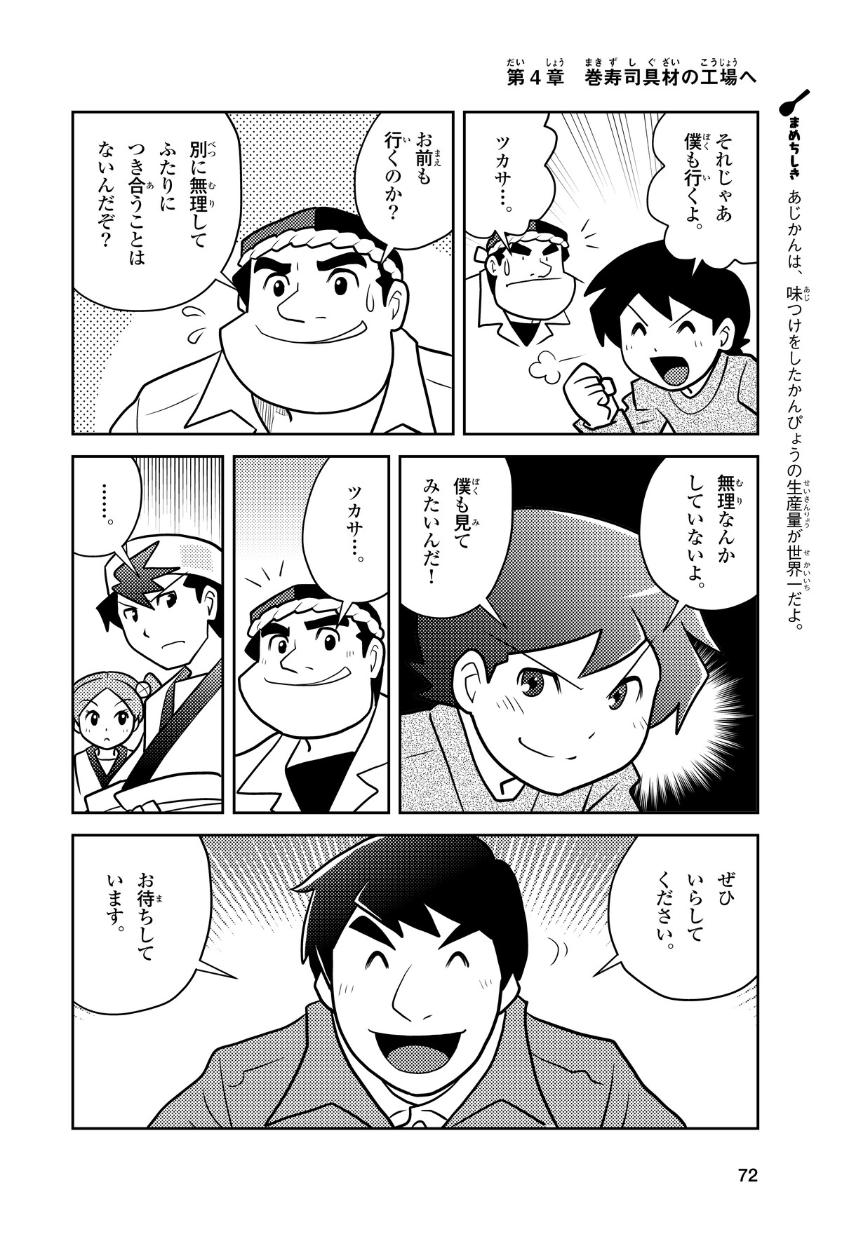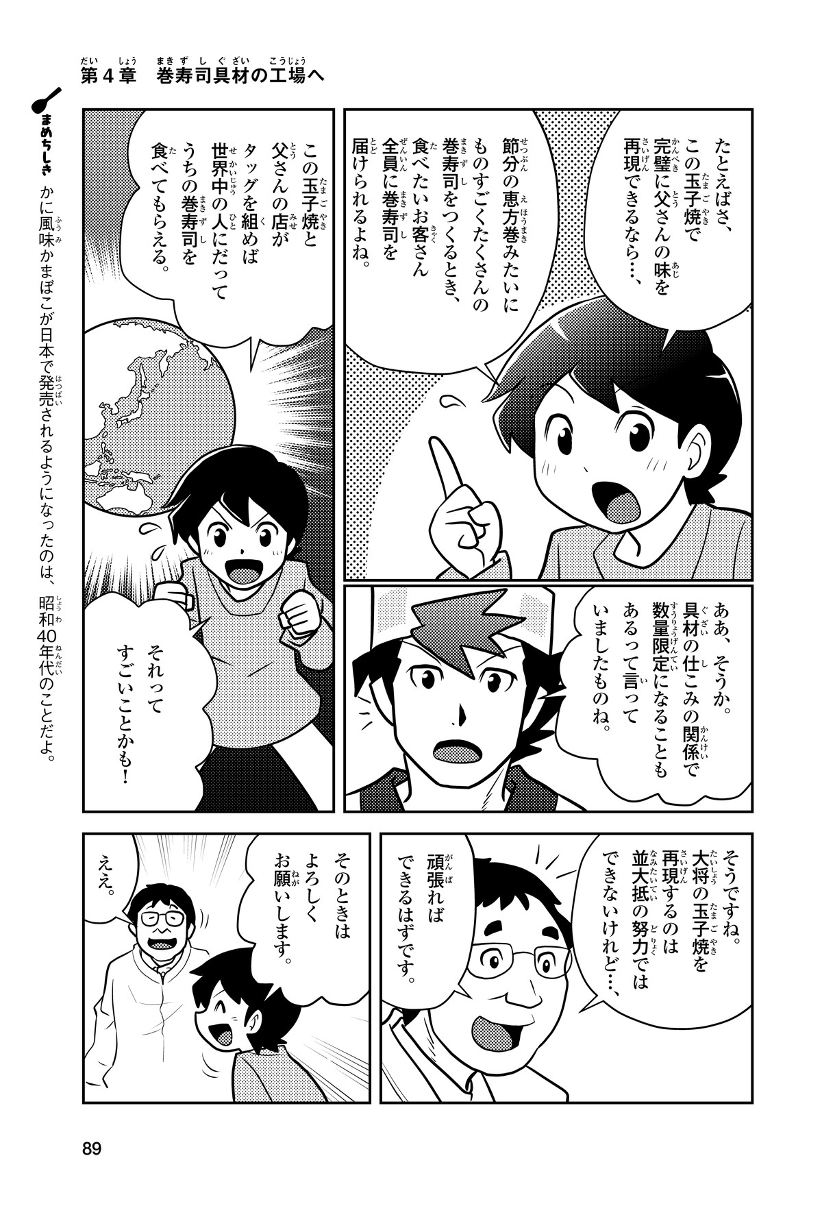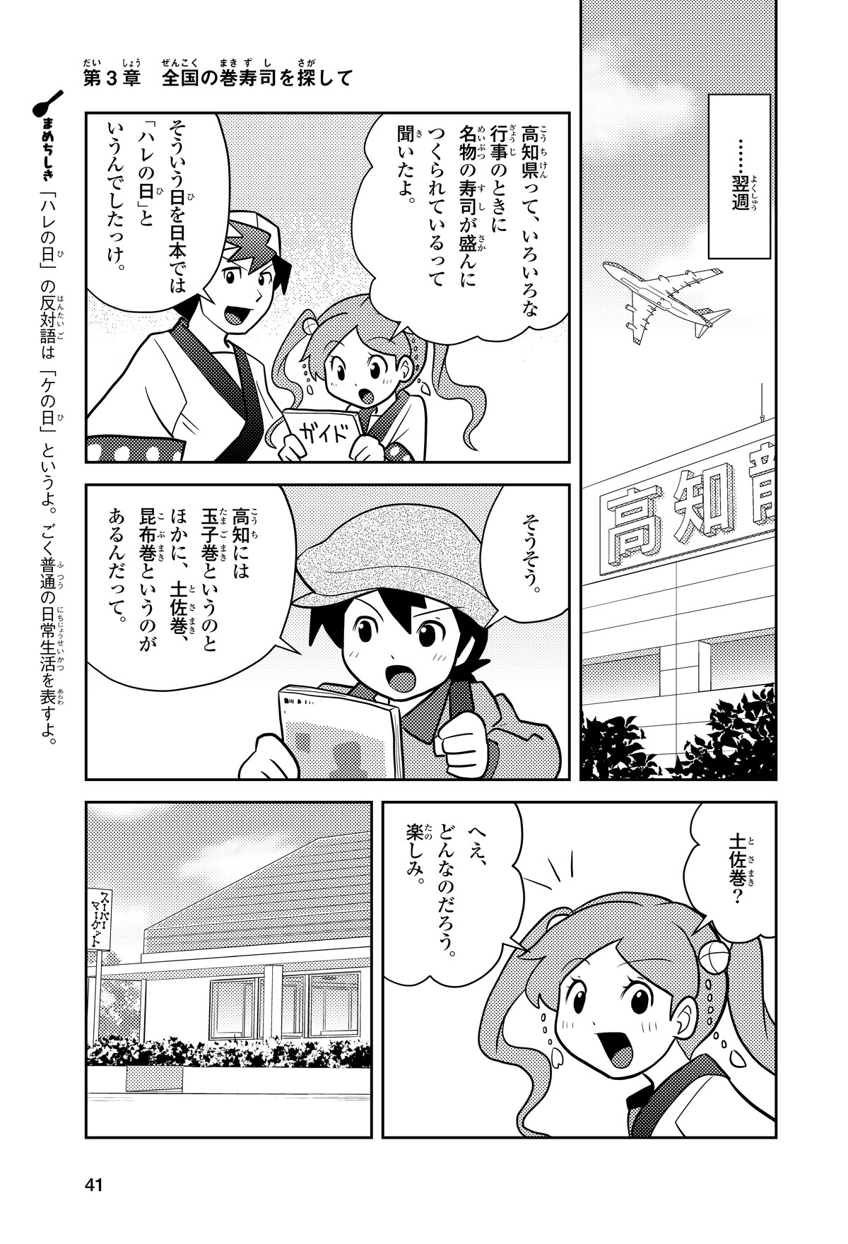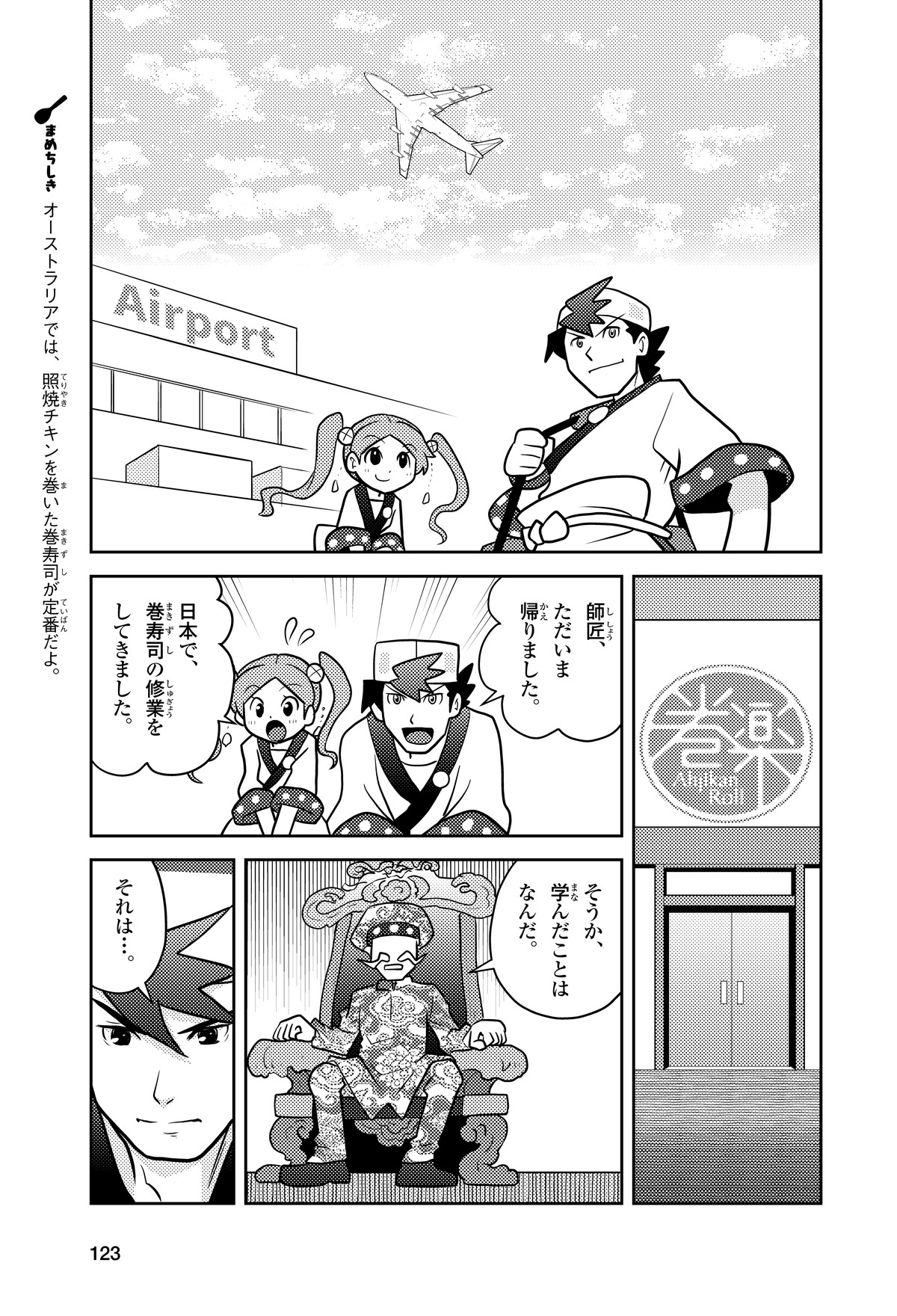 ツカサとマキは小学5年生。ツカサの家はお寿司屋さんをやっているよ。ある日、ふたりが下校していると、中国から巻寿司(まきずし)作りの修業(しゅぎょう)のためにやってきたリ・ノリとリ・シャリの兄妹(きょうだい)に遭遇(そうぐう)! ノリとシャリの兄妹が修業先を探して困っているのを見かねたツカサは、お寿司屋さんの大将をやっているお父さんに、ふたりに修業をつけてくれるようにお願いするよ。さっそくお父さんか巻寿司の歴史や、巻寿司作りの基本を教わったツカサ、マキ、ノリ、シャリの4人は、日本各地の個性(こせい)ある巻寿司をたずねたり、巻寿司の具材(ぐざい)の工場を見学しに行ったりと、本格的な巻寿司作りの修業をスタート! おいしい巻寿司作りのひみつをみつけていくよ!