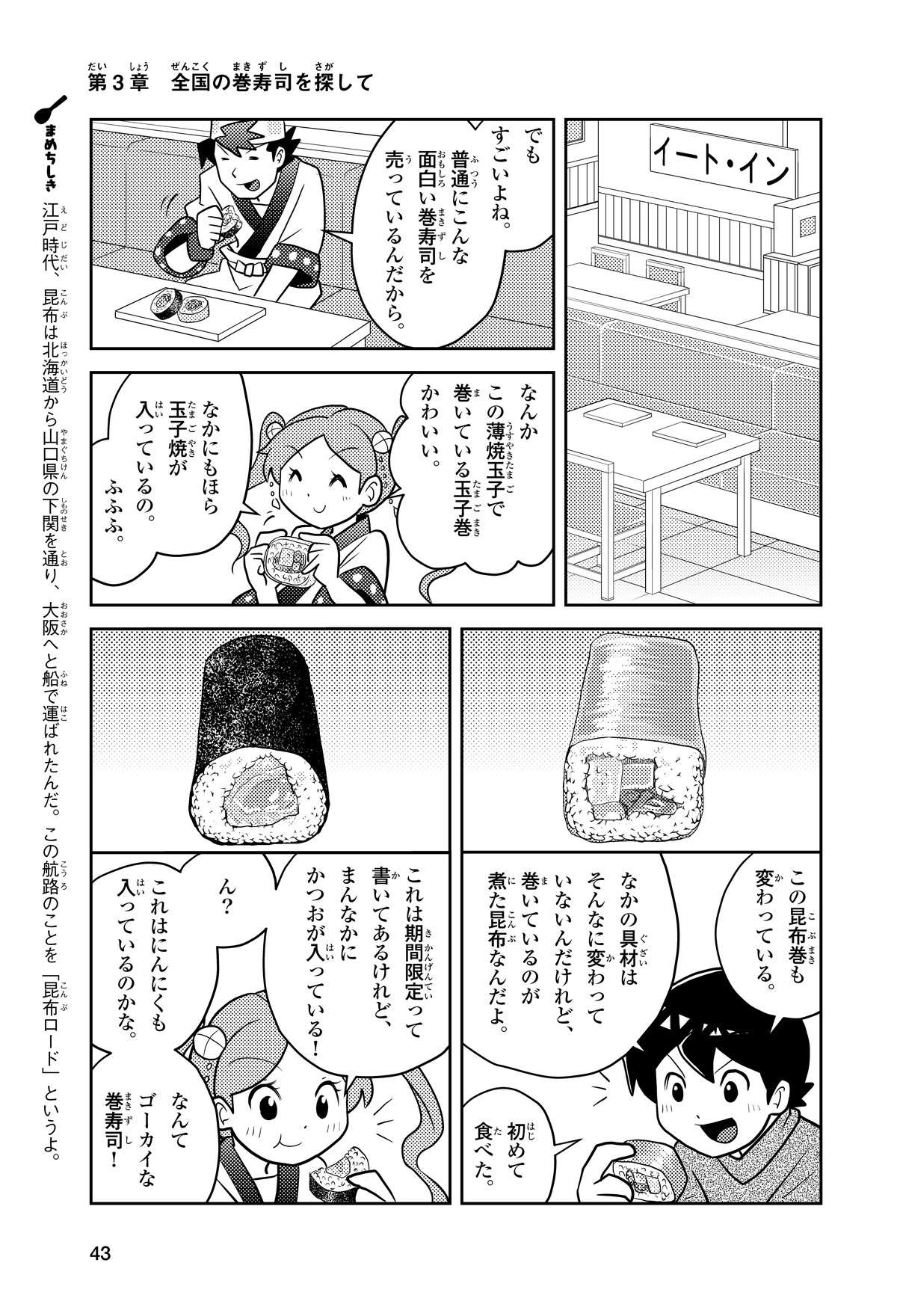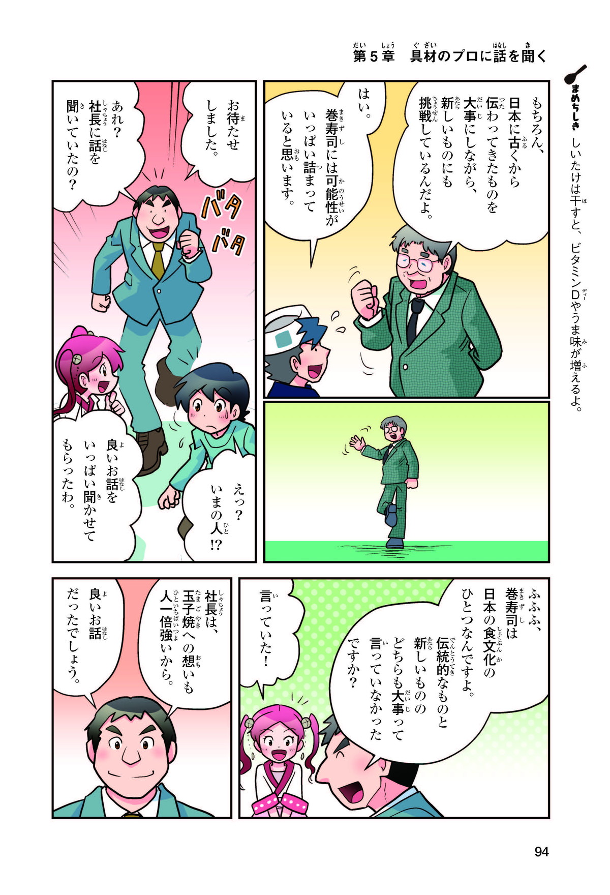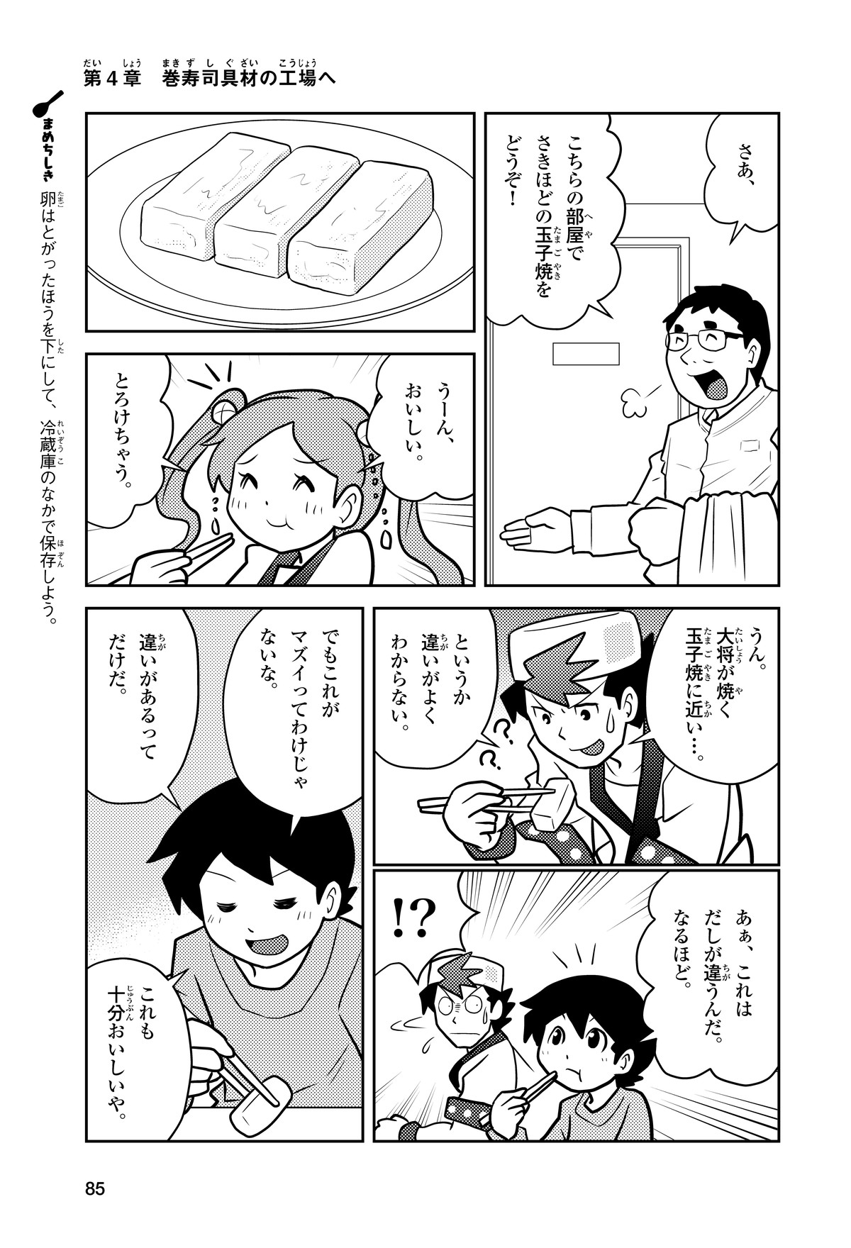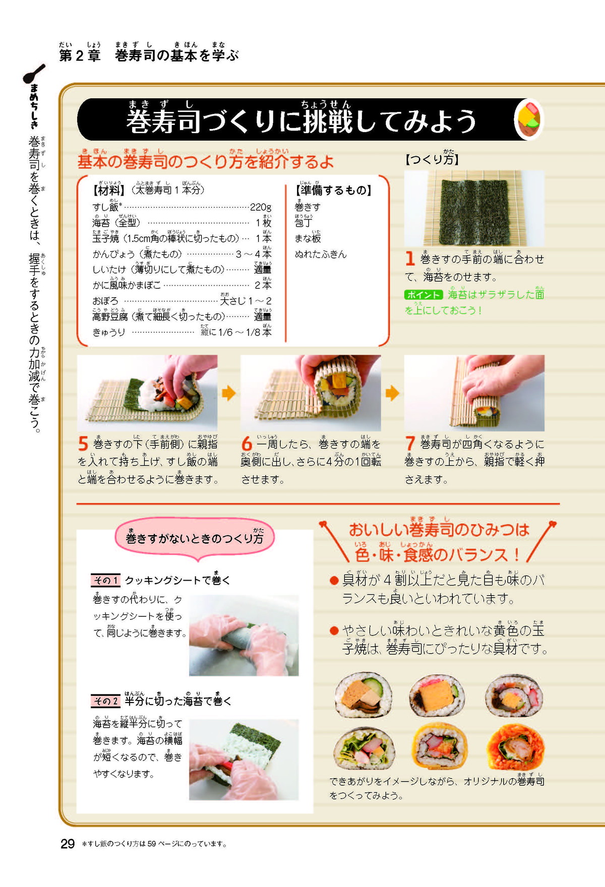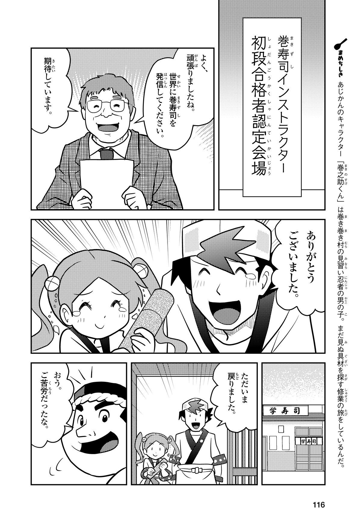 ツカサとマキは小学5年生。ツカサの家はお寿司屋さんをやっているよ。ある日、ふたりが下校していると、中国から巻寿司(まきずし)作りの修業(しゅぎょう)のためにやってきたリ・ノリとリ・シャリの兄妹(きょうだい)に遭遇(そうぐう)! ノリとシャリの兄妹が修業先を探して困っているのを見かねたツカサは、お寿司屋さんの大将をやっているお父さんに、ふたりに修業をつけてくれるようにお願いするよ。さっそくお父さんか巻寿司の歴史や、巻寿司作りの基本を教わったツカサ、マキ、ノリ、シャリの4人は、日本各地の個性(こせい)ある巻寿司をたずねたり、巻寿司の具材(ぐざい)の工場を見学しに行ったりと、本格的な巻寿司作りの修業をスタート! おいしい巻寿司作りのひみつをみつけていくよ!