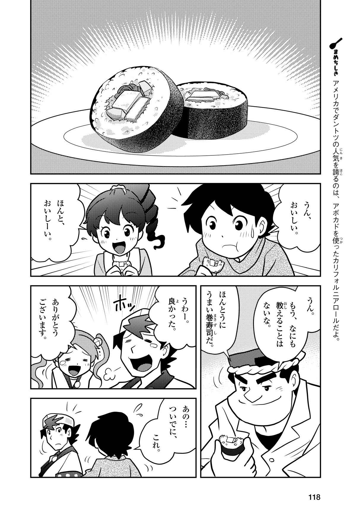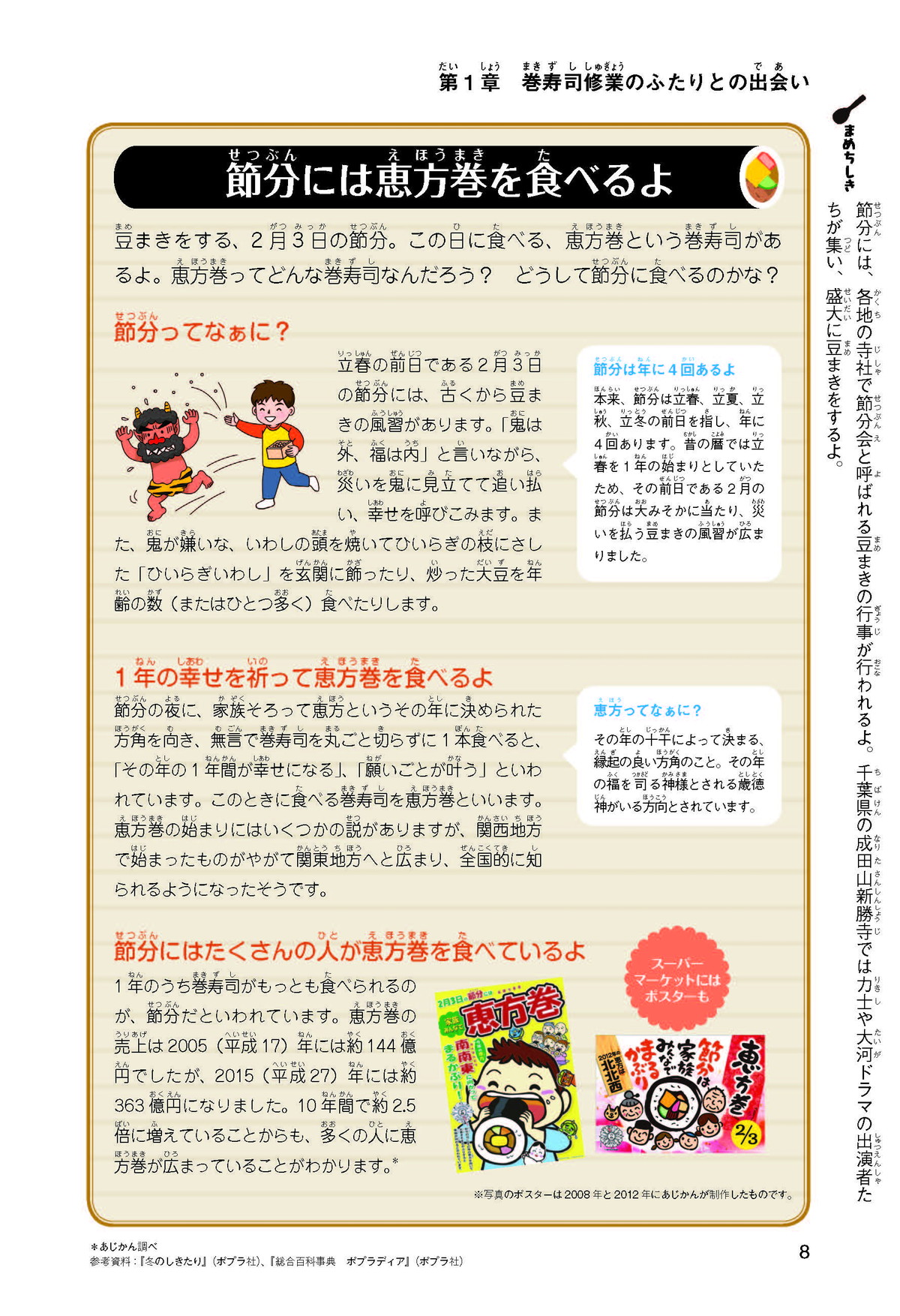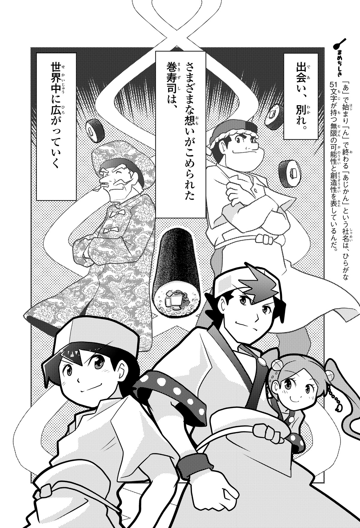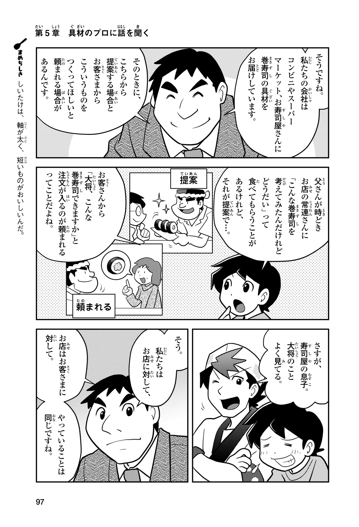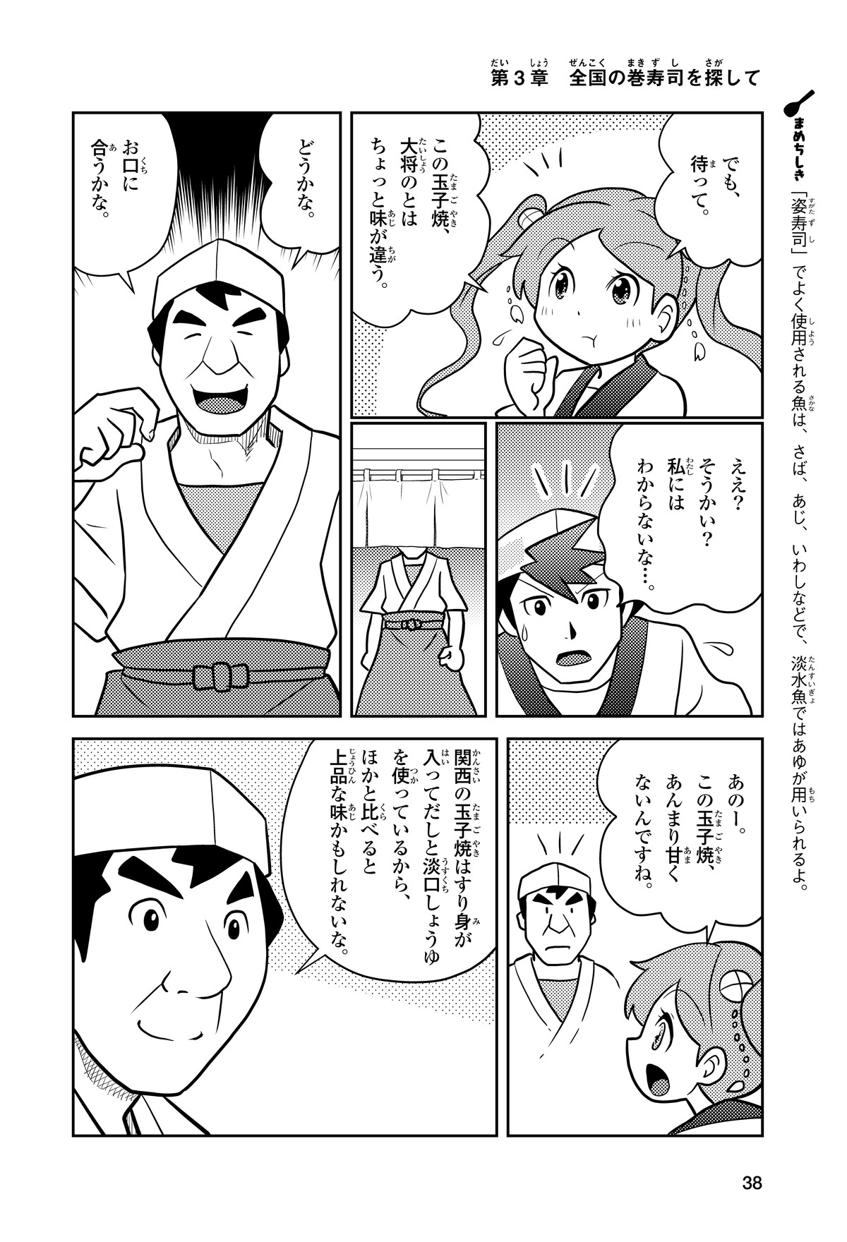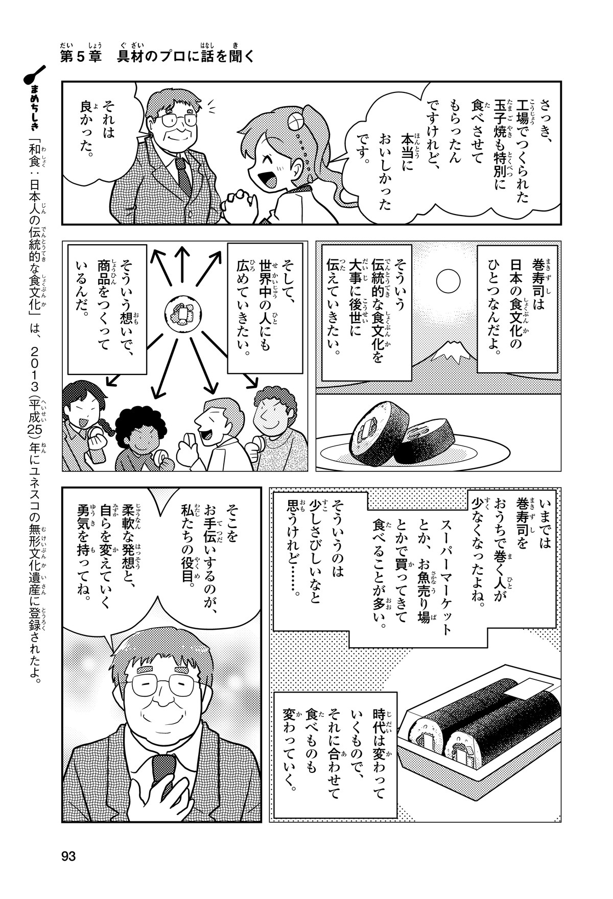 ツカサとマキは小学5年生。ツカサの家はお寿司屋さんをやっているよ。ある日、ふたりが下校していると、中国から巻寿司(まきずし)作りの修業(しゅぎょう)のためにやってきたリ・ノリとリ・シャリの兄妹(きょうだい)に遭遇(そうぐう)! ノリとシャリの兄妹が修業先を探して困っているのを見かねたツカサは、お寿司屋さんの大将をやっているお父さんに、ふたりに修業をつけてくれるようにお願いするよ。さっそくお父さんか巻寿司の歴史や、巻寿司作りの基本を教わったツカサ、マキ、ノリ、シャリの4人は、日本各地の個性(こせい)ある巻寿司をたずねたり、巻寿司の具材(ぐざい)の工場を見学しに行ったりと、本格的な巻寿司作りの修業をスタート! おいしい巻寿司作りのひみつをみつけていくよ!