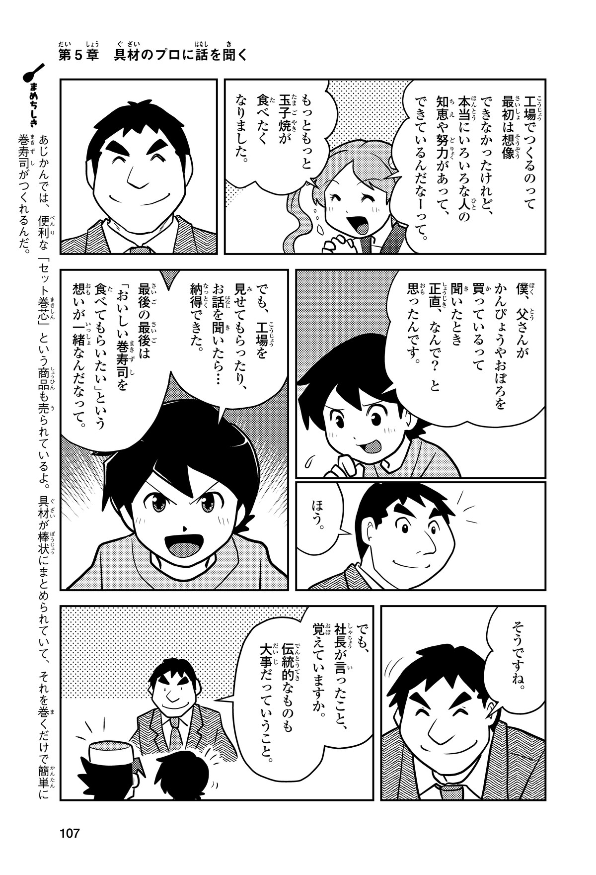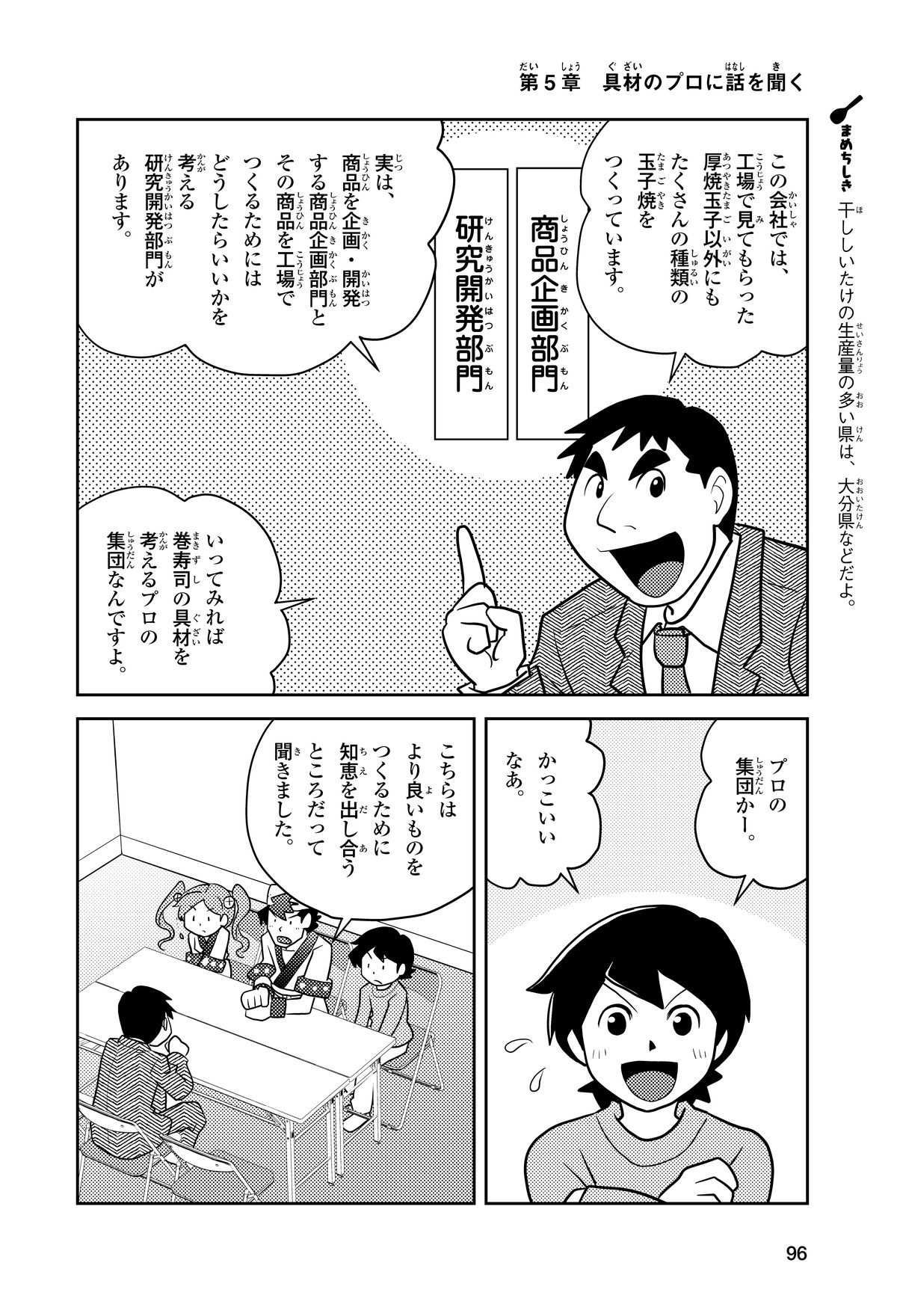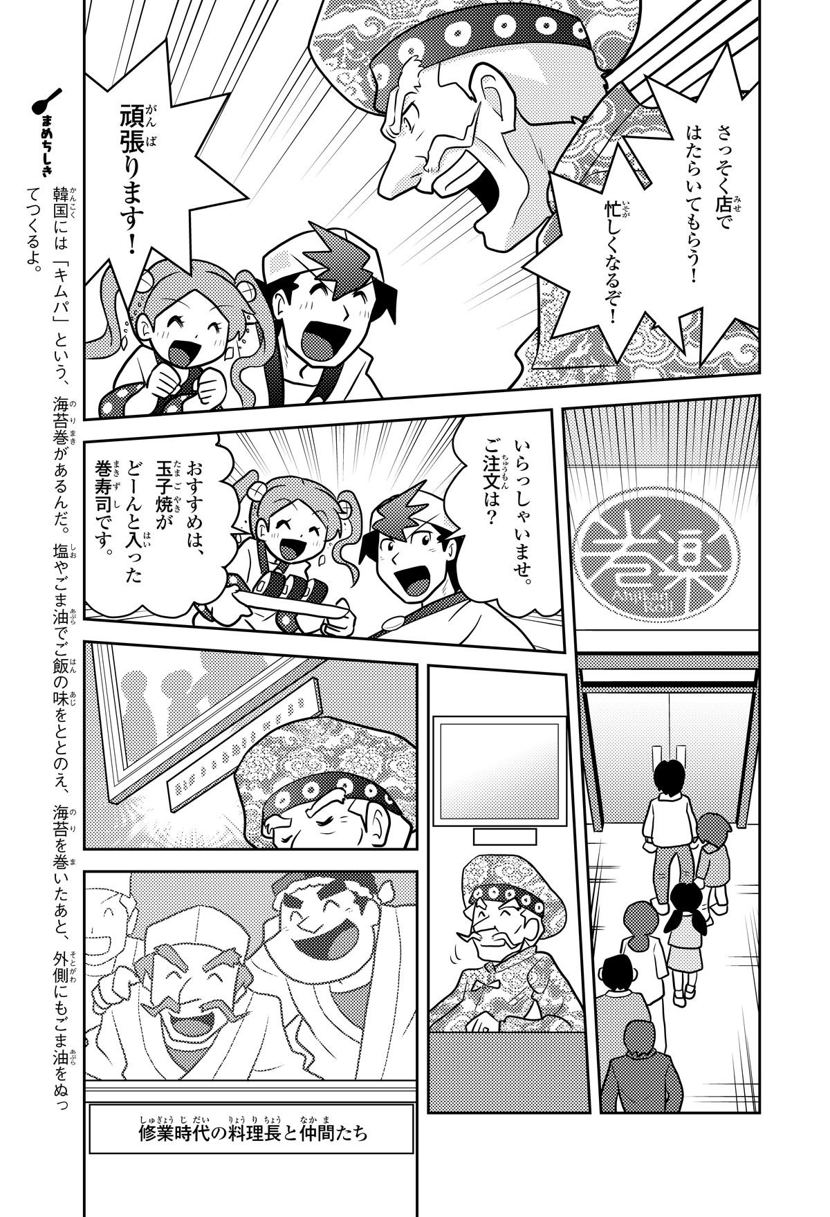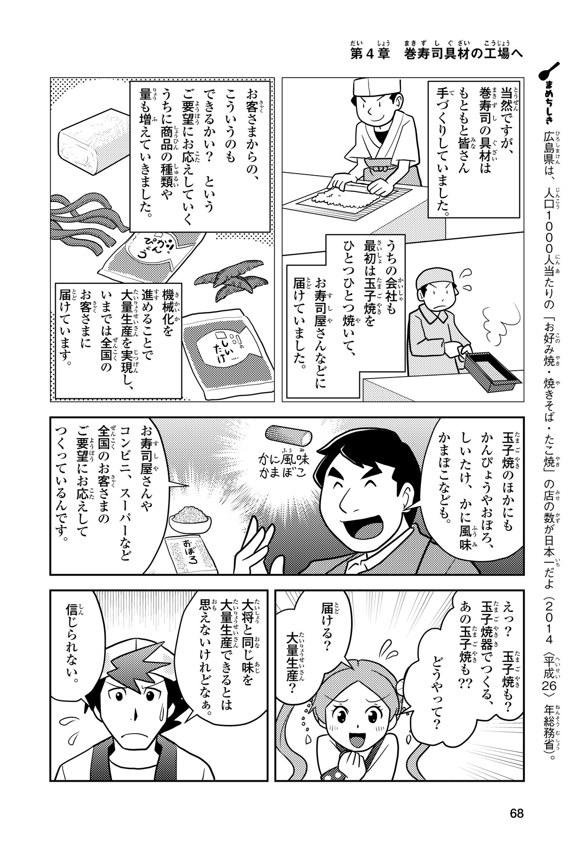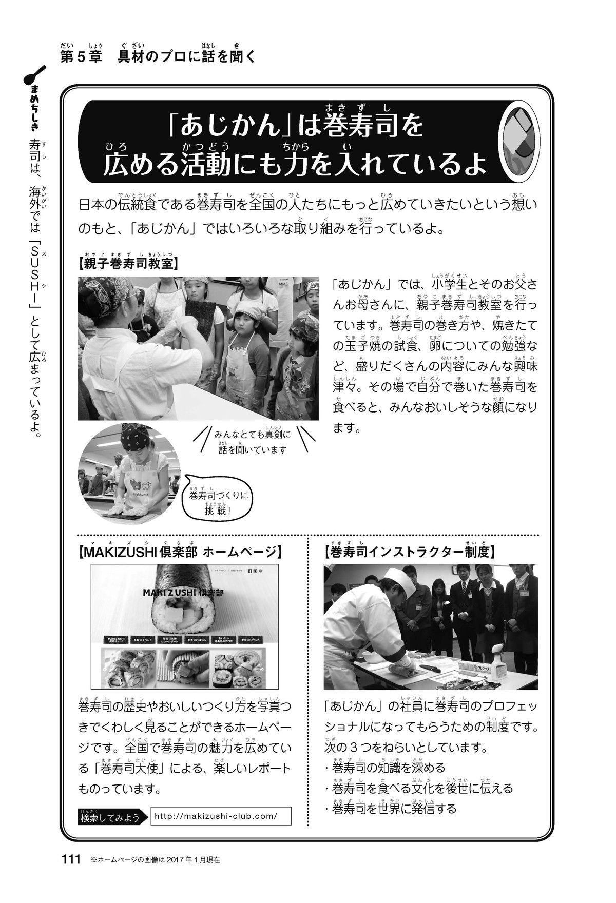 ツカサとマキは小学5年生。ツカサの家はお寿司屋さんをやっているよ。ある日、ふたりが下校していると、中国から巻寿司(まきずし)作りの修業(しゅぎょう)のためにやってきたリ・ノリとリ・シャリの兄妹(きょうだい)に遭遇(そうぐう)! ノリとシャリの兄妹が修業先を探して困っているのを見かねたツカサは、お寿司屋さんの大将をやっているお父さんに、ふたりに修業をつけてくれるようにお願いするよ。さっそくお父さんか巻寿司の歴史や、巻寿司作りの基本を教わったツカサ、マキ、ノリ、シャリの4人は、日本各地の個性(こせい)ある巻寿司をたずねたり、巻寿司の具材(ぐざい)の工場を見学しに行ったりと、本格的な巻寿司作りの修業をスタート! おいしい巻寿司作りのひみつをみつけていくよ!