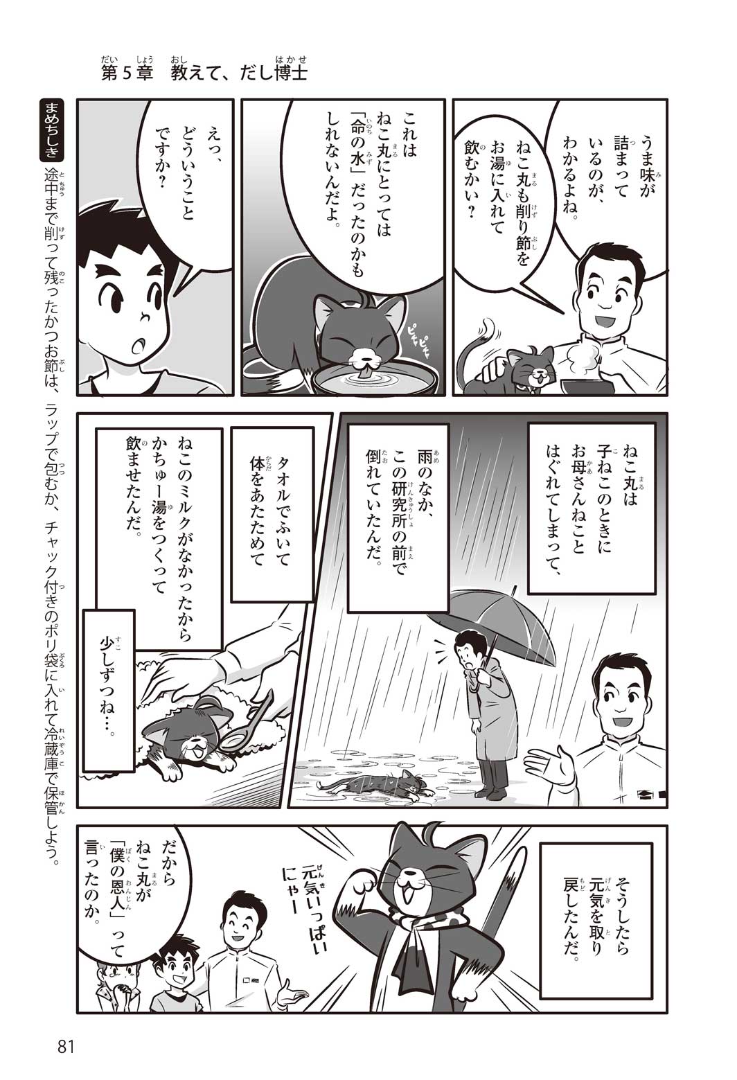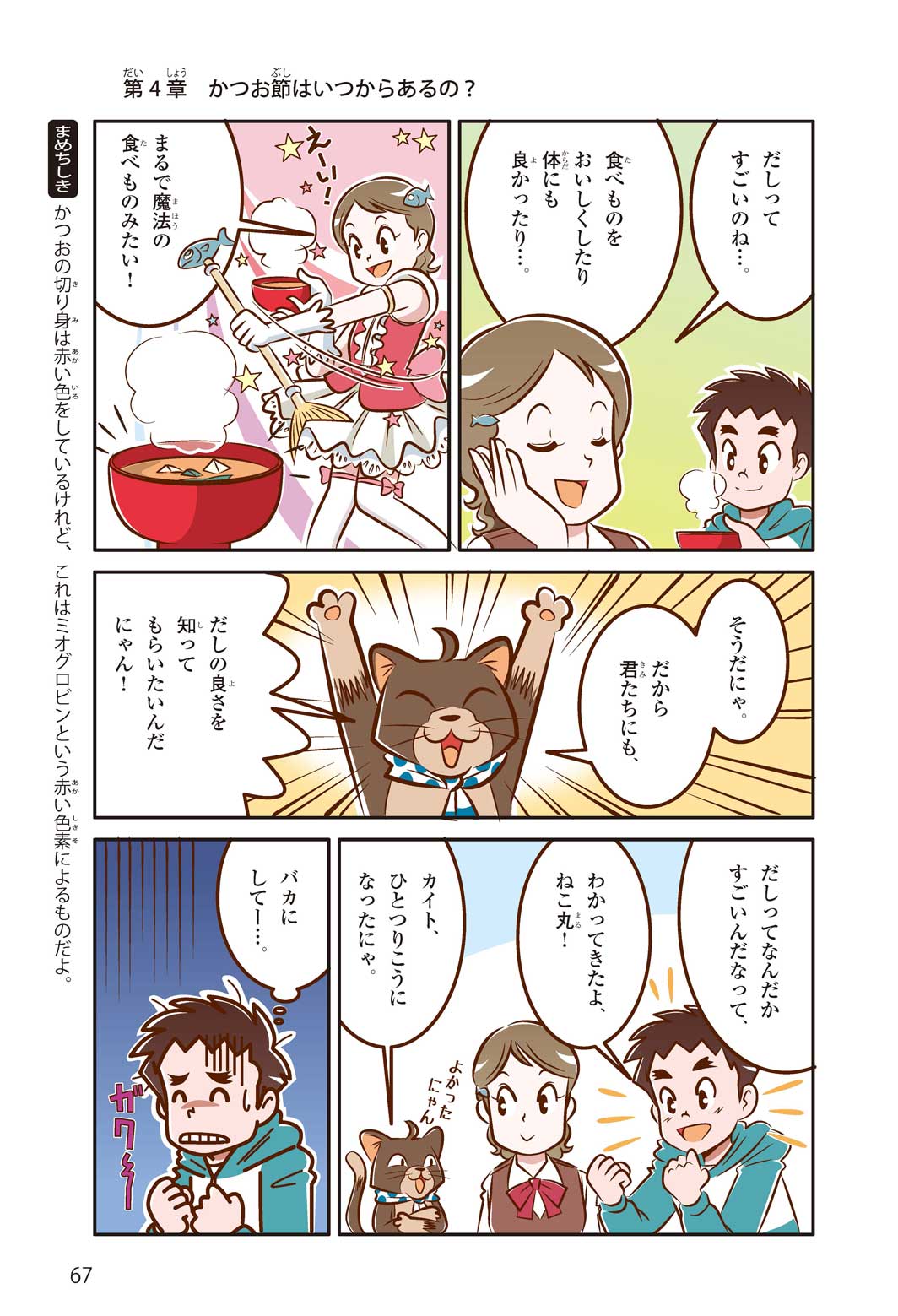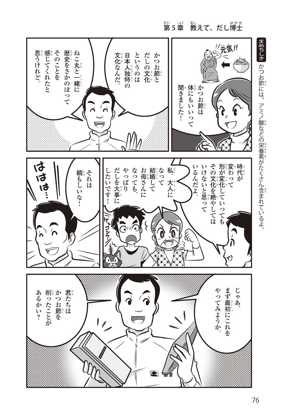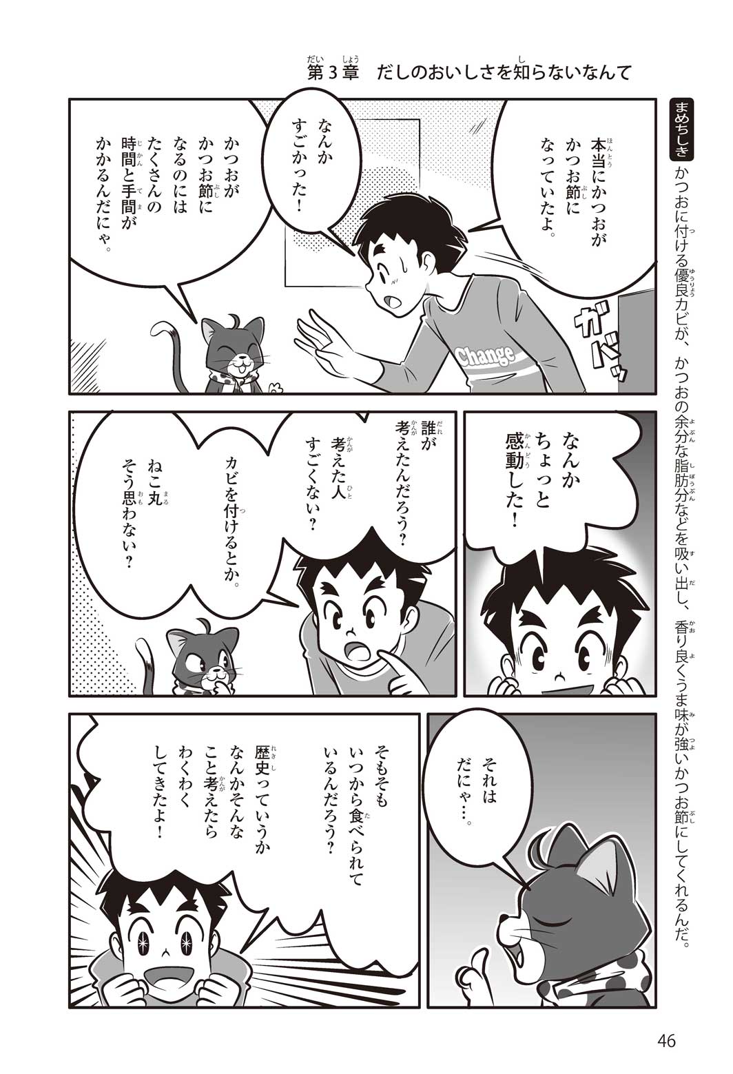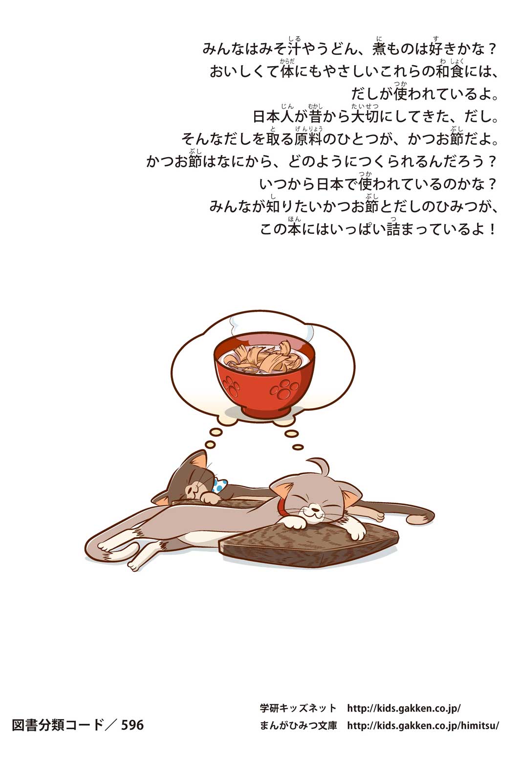 小学5年生の男の子、カイトは、野菜が苦手(にがて)で、家でも学校でも、野菜がメインの料理は残してしまいがち……。それに比べて好物(こうぶつ)は、ハンバーグにカレーライス、ラーメン、焼肉と、野菜の少ない外国の料理ばかり! でも、ある日の夕食で、空腹(くうふく)といい香りにつられてなにげなく食べた野菜のお味噌汁(みそしる)が、とってもおいしいことに気付いたよ! その夜カイトの前に、不思議(ふしぎ)なねこが出現(しゅつげん)。ねこは、だしのおいしさを子どもたちに伝えるためにやってきた、かつお節(ぶし)の妖精(ようせい)、ねこ丸だった。カイトは、ねこ丸に連れられて、クラスメイトのマキちゃんと一緒に、大昔にタイムスリップしたり、かつお節とだしの研究所へ行ったりと、かつお節やだしの歴史や作られ方などのひみつをたずねていくよ!