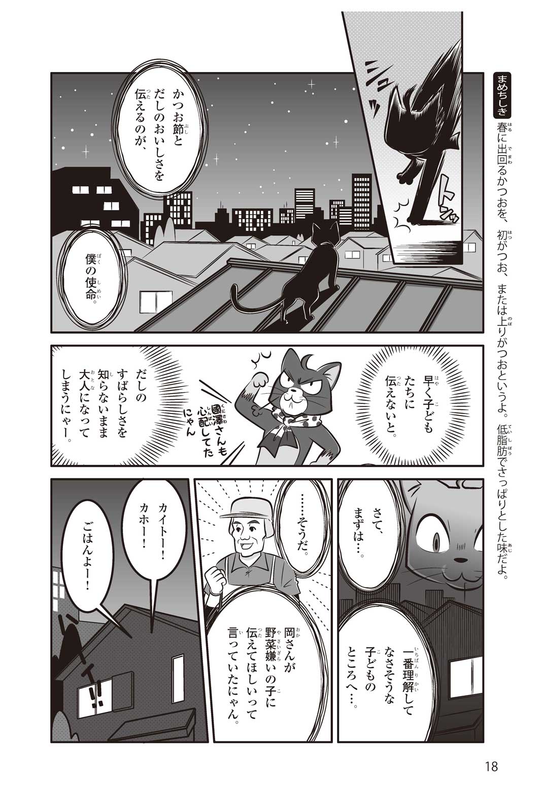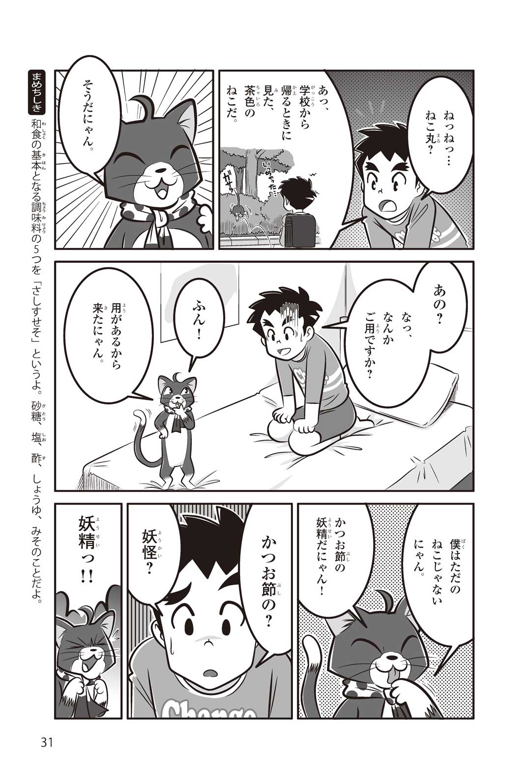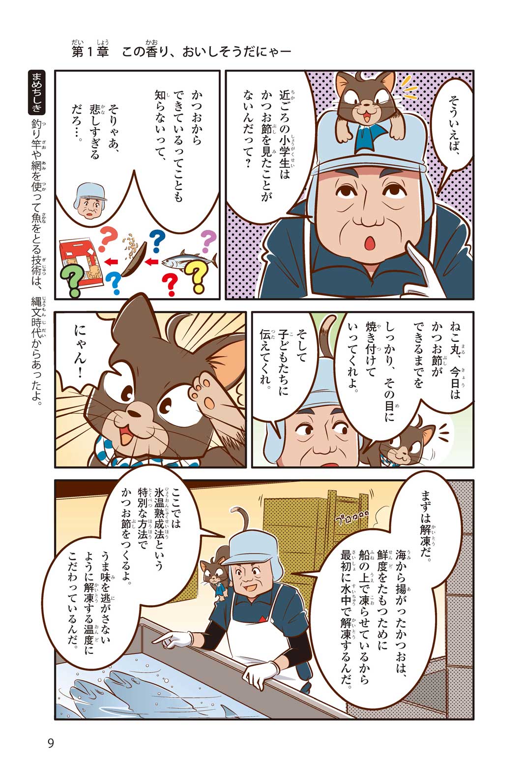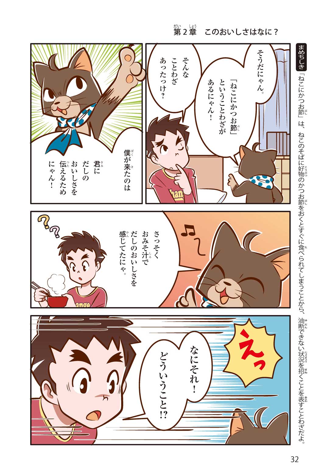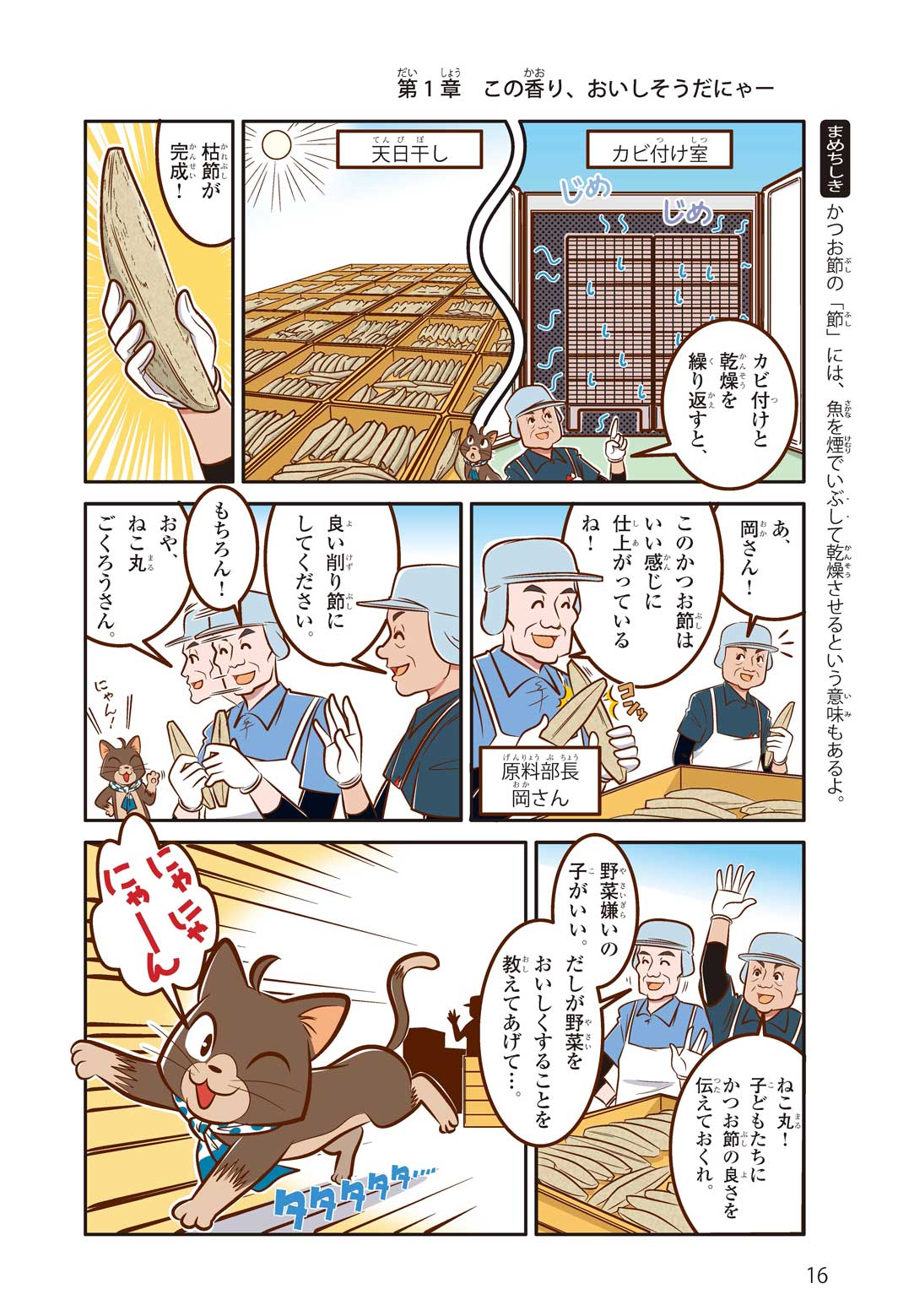 小学5年生の男の子、カイトは、野菜が苦手(にがて)で、家でも学校でも、野菜がメインの料理は残してしまいがち……。それに比べて好物(こうぶつ)は、ハンバーグにカレーライス、ラーメン、焼肉と、野菜の少ない外国の料理ばかり! でも、ある日の夕食で、空腹(くうふく)といい香りにつられてなにげなく食べた野菜のお味噌汁(みそしる)が、とってもおいしいことに気付いたよ! その夜カイトの前に、不思議(ふしぎ)なねこが出現(しゅつげん)。ねこは、だしのおいしさを子どもたちに伝えるためにやってきた、かつお節(ぶし)の妖精(ようせい)、ねこ丸だった。カイトは、ねこ丸に連れられて、クラスメイトのマキちゃんと一緒に、大昔にタイムスリップしたり、かつお節とだしの研究所へ行ったりと、かつお節やだしの歴史や作られ方などのひみつをたずねていくよ!