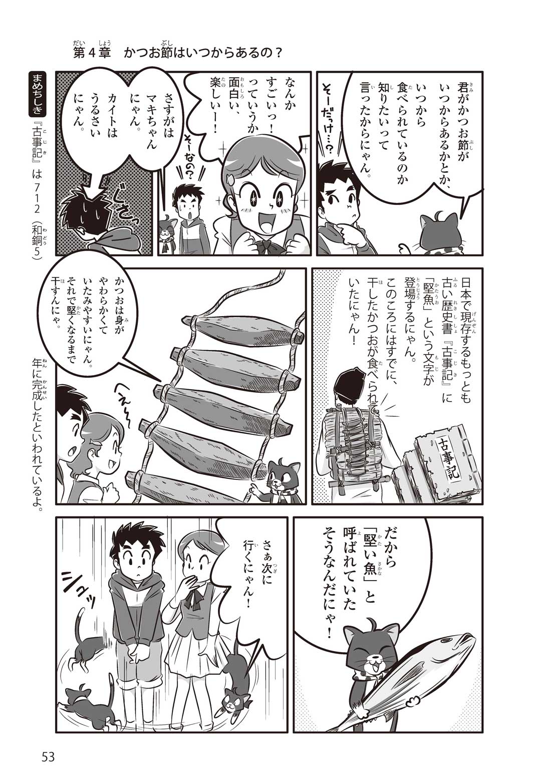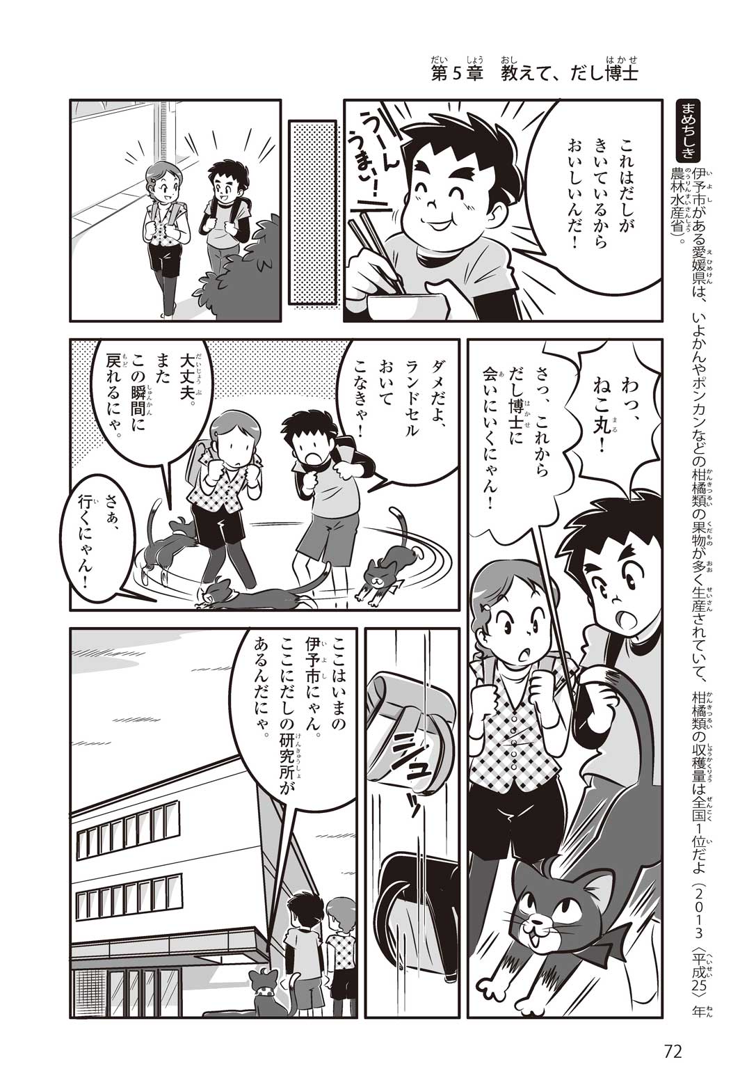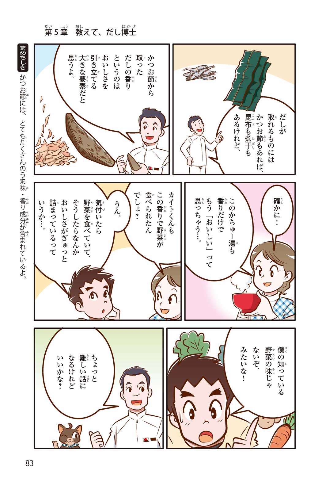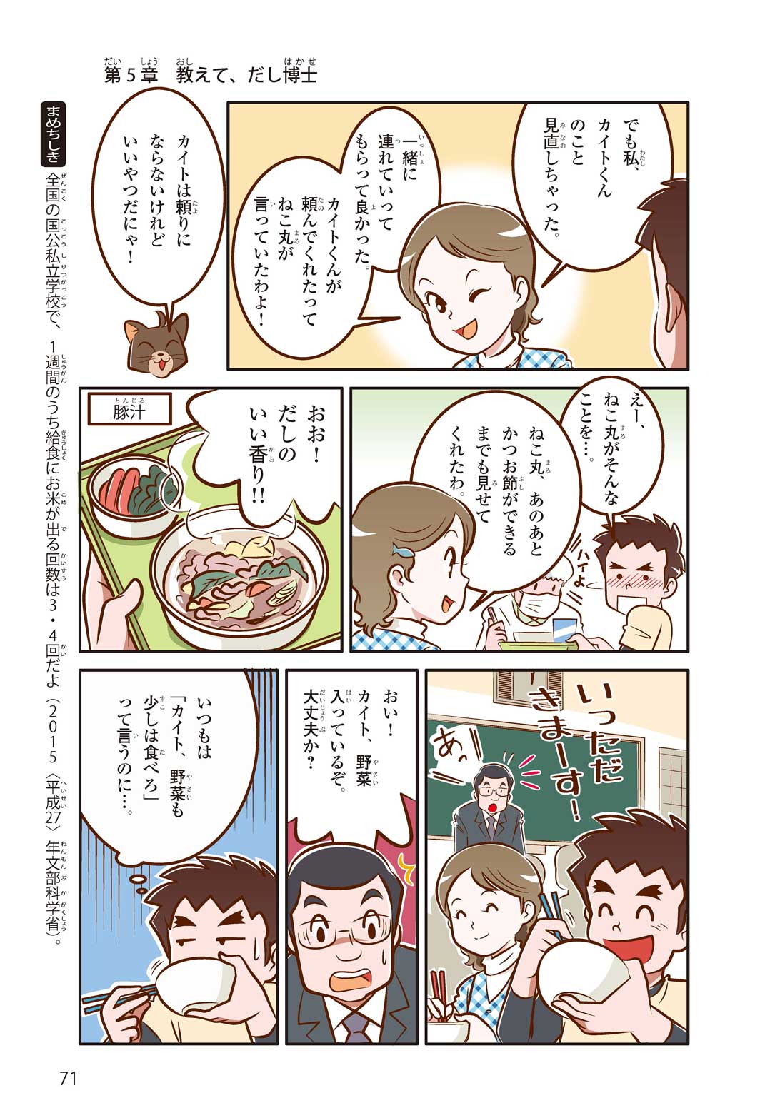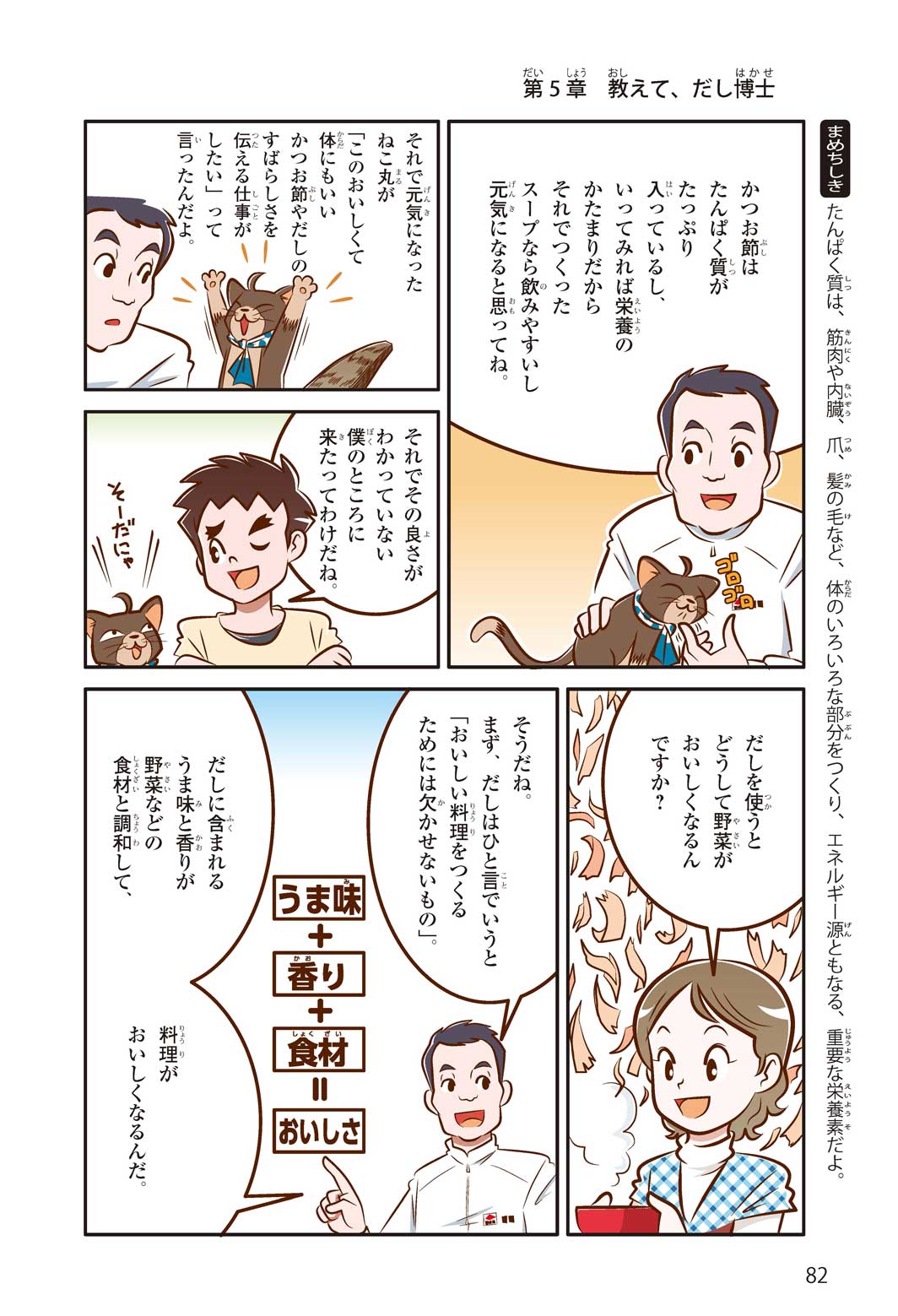 小学5年生の男の子、カイトは、野菜が苦手(にがて)で、家でも学校でも、野菜がメインの料理は残してしまいがち……。それに比べて好物(こうぶつ)は、ハンバーグにカレーライス、ラーメン、焼肉と、野菜の少ない外国の料理ばかり! でも、ある日の夕食で、空腹(くうふく)といい香りにつられてなにげなく食べた野菜のお味噌汁(みそしる)が、とってもおいしいことに気付いたよ! その夜カイトの前に、不思議(ふしぎ)なねこが出現(しゅつげん)。ねこは、だしのおいしさを子どもたちに伝えるためにやってきた、かつお節(ぶし)の妖精(ようせい)、ねこ丸だった。カイトは、ねこ丸に連れられて、クラスメイトのマキちゃんと一緒に、大昔にタイムスリップしたり、かつお節とだしの研究所へ行ったりと、かつお節やだしの歴史や作られ方などのひみつをたずねていくよ!