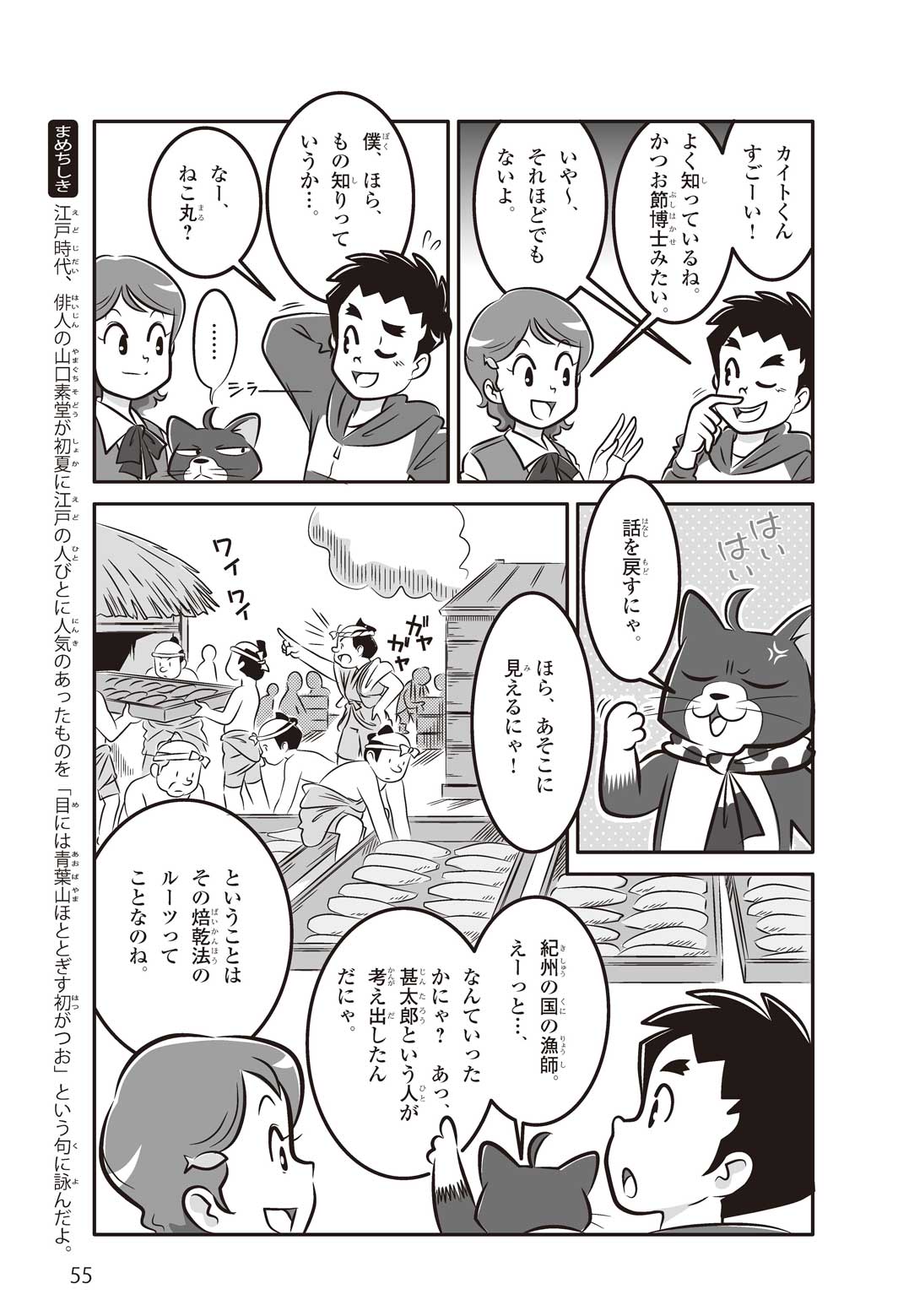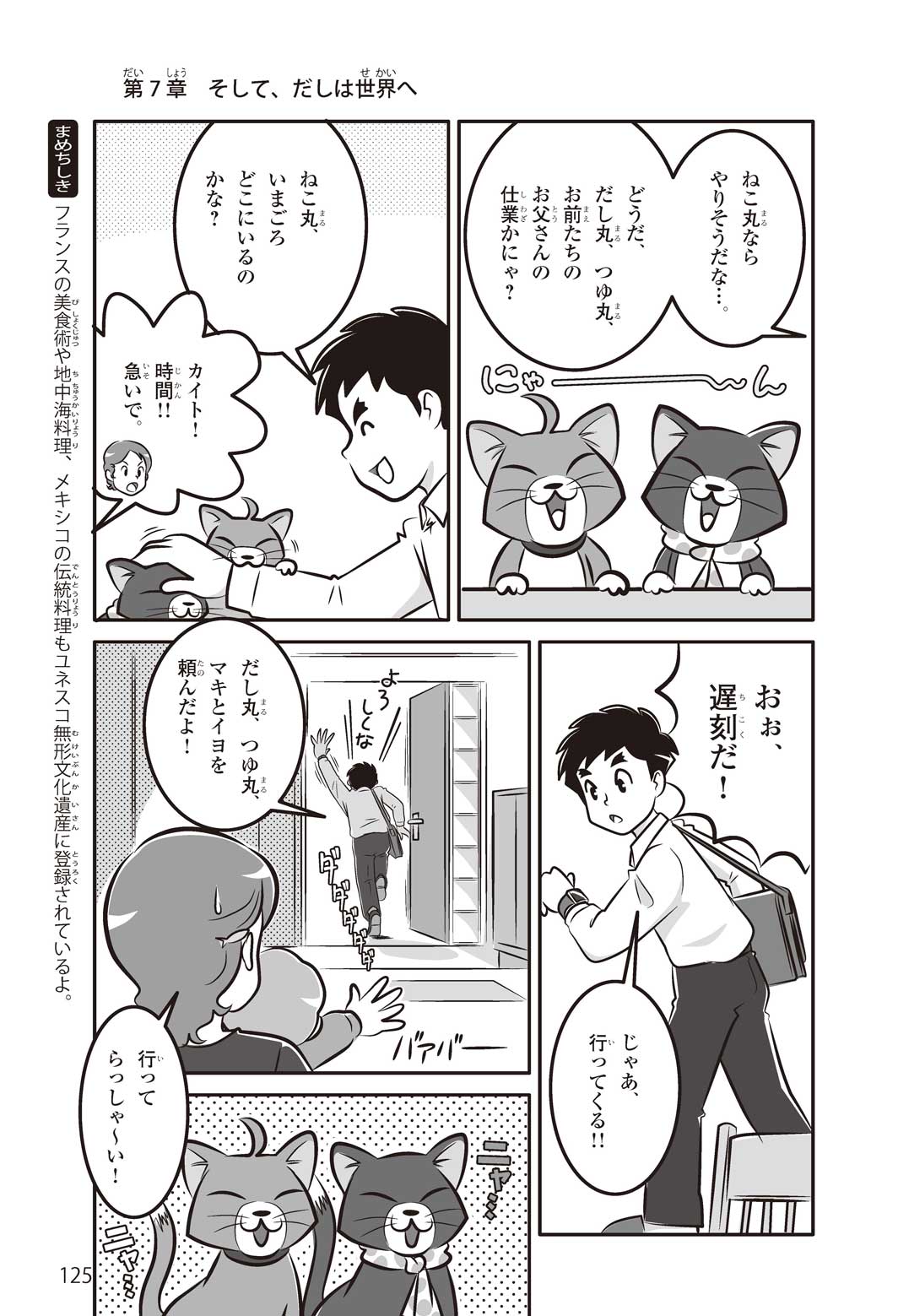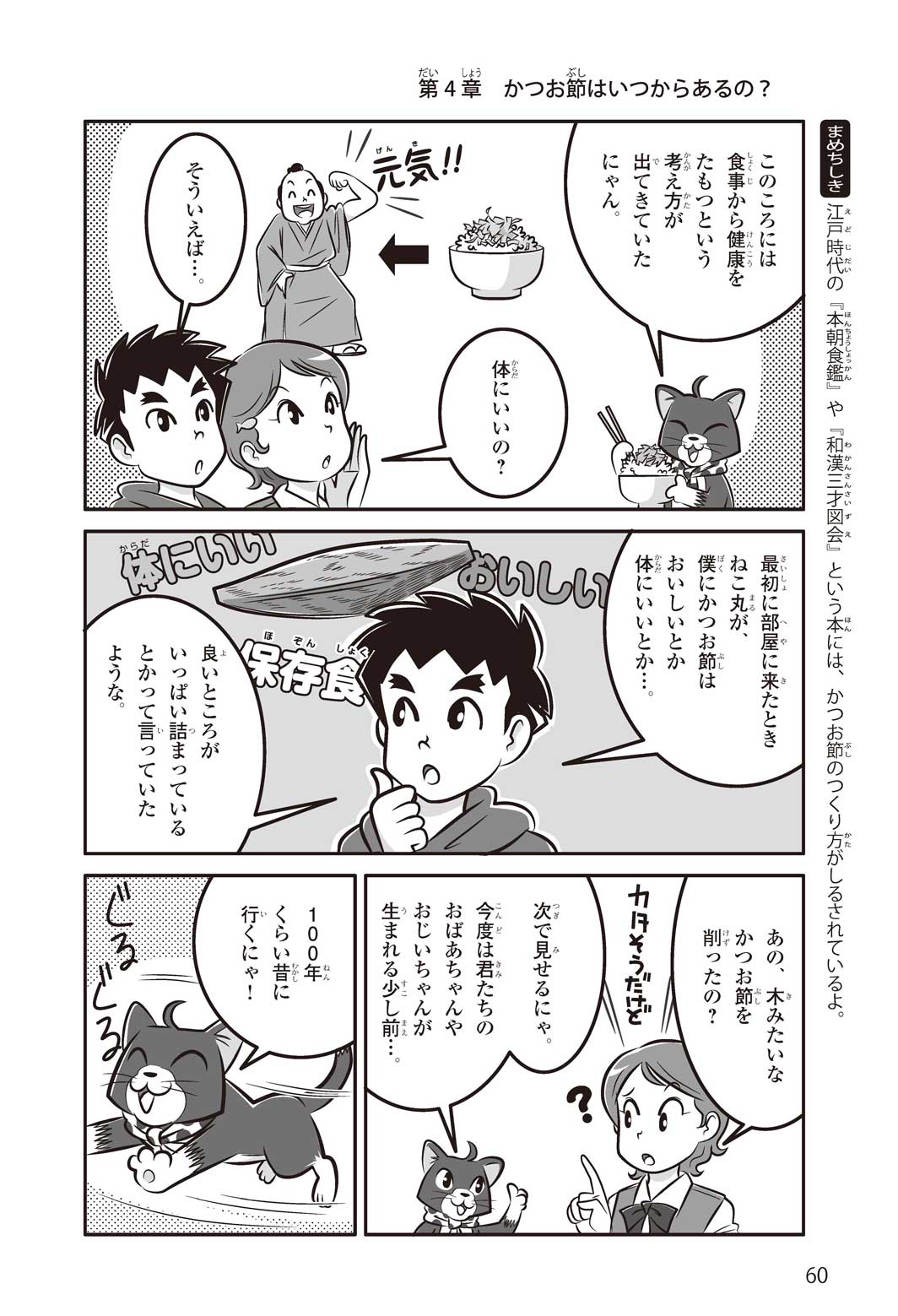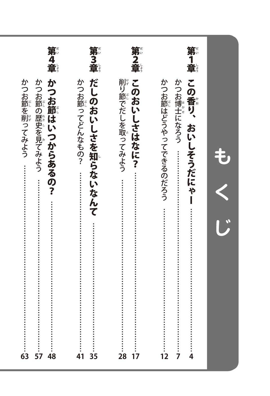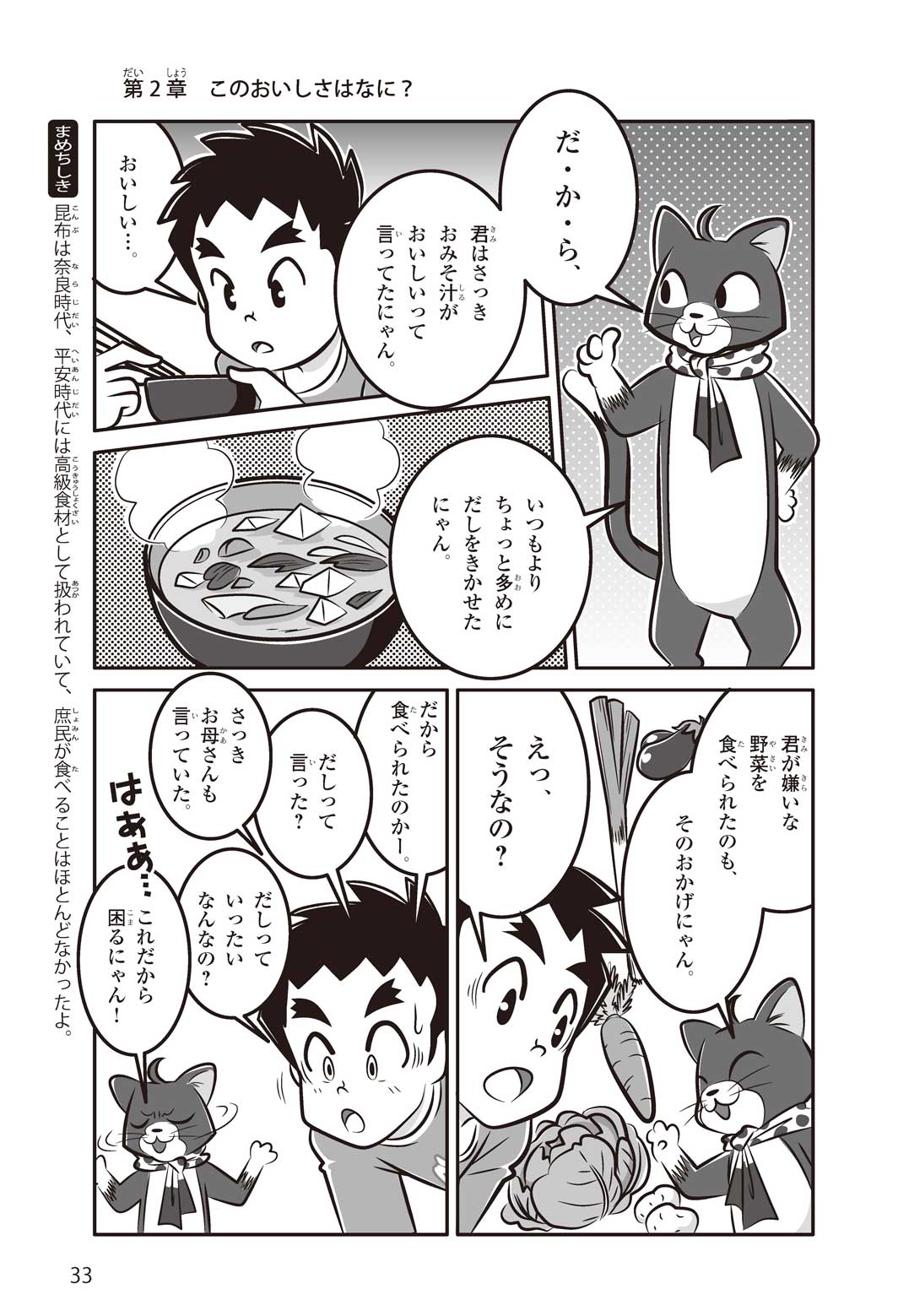 小学5年生の男の子、カイトは、野菜が苦手(にがて)で、家でも学校でも、野菜がメインの料理は残してしまいがち……。それに比べて好物(こうぶつ)は、ハンバーグにカレーライス、ラーメン、焼肉と、野菜の少ない外国の料理ばかり! でも、ある日の夕食で、空腹(くうふく)といい香りにつられてなにげなく食べた野菜のお味噌汁(みそしる)が、とってもおいしいことに気付いたよ! その夜カイトの前に、不思議(ふしぎ)なねこが出現(しゅつげん)。ねこは、だしのおいしさを子どもたちに伝えるためにやってきた、かつお節(ぶし)の妖精(ようせい)、ねこ丸だった。カイトは、ねこ丸に連れられて、クラスメイトのマキちゃんと一緒に、大昔にタイムスリップしたり、かつお節とだしの研究所へ行ったりと、かつお節やだしの歴史や作られ方などのひみつをたずねていくよ!