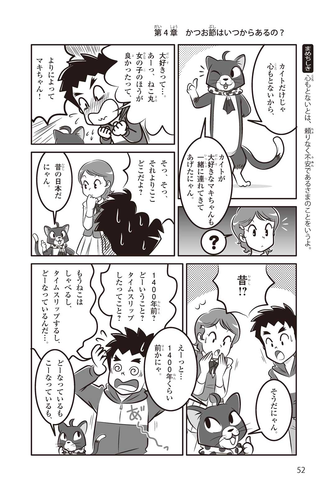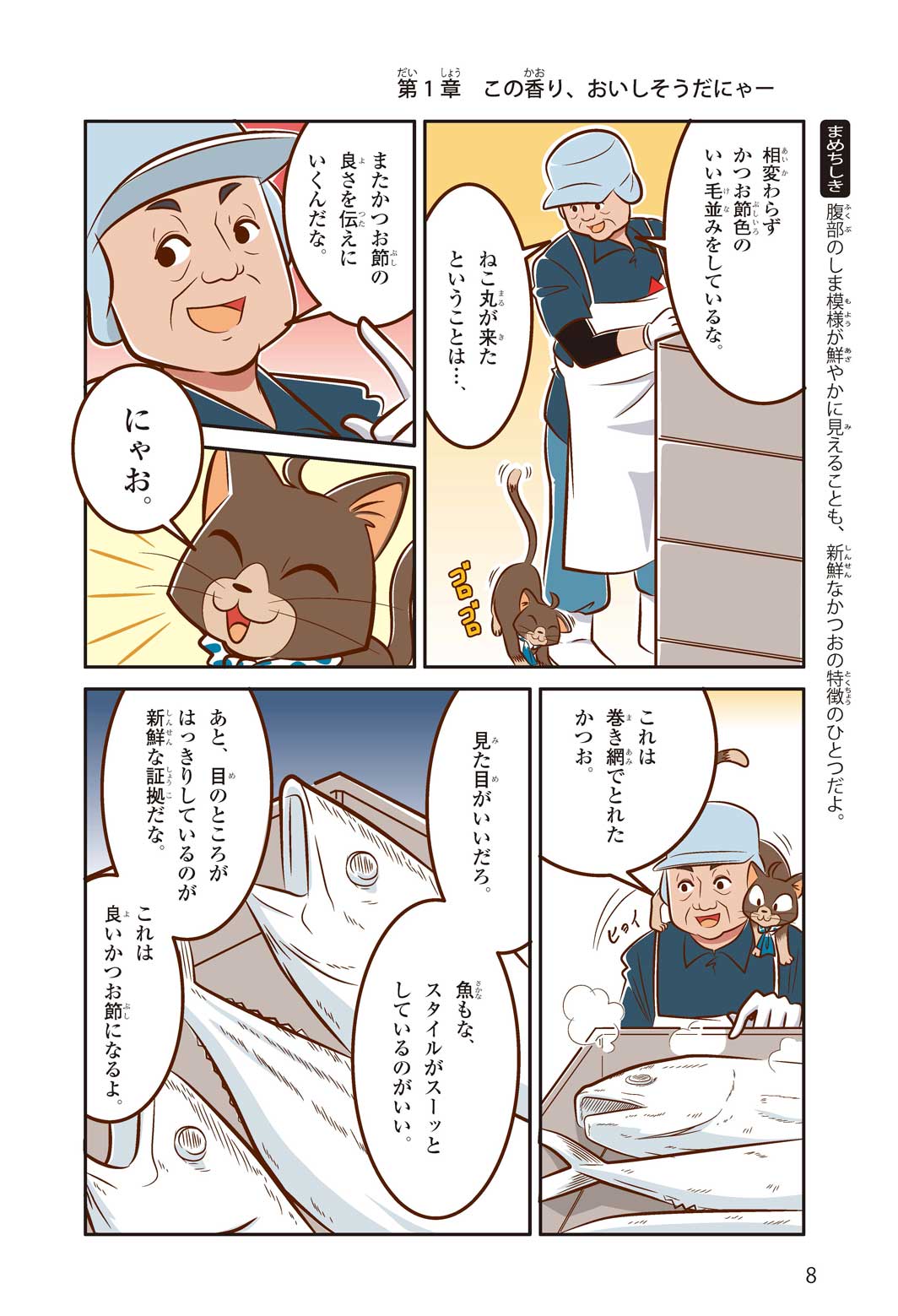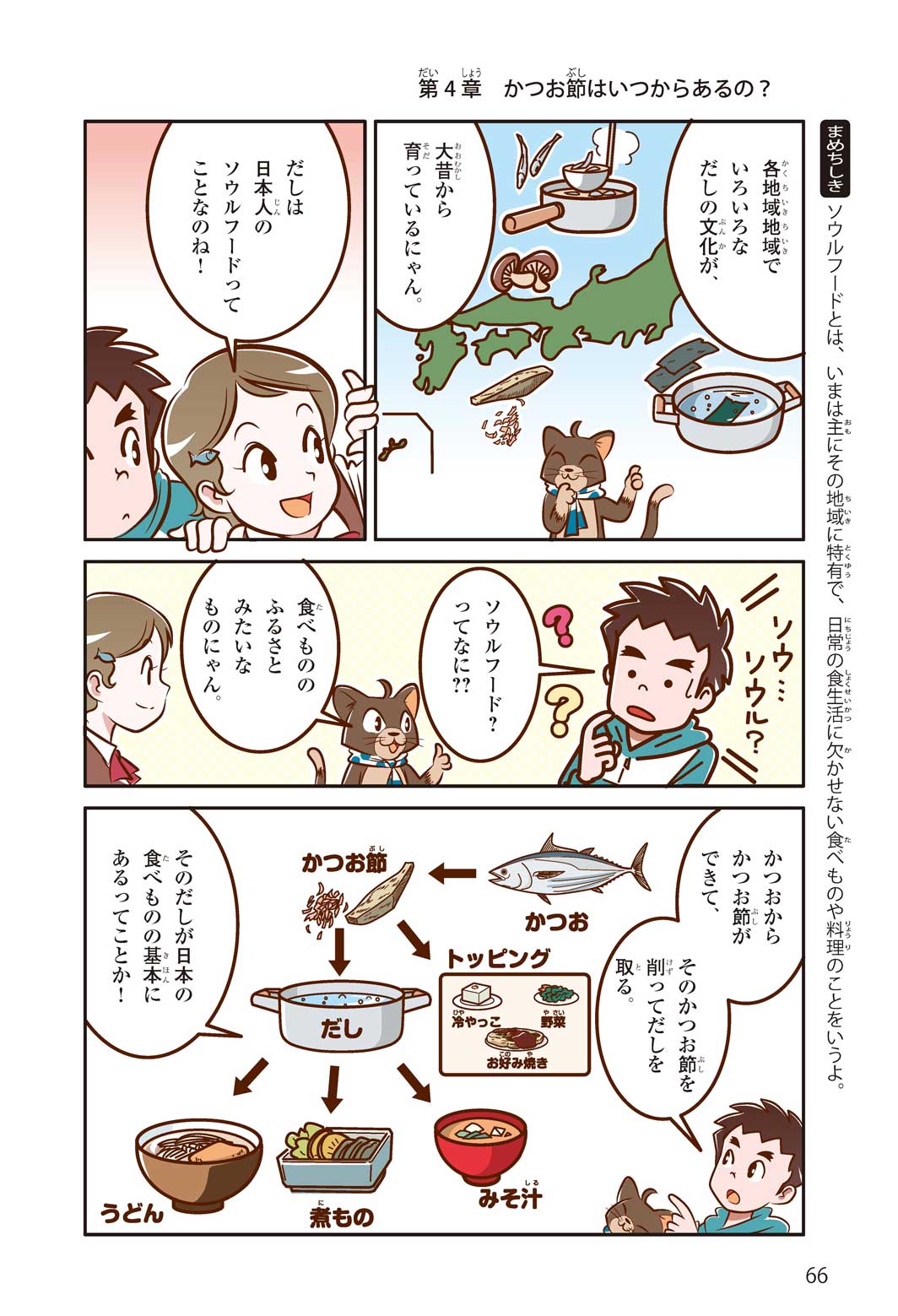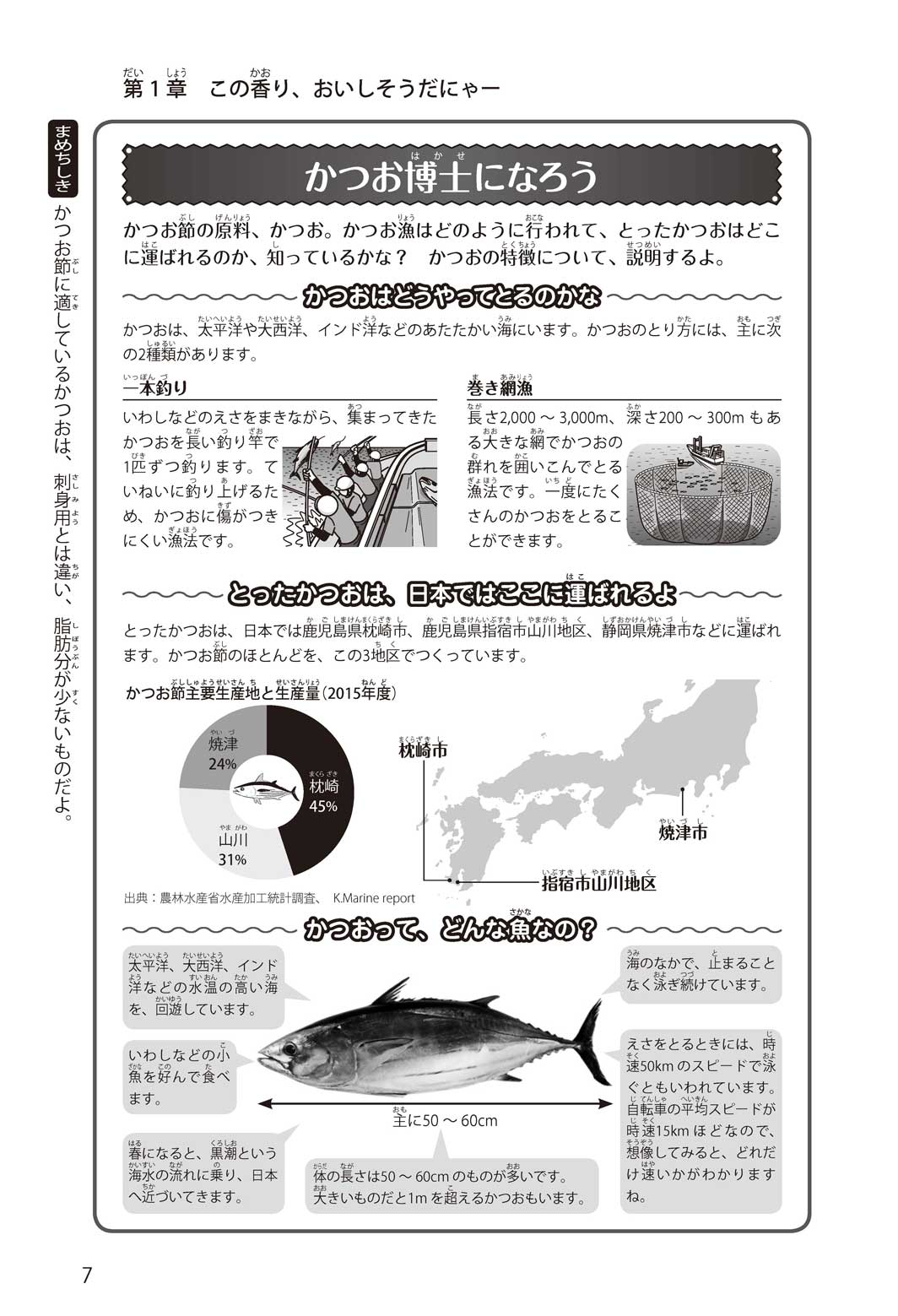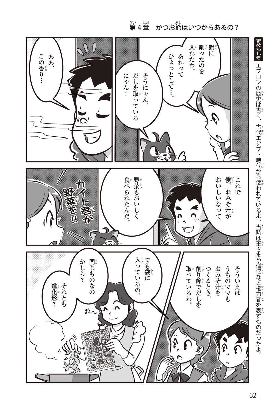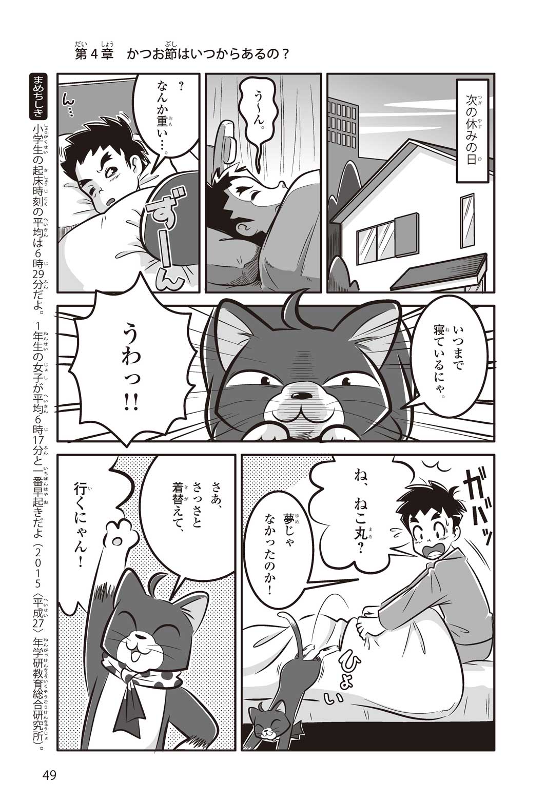 小学5年生の男の子、カイトは、野菜が苦手(にがて)で、家でも学校でも、野菜がメインの料理は残してしまいがち……。それに比べて好物(こうぶつ)は、ハンバーグにカレーライス、ラーメン、焼肉と、野菜の少ない外国の料理ばかり! でも、ある日の夕食で、空腹(くうふく)といい香りにつられてなにげなく食べた野菜のお味噌汁(みそしる)が、とってもおいしいことに気付いたよ! その夜カイトの前に、不思議(ふしぎ)なねこが出現(しゅつげん)。ねこは、だしのおいしさを子どもたちに伝えるためにやってきた、かつお節(ぶし)の妖精(ようせい)、ねこ丸だった。カイトは、ねこ丸に連れられて、クラスメイトのマキちゃんと一緒に、大昔にタイムスリップしたり、かつお節とだしの研究所へ行ったりと、かつお節やだしの歴史や作られ方などのひみつをたずねていくよ!
