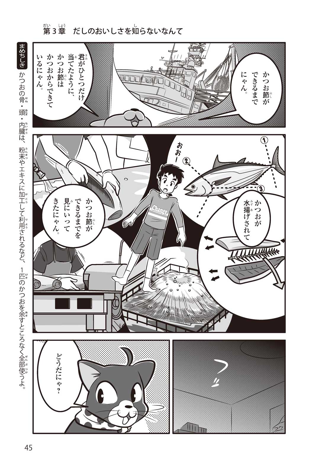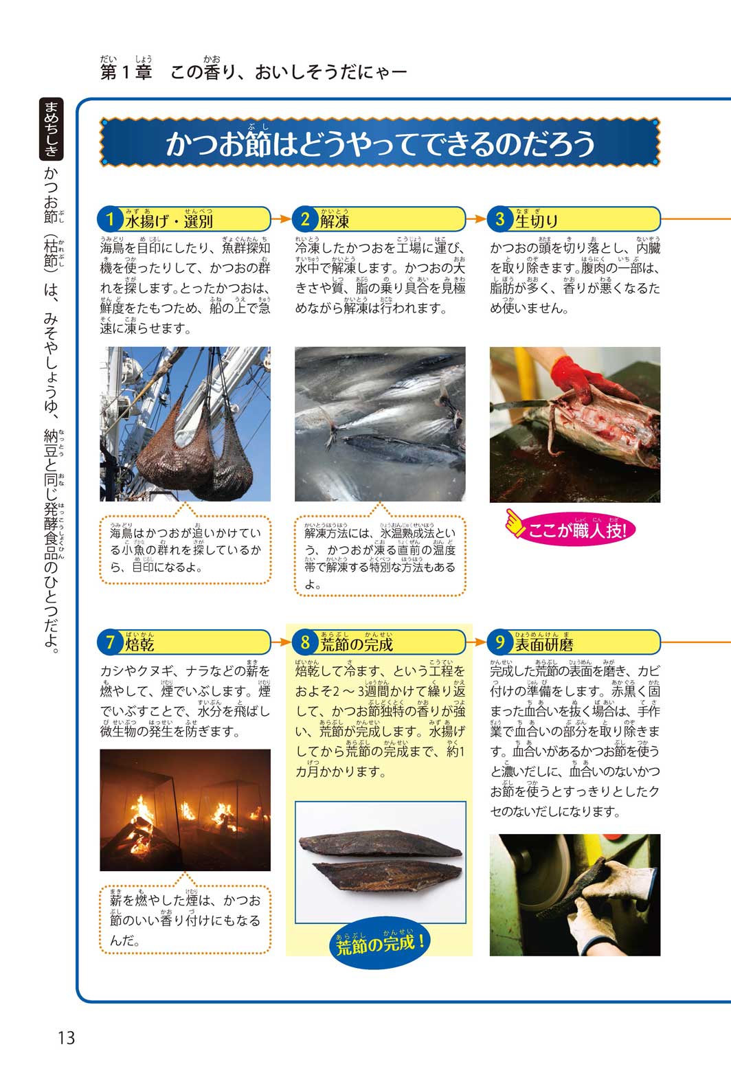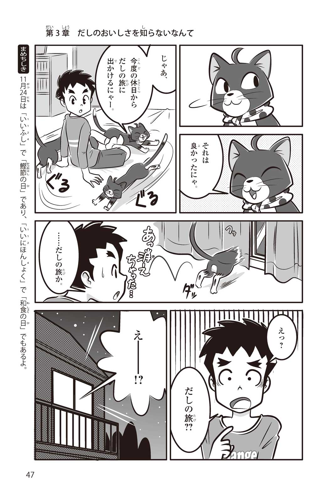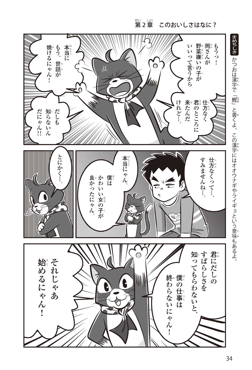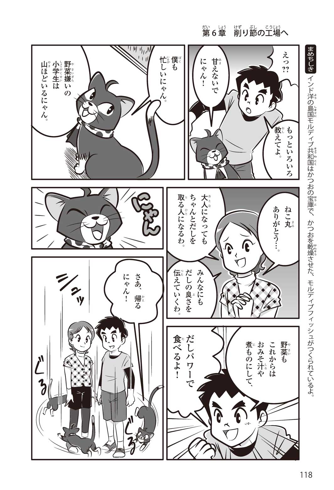 小学5年生の男の子、カイトは、野菜が苦手(にがて)で、家でも学校でも、野菜がメインの料理は残してしまいがち……。それに比べて好物(こうぶつ)は、ハンバーグにカレーライス、ラーメン、焼肉と、野菜の少ない外国の料理ばかり! でも、ある日の夕食で、空腹(くうふく)といい香りにつられてなにげなく食べた野菜のお味噌汁(みそしる)が、とってもおいしいことに気付いたよ! その夜カイトの前に、不思議(ふしぎ)なねこが出現(しゅつげん)。ねこは、だしのおいしさを子どもたちに伝えるためにやってきた、かつお節(ぶし)の妖精(ようせい)、ねこ丸だった。カイトは、ねこ丸に連れられて、クラスメイトのマキちゃんと一緒に、大昔にタイムスリップしたり、かつお節とだしの研究所へ行ったりと、かつお節やだしの歴史や作られ方などのひみつをたずねていくよ!