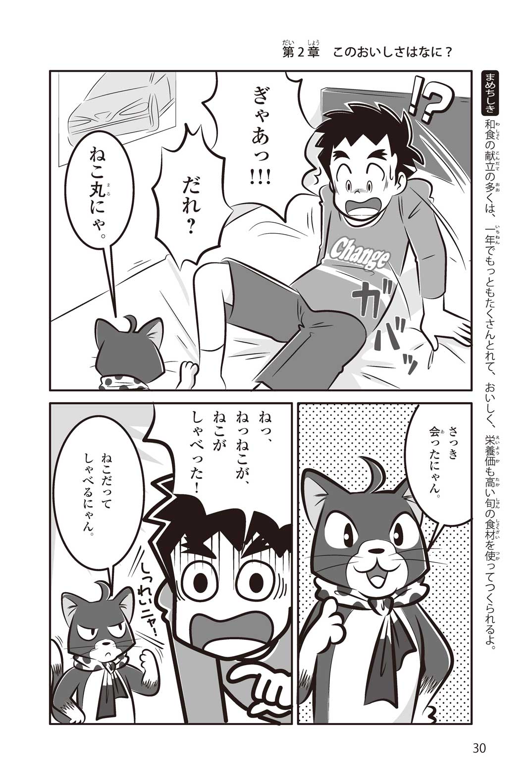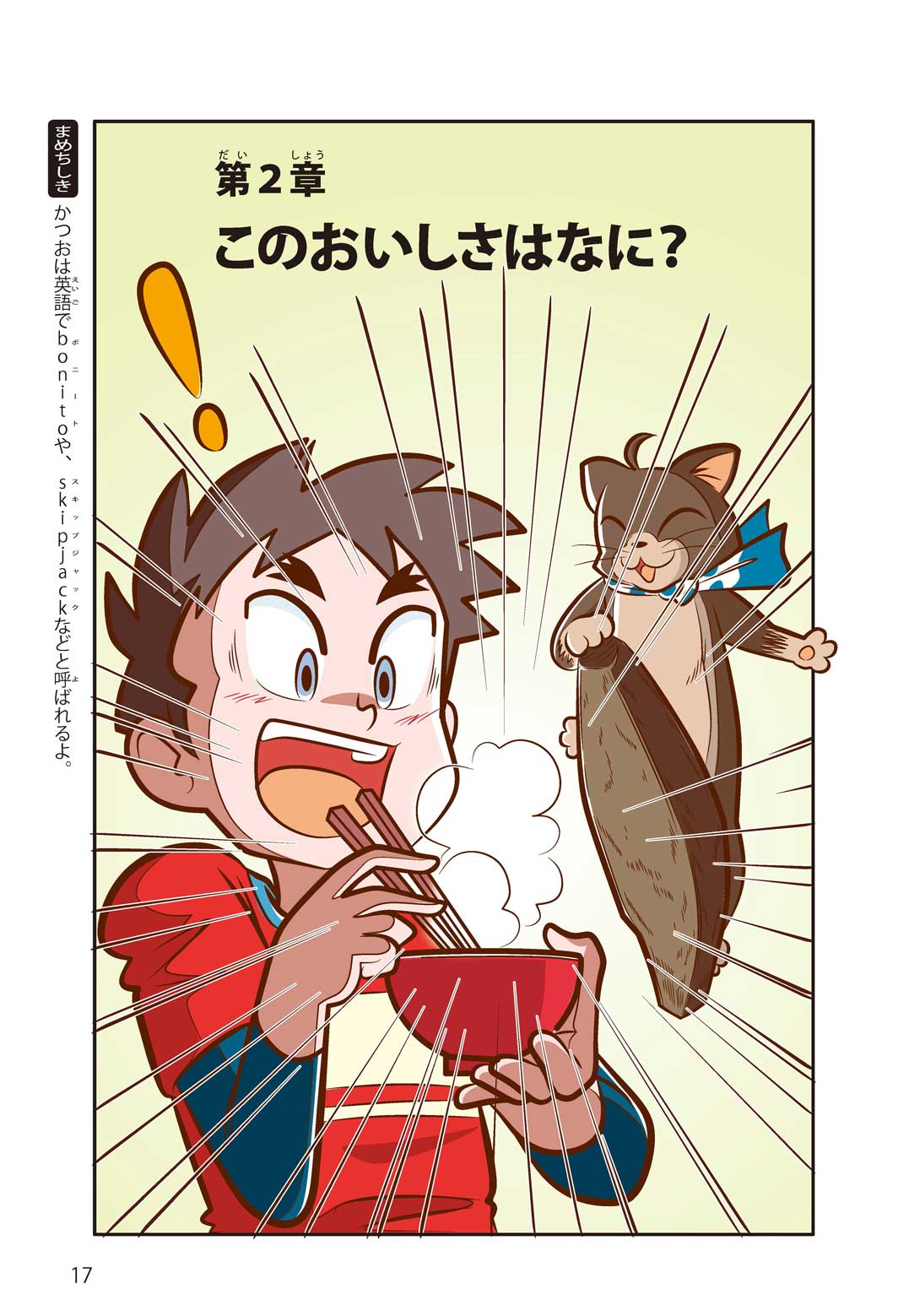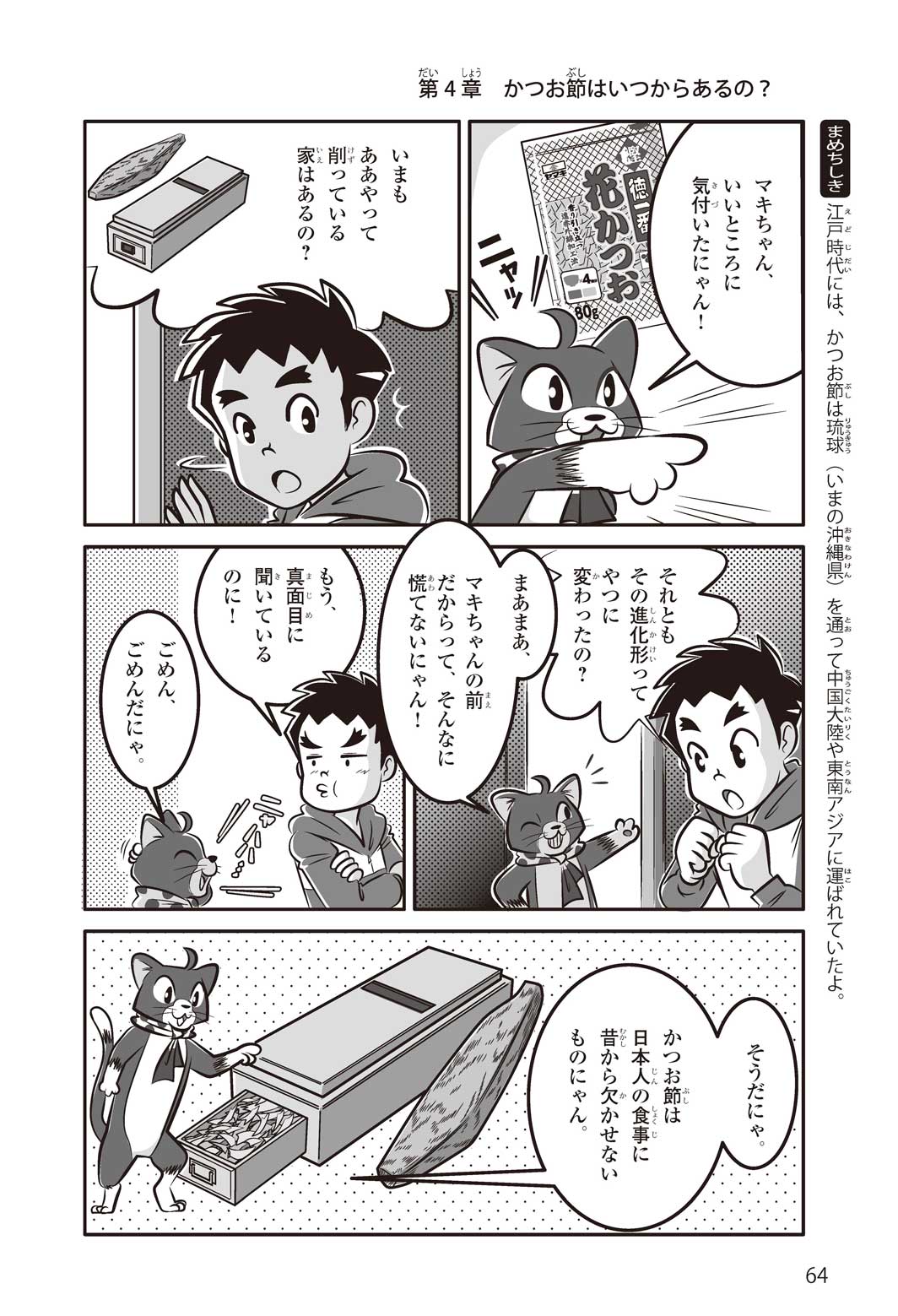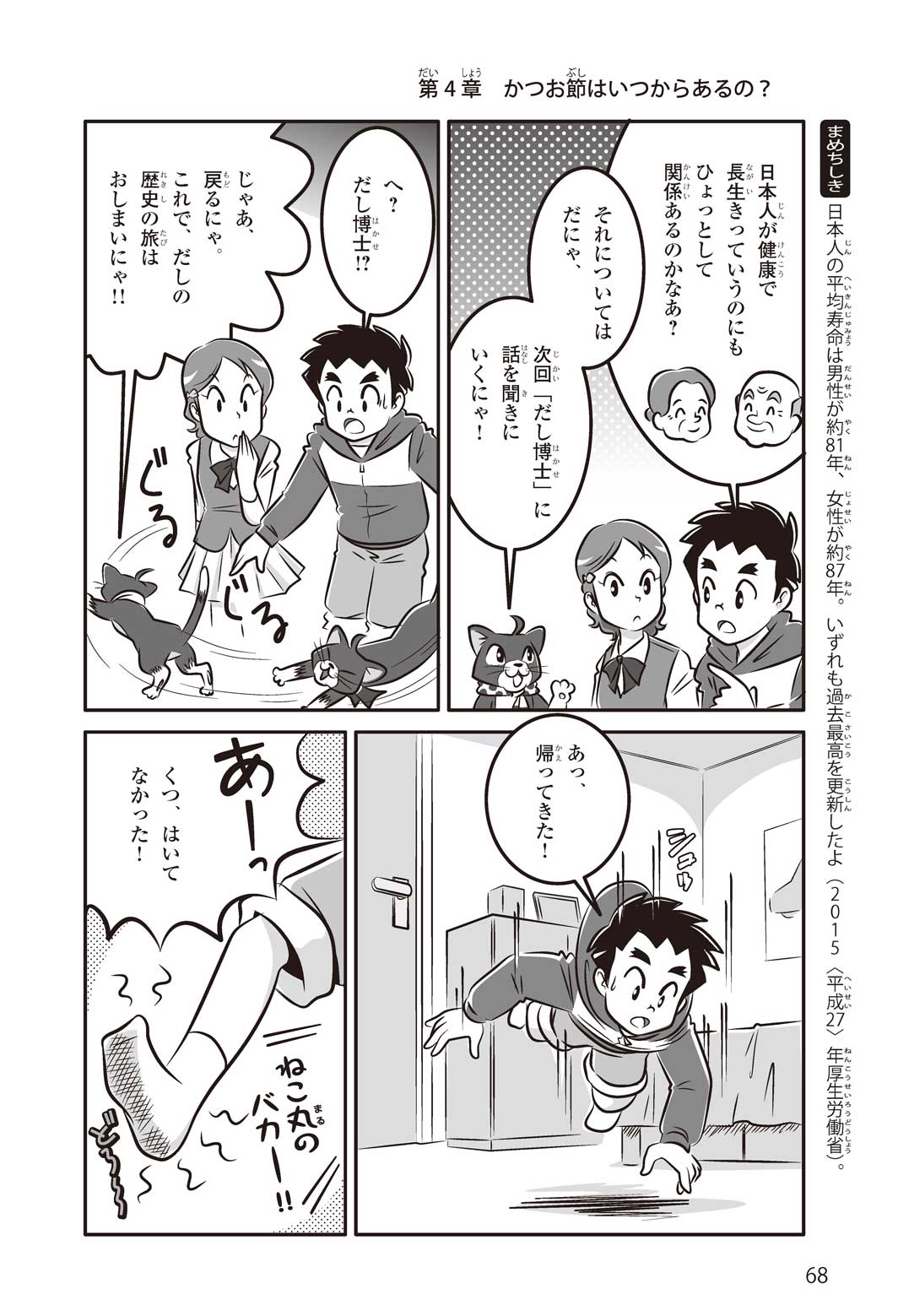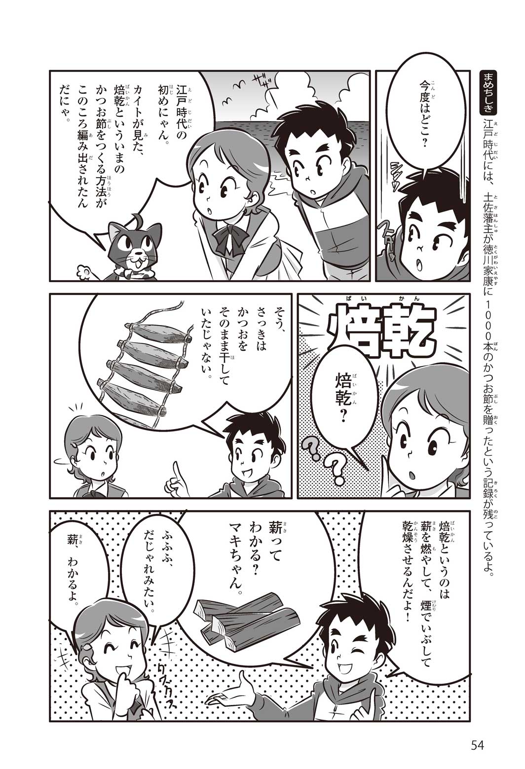 小学5年生の男の子、カイトは、野菜が苦手(にがて)で、家でも学校でも、野菜がメインの料理は残してしまいがち……。それに比べて好物(こうぶつ)は、ハンバーグにカレーライス、ラーメン、焼肉と、野菜の少ない外国の料理ばかり! でも、ある日の夕食で、空腹(くうふく)といい香りにつられてなにげなく食べた野菜のお味噌汁(みそしる)が、とってもおいしいことに気付いたよ! その夜カイトの前に、不思議(ふしぎ)なねこが出現(しゅつげん)。ねこは、だしのおいしさを子どもたちに伝えるためにやってきた、かつお節(ぶし)の妖精(ようせい)、ねこ丸だった。カイトは、ねこ丸に連れられて、クラスメイトのマキちゃんと一緒に、大昔にタイムスリップしたり、かつお節とだしの研究所へ行ったりと、かつお節やだしの歴史や作られ方などのひみつをたずねていくよ!