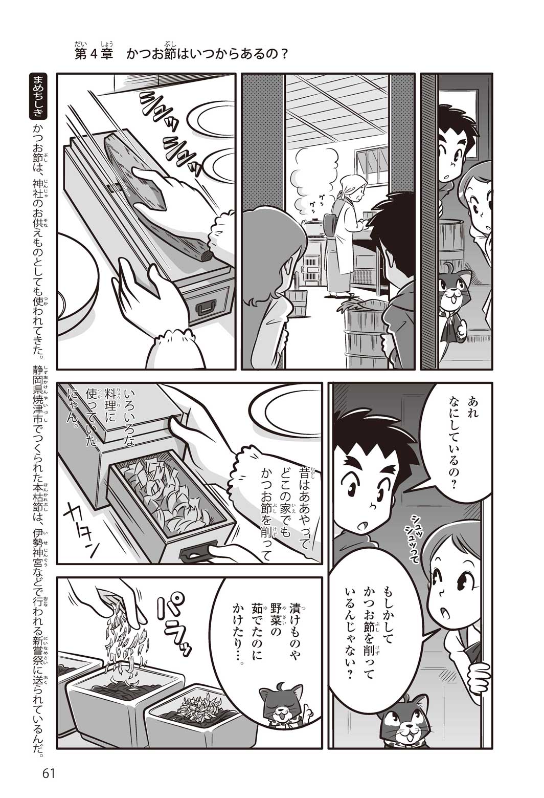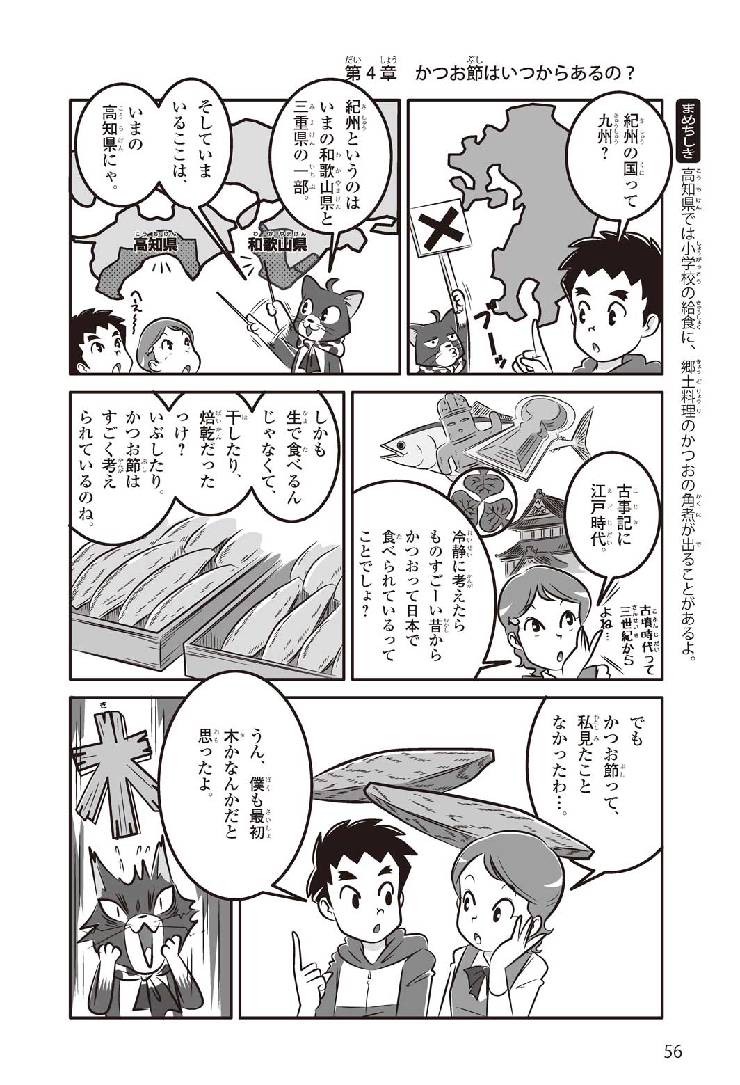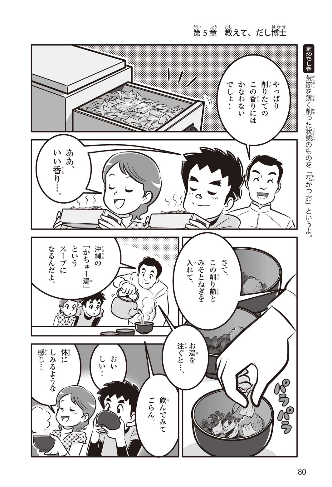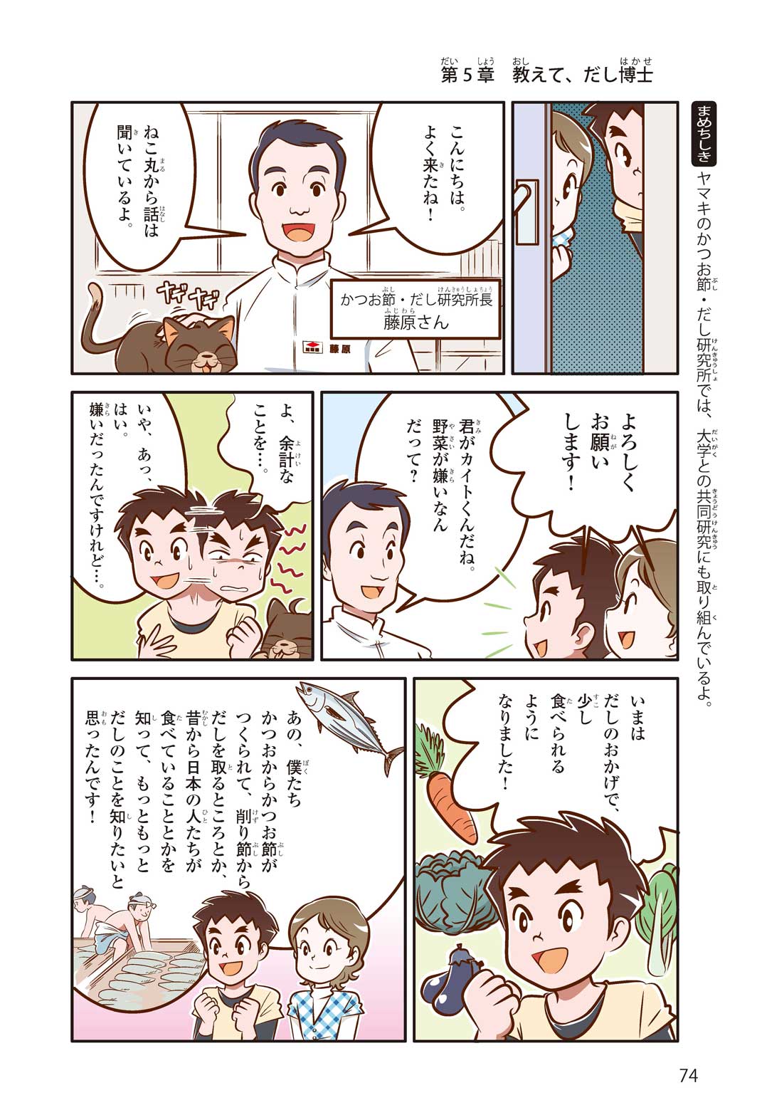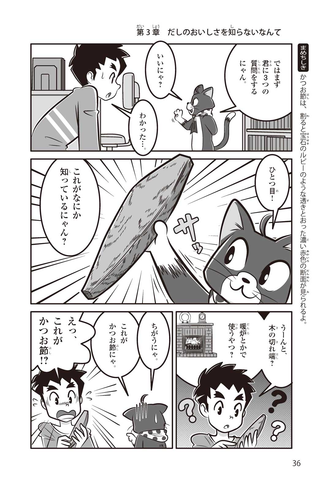 小学5年生の男の子、カイトは、野菜が苦手(にがて)で、家でも学校でも、野菜がメインの料理は残してしまいがち……。それに比べて好物(こうぶつ)は、ハンバーグにカレーライス、ラーメン、焼肉と、野菜の少ない外国の料理ばかり! でも、ある日の夕食で、空腹(くうふく)といい香りにつられてなにげなく食べた野菜のお味噌汁(みそしる)が、とってもおいしいことに気付いたよ! その夜カイトの前に、不思議(ふしぎ)なねこが出現(しゅつげん)。ねこは、だしのおいしさを子どもたちに伝えるためにやってきた、かつお節(ぶし)の妖精(ようせい)、ねこ丸だった。カイトは、ねこ丸に連れられて、クラスメイトのマキちゃんと一緒に、大昔にタイムスリップしたり、かつお節とだしの研究所へ行ったりと、かつお節やだしの歴史や作られ方などのひみつをたずねていくよ!