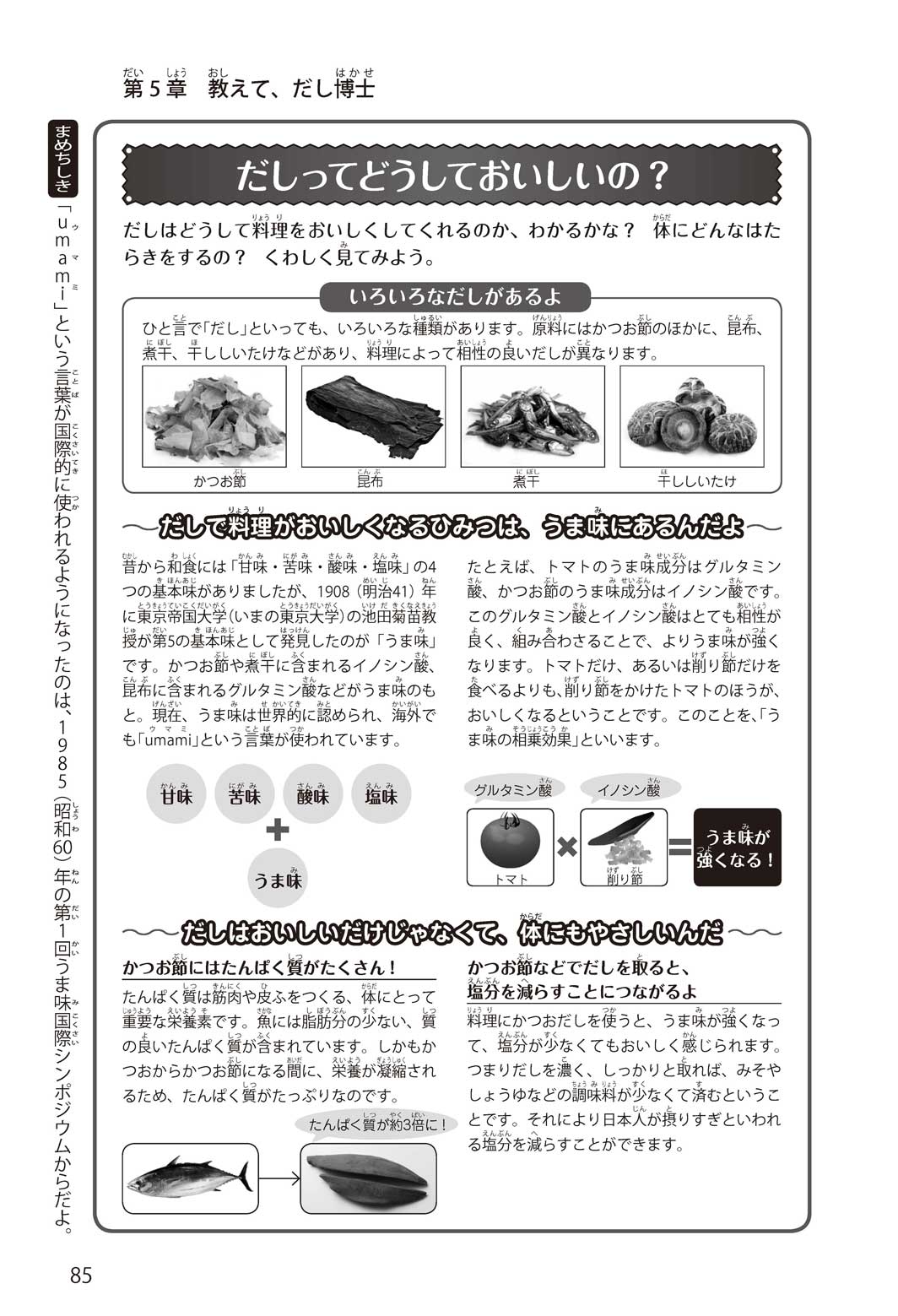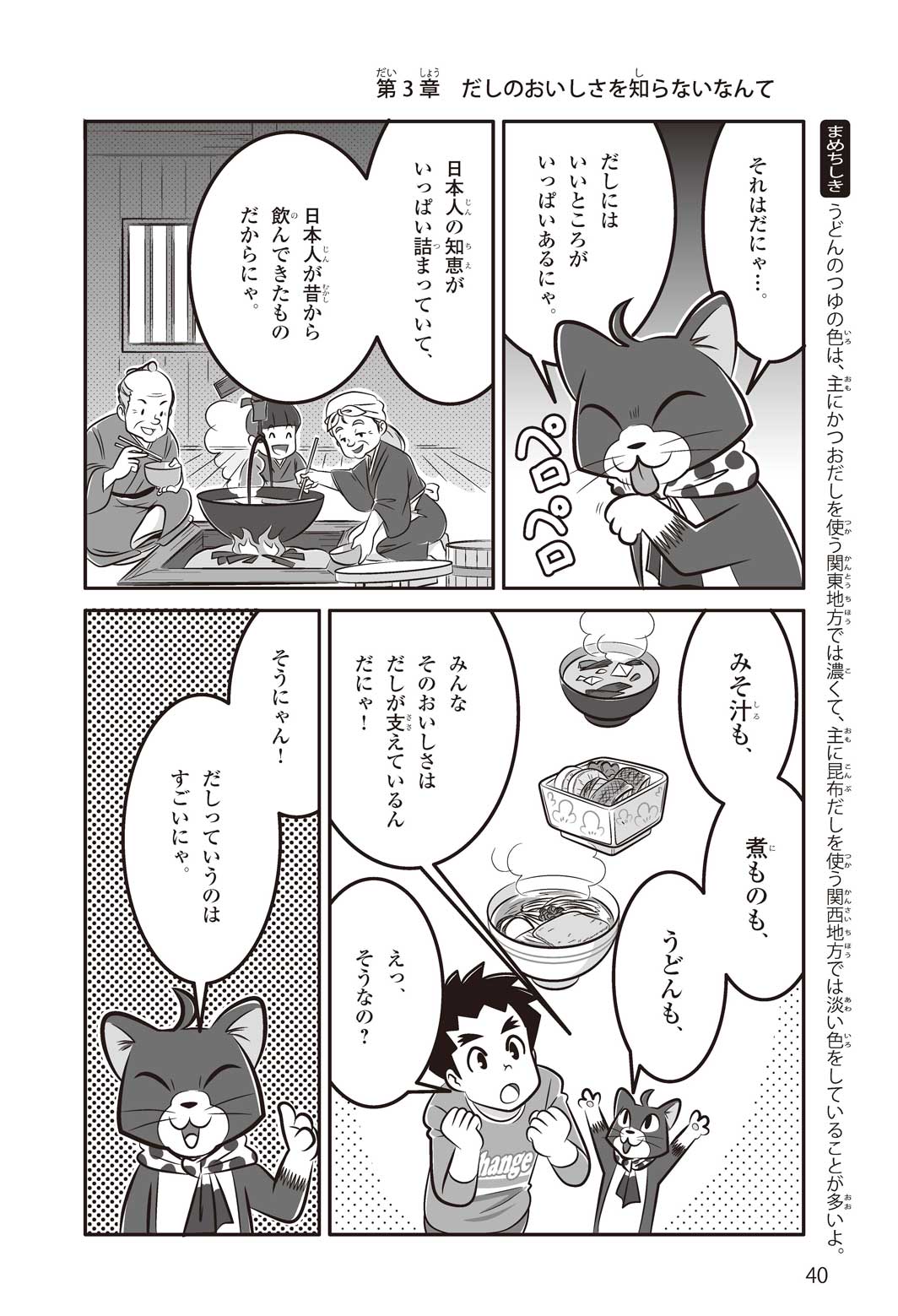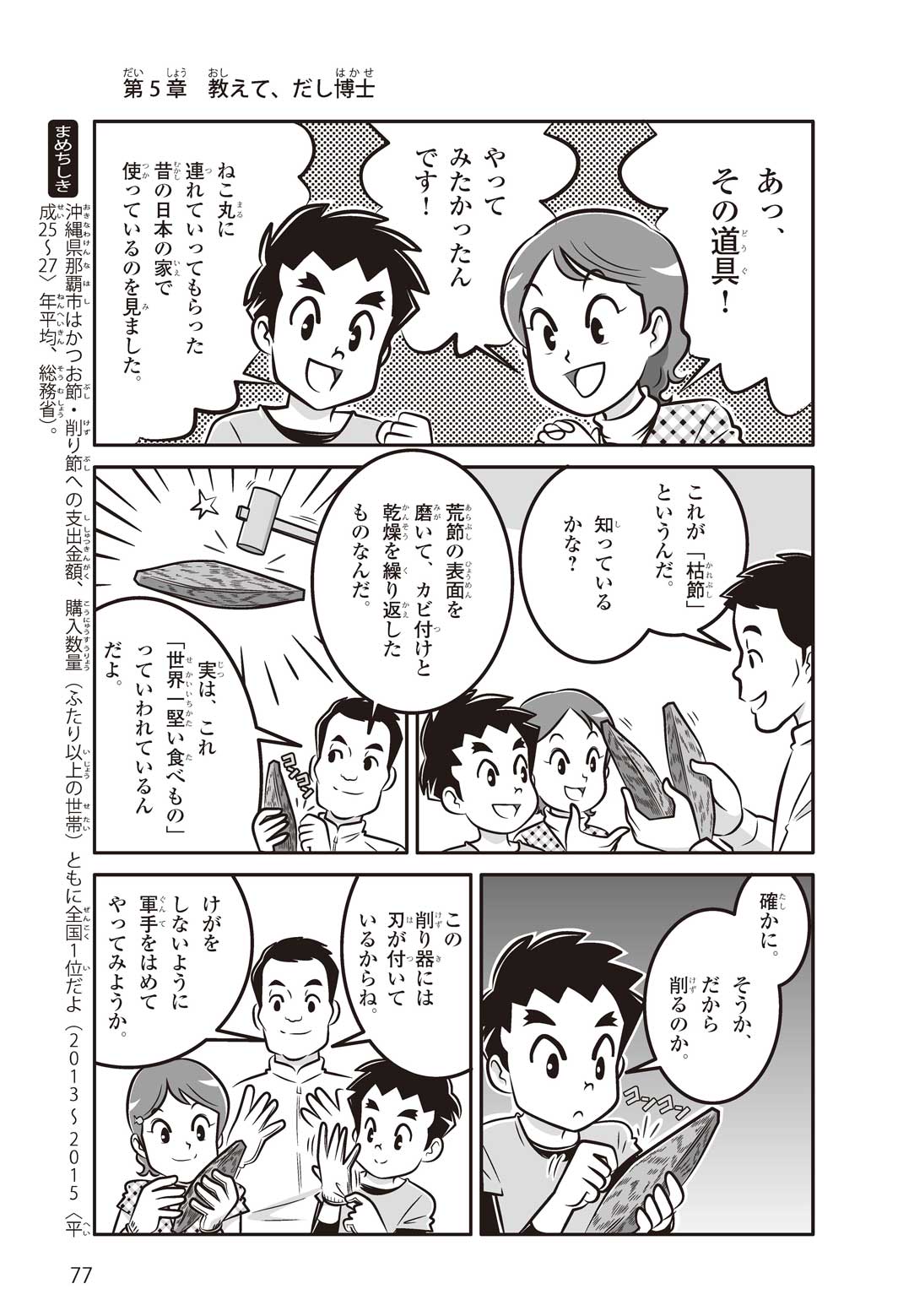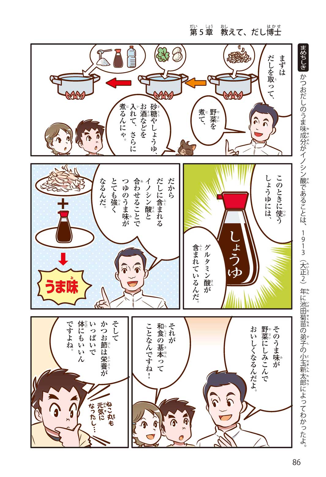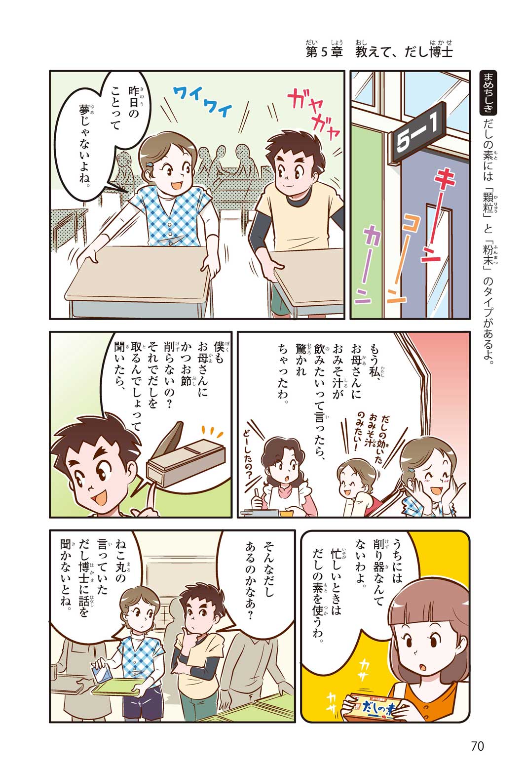 小学5年生の男の子、カイトは、野菜が苦手(にがて)で、家でも学校でも、野菜がメインの料理は残してしまいがち……。それに比べて好物(こうぶつ)は、ハンバーグにカレーライス、ラーメン、焼肉と、野菜の少ない外国の料理ばかり! でも、ある日の夕食で、空腹(くうふく)といい香りにつられてなにげなく食べた野菜のお味噌汁(みそしる)が、とってもおいしいことに気付いたよ! その夜カイトの前に、不思議(ふしぎ)なねこが出現(しゅつげん)。ねこは、だしのおいしさを子どもたちに伝えるためにやってきた、かつお節(ぶし)の妖精(ようせい)、ねこ丸だった。カイトは、ねこ丸に連れられて、クラスメイトのマキちゃんと一緒に、大昔にタイムスリップしたり、かつお節とだしの研究所へ行ったりと、かつお節やだしの歴史や作られ方などのひみつをたずねていくよ!