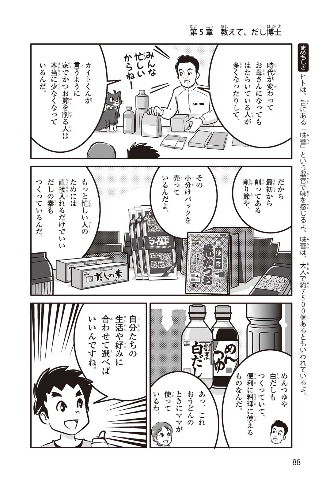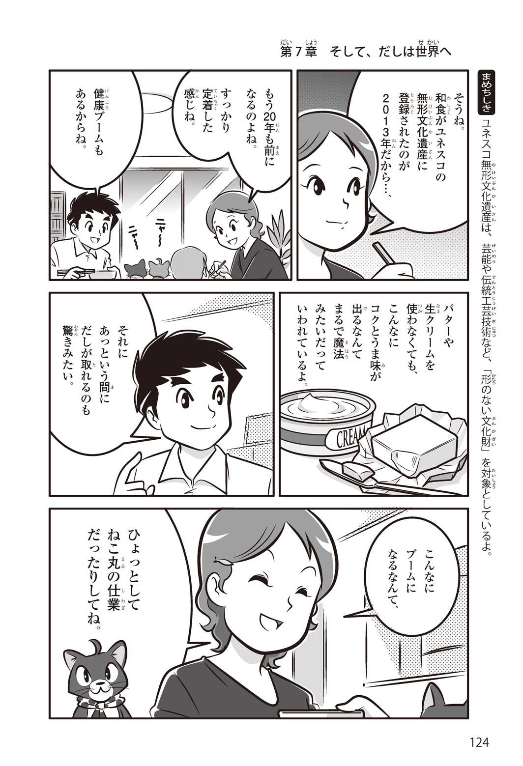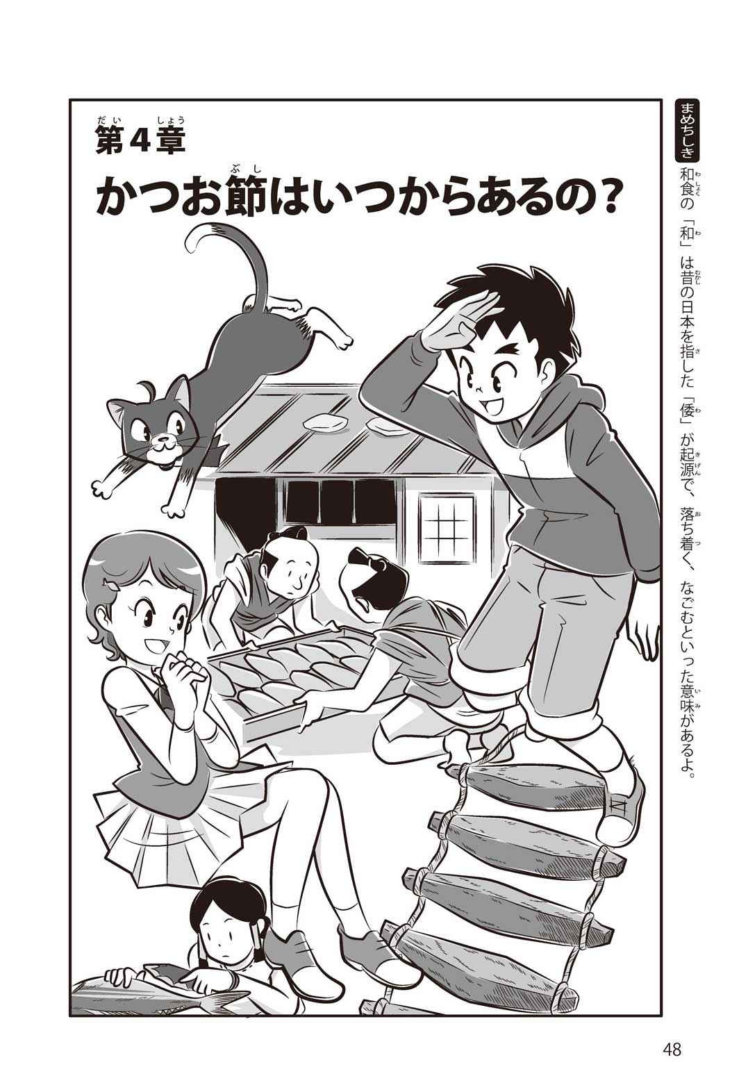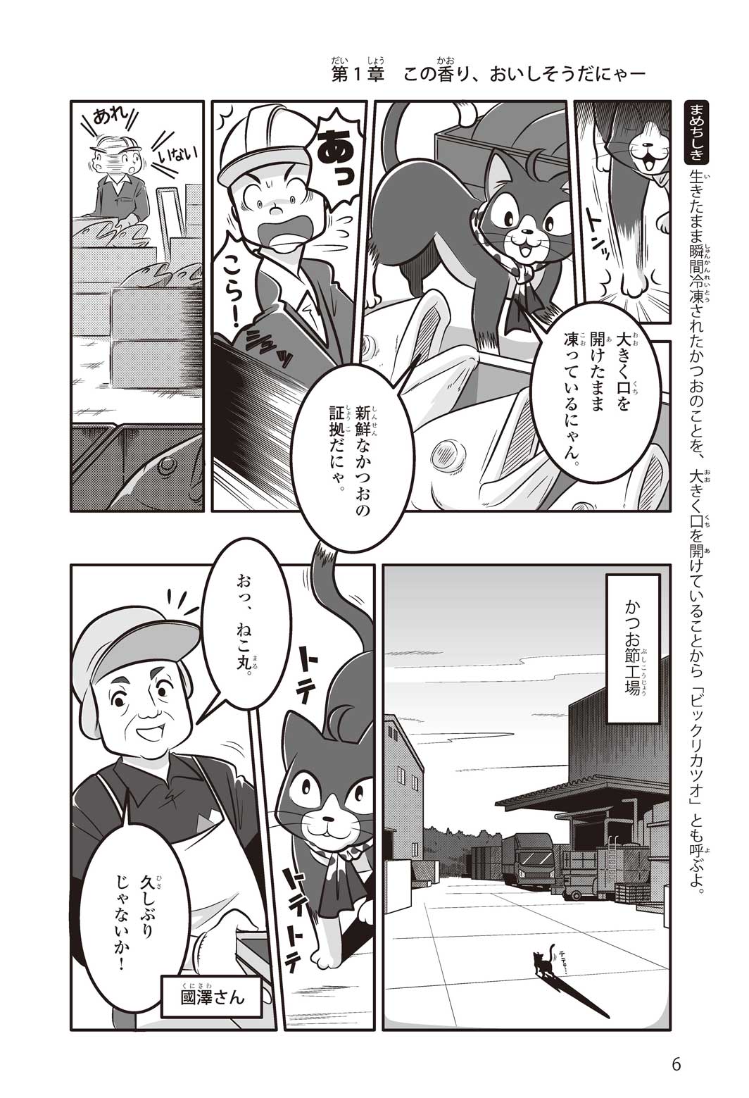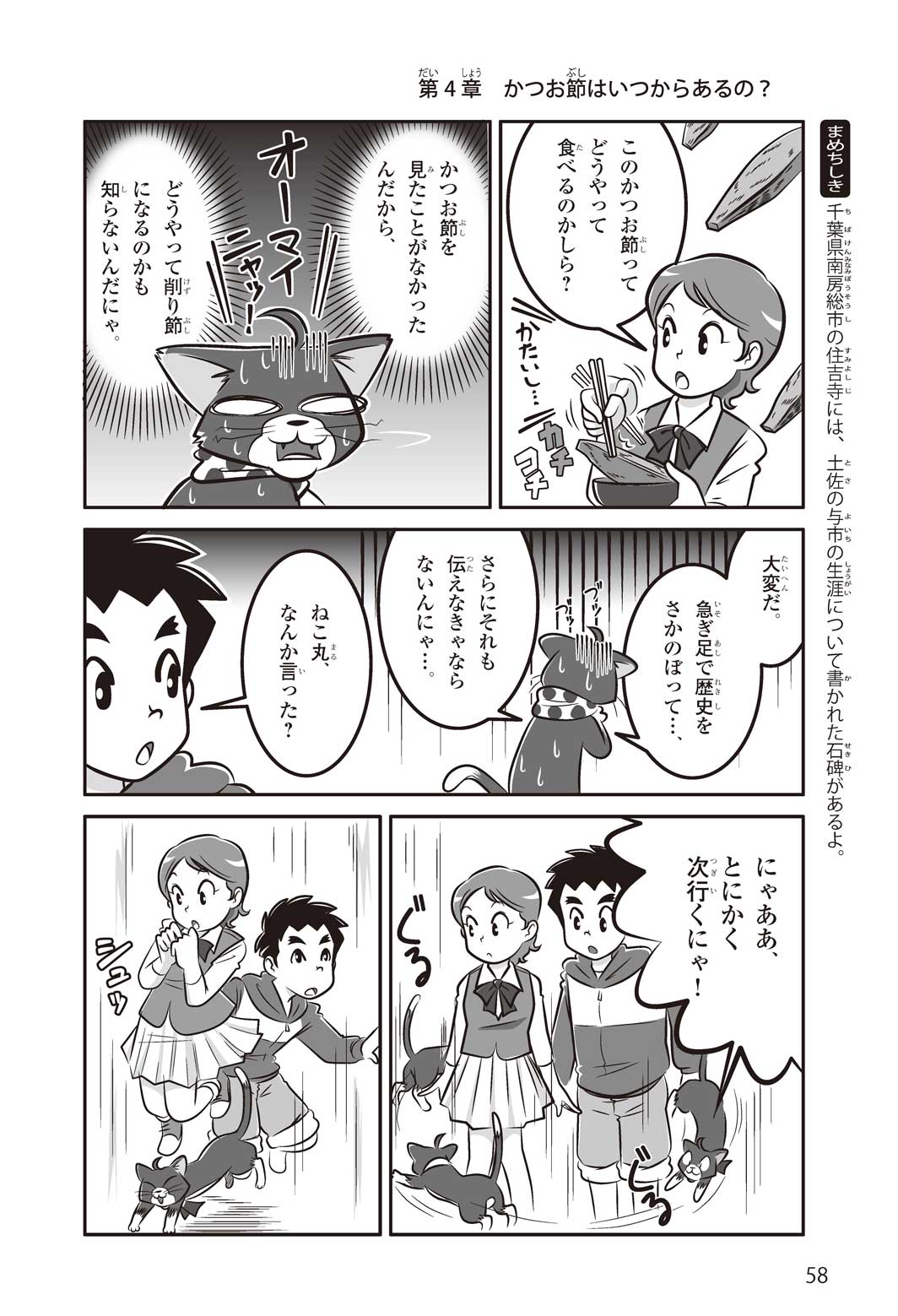 小学5年生の男の子、カイトは、野菜が苦手(にがて)で、家でも学校でも、野菜がメインの料理は残してしまいがち……。それに比べて好物(こうぶつ)は、ハンバーグにカレーライス、ラーメン、焼肉と、野菜の少ない外国の料理ばかり! でも、ある日の夕食で、空腹(くうふく)といい香りにつられてなにげなく食べた野菜のお味噌汁(みそしる)が、とってもおいしいことに気付いたよ! その夜カイトの前に、不思議(ふしぎ)なねこが出現(しゅつげん)。ねこは、だしのおいしさを子どもたちに伝えるためにやってきた、かつお節(ぶし)の妖精(ようせい)、ねこ丸だった。カイトは、ねこ丸に連れられて、クラスメイトのマキちゃんと一緒に、大昔にタイムスリップしたり、かつお節とだしの研究所へ行ったりと、かつお節やだしの歴史や作られ方などのひみつをたずねていくよ!