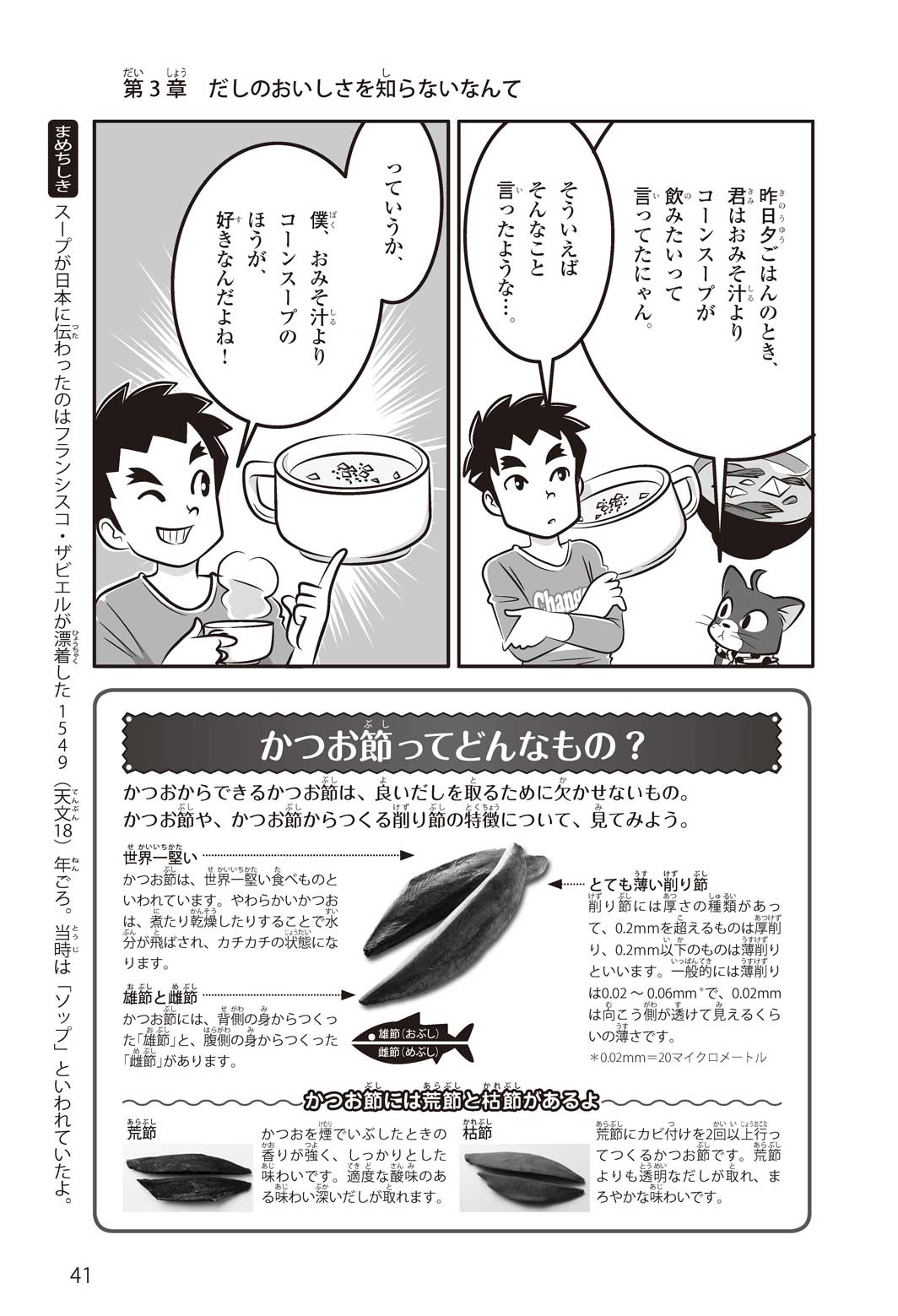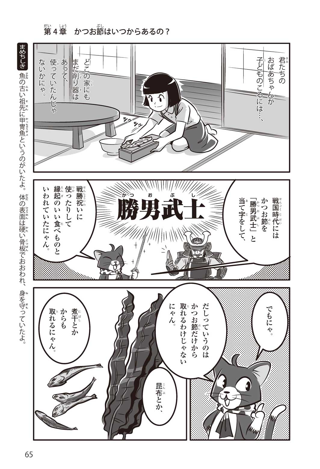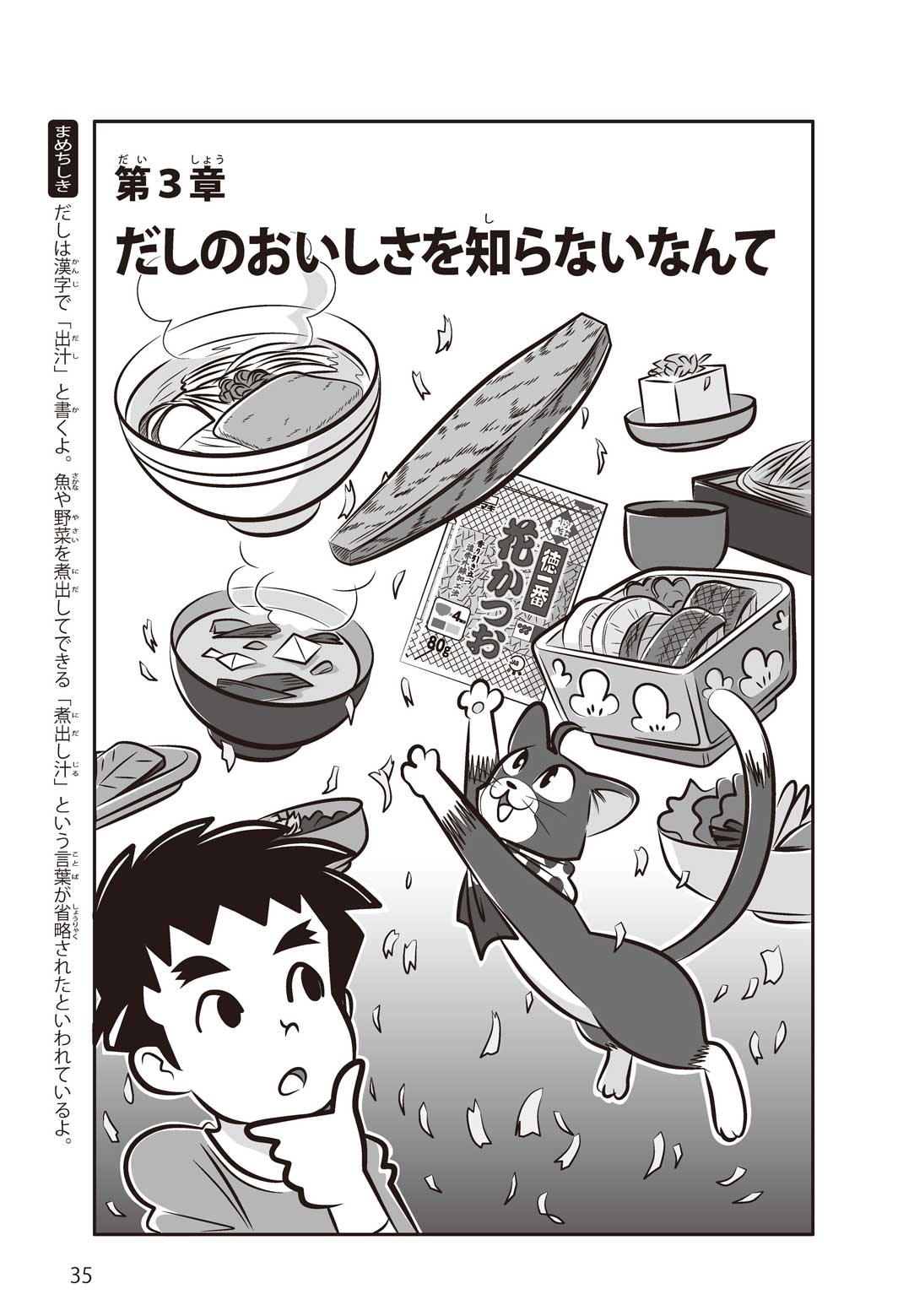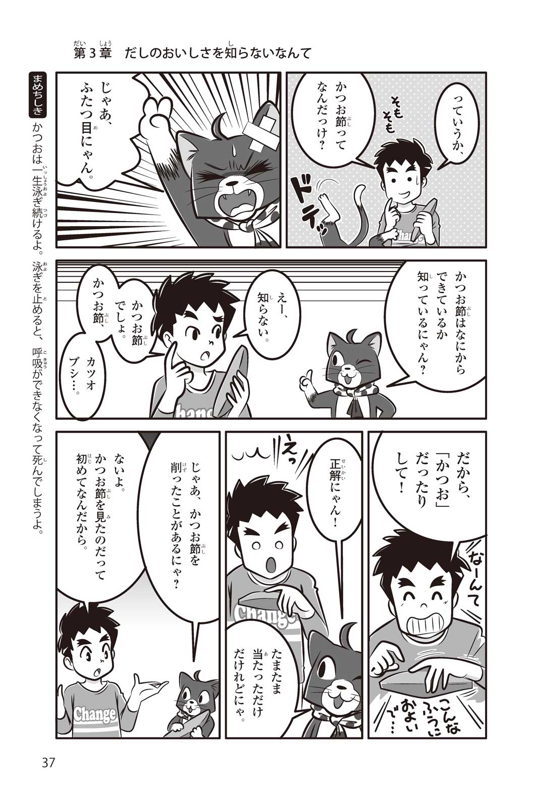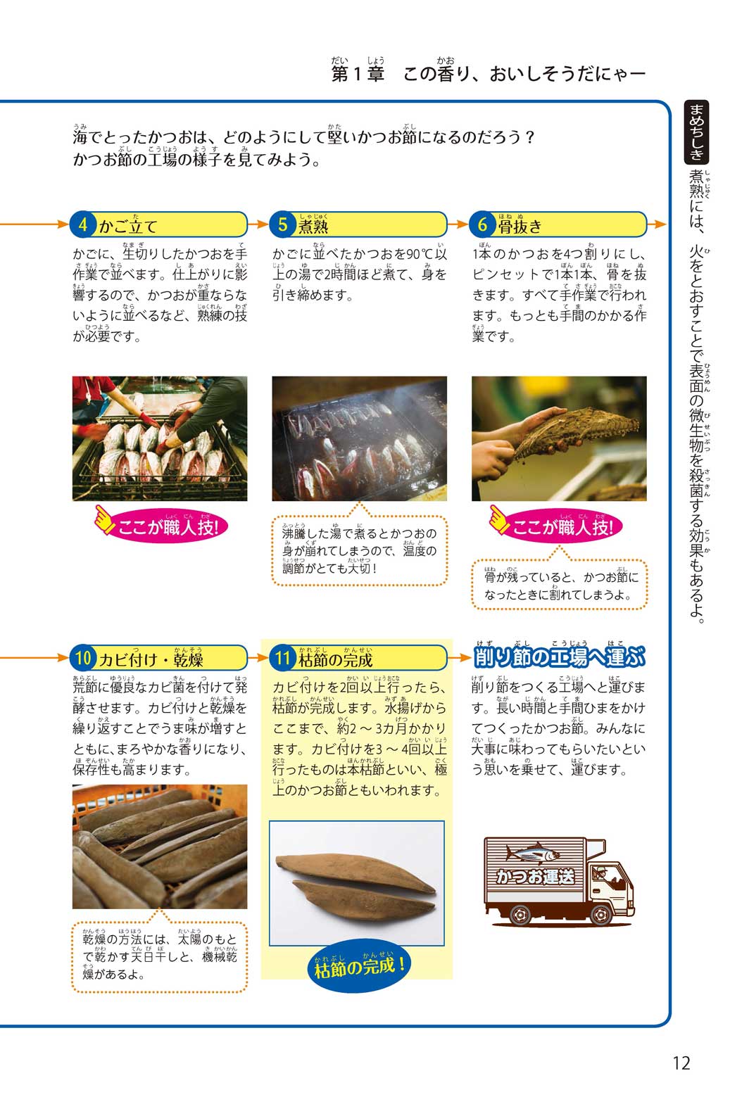 小学5年生の男の子、カイトは、野菜が苦手(にがて)で、家でも学校でも、野菜がメインの料理は残してしまいがち……。それに比べて好物(こうぶつ)は、ハンバーグにカレーライス、ラーメン、焼肉と、野菜の少ない外国の料理ばかり! でも、ある日の夕食で、空腹(くうふく)といい香りにつられてなにげなく食べた野菜のお味噌汁(みそしる)が、とってもおいしいことに気付いたよ! その夜カイトの前に、不思議(ふしぎ)なねこが出現(しゅつげん)。ねこは、だしのおいしさを子どもたちに伝えるためにやってきた、かつお節(ぶし)の妖精(ようせい)、ねこ丸だった。カイトは、ねこ丸に連れられて、クラスメイトのマキちゃんと一緒に、大昔にタイムスリップしたり、かつお節とだしの研究所へ行ったりと、かつお節やだしの歴史や作られ方などのひみつをたずねていくよ!