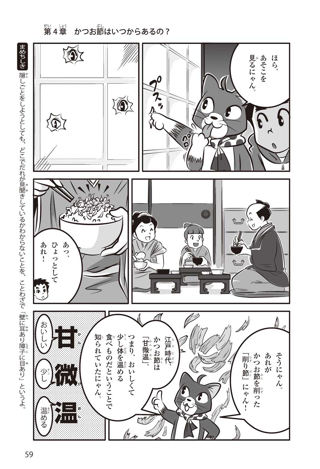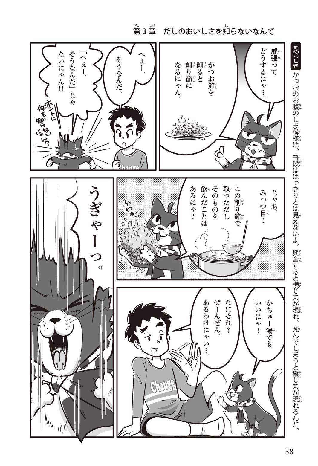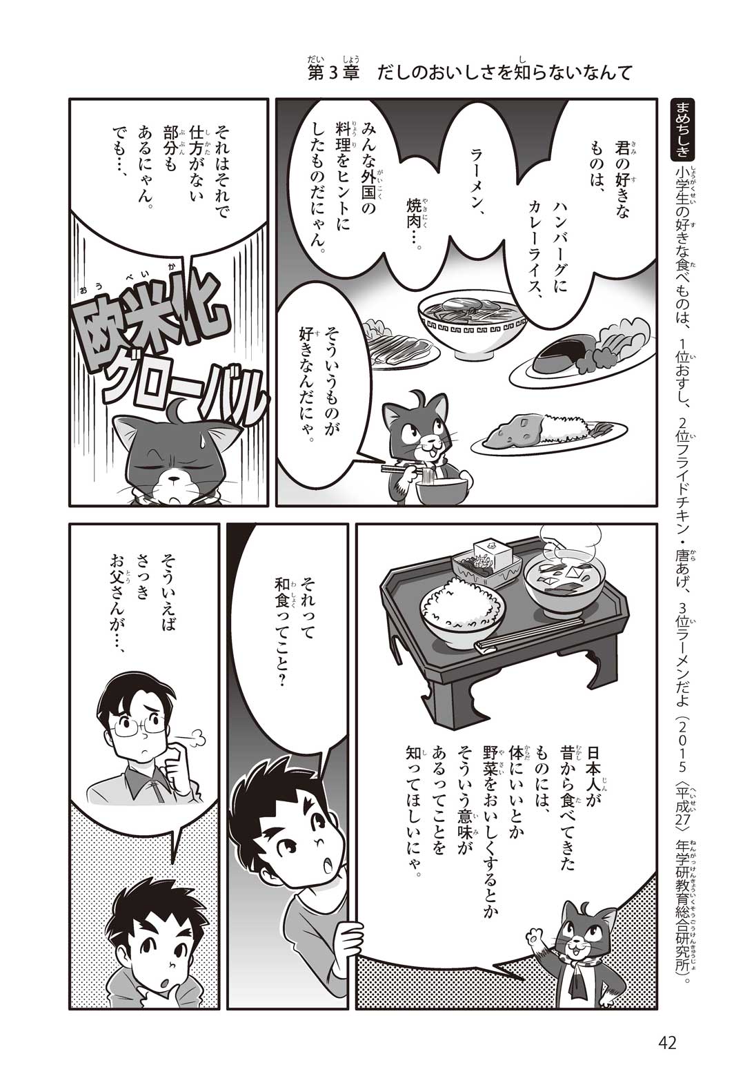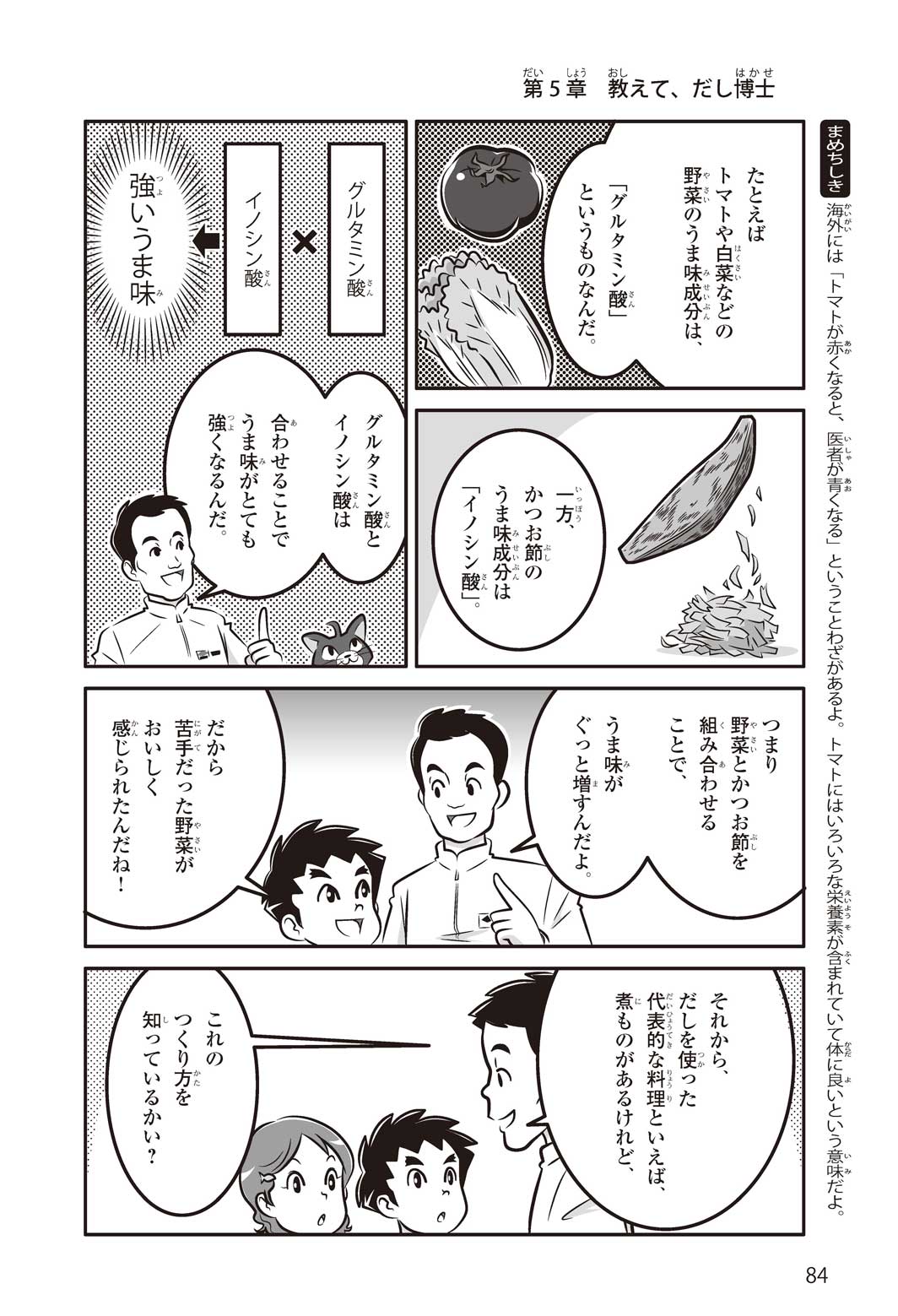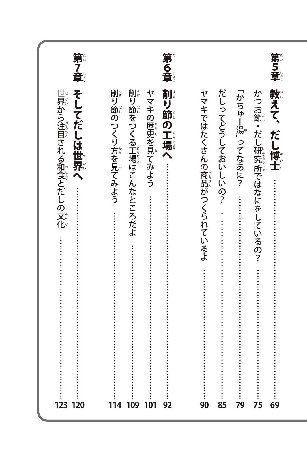 小学5年生の男の子、カイトは、野菜が苦手(にがて)で、家でも学校でも、野菜がメインの料理は残してしまいがち……。それに比べて好物(こうぶつ)は、ハンバーグにカレーライス、ラーメン、焼肉と、野菜の少ない外国の料理ばかり! でも、ある日の夕食で、空腹(くうふく)といい香りにつられてなにげなく食べた野菜のお味噌汁(みそしる)が、とってもおいしいことに気付いたよ! その夜カイトの前に、不思議(ふしぎ)なねこが出現(しゅつげん)。ねこは、だしのおいしさを子どもたちに伝えるためにやってきた、かつお節(ぶし)の妖精(ようせい)、ねこ丸だった。カイトは、ねこ丸に連れられて、クラスメイトのマキちゃんと一緒に、大昔にタイムスリップしたり、かつお節とだしの研究所へ行ったりと、かつお節やだしの歴史や作られ方などのひみつをたずねていくよ!