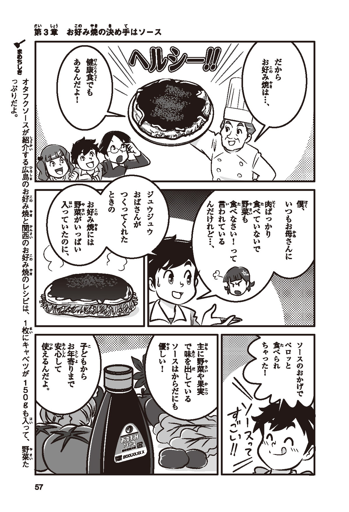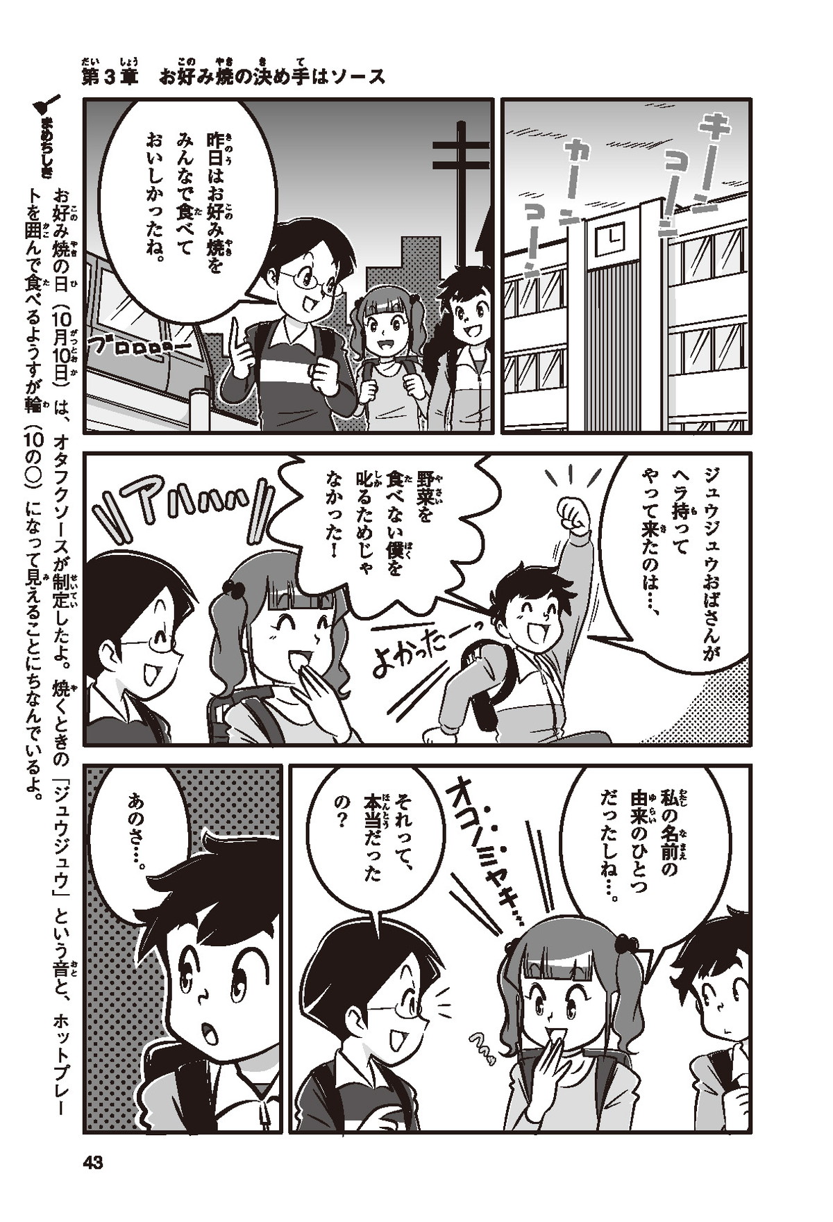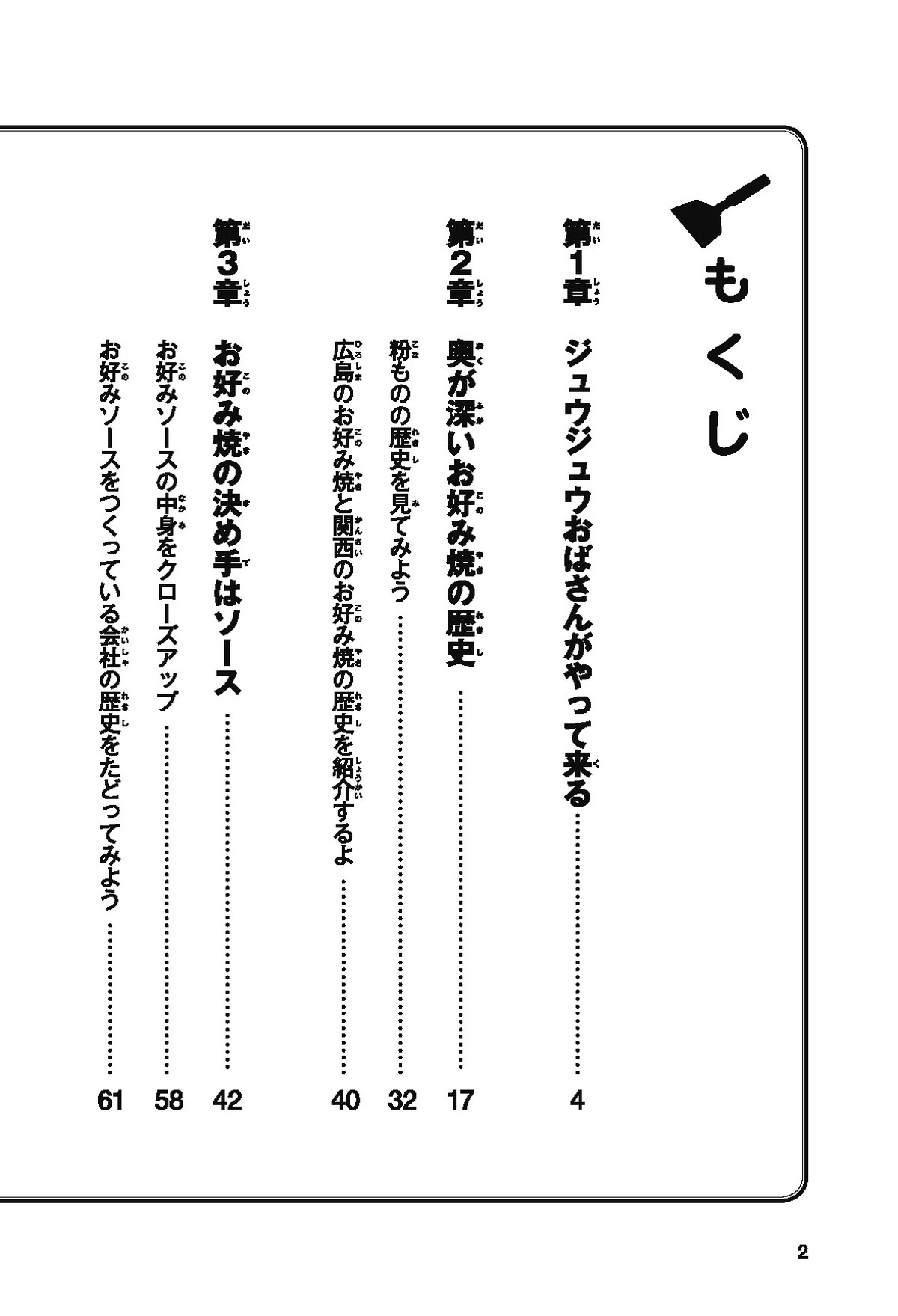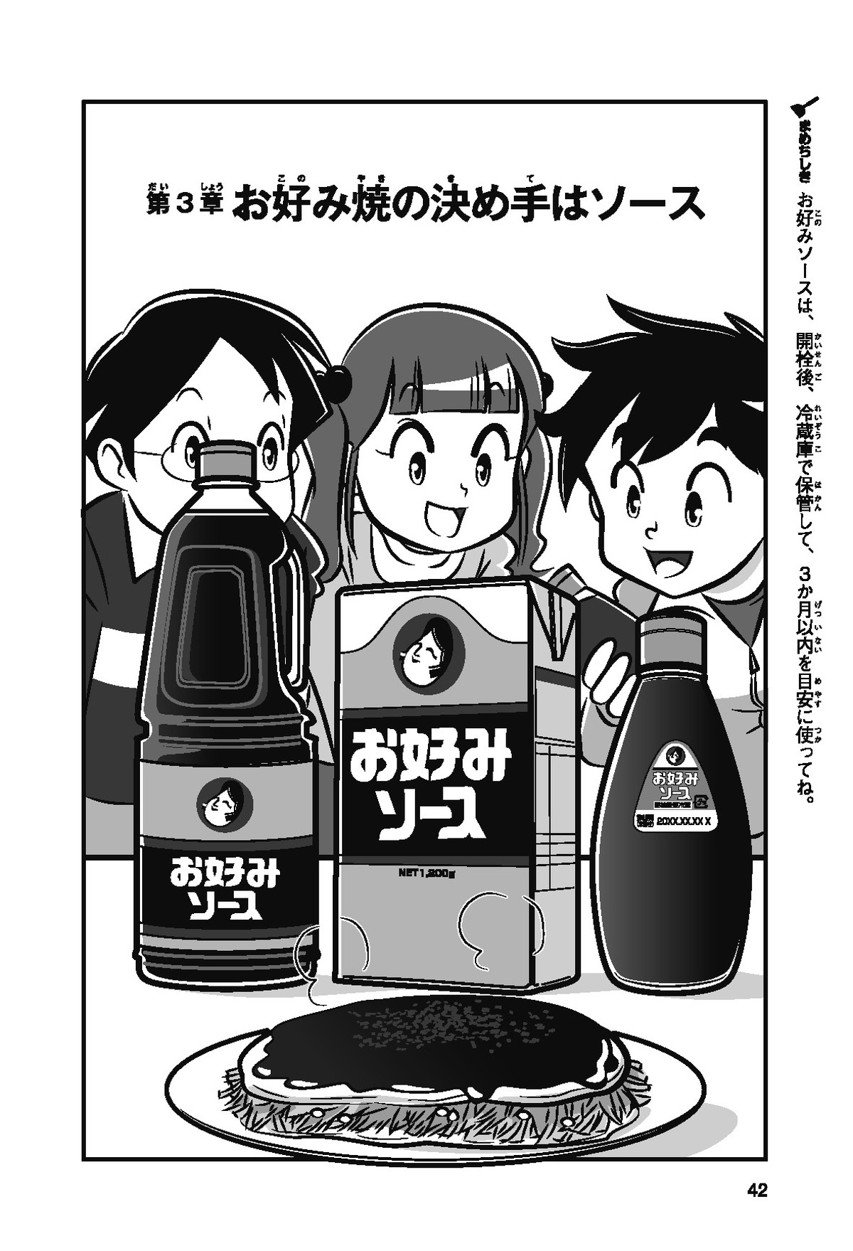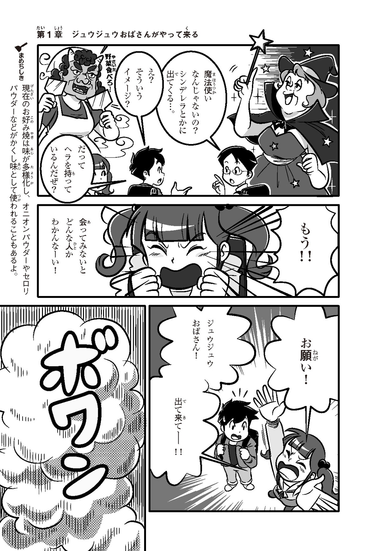 野菜よりも肉が好きなソウスケ。お料理が上手になりたいコノミ。お父さんと夕飯がなかなか一緒に食べられないのが寂しいヒロシの前に、ジュウジュウおばさんが現れる。「お好み焼には「食べることの大事がいっぱい詰まっていて」「お好み焼を食べればたいていのことは解決する」と言うジュウジュウおばさんは、3人を歴史の旅に連れて行く。やがて、お好み焼に興味を持った3人は、お好み焼の決め手がソースだということを知る。ソーズは何でできているのか、どうやってとろみがついているのか、ソースにはひみつがいっぱい。工場や研究所でそのひみつを探っていくよ。ジュウジュウおばさんにお好み焼の作り方を教わった3人は、自分の家に戻って、お好み焼の作り方の歌に合わせて、おいしいお好み焼を作るのだけれど・・・さて、ヒロシはお父さんと夕飯にお好み焼を食べることができたかな。