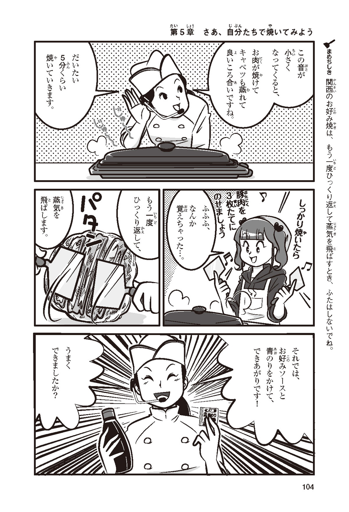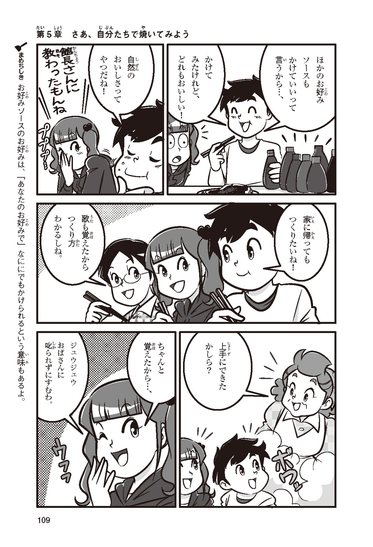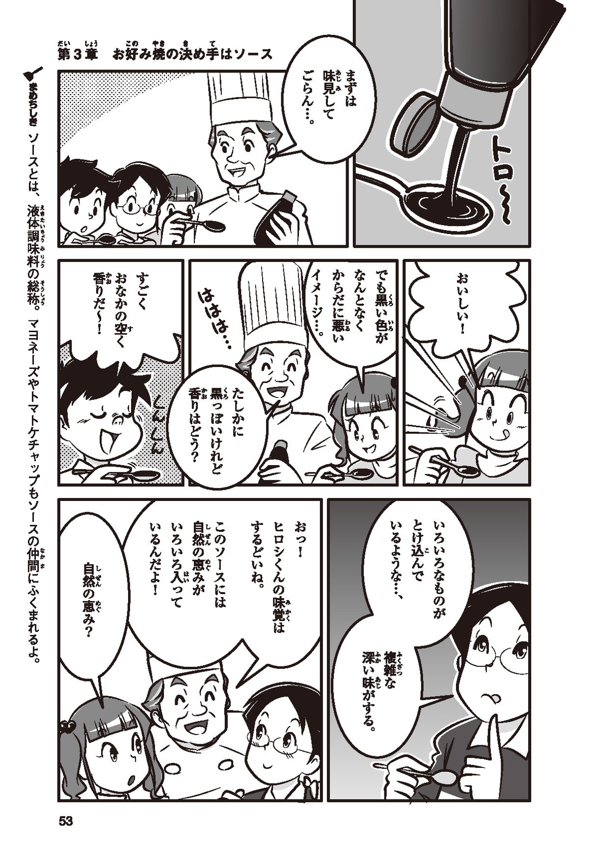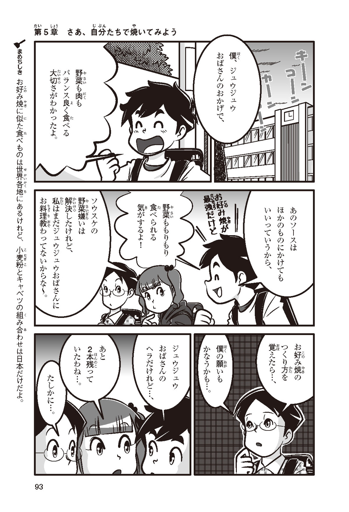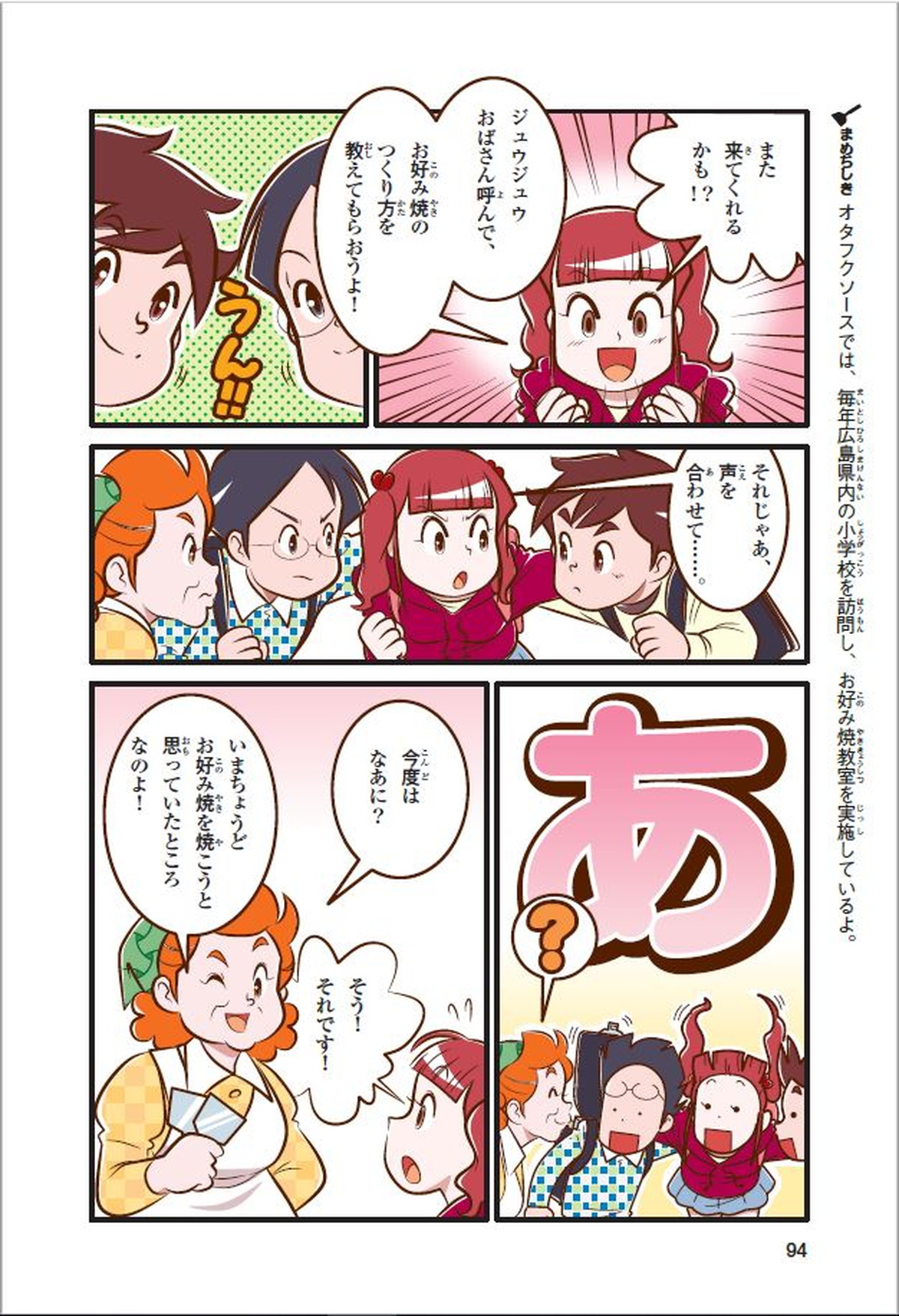 野菜よりも肉が好きなソウスケ。お料理が上手になりたいコノミ。お父さんと夕飯がなかなか一緒に食べられないのが寂しいヒロシの前に、ジュウジュウおばさんが現れる。「お好み焼には「食べることの大事がいっぱい詰まっていて」「お好み焼を食べればたいていのことは解決する」と言うジュウジュウおばさんは、3人を歴史の旅に連れて行く。やがて、お好み焼に興味を持った3人は、お好み焼の決め手がソースだということを知る。ソーズは何でできているのか、どうやってとろみがついているのか、ソースにはひみつがいっぱい。工場や研究所でそのひみつを探っていくよ。ジュウジュウおばさんにお好み焼の作り方を教わった3人は、自分の家に戻って、お好み焼の作り方の歌に合わせて、おいしいお好み焼を作るのだけれど・・・さて、ヒロシはお父さんと夕飯にお好み焼を食べることができたかな。