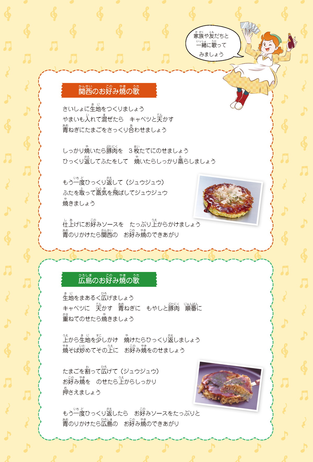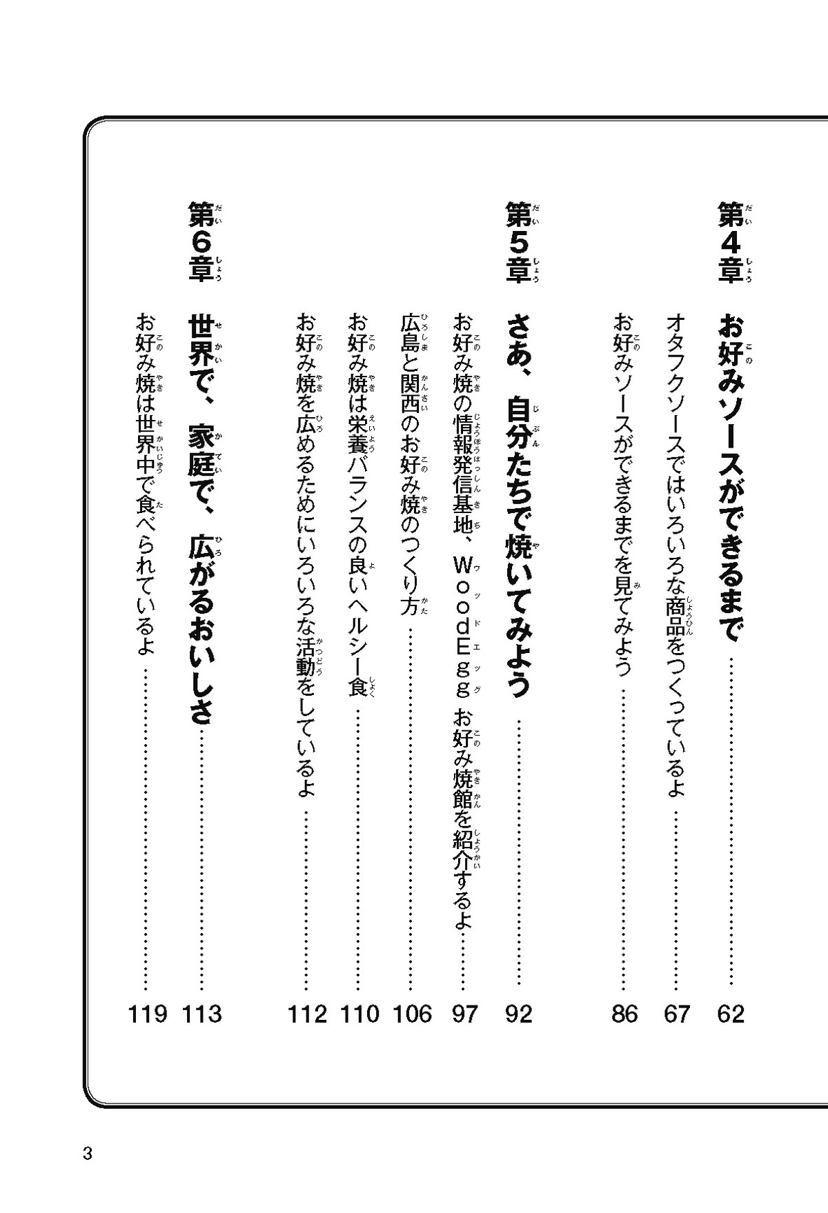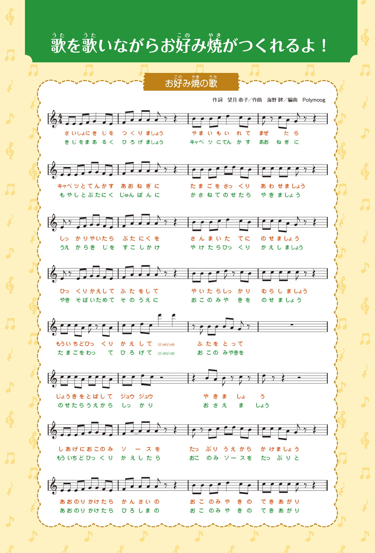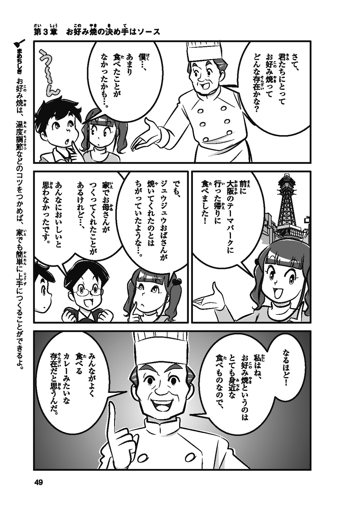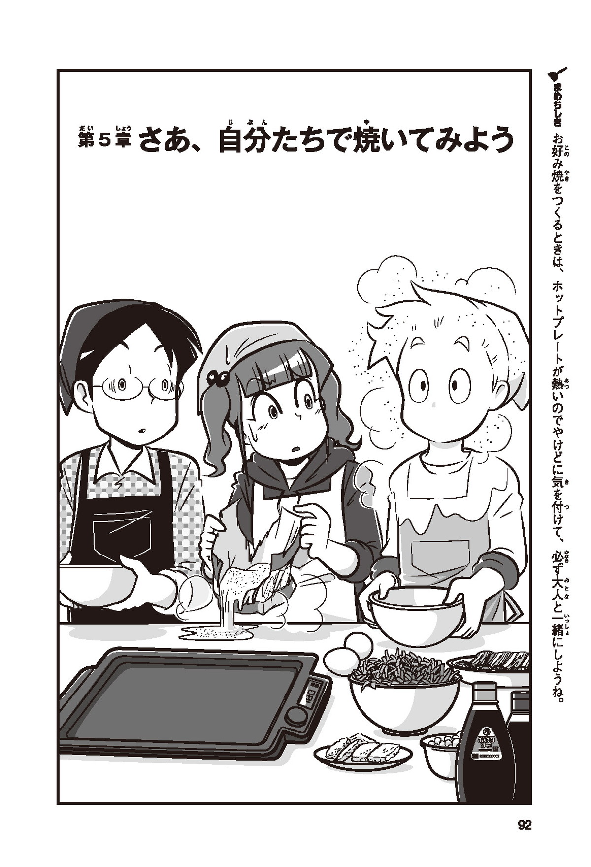 野菜よりも肉が好きなソウスケ。お料理が上手になりたいコノミ。お父さんと夕飯がなかなか一緒に食べられないのが寂しいヒロシの前に、ジュウジュウおばさんが現れる。「お好み焼には「食べることの大事がいっぱい詰まっていて」「お好み焼を食べればたいていのことは解決する」と言うジュウジュウおばさんは、3人を歴史の旅に連れて行く。やがて、お好み焼に興味を持った3人は、お好み焼の決め手がソースだということを知る。ソーズは何でできているのか、どうやってとろみがついているのか、ソースにはひみつがいっぱい。工場や研究所でそのひみつを探っていくよ。ジュウジュウおばさんにお好み焼の作り方を教わった3人は、自分の家に戻って、お好み焼の作り方の歌に合わせて、おいしいお好み焼を作るのだけれど・・・さて、ヒロシはお父さんと夕飯にお好み焼を食べることができたかな。