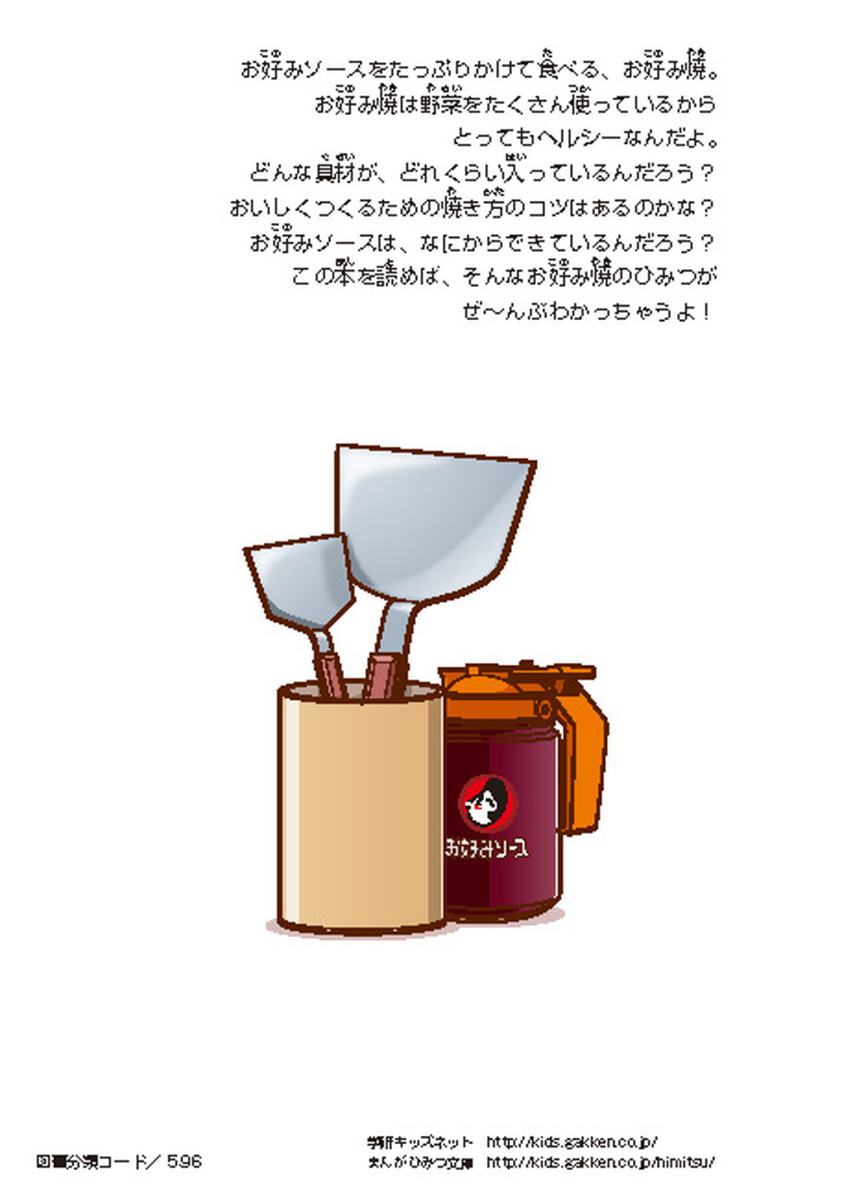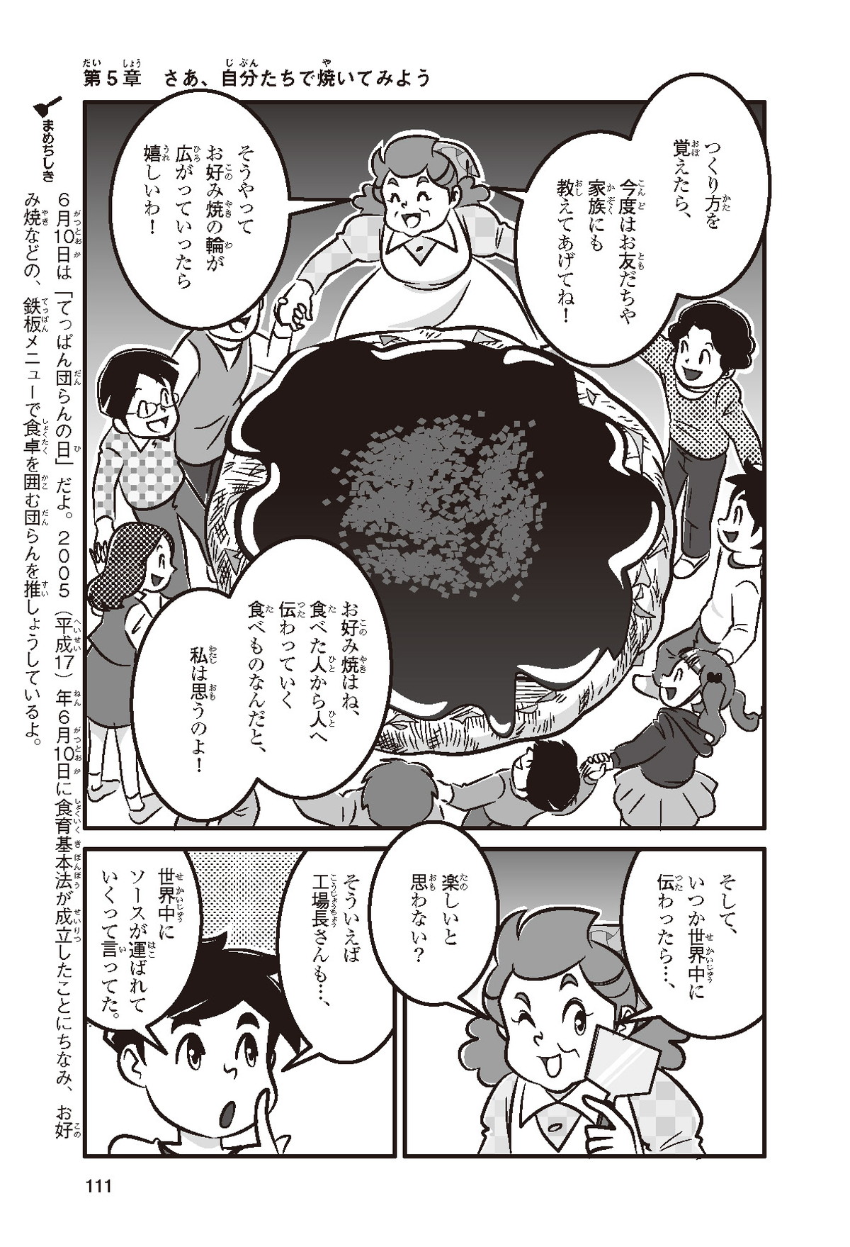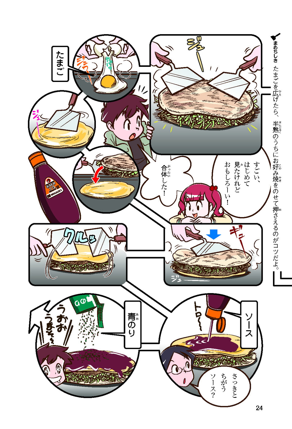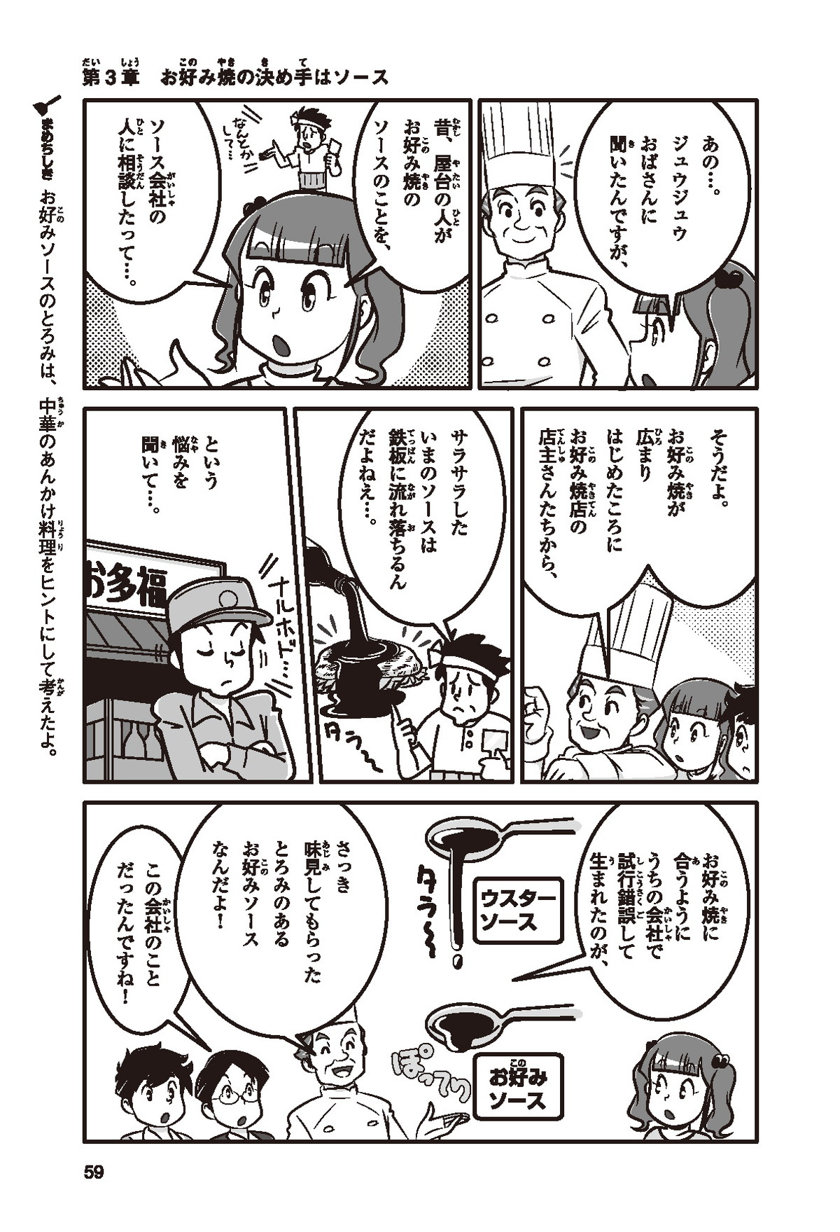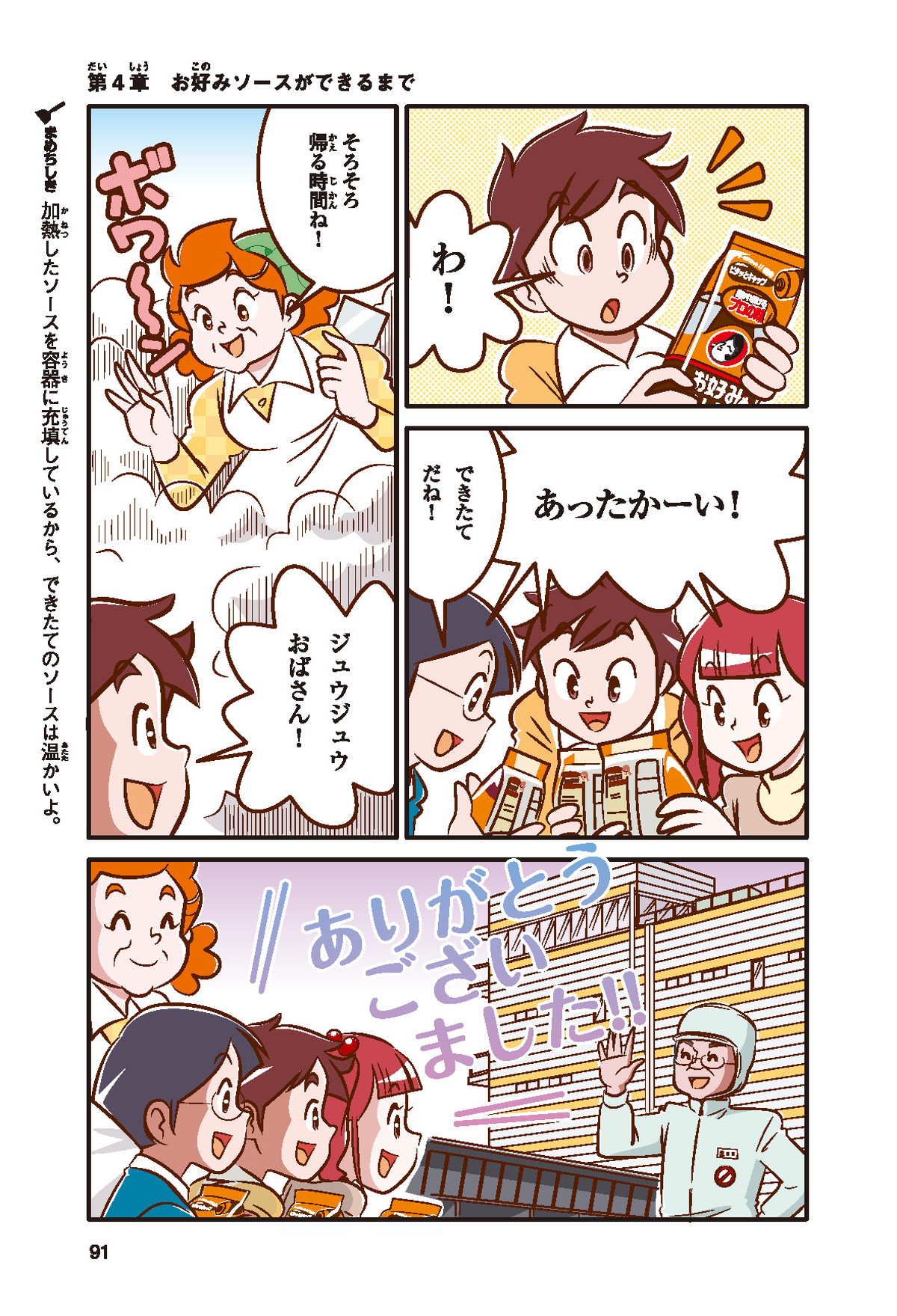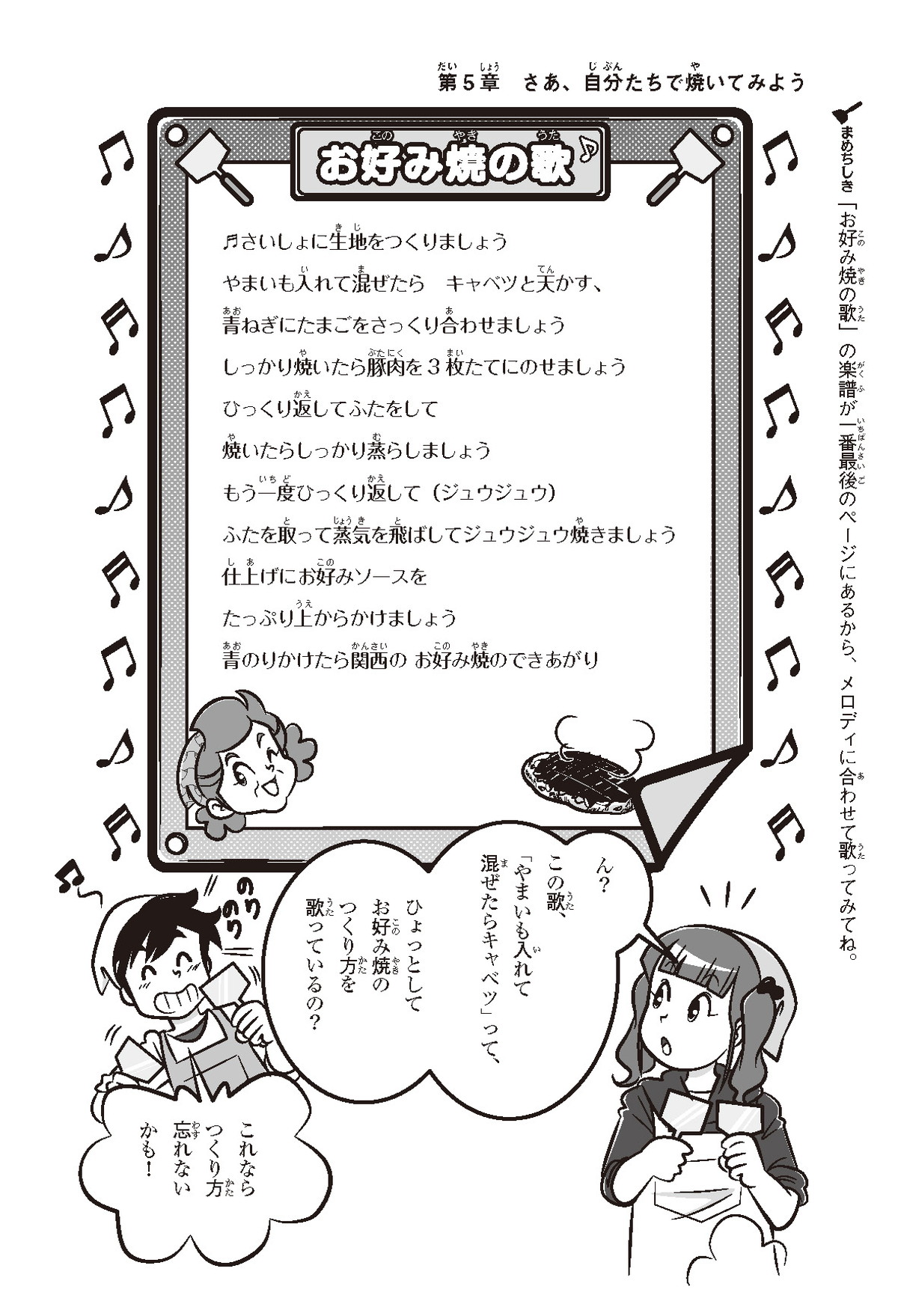 野菜よりも肉が好きなソウスケ。お料理が上手になりたいコノミ。お父さんと夕飯がなかなか一緒に食べられないのが寂しいヒロシの前に、ジュウジュウおばさんが現れる。「お好み焼には「食べることの大事がいっぱい詰まっていて」「お好み焼を食べればたいていのことは解決する」と言うジュウジュウおばさんは、3人を歴史の旅に連れて行く。やがて、お好み焼に興味を持った3人は、お好み焼の決め手がソースだということを知る。ソーズは何でできているのか、どうやってとろみがついているのか、ソースにはひみつがいっぱい。工場や研究所でそのひみつを探っていくよ。ジュウジュウおばさんにお好み焼の作り方を教わった3人は、自分の家に戻って、お好み焼の作り方の歌に合わせて、おいしいお好み焼を作るのだけれど・・・さて、ヒロシはお父さんと夕飯にお好み焼を食べることができたかな。