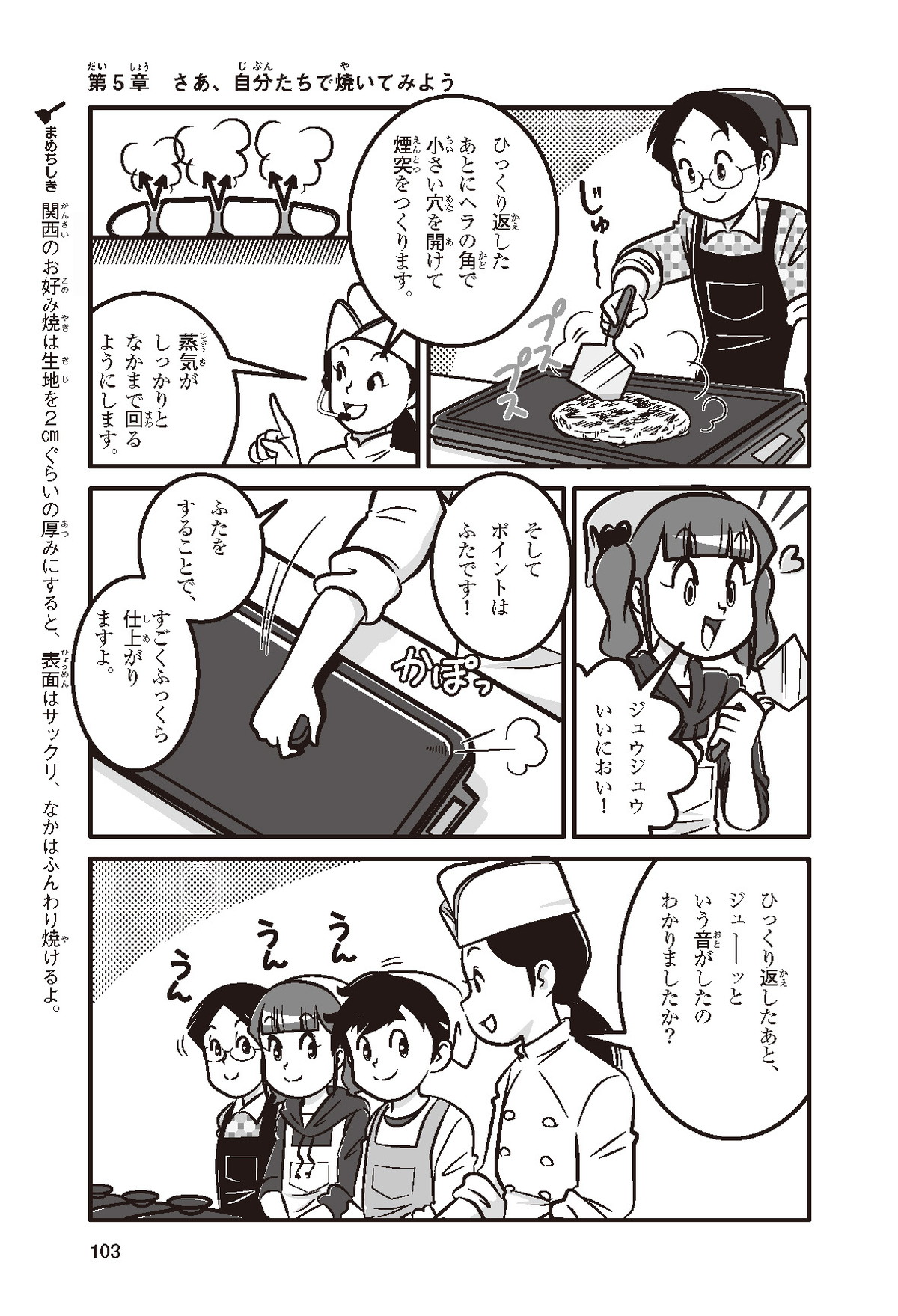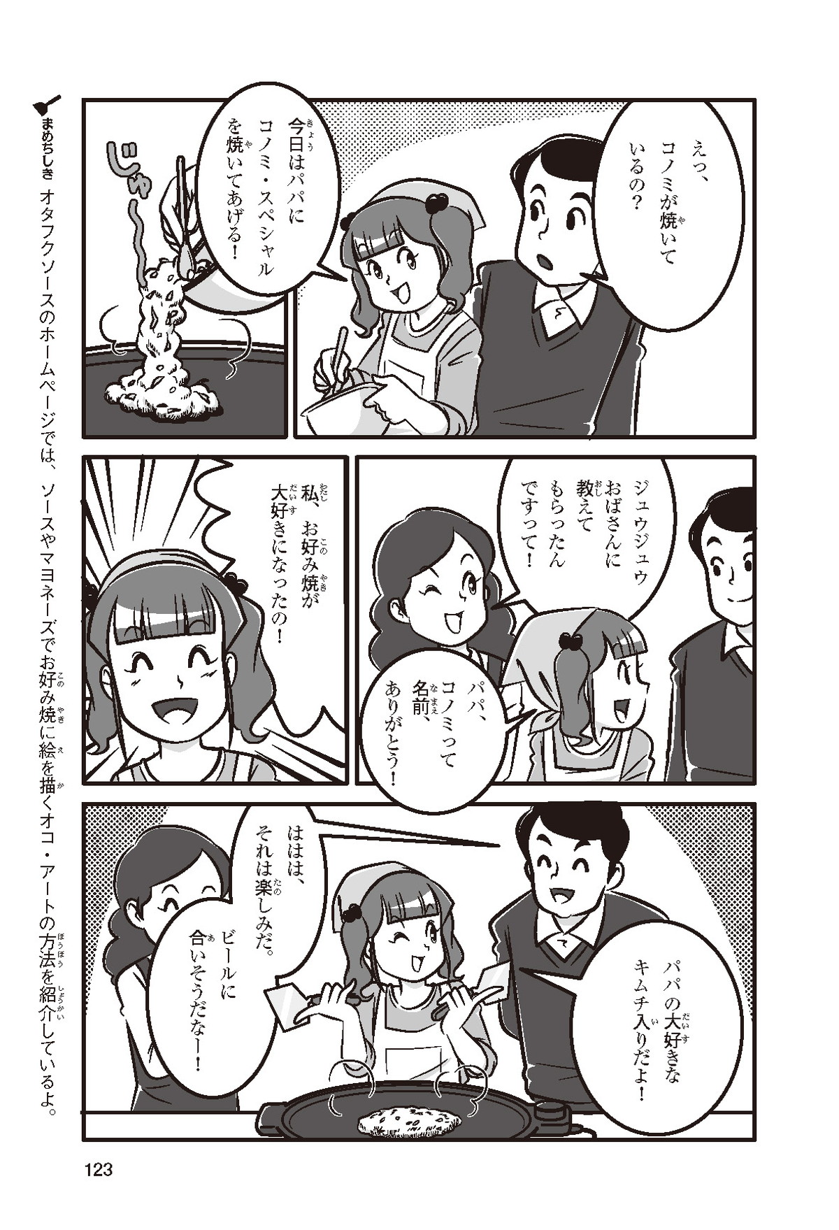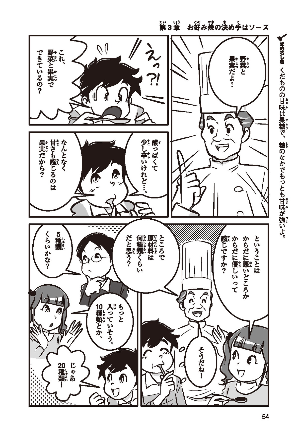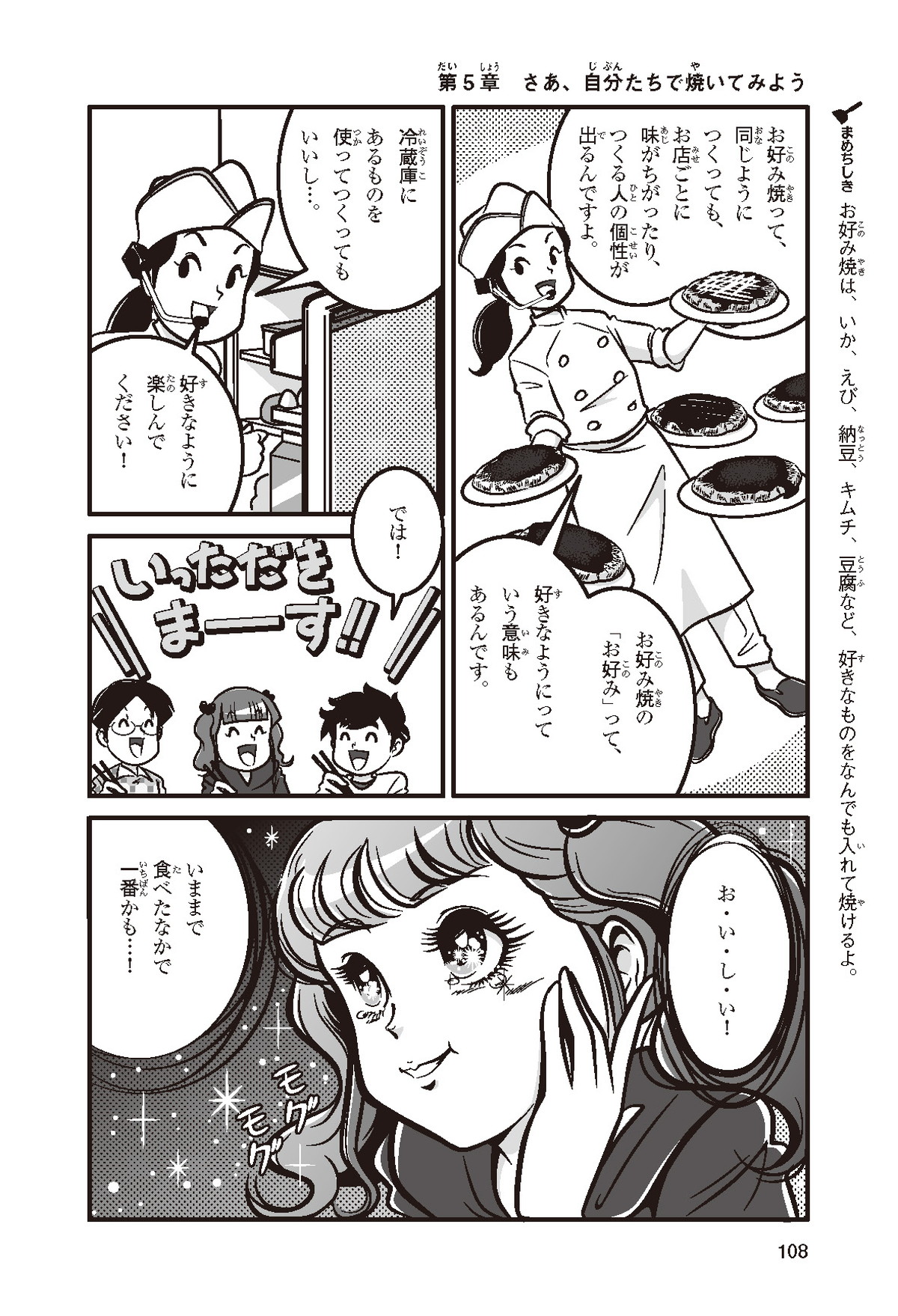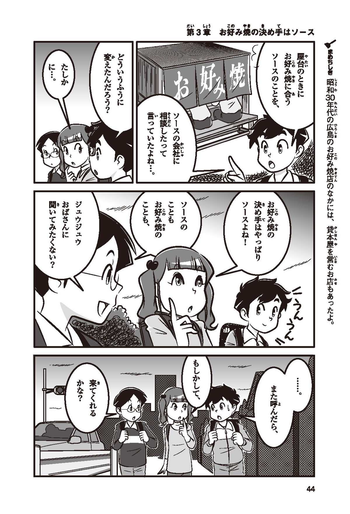 野菜よりも肉が好きなソウスケ。お料理が上手になりたいコノミ。お父さんと夕飯がなかなか一緒に食べられないのが寂しいヒロシの前に、ジュウジュウおばさんが現れる。「お好み焼には「食べることの大事がいっぱい詰まっていて」「お好み焼を食べればたいていのことは解決する」と言うジュウジュウおばさんは、3人を歴史の旅に連れて行く。やがて、お好み焼に興味を持った3人は、お好み焼の決め手がソースだということを知る。ソーズは何でできているのか、どうやってとろみがついているのか、ソースにはひみつがいっぱい。工場や研究所でそのひみつを探っていくよ。ジュウジュウおばさんにお好み焼の作り方を教わった3人は、自分の家に戻って、お好み焼の作り方の歌に合わせて、おいしいお好み焼を作るのだけれど・・・さて、ヒロシはお父さんと夕飯にお好み焼を食べることができたかな。