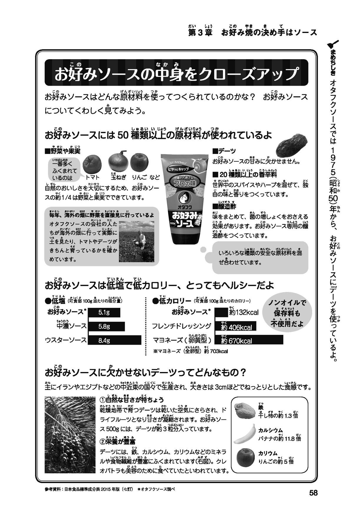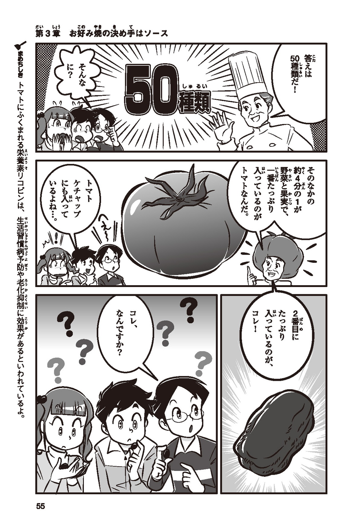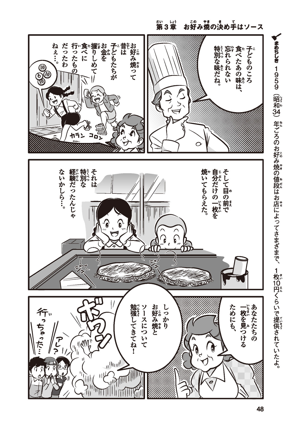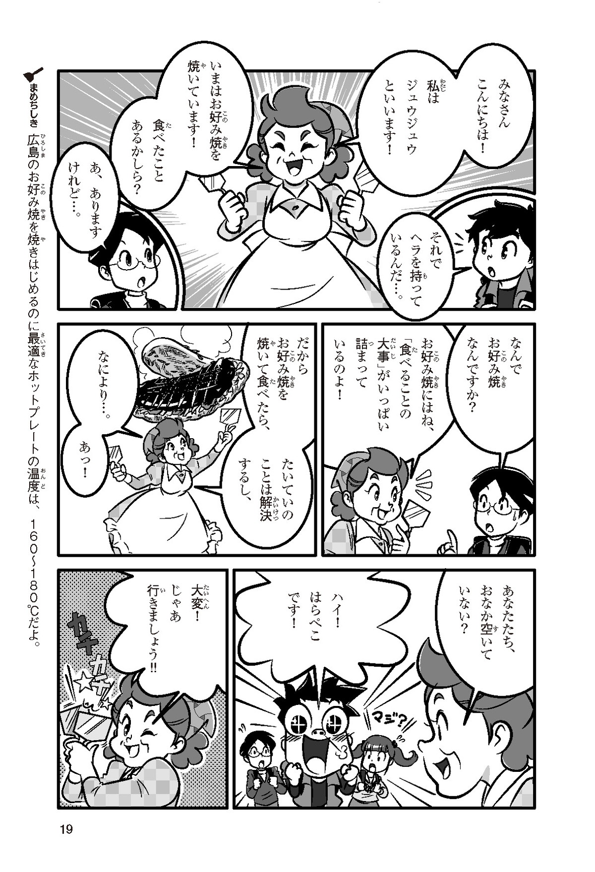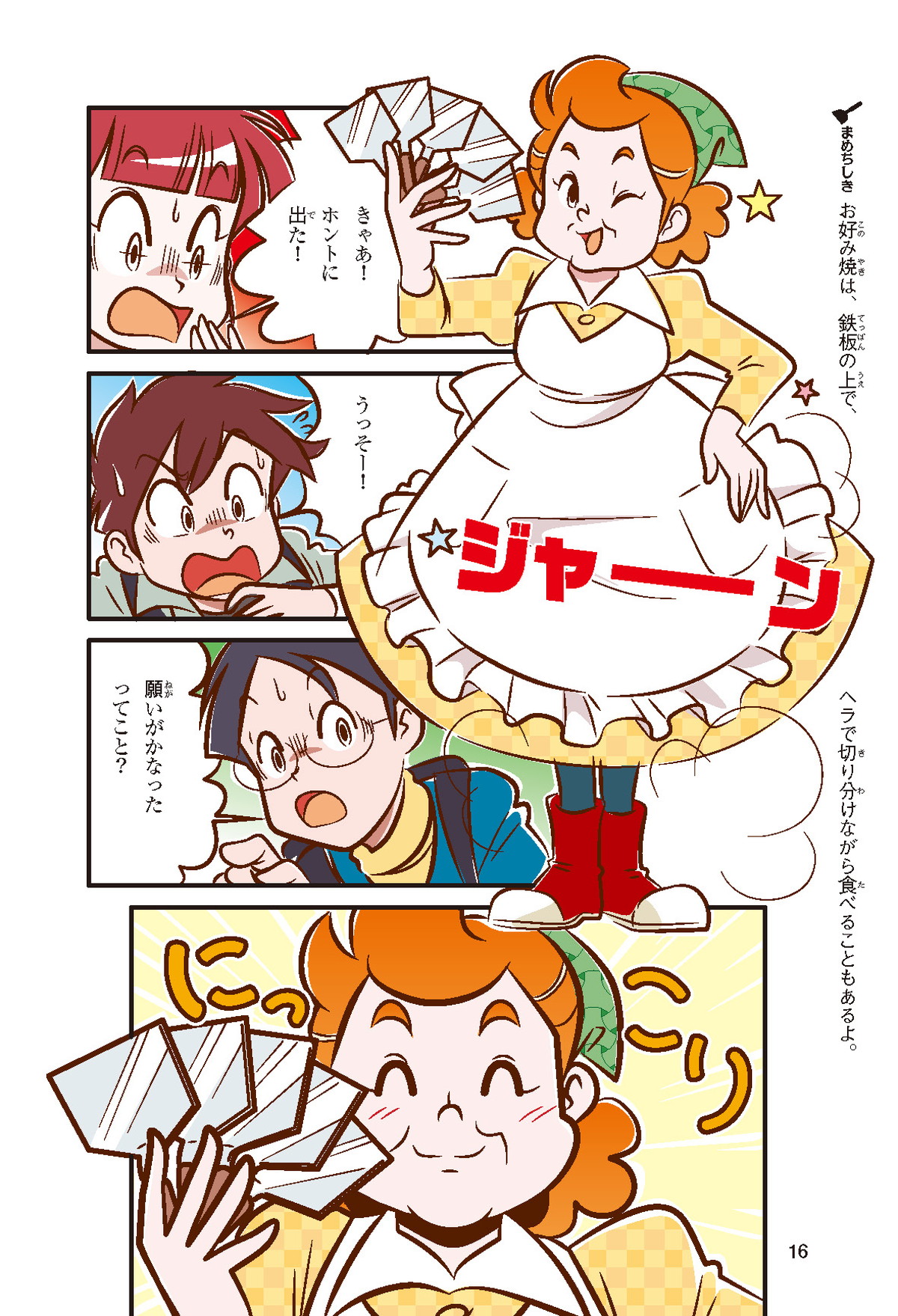 野菜よりも肉が好きなソウスケ。お料理が上手になりたいコノミ。お父さんと夕飯がなかなか一緒に食べられないのが寂しいヒロシの前に、ジュウジュウおばさんが現れる。「お好み焼には「食べることの大事がいっぱい詰まっていて」「お好み焼を食べればたいていのことは解決する」と言うジュウジュウおばさんは、3人を歴史の旅に連れて行く。やがて、お好み焼に興味を持った3人は、お好み焼の決め手がソースだということを知る。ソーズは何でできているのか、どうやってとろみがついているのか、ソースにはひみつがいっぱい。工場や研究所でそのひみつを探っていくよ。ジュウジュウおばさんにお好み焼の作り方を教わった3人は、自分の家に戻って、お好み焼の作り方の歌に合わせて、おいしいお好み焼を作るのだけれど・・・さて、ヒロシはお父さんと夕飯にお好み焼を食べることができたかな。
