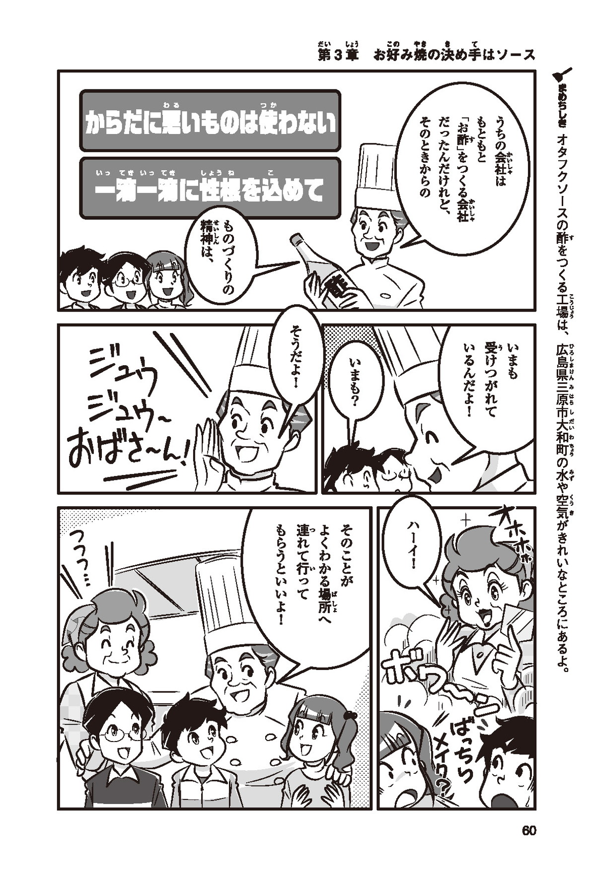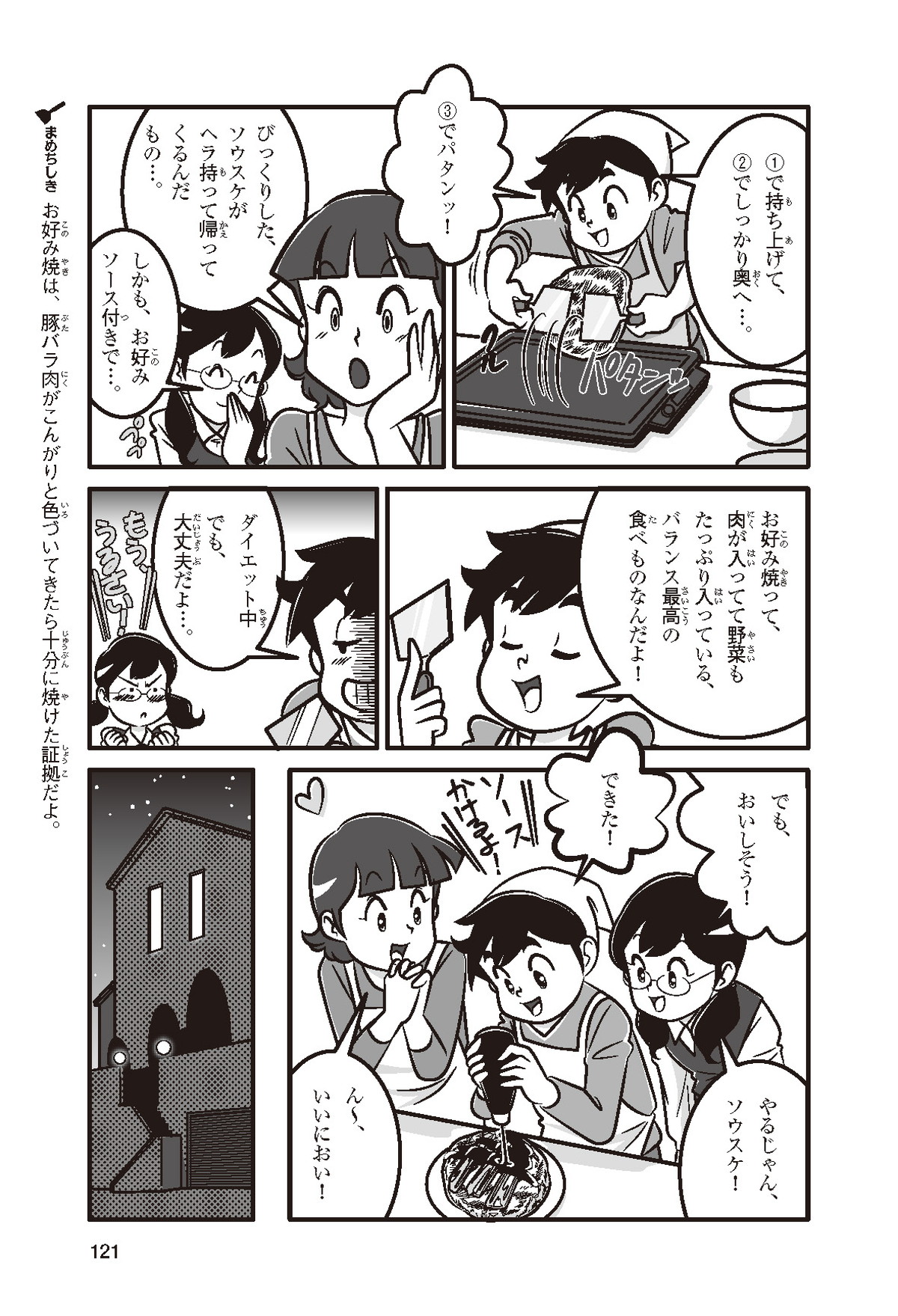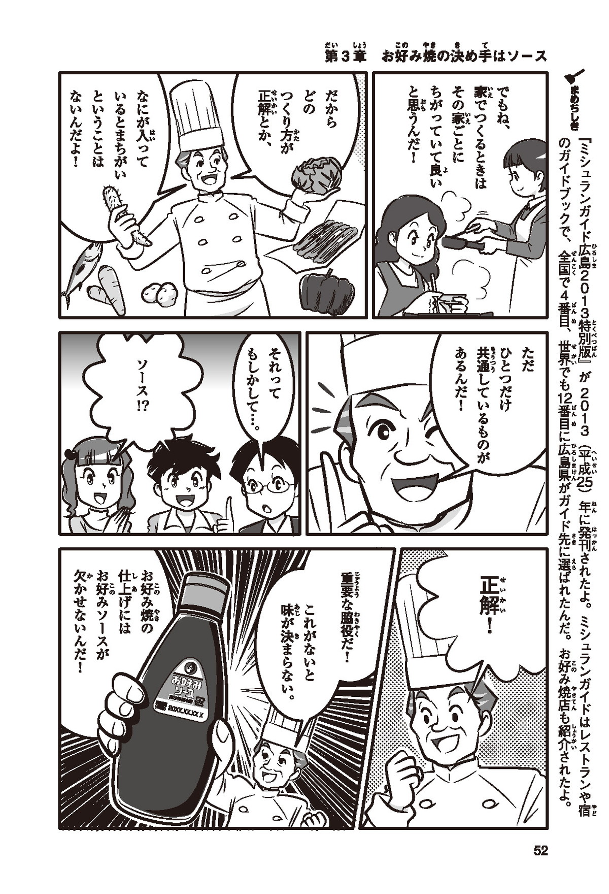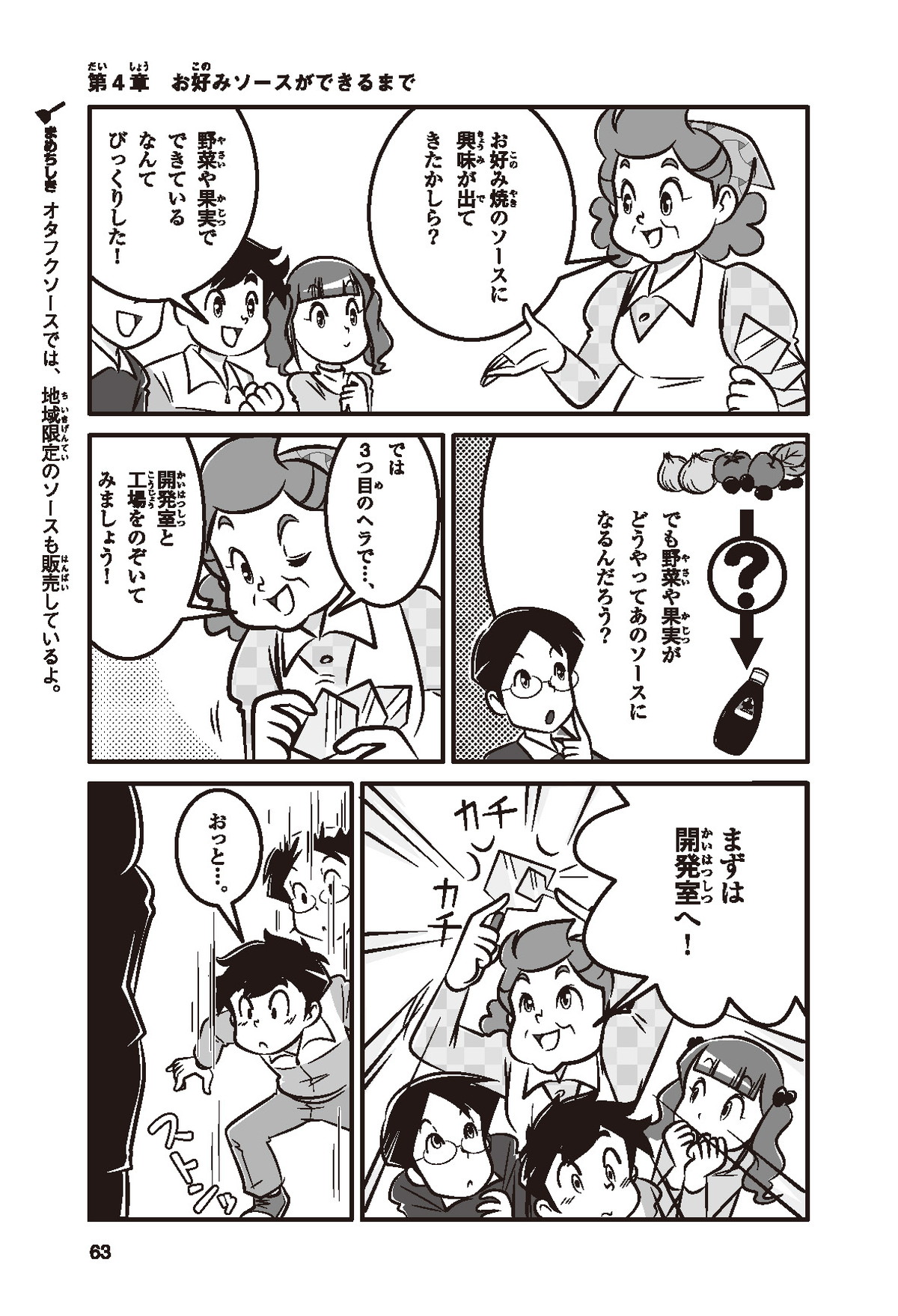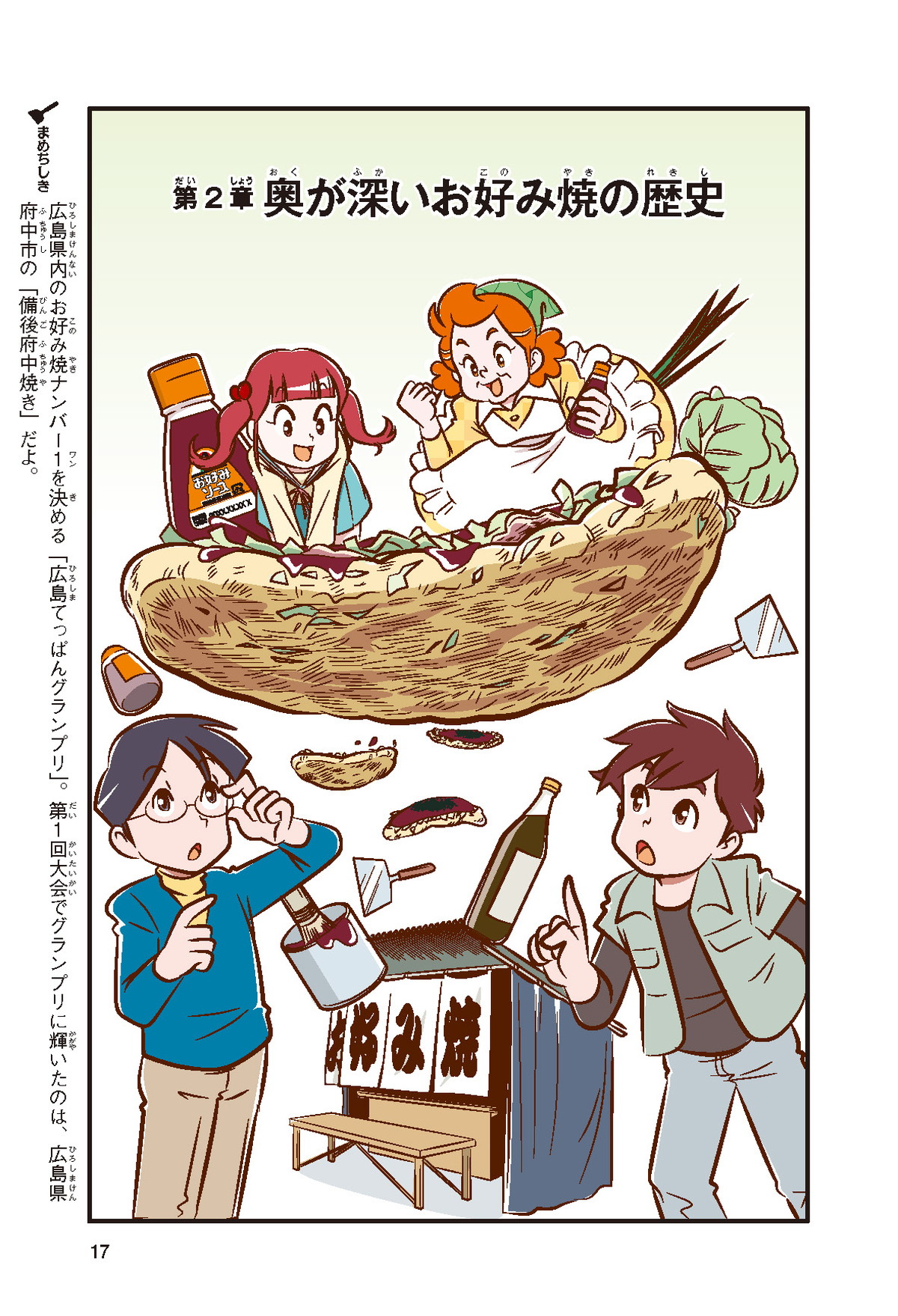 野菜よりも肉が好きなソウスケ。お料理が上手になりたいコノミ。お父さんと夕飯がなかなか一緒に食べられないのが寂しいヒロシの前に、ジュウジュウおばさんが現れる。「お好み焼には「食べることの大事がいっぱい詰まっていて」「お好み焼を食べればたいていのことは解決する」と言うジュウジュウおばさんは、3人を歴史の旅に連れて行く。やがて、お好み焼に興味を持った3人は、お好み焼の決め手がソースだということを知る。ソーズは何でできているのか、どうやってとろみがついているのか、ソースにはひみつがいっぱい。工場や研究所でそのひみつを探っていくよ。ジュウジュウおばさんにお好み焼の作り方を教わった3人は、自分の家に戻って、お好み焼の作り方の歌に合わせて、おいしいお好み焼を作るのだけれど・・・さて、ヒロシはお父さんと夕飯にお好み焼を食べることができたかな。