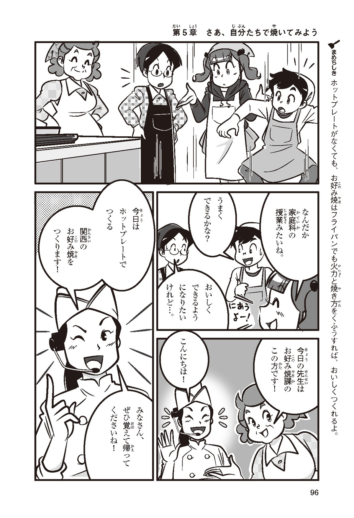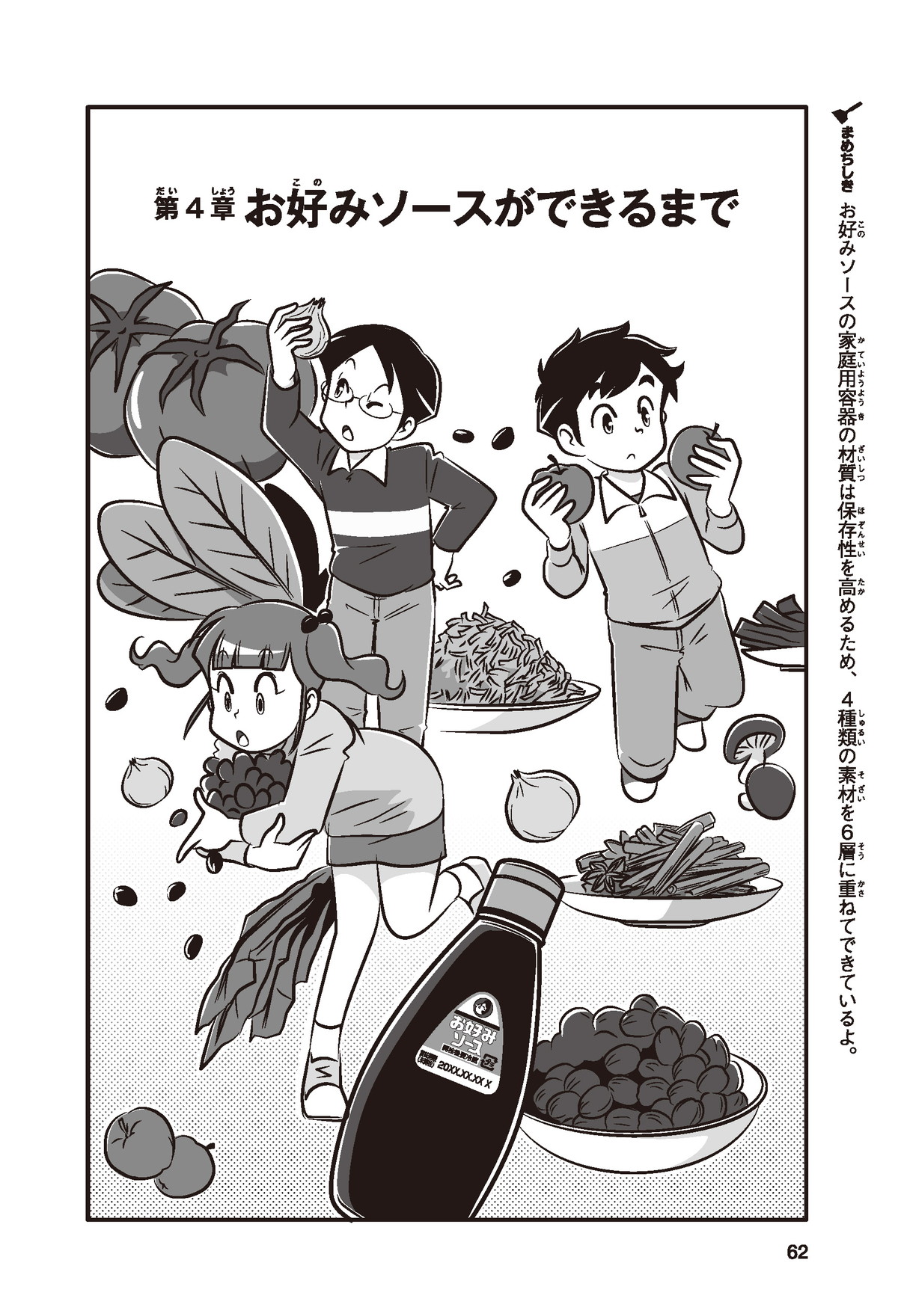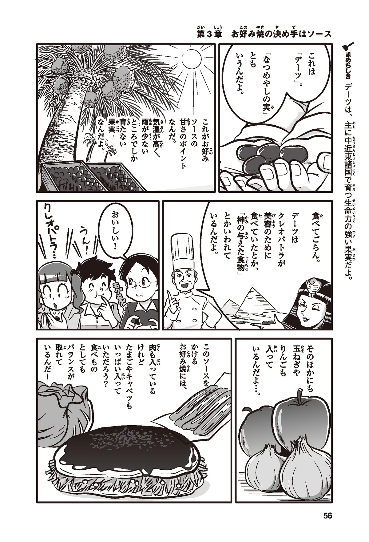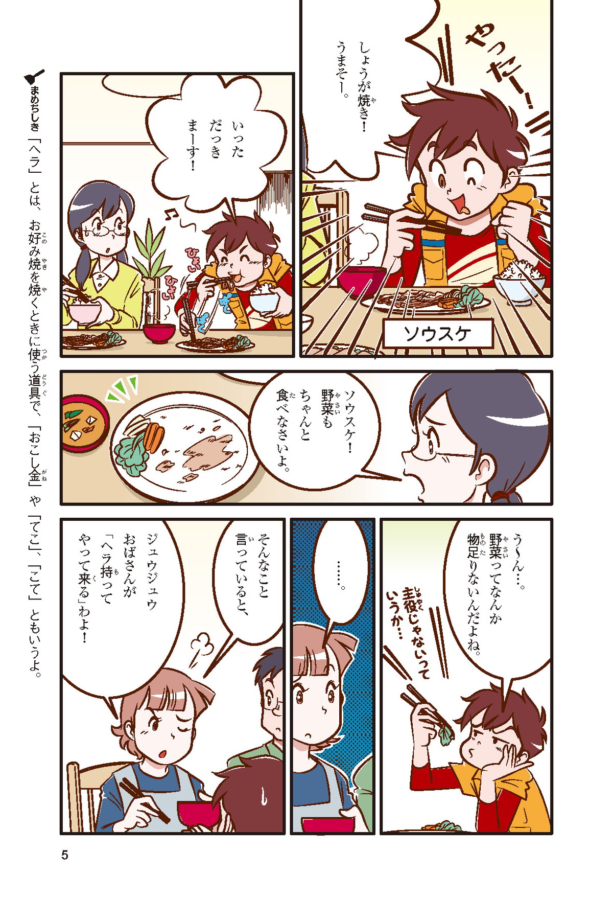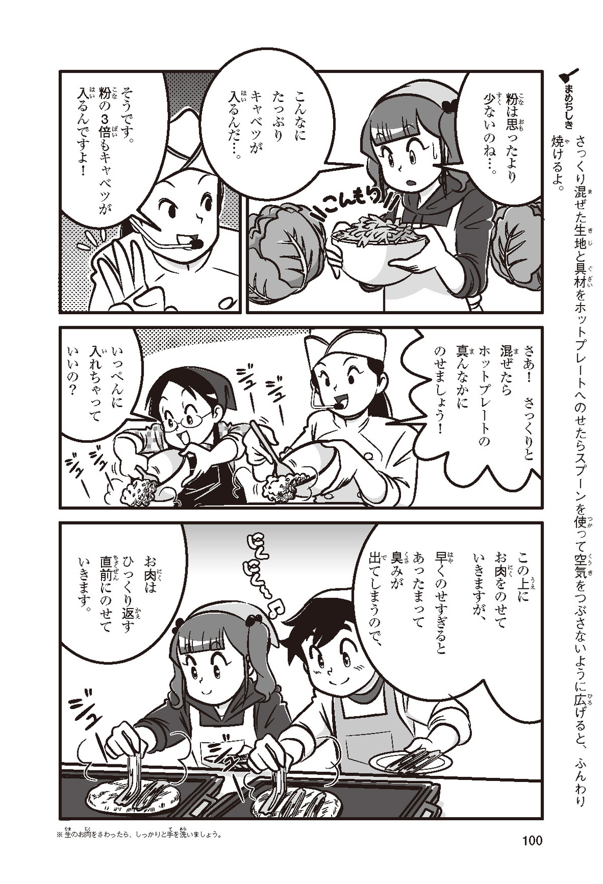 野菜よりも肉が好きなソウスケ。お料理が上手になりたいコノミ。お父さんと夕飯がなかなか一緒に食べられないのが寂しいヒロシの前に、ジュウジュウおばさんが現れる。「お好み焼には「食べることの大事がいっぱい詰まっていて」「お好み焼を食べればたいていのことは解決する」と言うジュウジュウおばさんは、3人を歴史の旅に連れて行く。やがて、お好み焼に興味を持った3人は、お好み焼の決め手がソースだということを知る。ソーズは何でできているのか、どうやってとろみがついているのか、ソースにはひみつがいっぱい。工場や研究所でそのひみつを探っていくよ。ジュウジュウおばさんにお好み焼の作り方を教わった3人は、自分の家に戻って、お好み焼の作り方の歌に合わせて、おいしいお好み焼を作るのだけれど・・・さて、ヒロシはお父さんと夕飯にお好み焼を食べることができたかな。