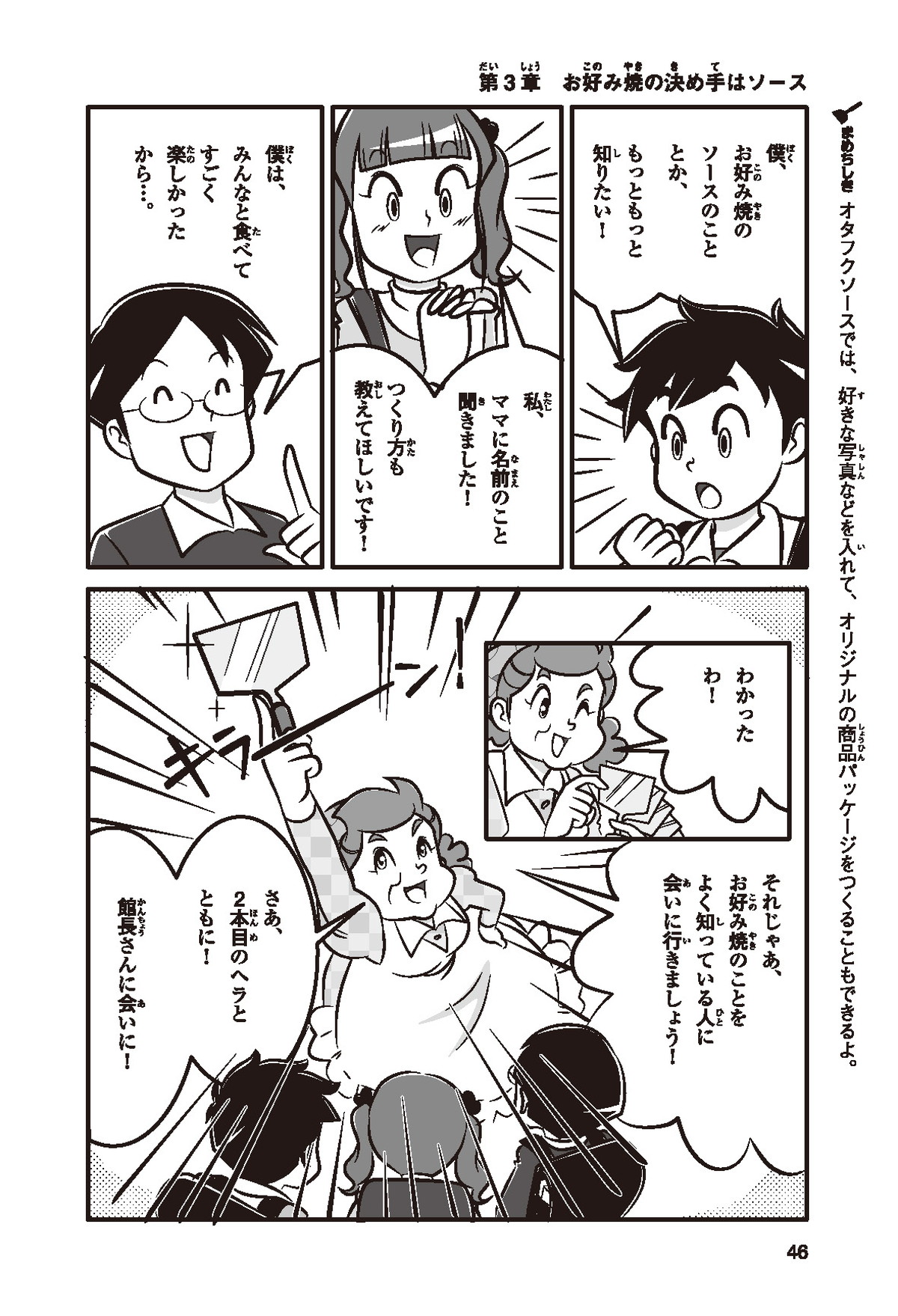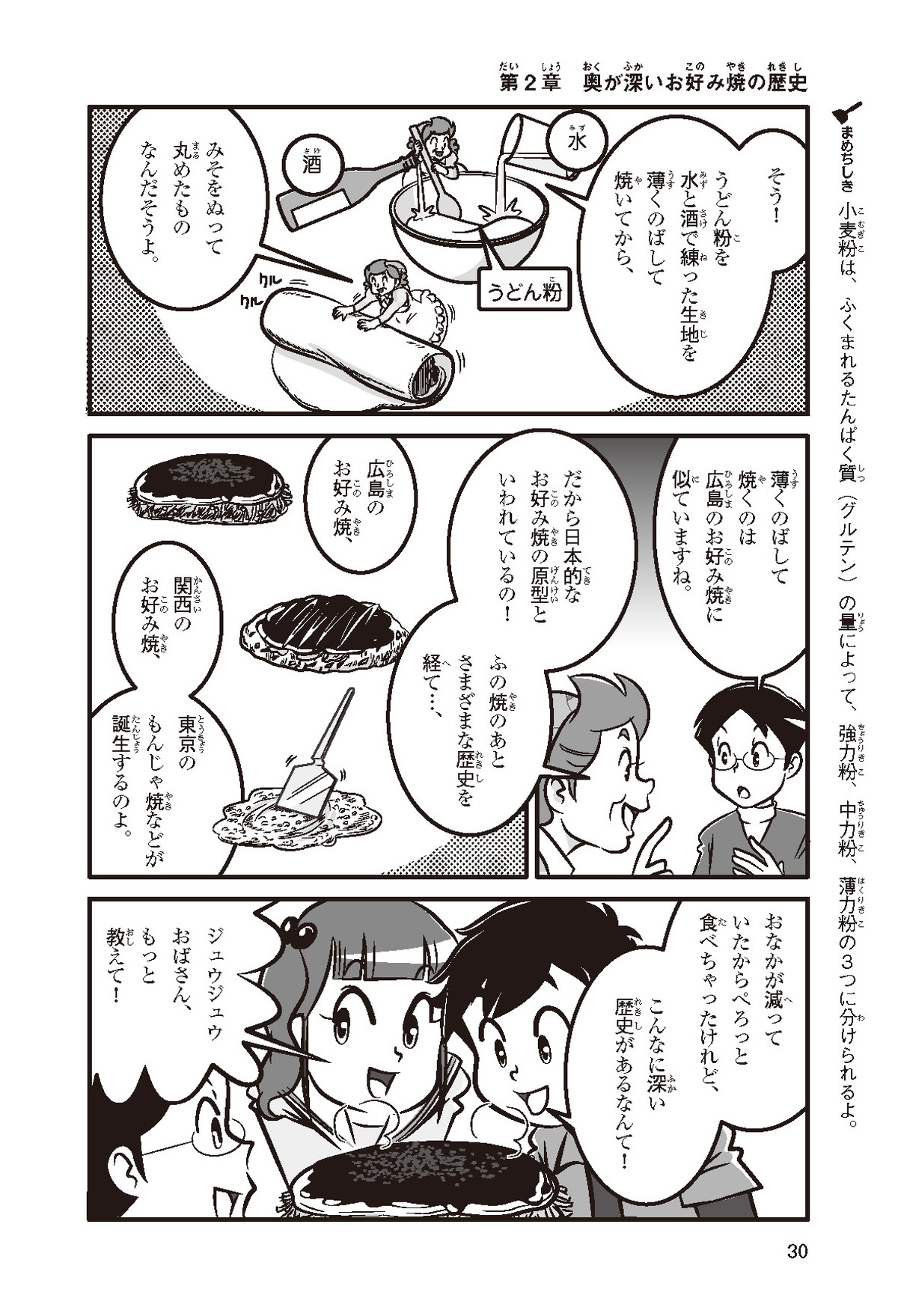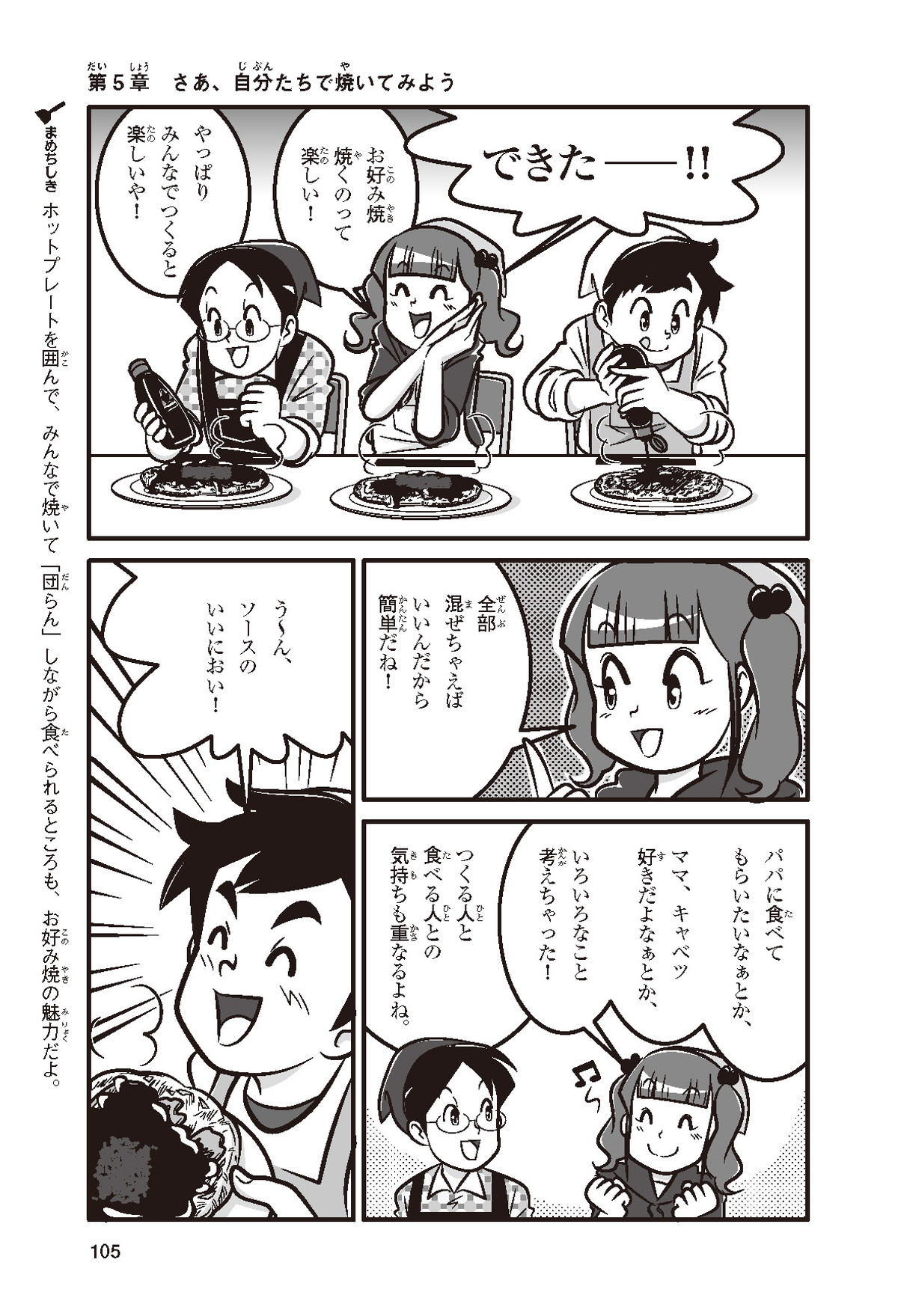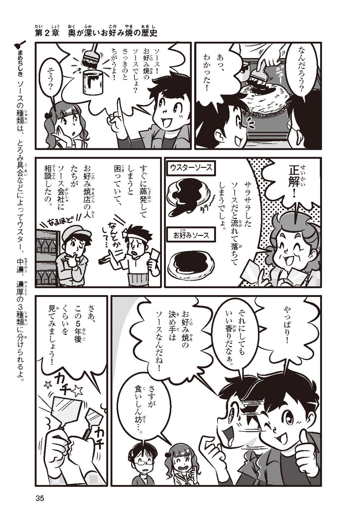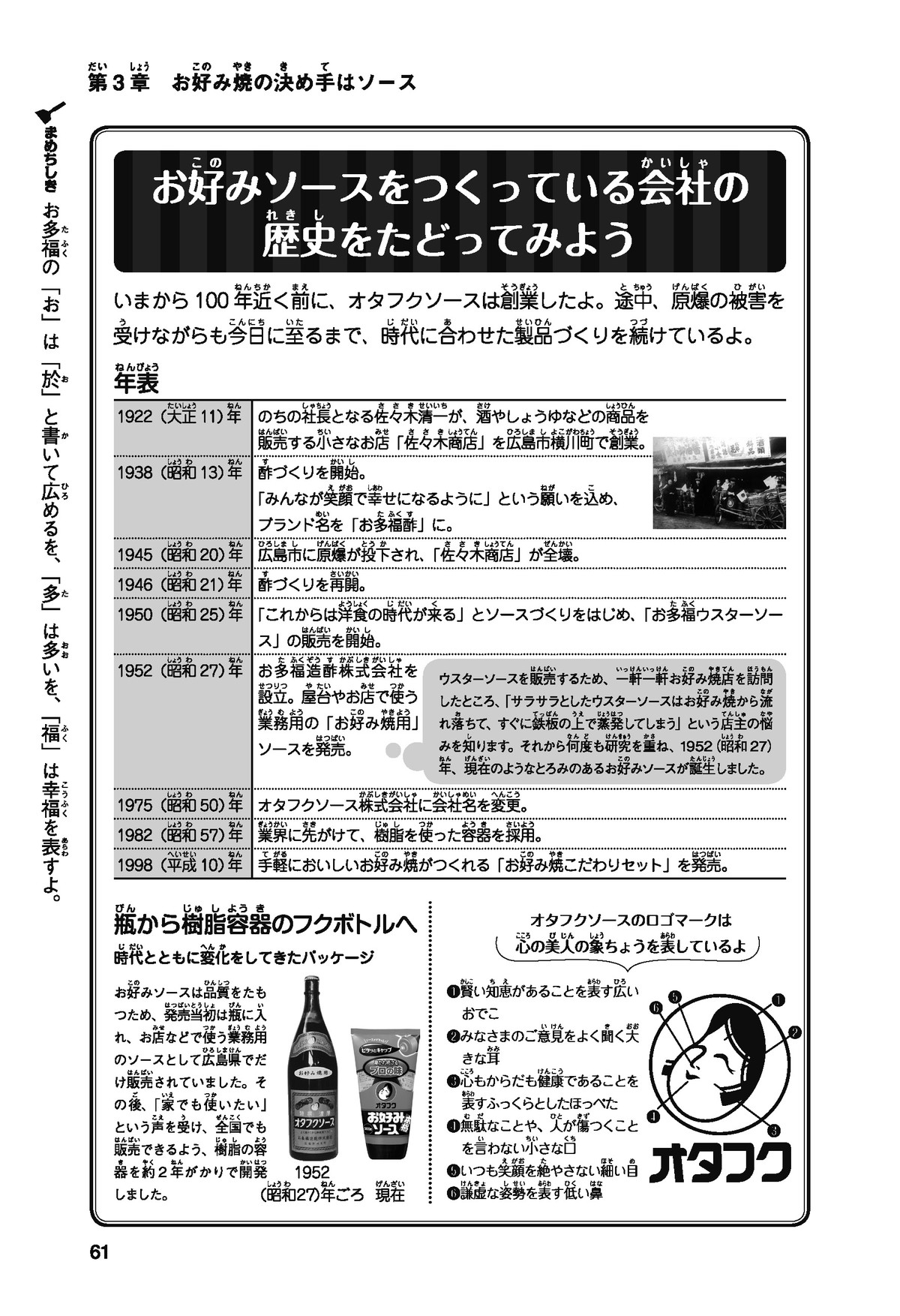 野菜よりも肉が好きなソウスケ。お料理が上手になりたいコノミ。お父さんと夕飯がなかなか一緒に食べられないのが寂しいヒロシの前に、ジュウジュウおばさんが現れる。「お好み焼には「食べることの大事がいっぱい詰まっていて」「お好み焼を食べればたいていのことは解決する」と言うジュウジュウおばさんは、3人を歴史の旅に連れて行く。やがて、お好み焼に興味を持った3人は、お好み焼の決め手がソースだということを知る。ソーズは何でできているのか、どうやってとろみがついているのか、ソースにはひみつがいっぱい。工場や研究所でそのひみつを探っていくよ。ジュウジュウおばさんにお好み焼の作り方を教わった3人は、自分の家に戻って、お好み焼の作り方の歌に合わせて、おいしいお好み焼を作るのだけれど・・・さて、ヒロシはお父さんと夕飯にお好み焼を食べることができたかな。