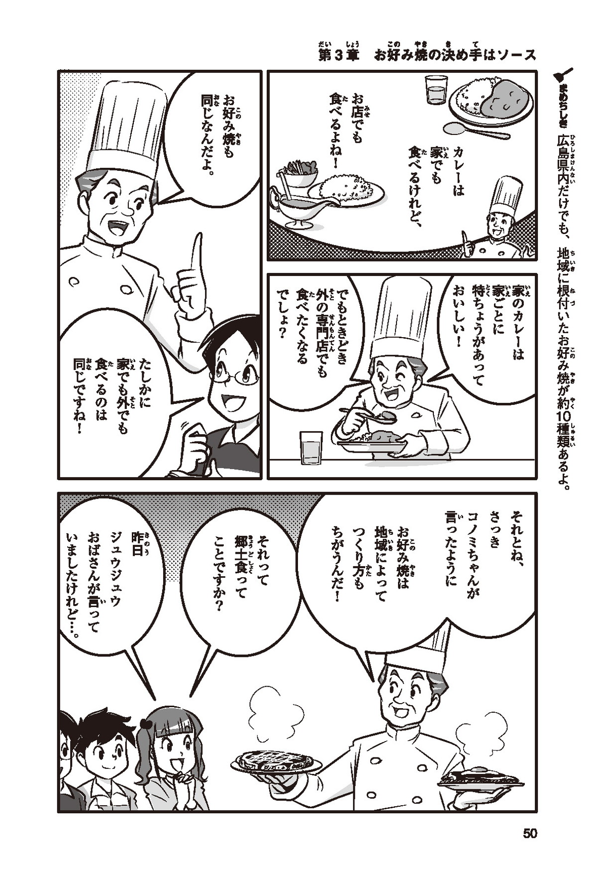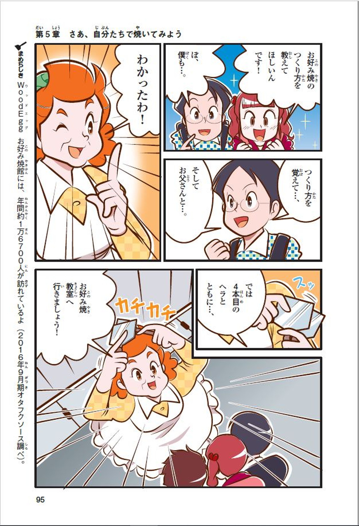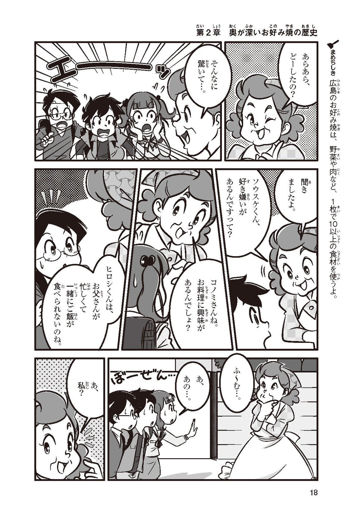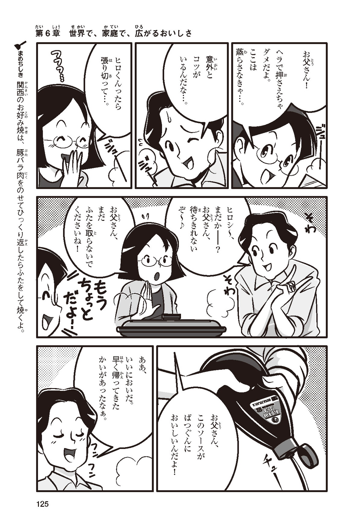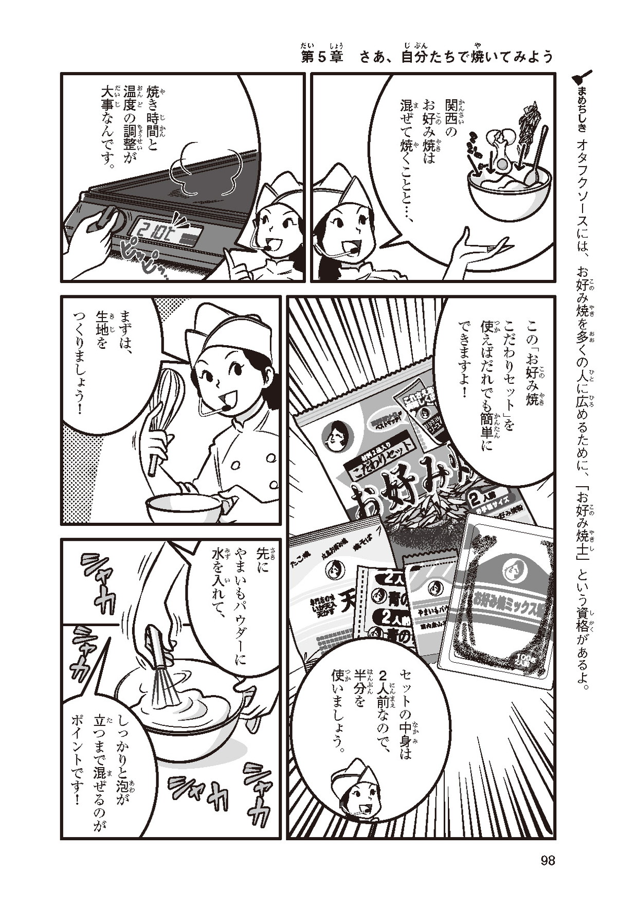 野菜よりも肉が好きなソウスケ。お料理が上手になりたいコノミ。お父さんと夕飯がなかなか一緒に食べられないのが寂しいヒロシの前に、ジュウジュウおばさんが現れる。「お好み焼には「食べることの大事がいっぱい詰まっていて」「お好み焼を食べればたいていのことは解決する」と言うジュウジュウおばさんは、3人を歴史の旅に連れて行く。やがて、お好み焼に興味を持った3人は、お好み焼の決め手がソースだということを知る。ソーズは何でできているのか、どうやってとろみがついているのか、ソースにはひみつがいっぱい。工場や研究所でそのひみつを探っていくよ。ジュウジュウおばさんにお好み焼の作り方を教わった3人は、自分の家に戻って、お好み焼の作り方の歌に合わせて、おいしいお好み焼を作るのだけれど・・・さて、ヒロシはお父さんと夕飯にお好み焼を食べることができたかな。