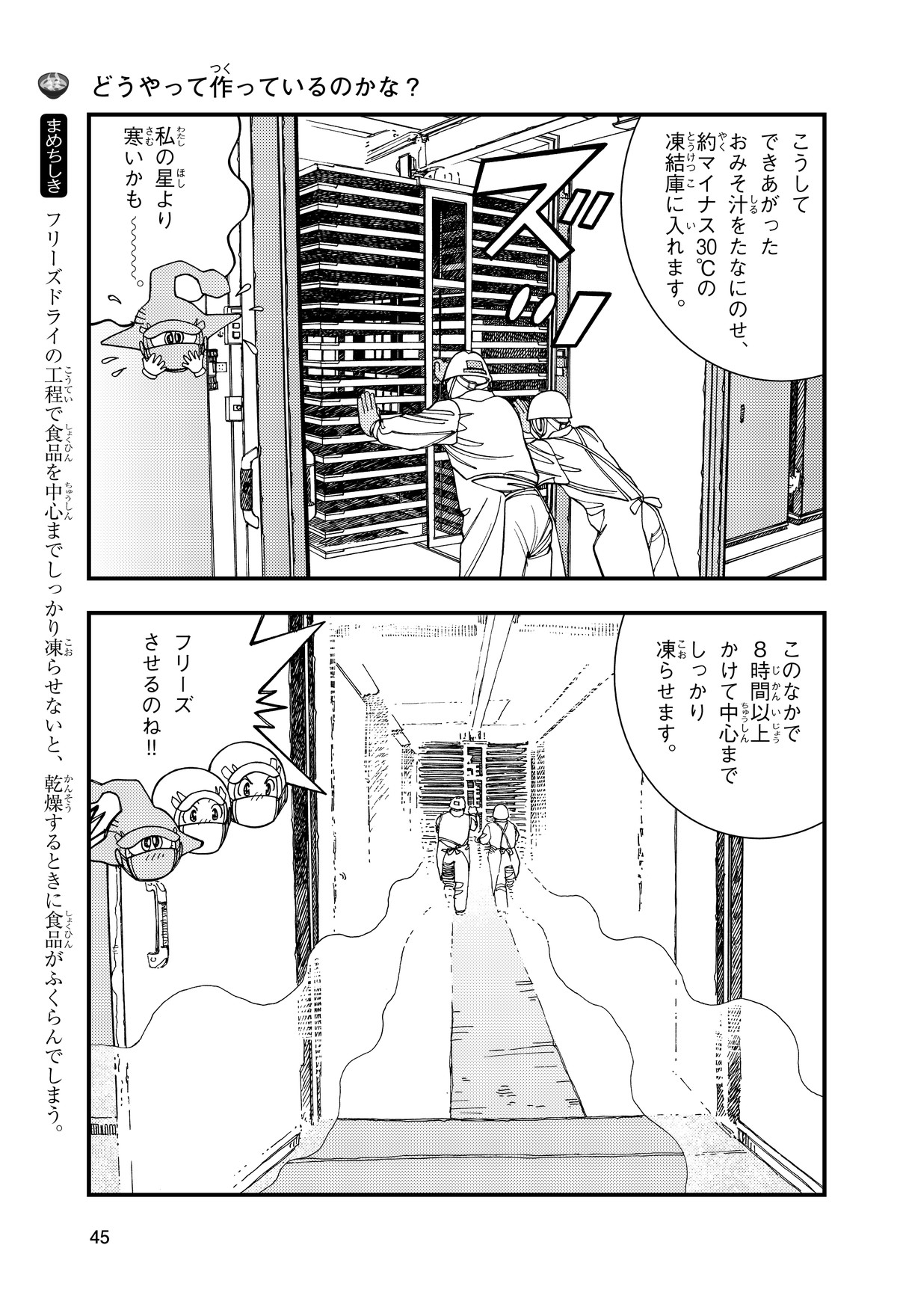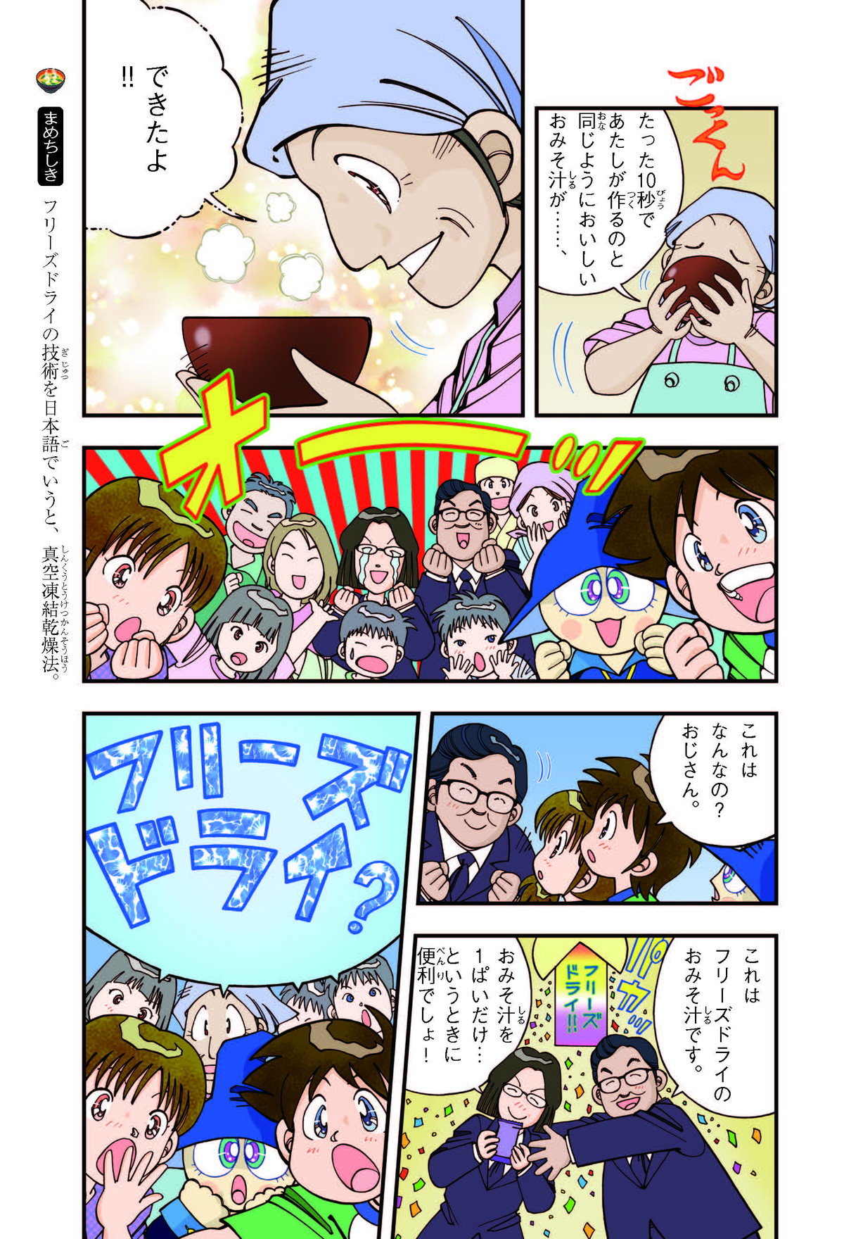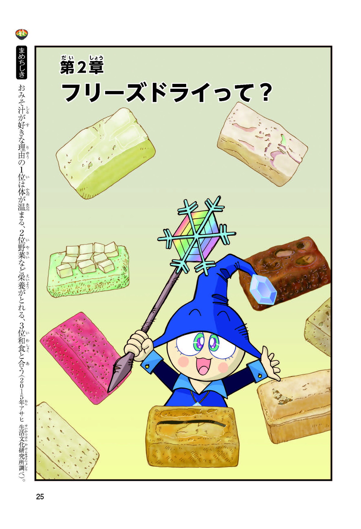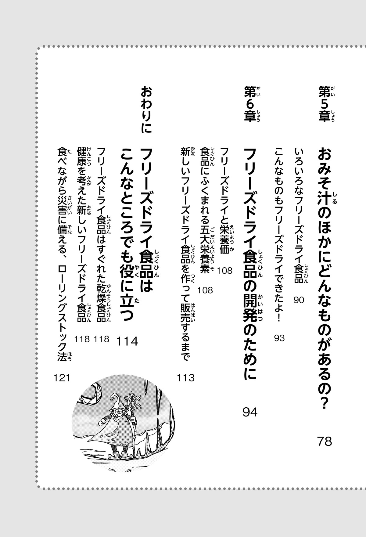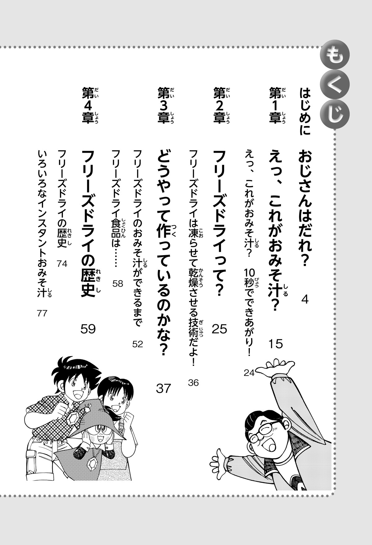 小学5年生の創太(そうた)とユイが愛犬を散歩させていたら、宇宙(うちゅう)から来た妖精(ようせい)のせいでトラブル発生! 妖精(ようせい)と二人がもめていると、なぞの二人組が助けてくれる。この二人組、じつはフリーズドライ食品を作っているんだって。その代表はおみそ汁(しる)。でもフリーズドライってなに? 凍(こお)らせて乾燥(かんそう)させるんだって? いったいどういうことなんだろう?