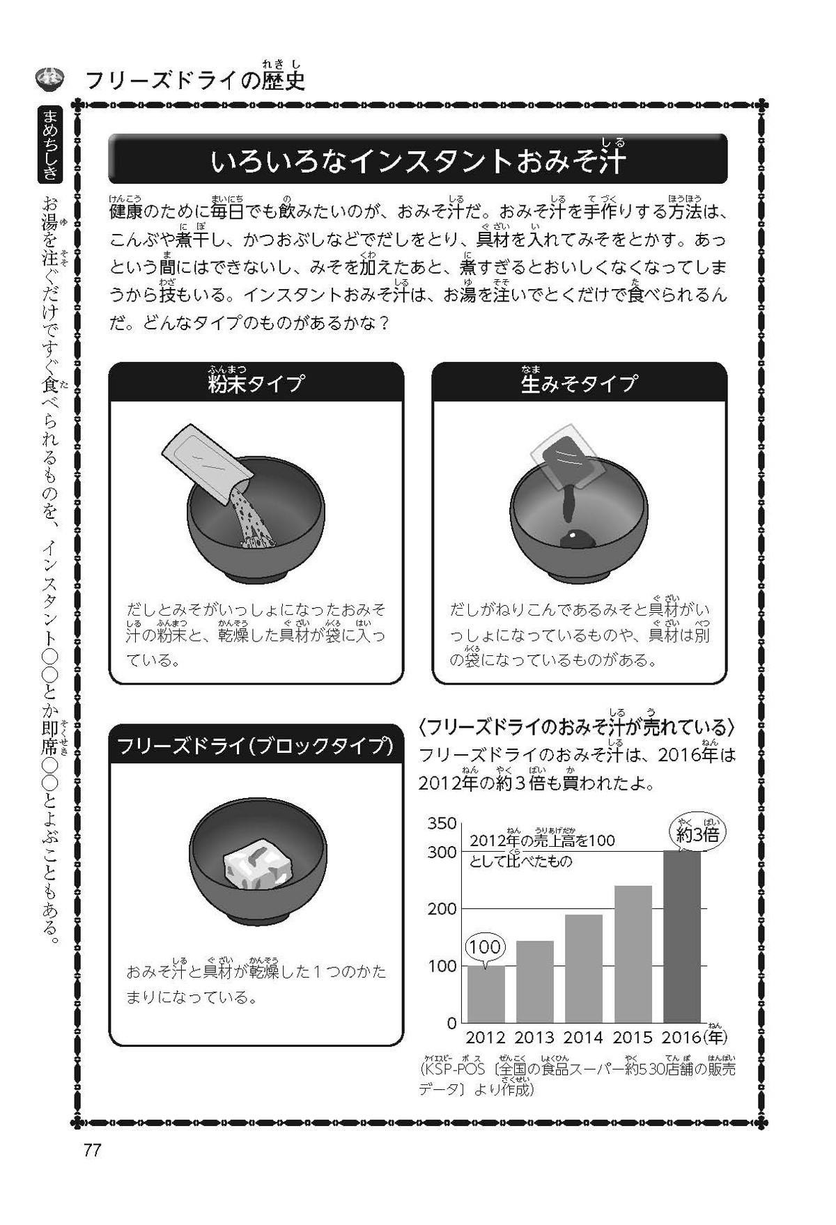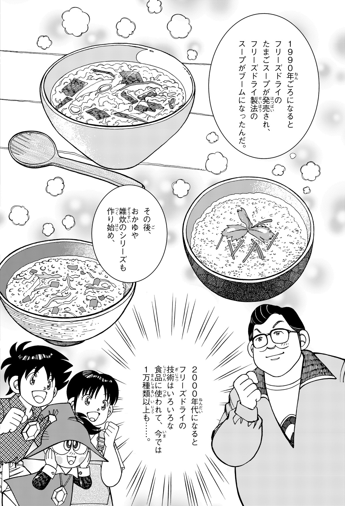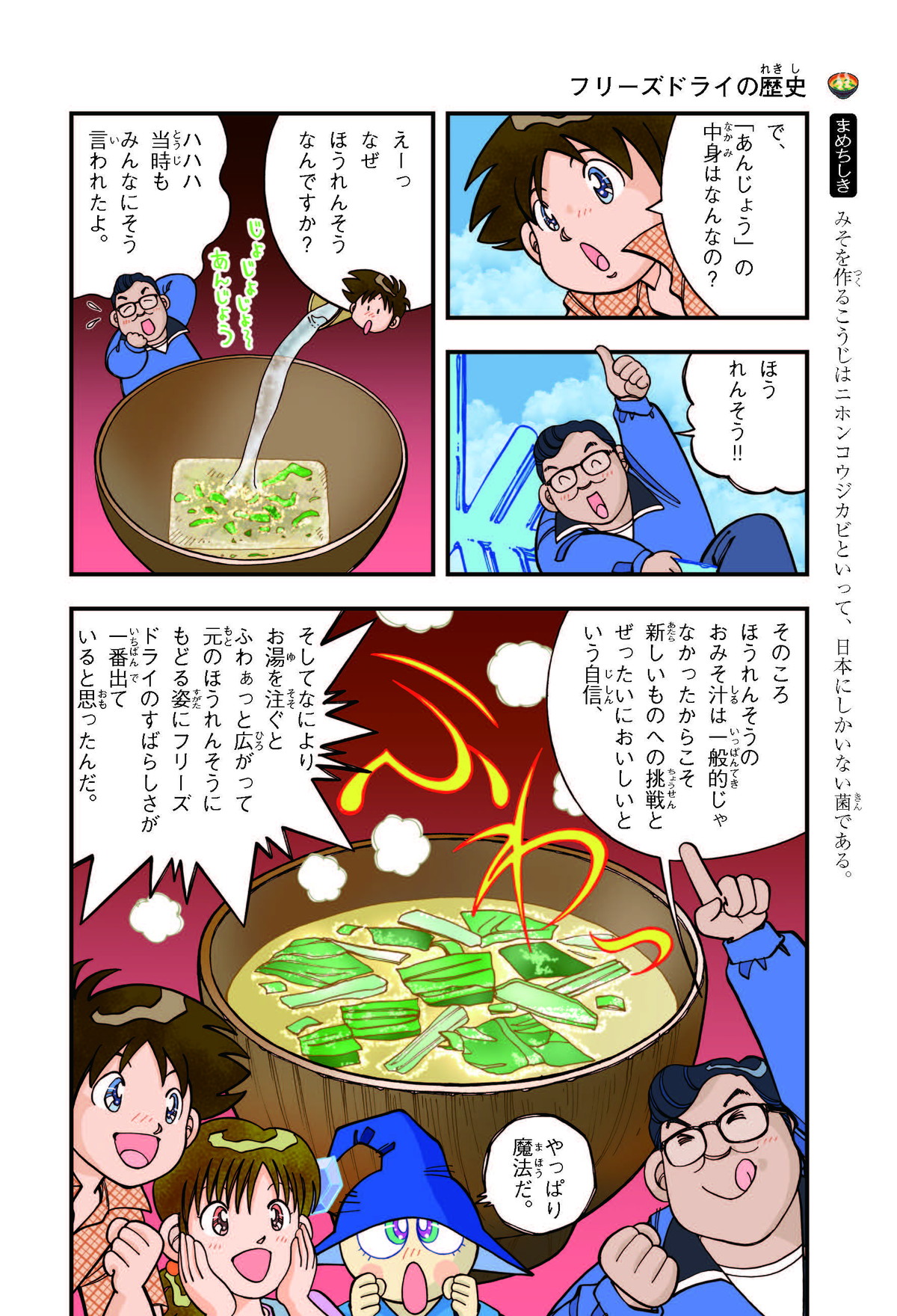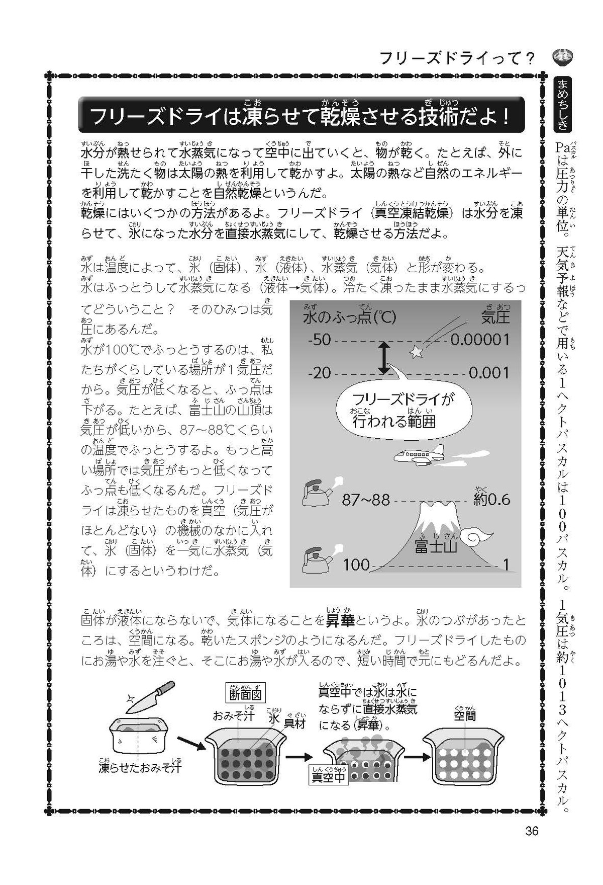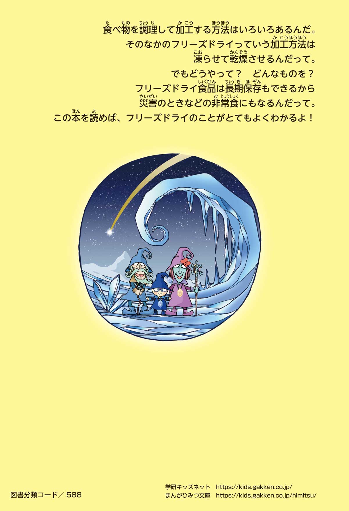 小学5年生の創太(そうた)とユイが愛犬を散歩させていたら、宇宙(うちゅう)から来た妖精(ようせい)のせいでトラブル発生! 妖精(ようせい)と二人がもめていると、なぞの二人組が助けてくれる。この二人組、じつはフリーズドライ食品を作っているんだって。その代表はおみそ汁(しる)。でもフリーズドライってなに? 凍(こお)らせて乾燥(かんそう)させるんだって? いったいどういうことなんだろう?