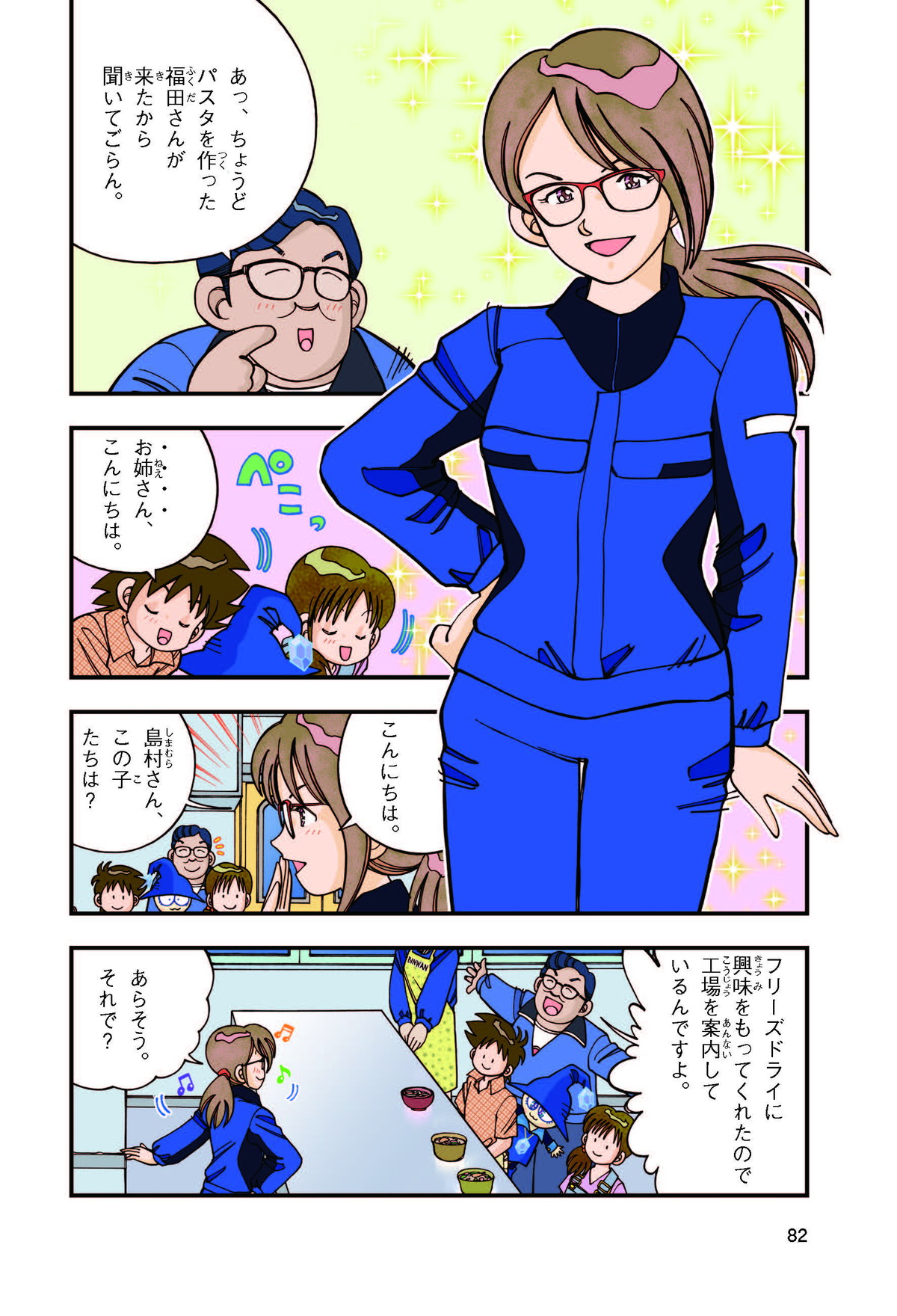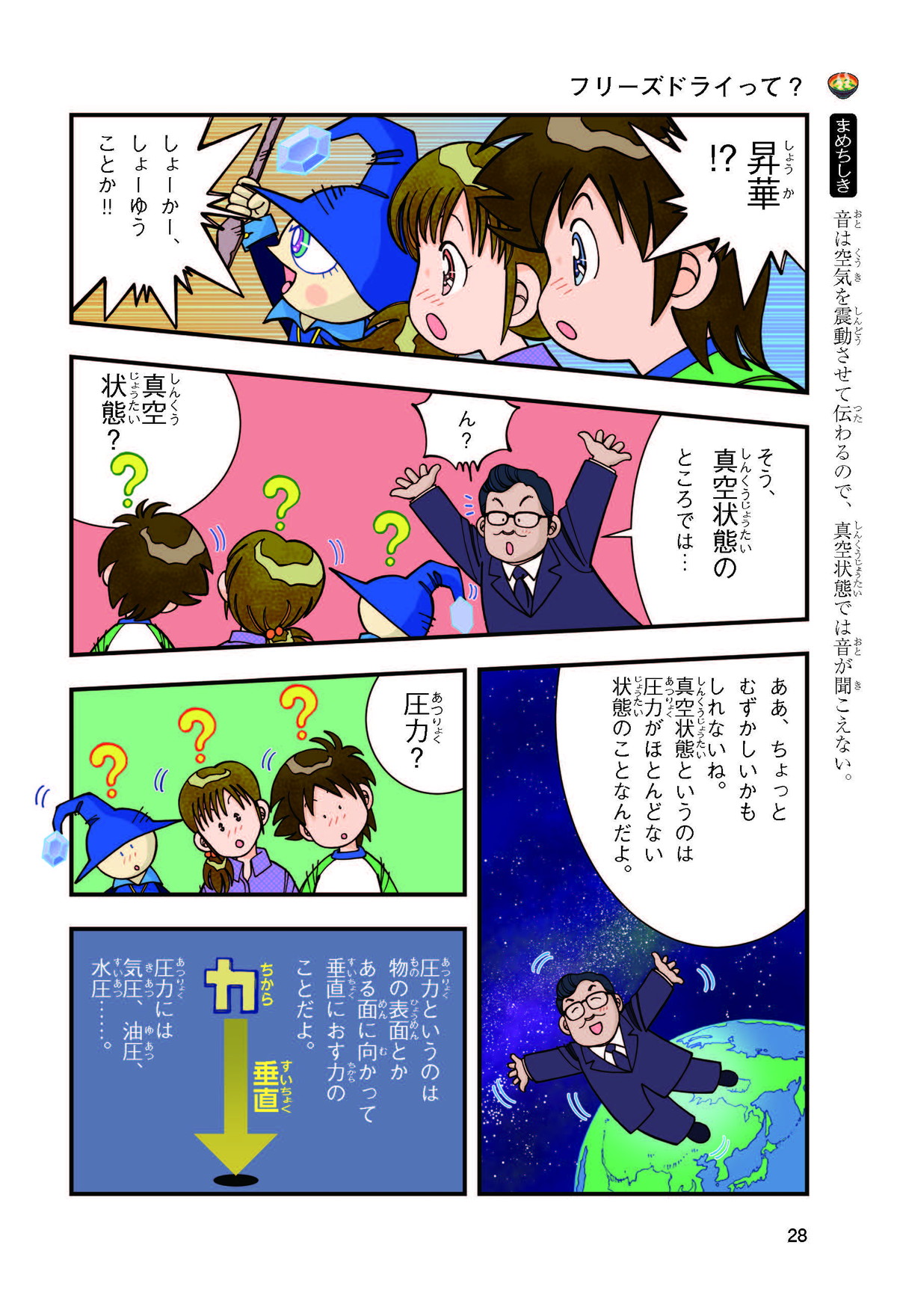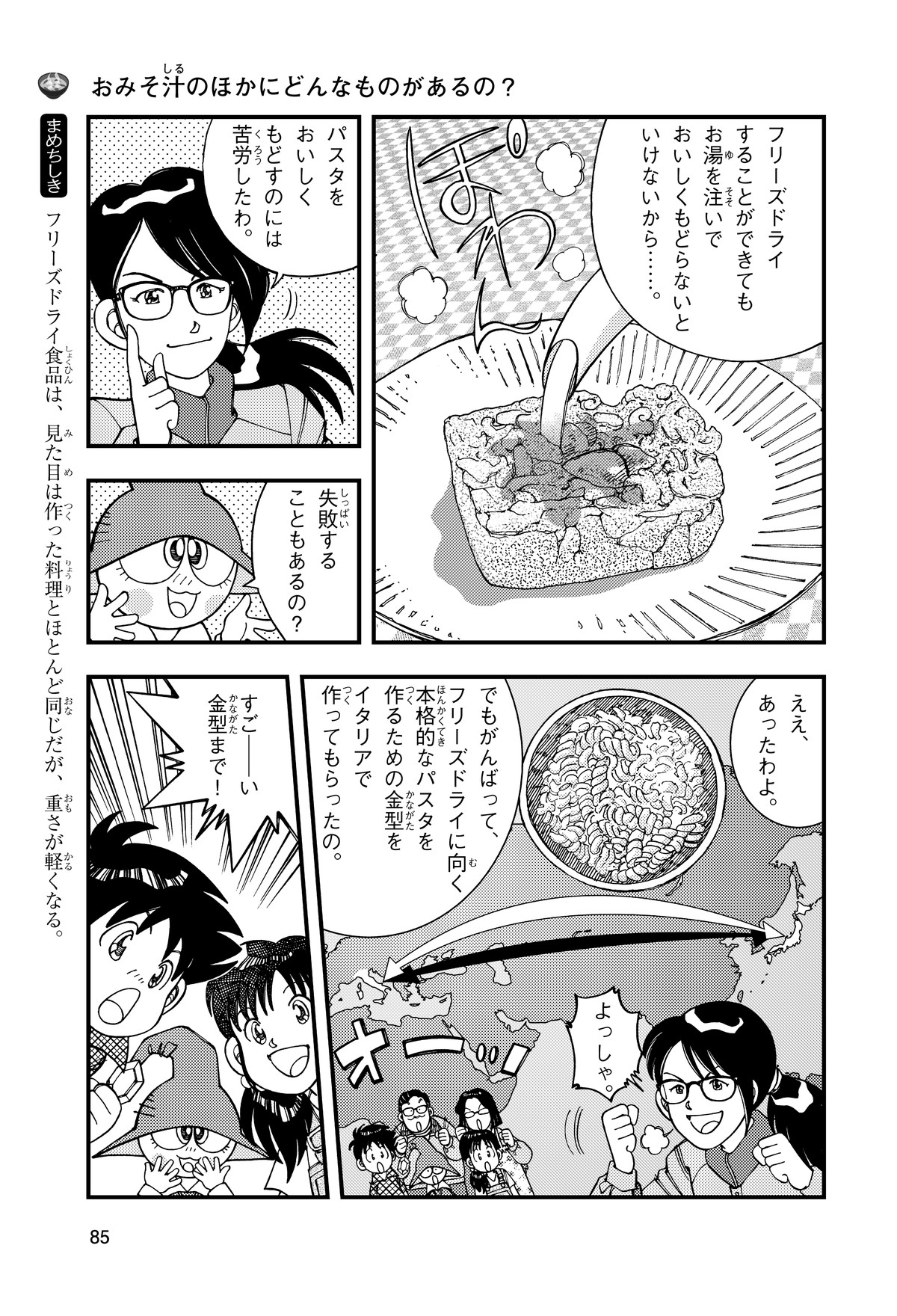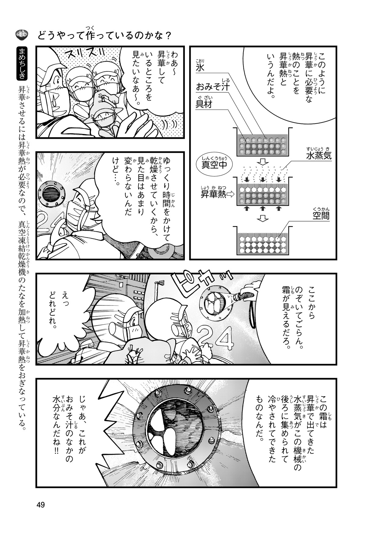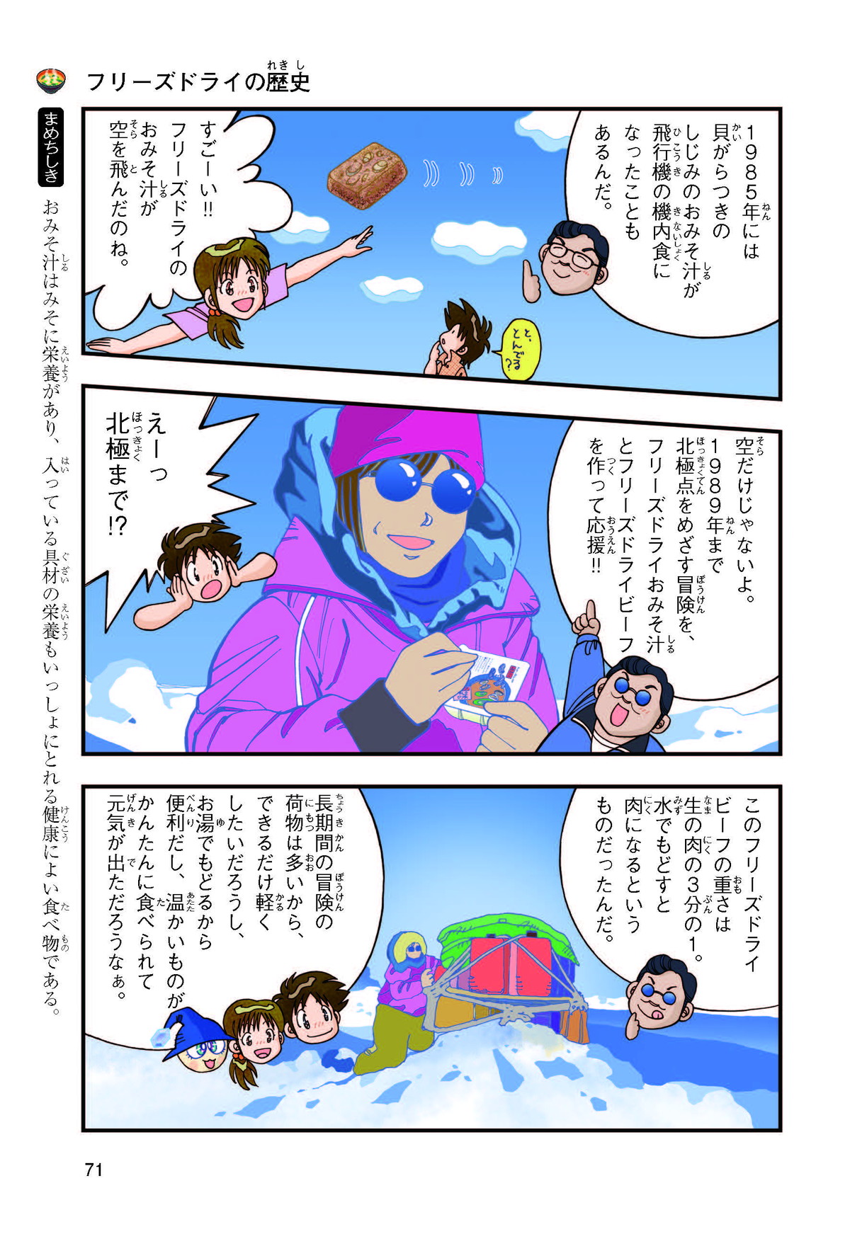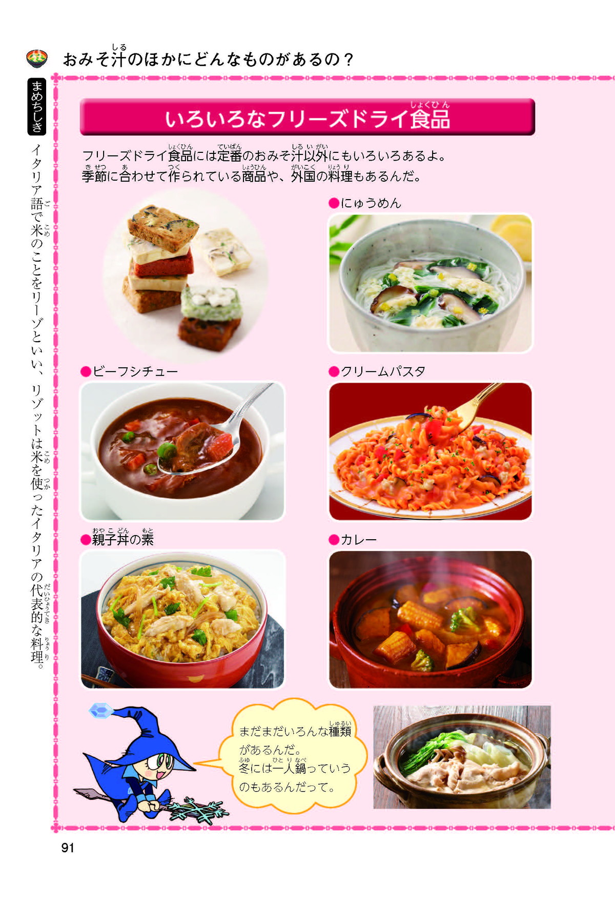 小学5年生の創太(そうた)とユイが愛犬を散歩させていたら、宇宙(うちゅう)から来た妖精(ようせい)のせいでトラブル発生! 妖精(ようせい)と二人がもめていると、なぞの二人組が助けてくれる。この二人組、じつはフリーズドライ食品を作っているんだって。その代表はおみそ汁(しる)。でもフリーズドライってなに? 凍(こお)らせて乾燥(かんそう)させるんだって? いったいどういうことなんだろう?