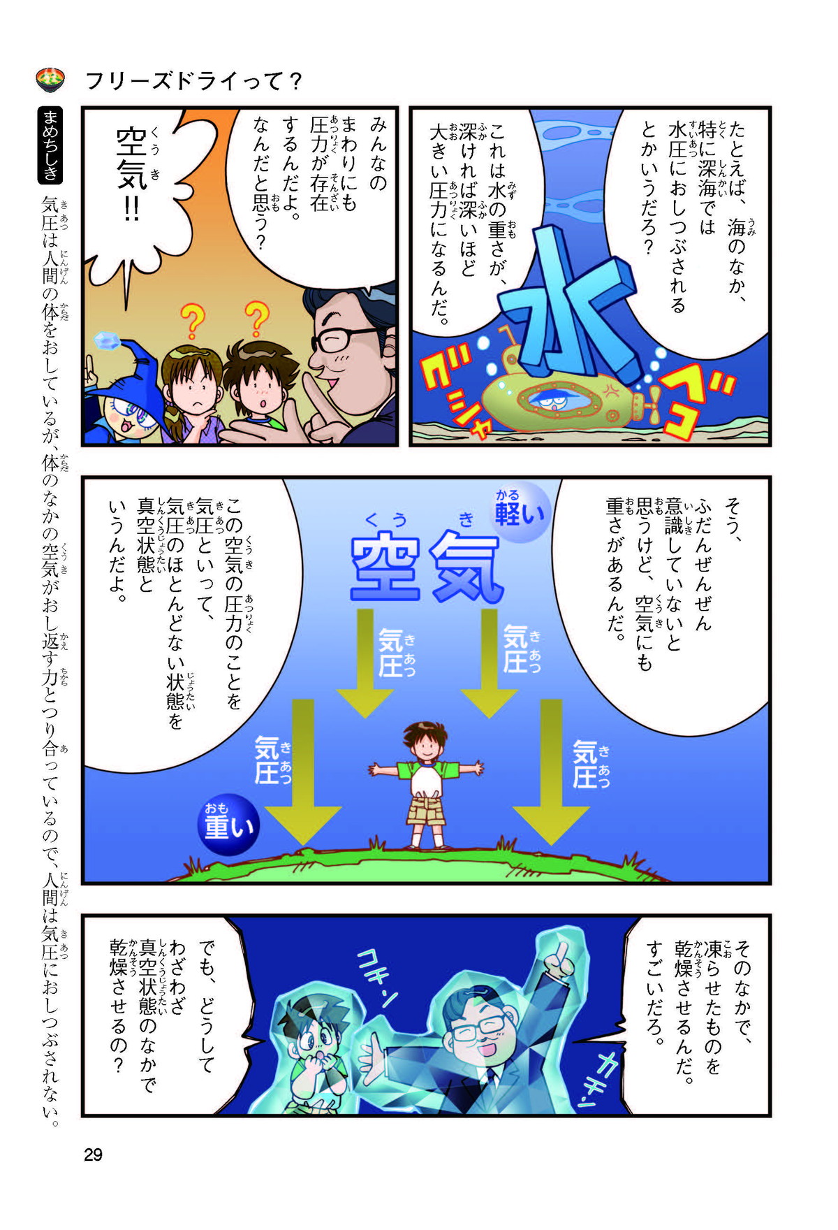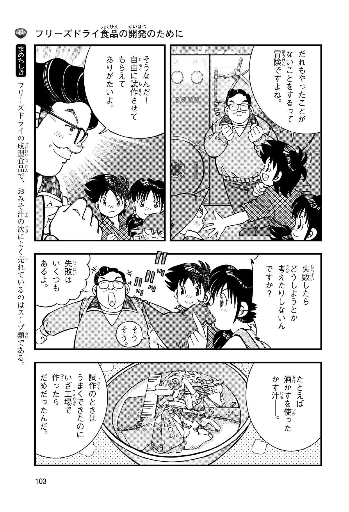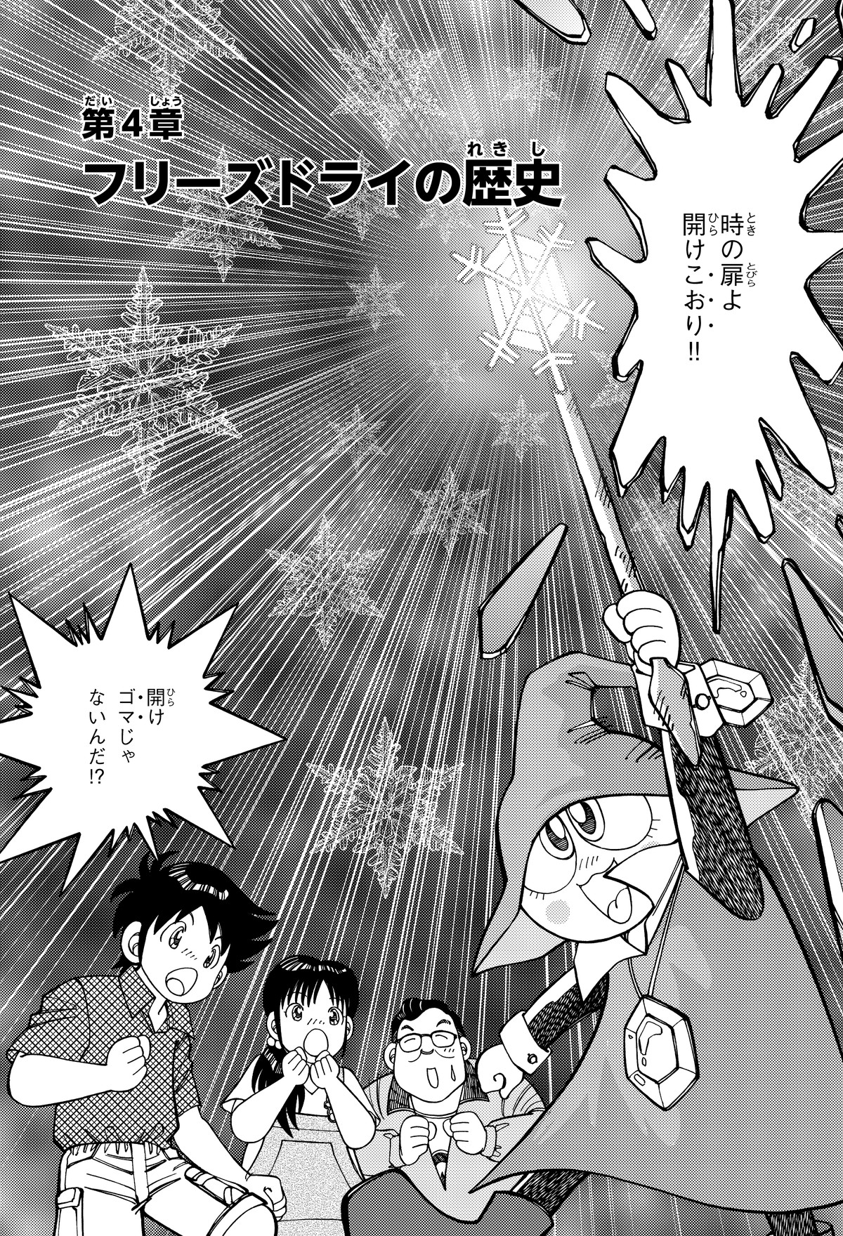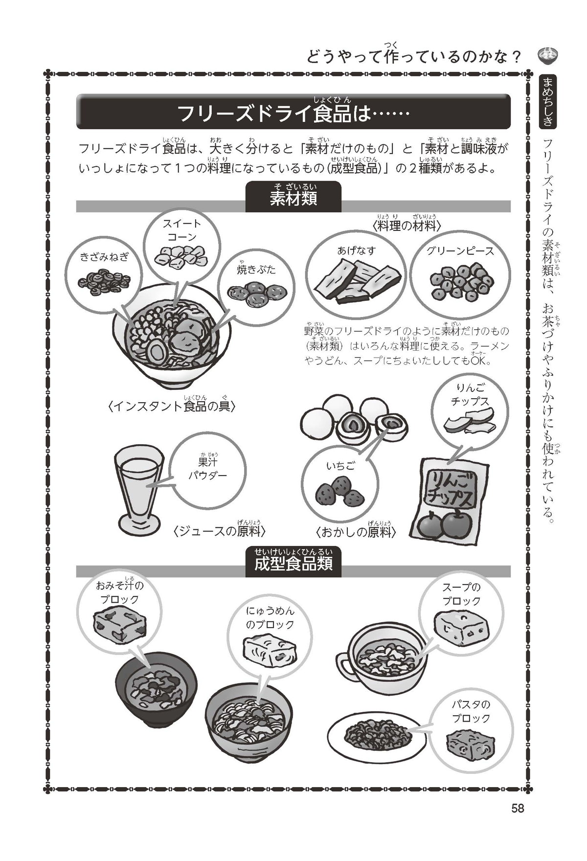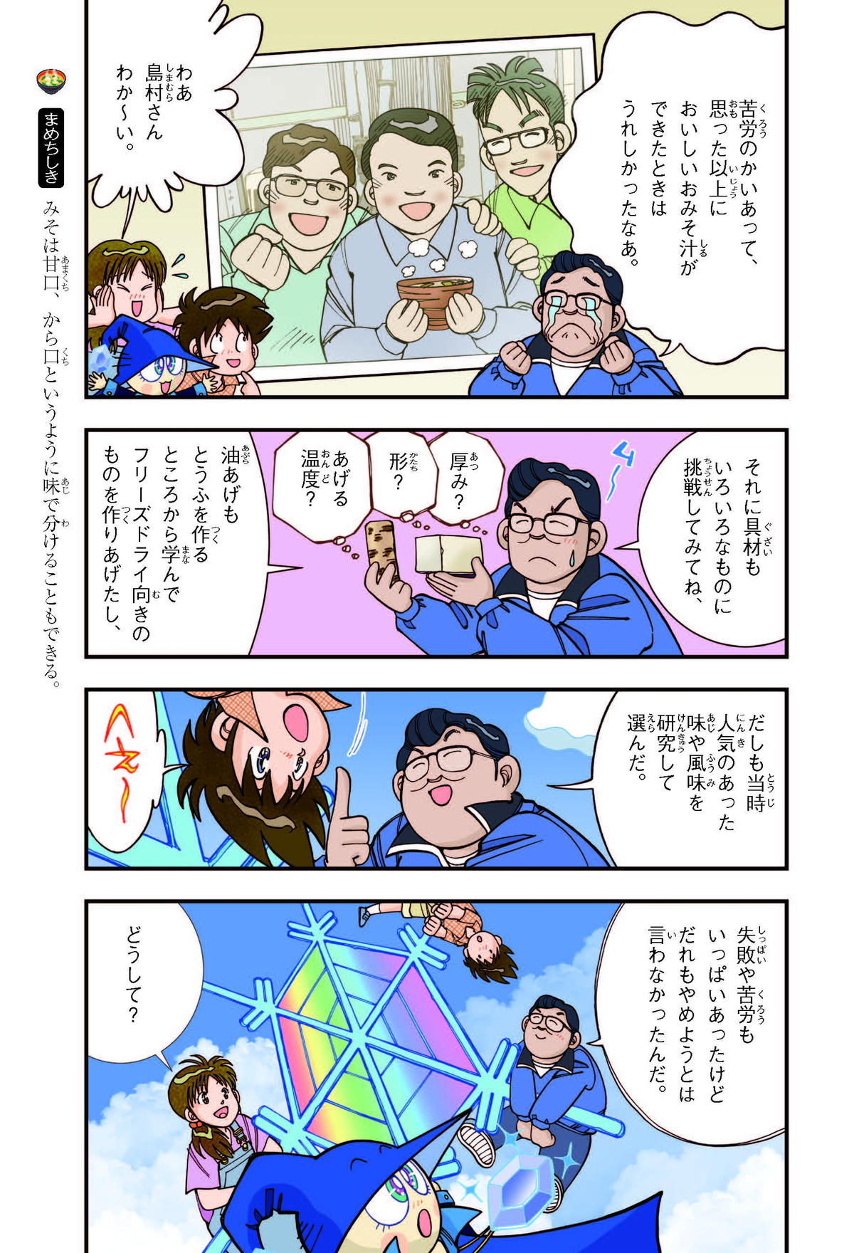 小学5年生の創太(そうた)とユイが愛犬を散歩させていたら、宇宙(うちゅう)から来た妖精(ようせい)のせいでトラブル発生! 妖精(ようせい)と二人がもめていると、なぞの二人組が助けてくれる。この二人組、じつはフリーズドライ食品を作っているんだって。その代表はおみそ汁(しる)。でもフリーズドライってなに? 凍(こお)らせて乾燥(かんそう)させるんだって? いったいどういうことなんだろう?