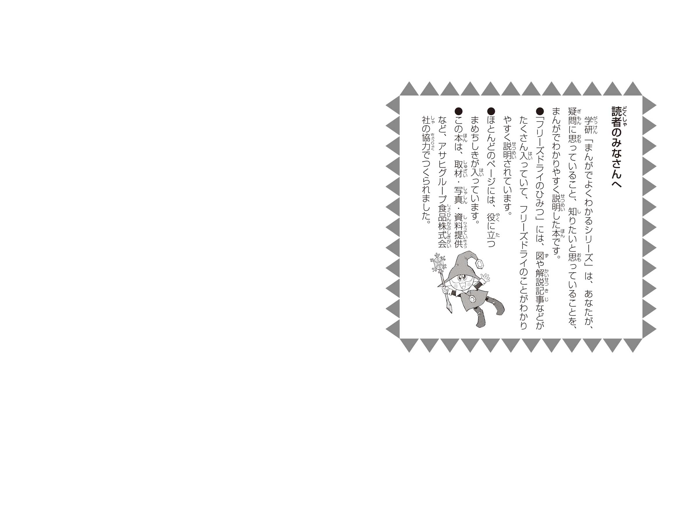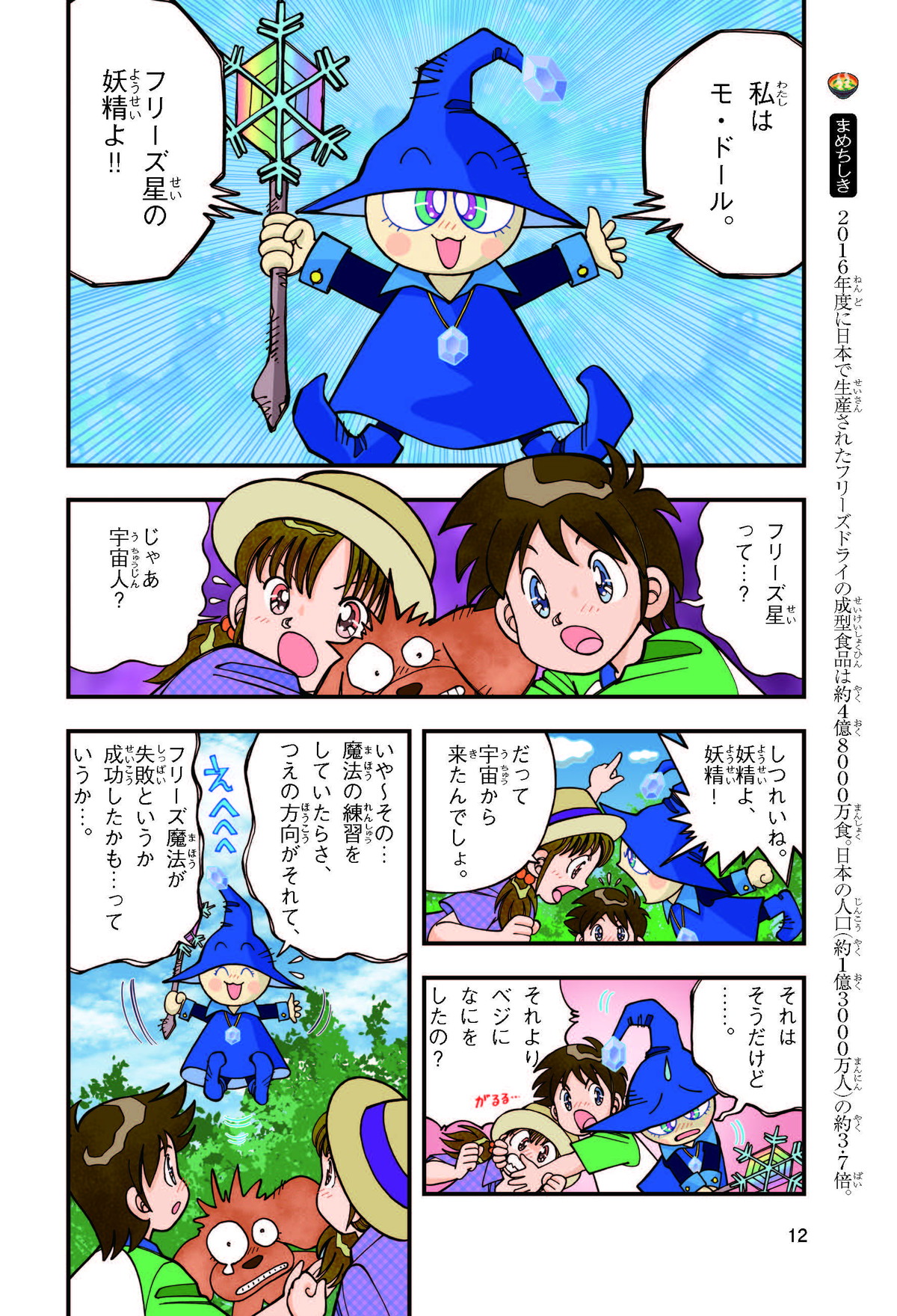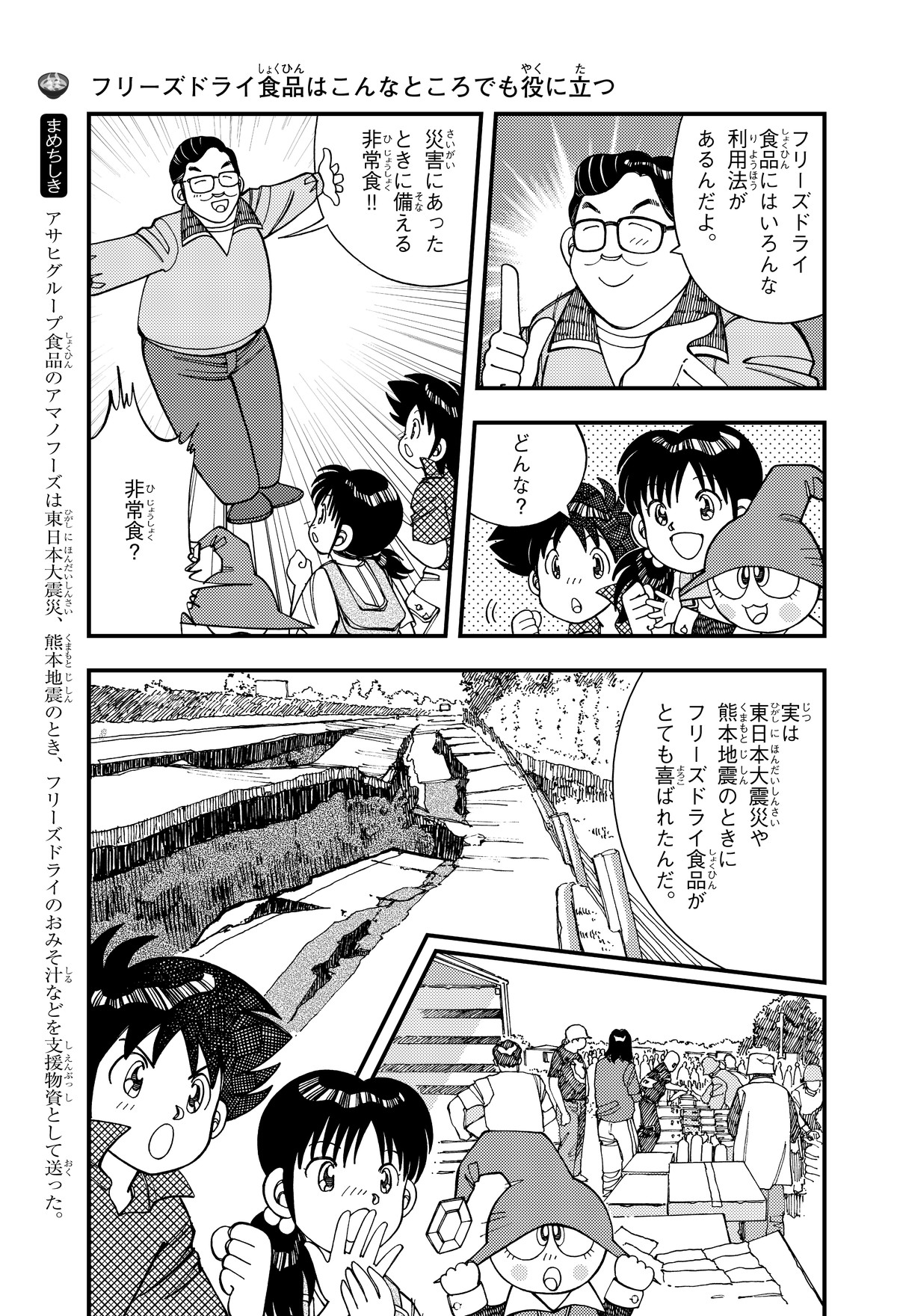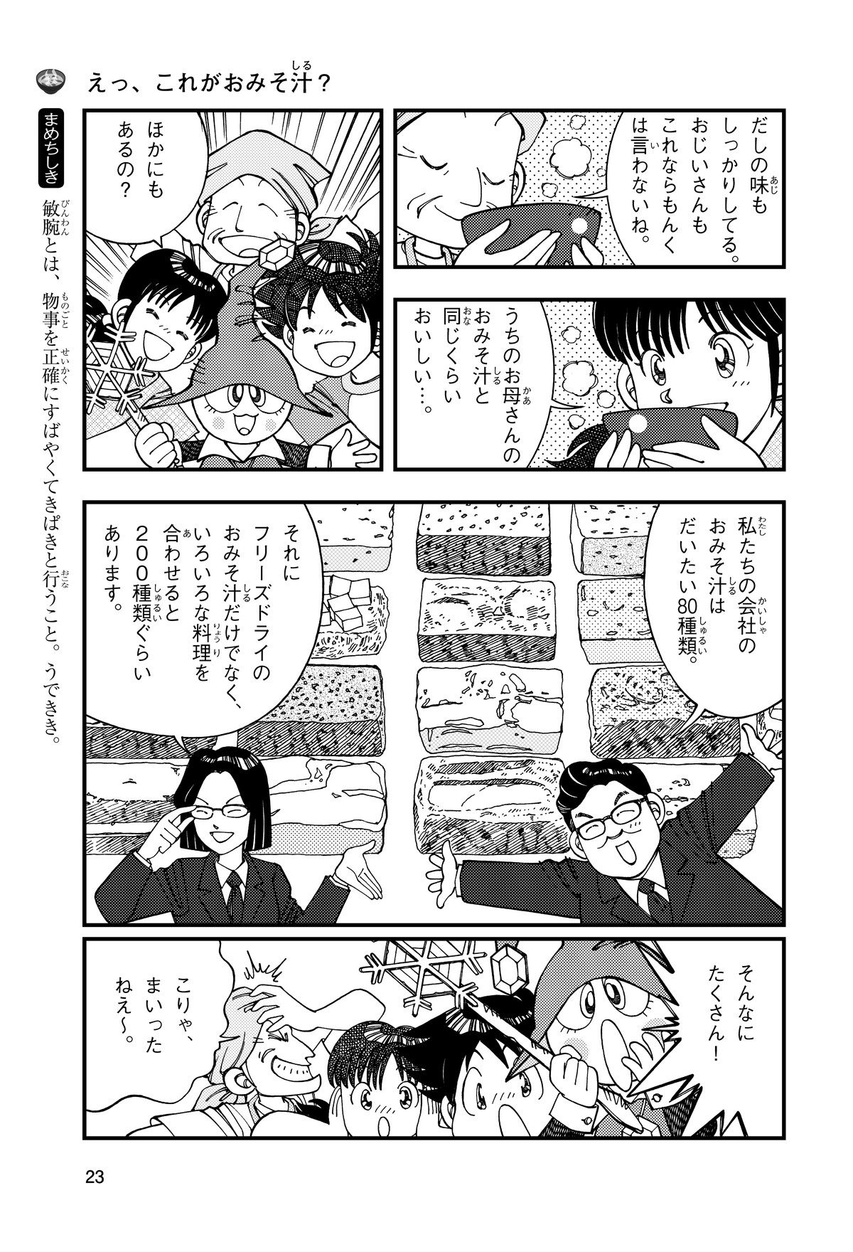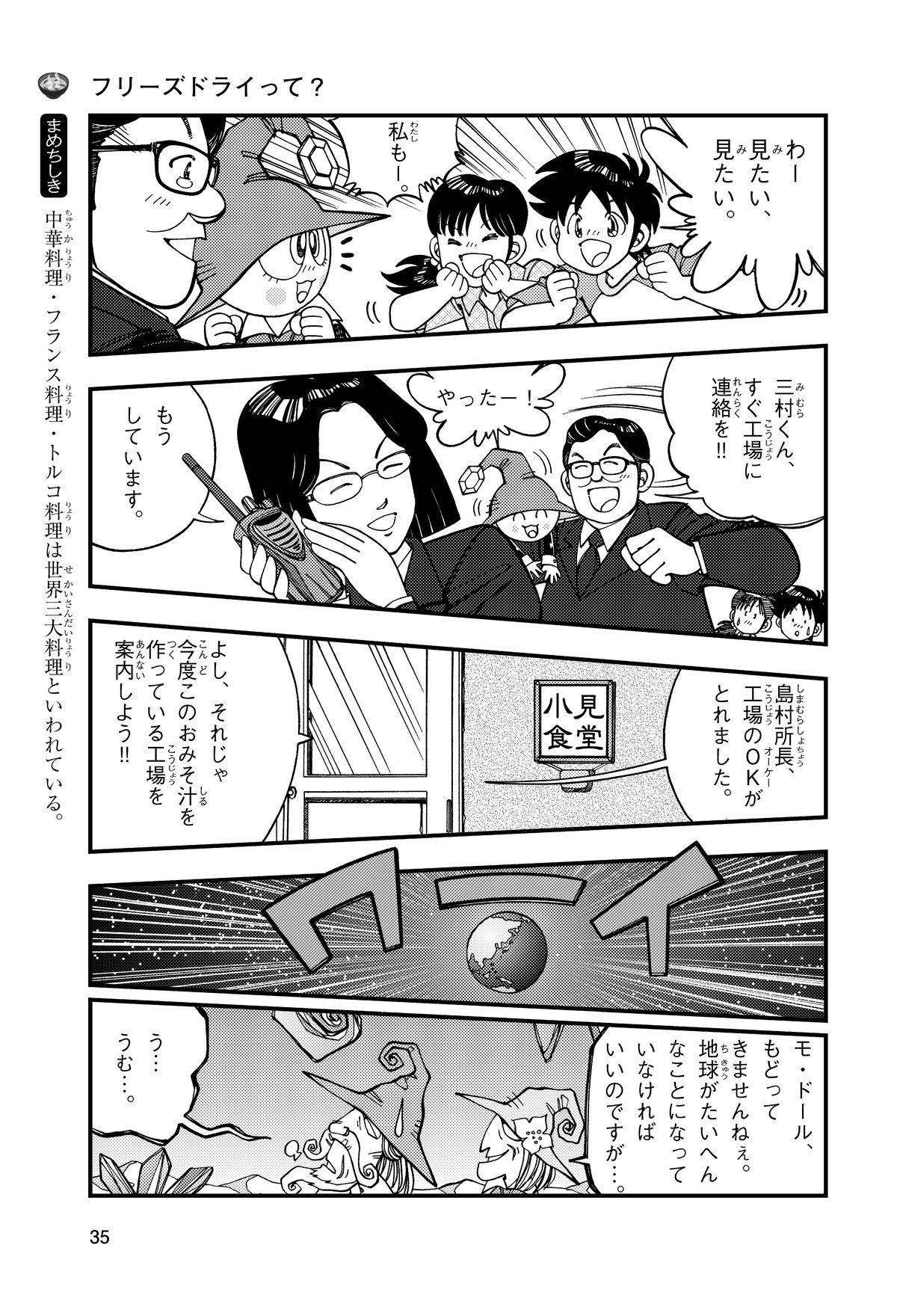 小学5年生の創太(そうた)とユイが愛犬を散歩させていたら、宇宙(うちゅう)から来た妖精(ようせい)のせいでトラブル発生! 妖精(ようせい)と二人がもめていると、なぞの二人組が助けてくれる。この二人組、じつはフリーズドライ食品を作っているんだって。その代表はおみそ汁(しる)。でもフリーズドライってなに? 凍(こお)らせて乾燥(かんそう)させるんだって? いったいどういうことなんだろう?