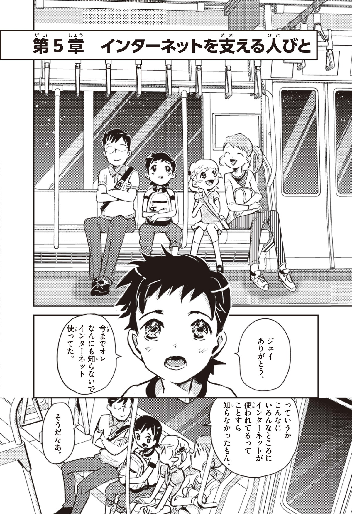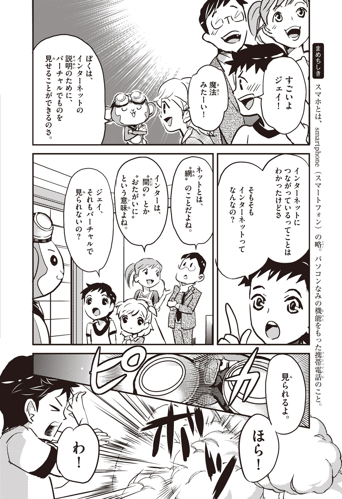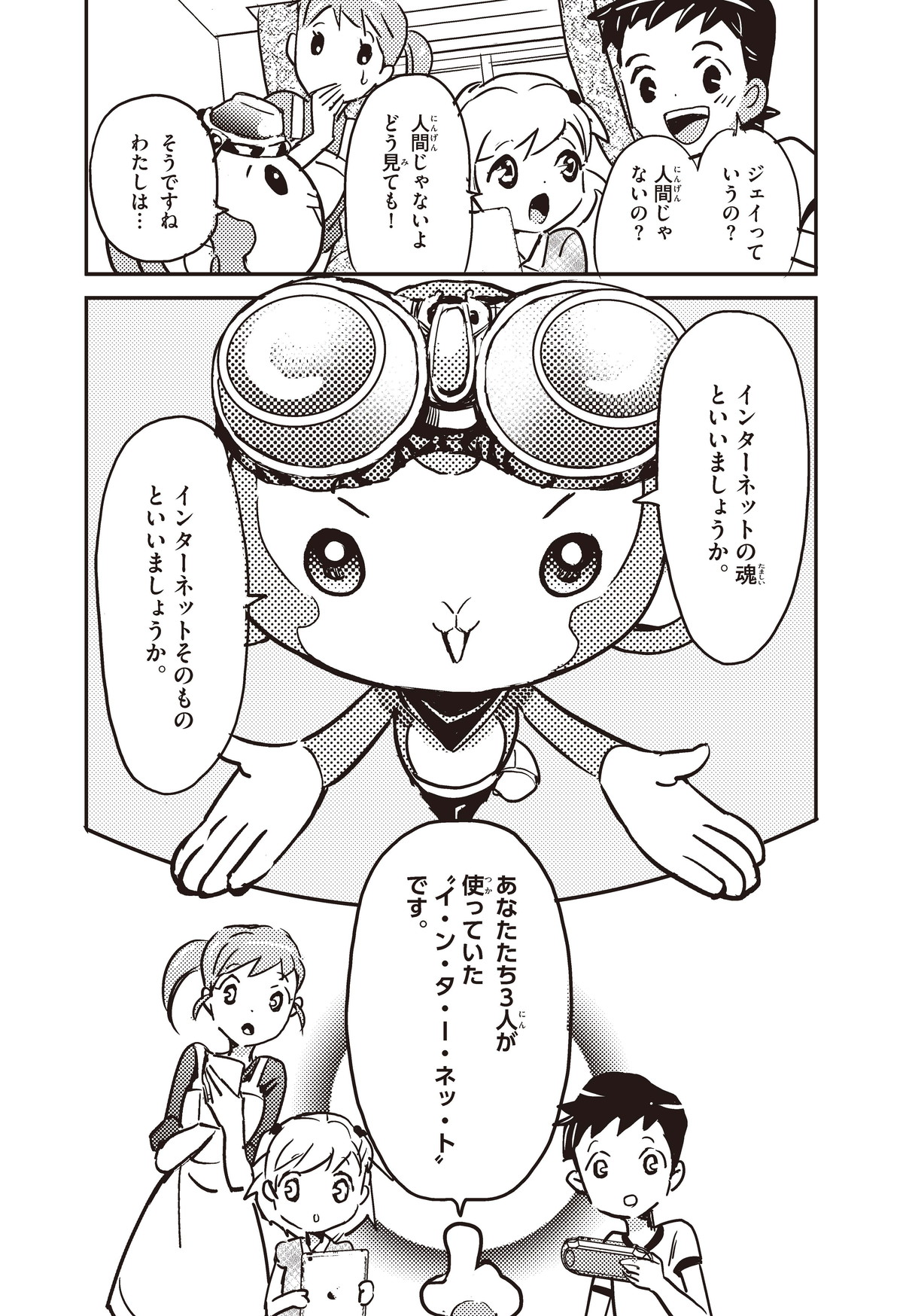 小学6年生友樹(ともき)の家に突然(とつぜん)あらわれたジェイ。彼(かれ)はインターネットの化身(けしん)なんだって!? 今まではなんとなく使ってたインターネットだけど、どんなしくみなのかまったくわからないなぁ。そこで友樹(ともき)は、家族みんなでジェイといっしょにインターネットの世界へ大冒険(だいぼうけん)! 検索(けんさく)って、ウェブってこんなしくみだったんだ!