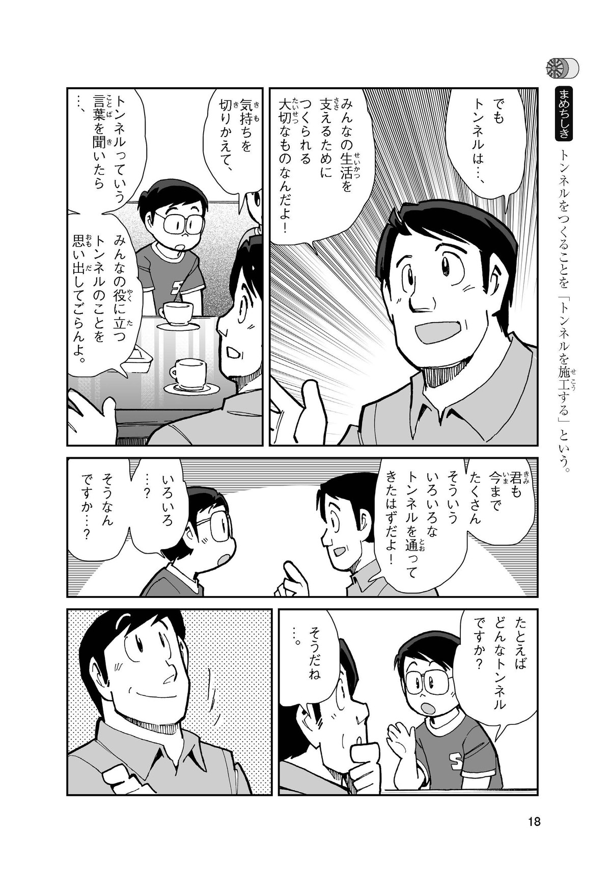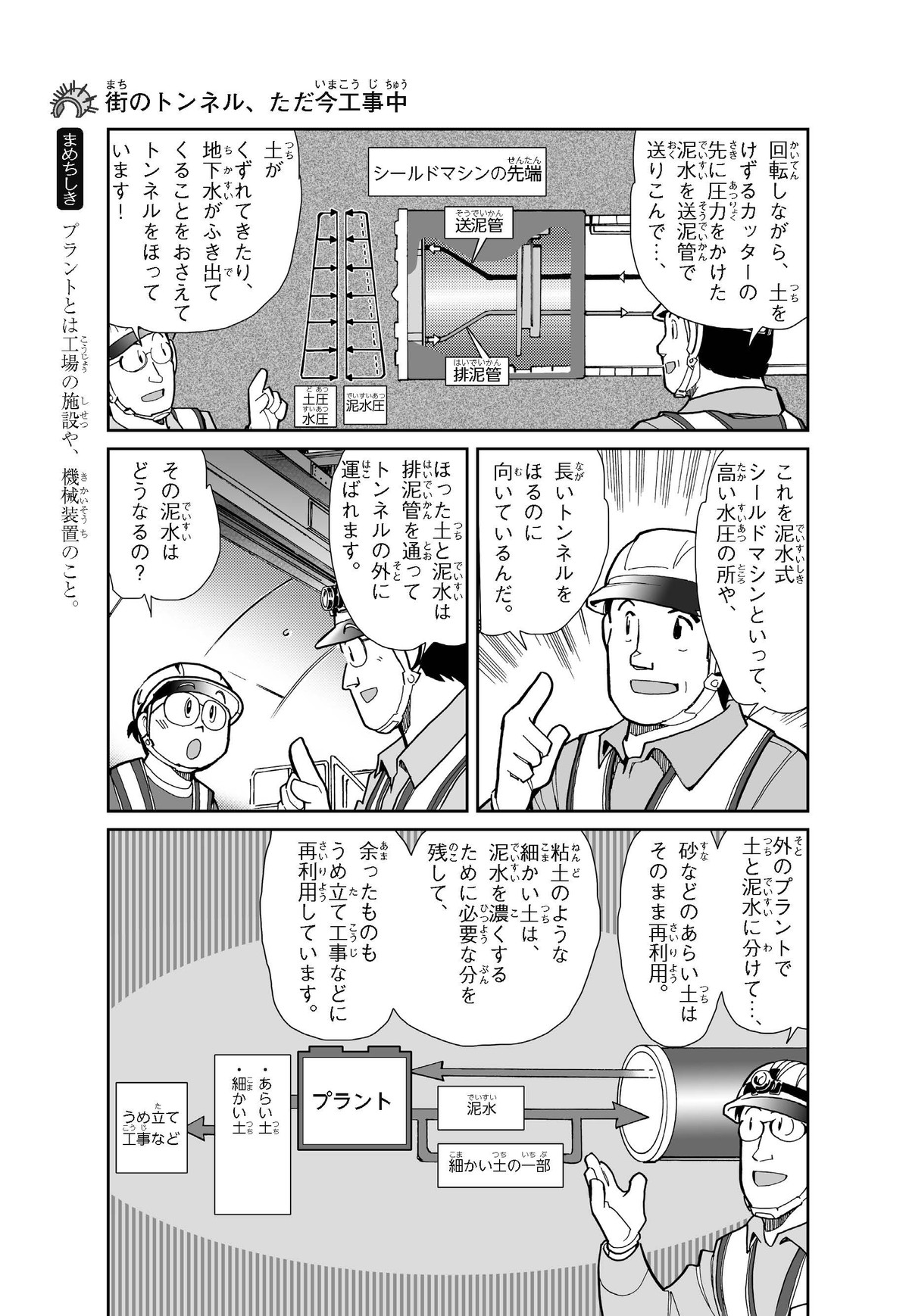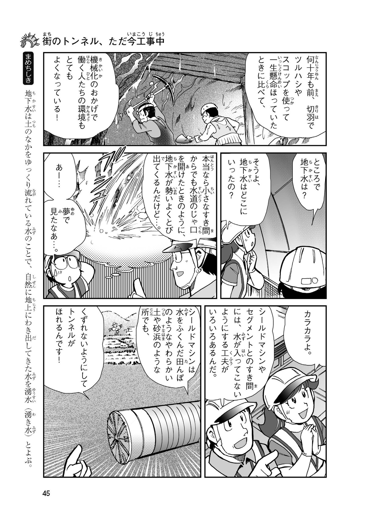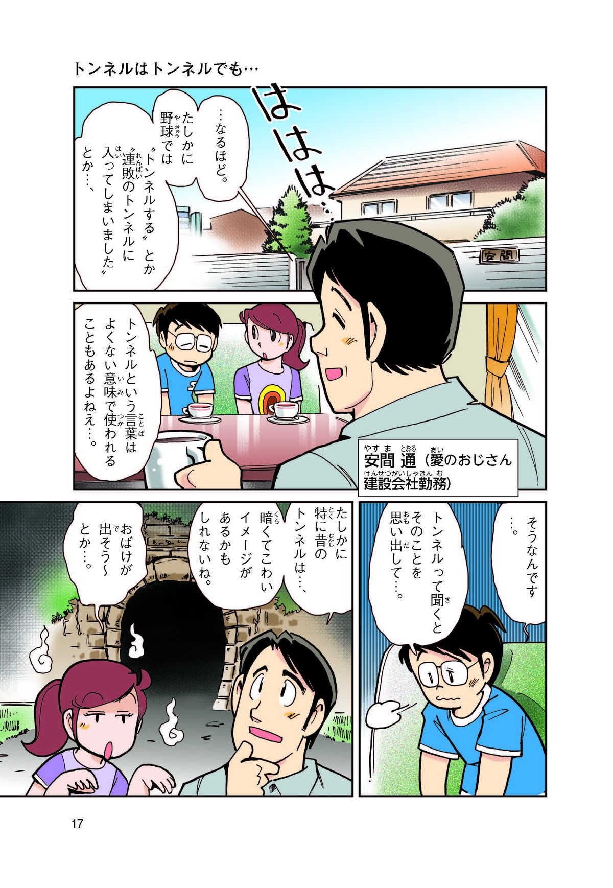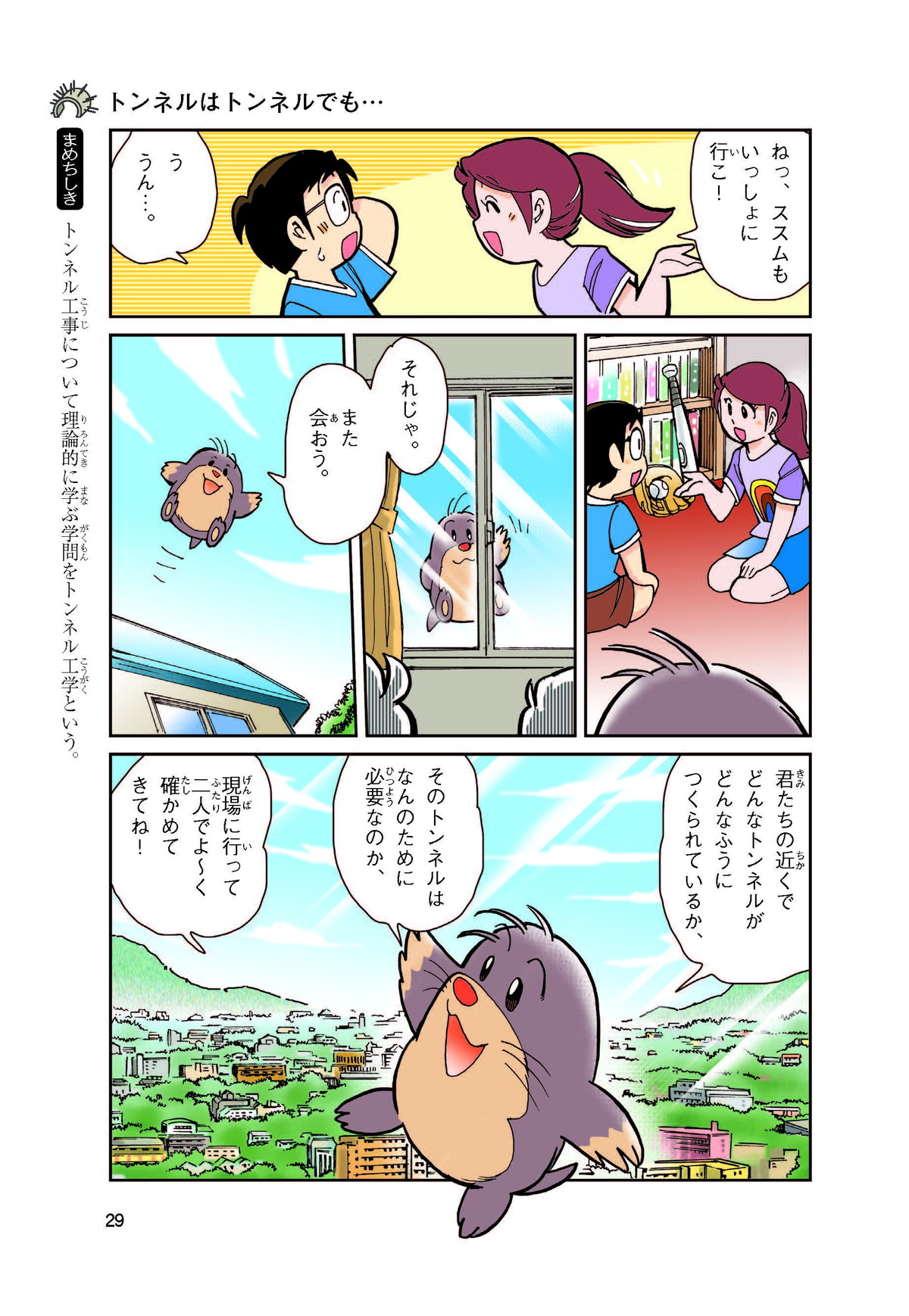 野球の試合でトンネルばかりするススム(小学5年生)は「トンネル」という言葉がきらい。同級生の愛ちゃんはそんなススムを、おじさんが働くトンネルの工事現場(げんば)に連れて行くことに。初めて見る工事現場ではおどろきや発見がいっぱい!ススムはトンネルにだんだん興味(きょうみ)をもち始め、トンネルが社会やくらしに役に立つものだと知っていくよ。そして大人になったススムは……。