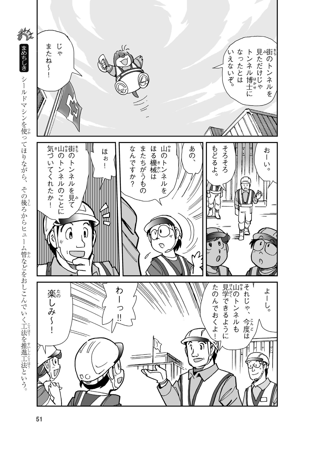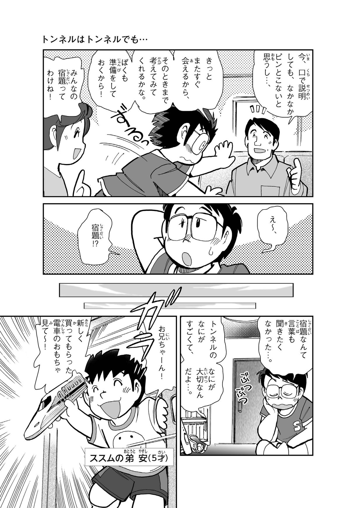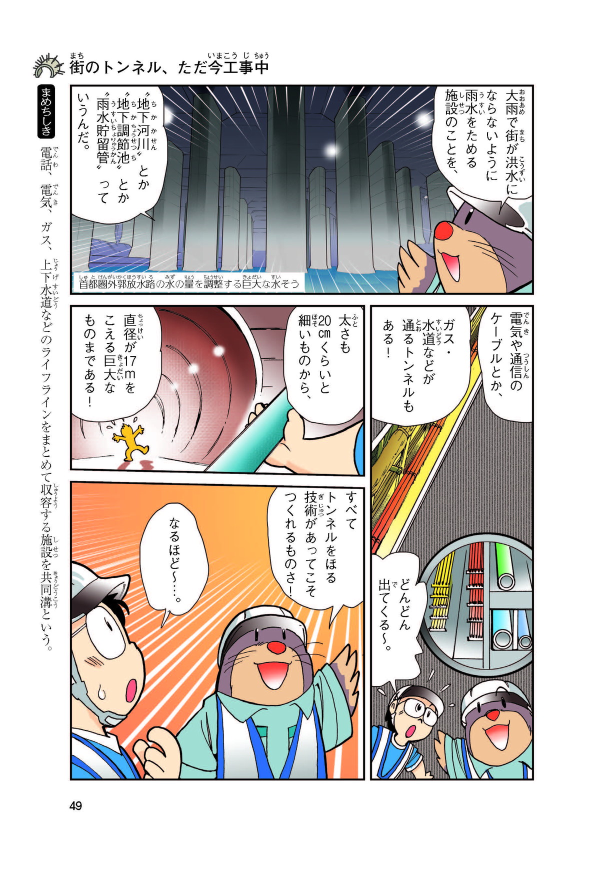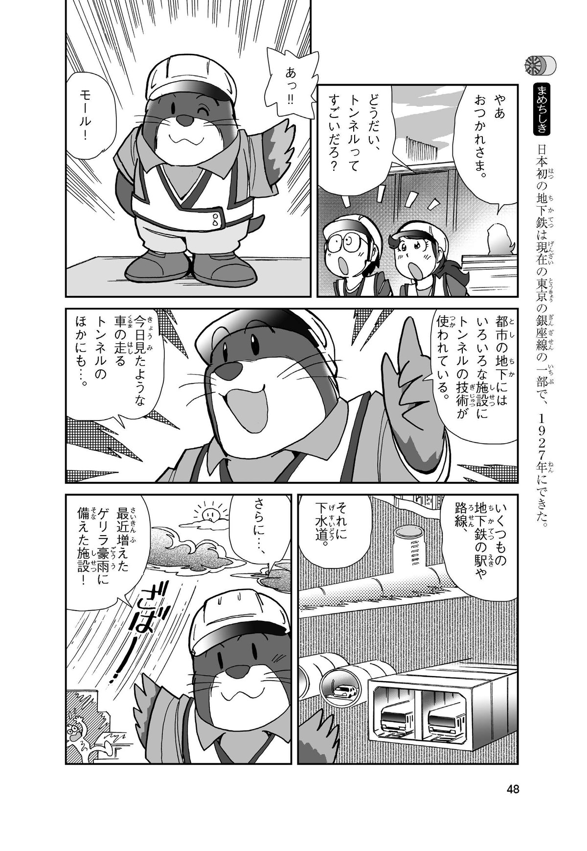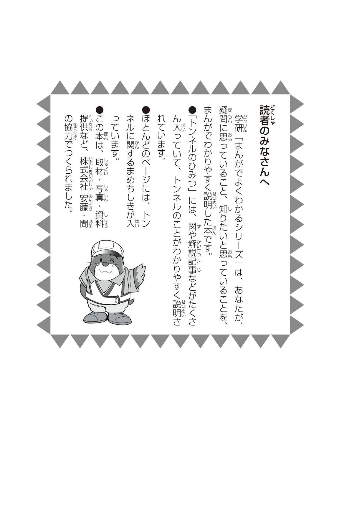 野球の試合でトンネルばかりするススム(小学5年生)は「トンネル」という言葉がきらい。同級生の愛ちゃんはそんなススムを、おじさんが働くトンネルの工事現場(げんば)に連れて行くことに。初めて見る工事現場ではおどろきや発見がいっぱい!ススムはトンネルにだんだん興味(きょうみ)をもち始め、トンネルが社会やくらしに役に立つものだと知っていくよ。そして大人になったススムは……。