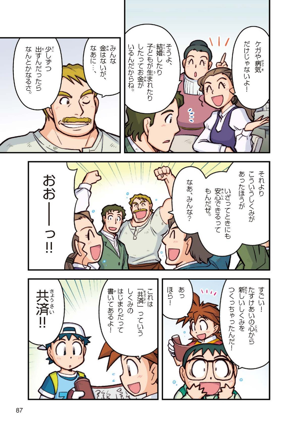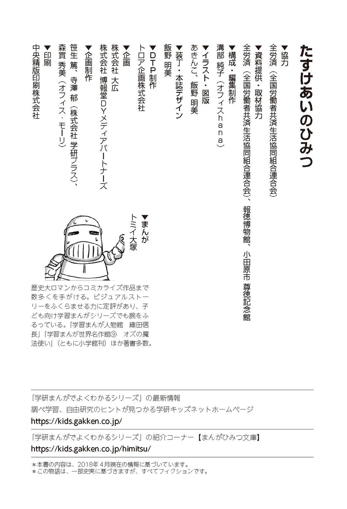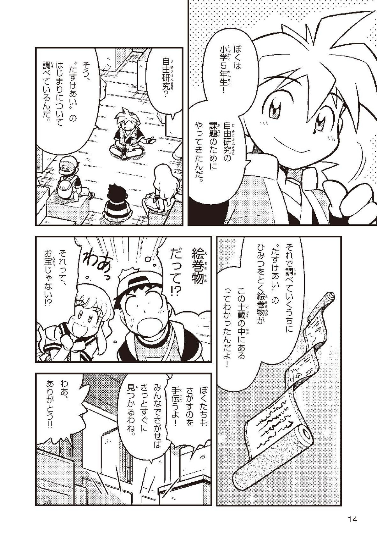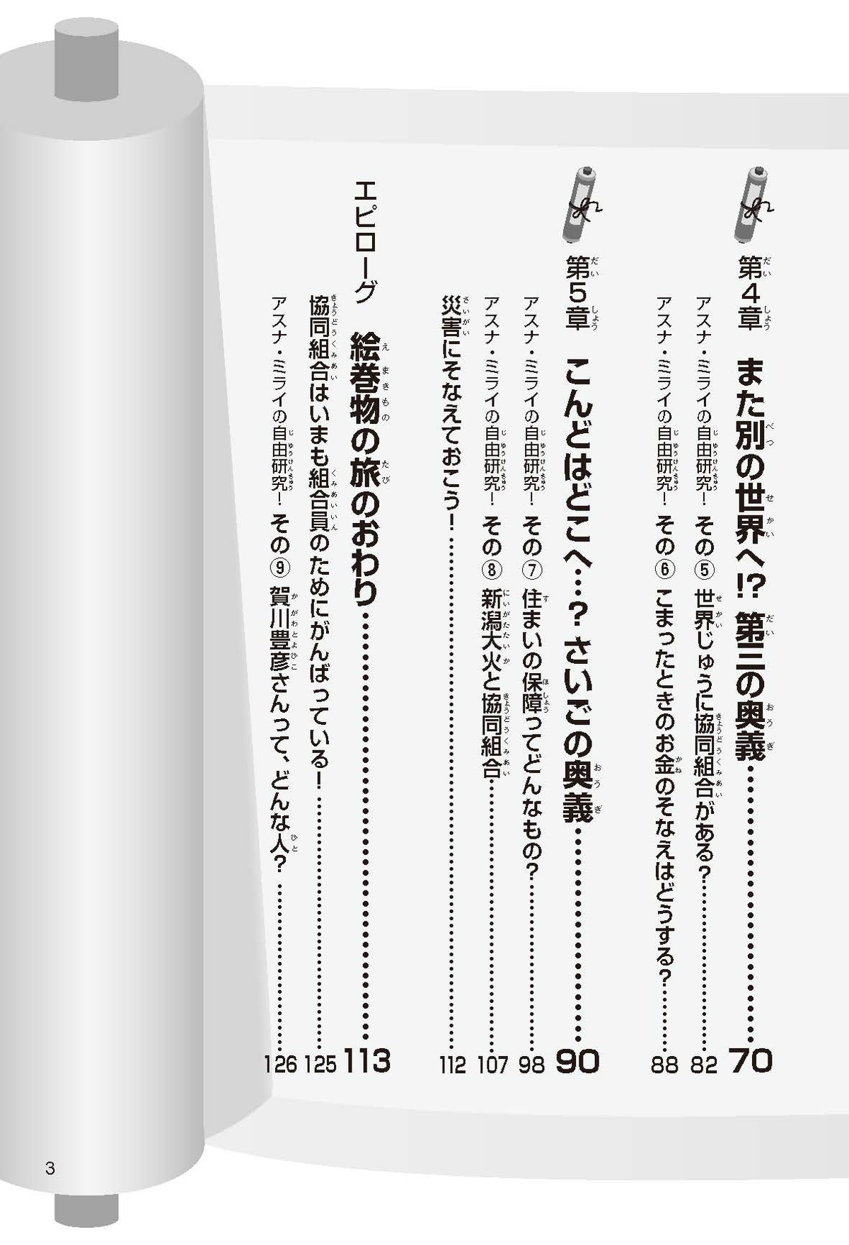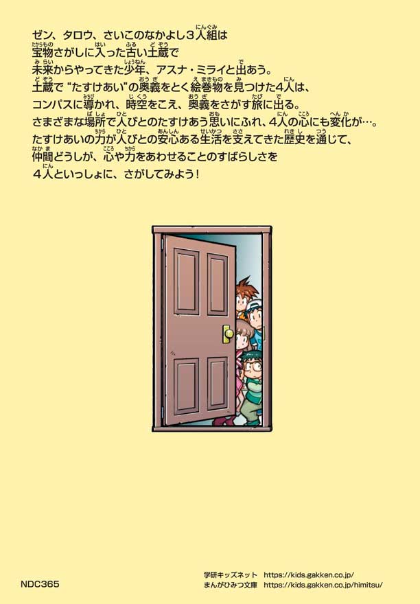 ゼン、タロウ、さいこのなかよし3人組は、宝物さがしに入った古い土蔵(どぞう)で、未来からやってきた少年、アスナ・ミライと出会い、ある絵巻物を発見! 時空をこえ、“たすけあい”の奥義(おうぎ)をさがす旅にでることに。さまざまな場所で人々のたすけあう思いにふれていくよ。たすけあいの力が人々の安心ある生活を支えてきた歴史を通じて、心や力をあわせることのすばらしさを4人と一緒にさがしてみよう!