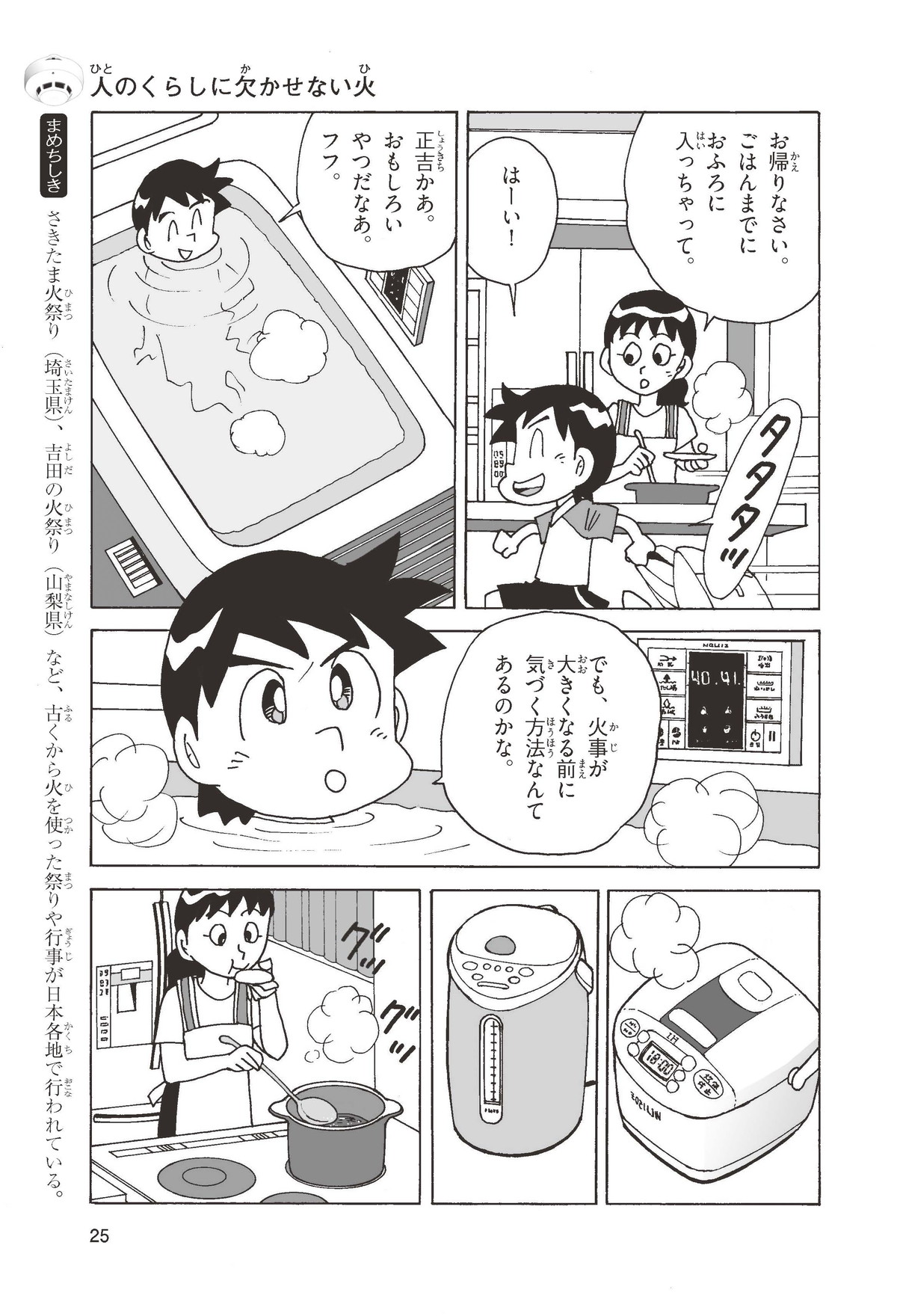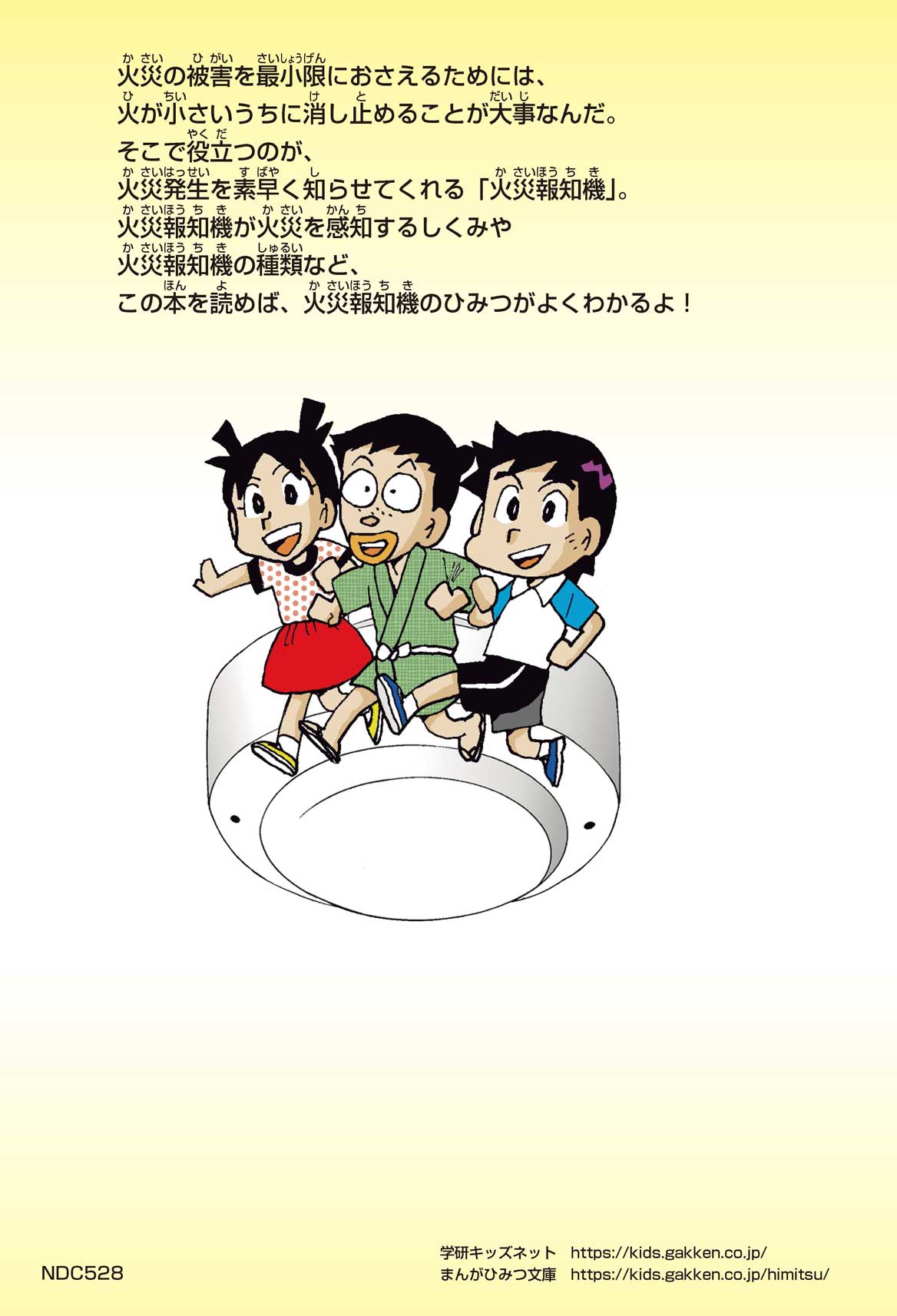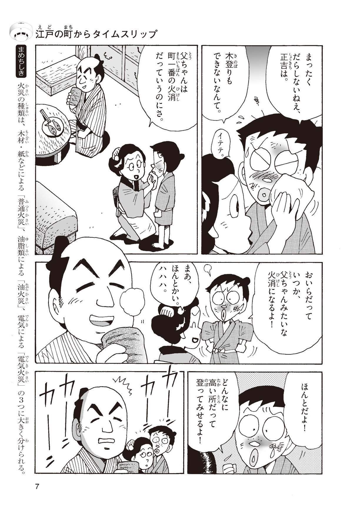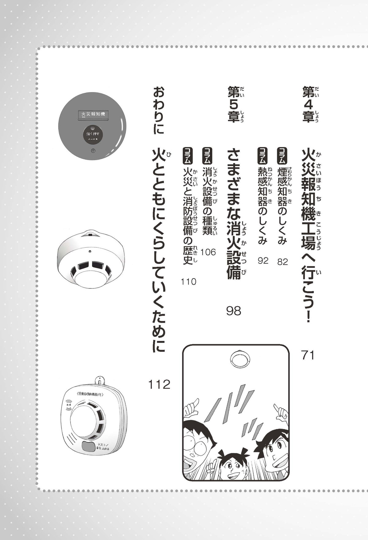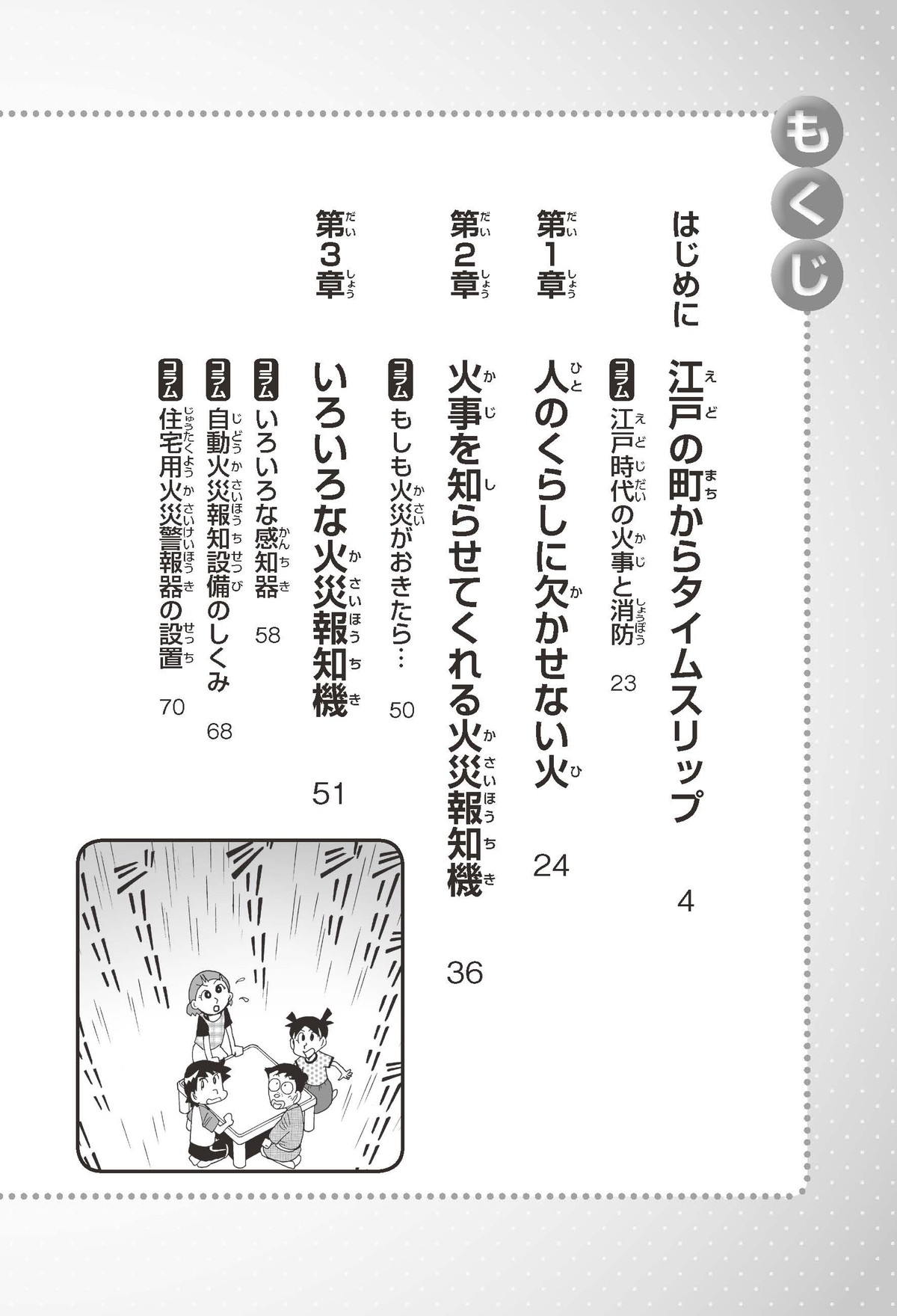 時は江戸時代、10さいの正吉(しょうきち)は、火事の火を消す火消(ひけし)である父ちゃんが心配で、火事にいち早く気づく方法を考えていたら、土手から落ちて現代にタイムスリップしちゃった!? 江戸時代に戻るため、現代で出会った小学5年生のハヤトとナナと一緒に、火事にいち早く気づくための装置……「火災報知機」についてしらべていくよ。いったいどうやって火事を見つけているのかな?