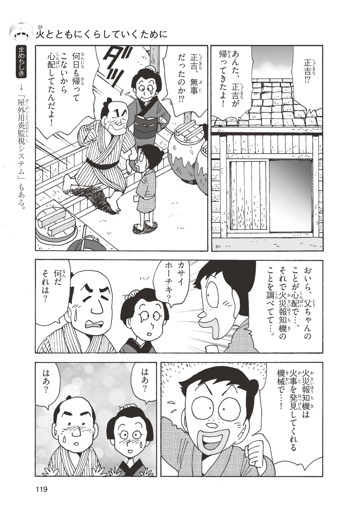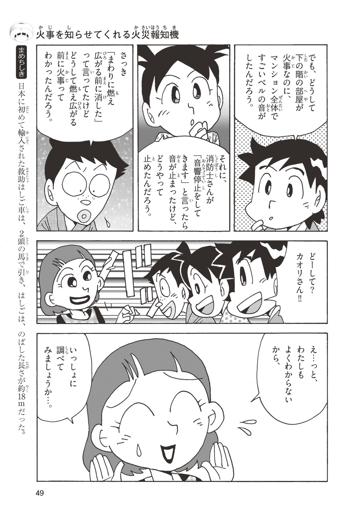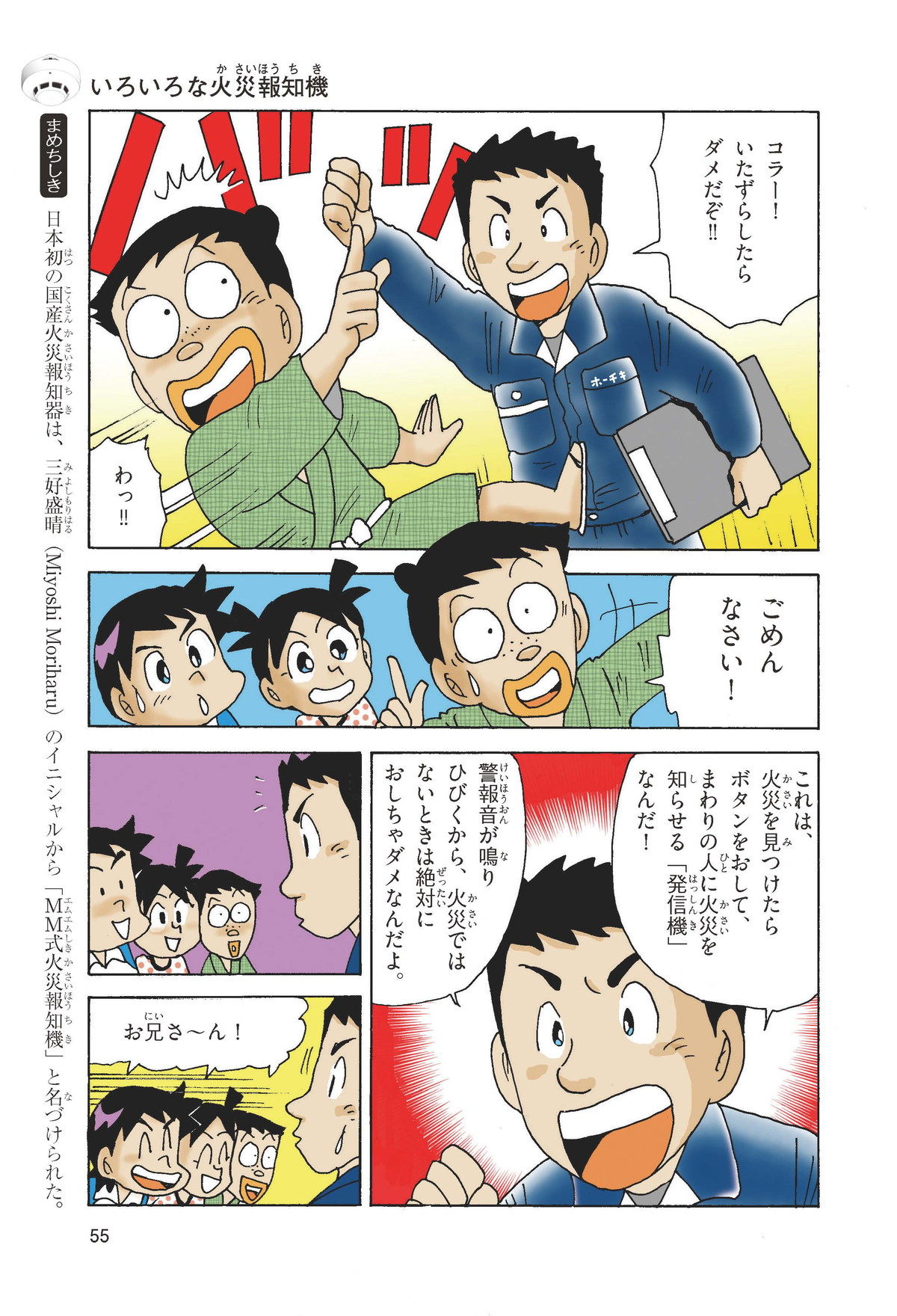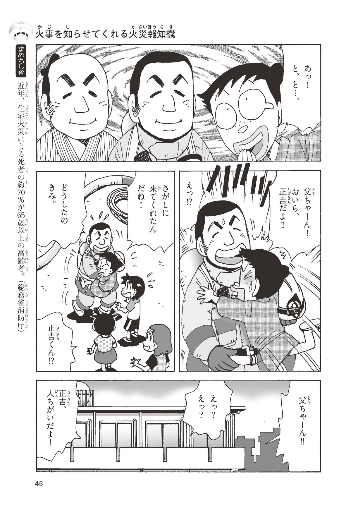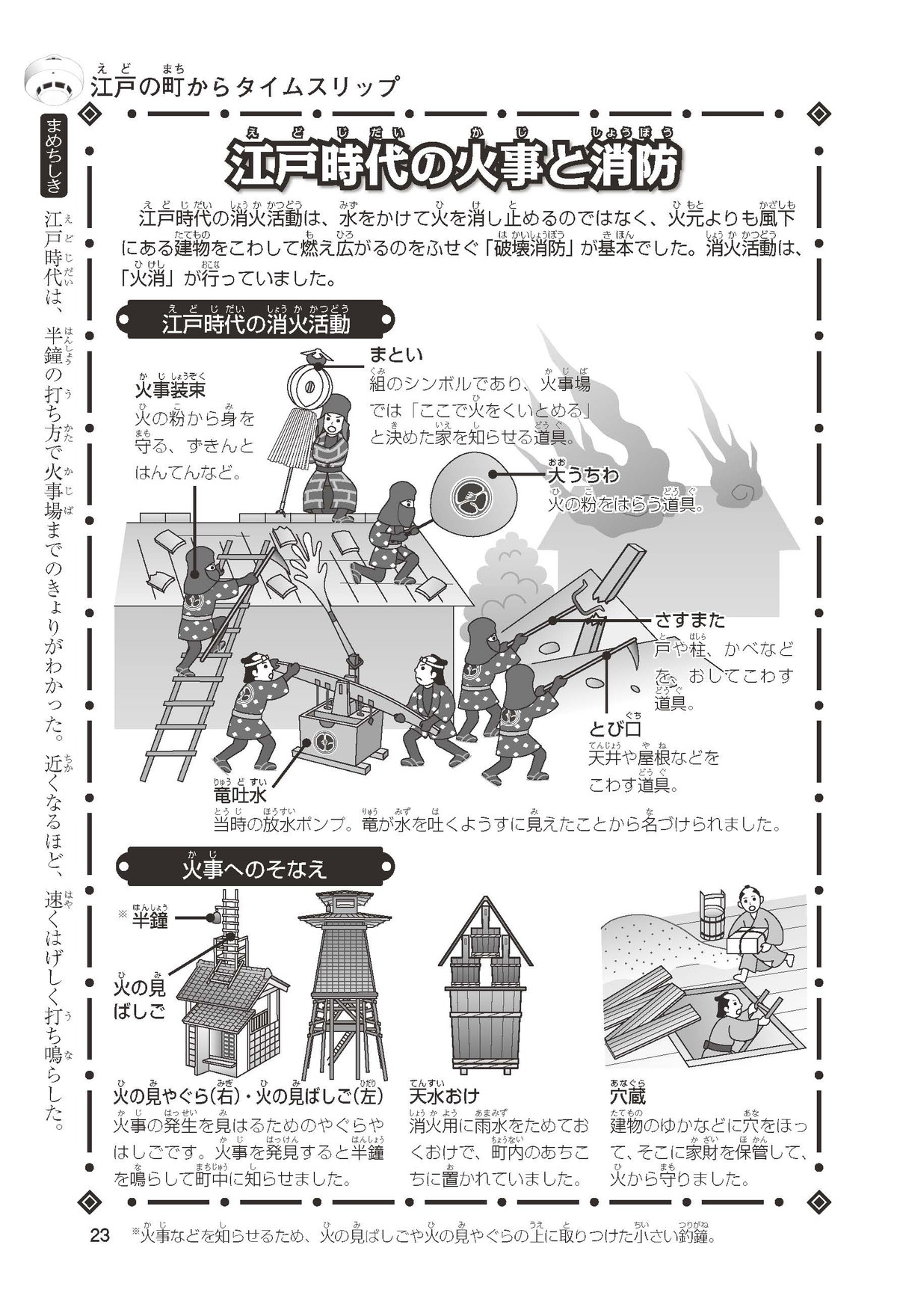 時は江戸時代、10さいの正吉(しょうきち)は、火事の火を消す火消(ひけし)である父ちゃんが心配で、火事にいち早く気づく方法を考えていたら、土手から落ちて現代にタイムスリップしちゃった!? 江戸時代に戻るため、現代で出会った小学5年生のハヤトとナナと一緒に、火事にいち早く気づくための装置……「火災報知機」についてしらべていくよ。いったいどうやって火事を見つけているのかな?