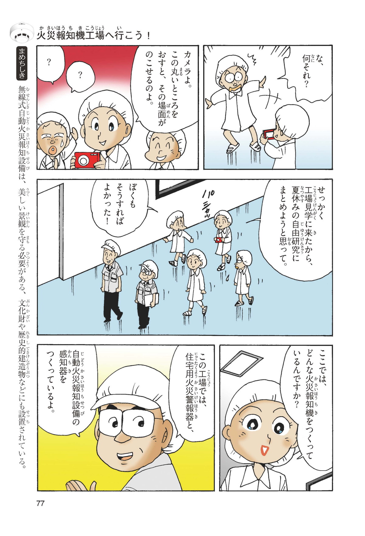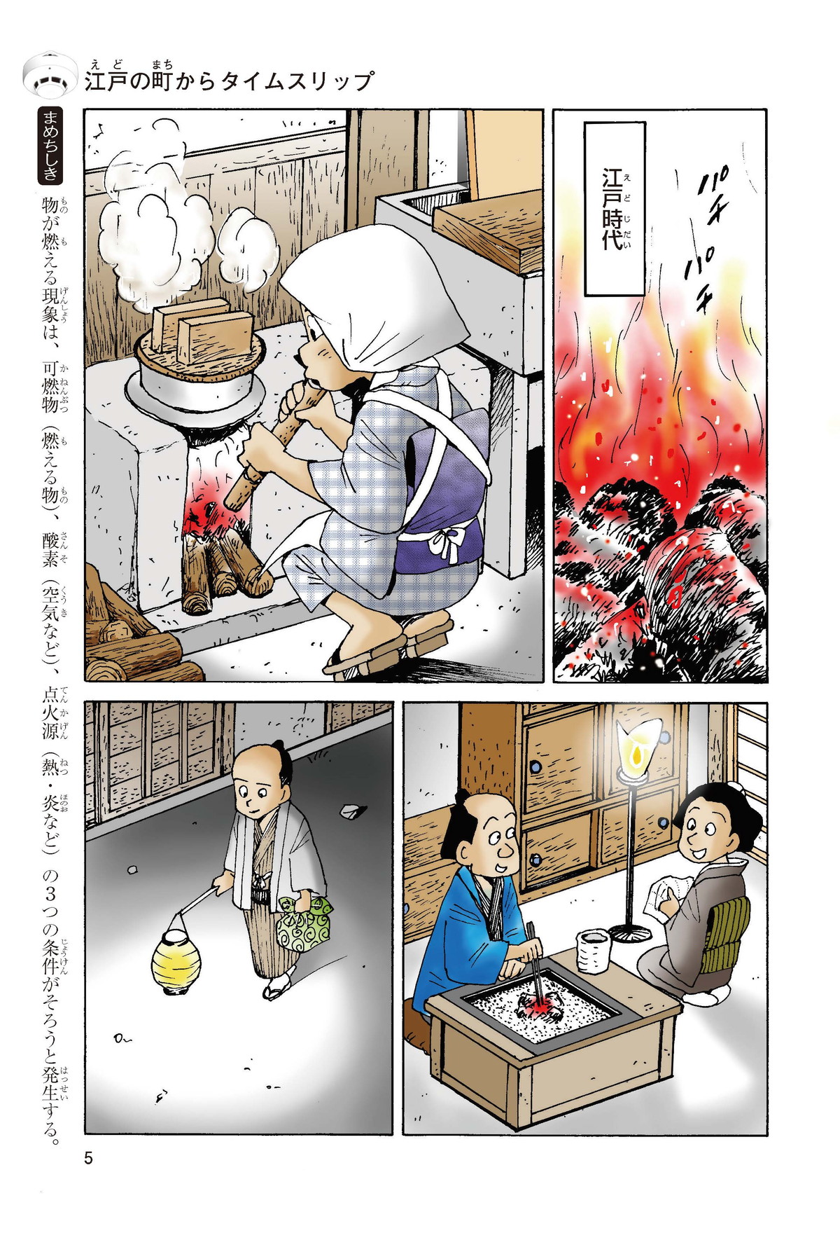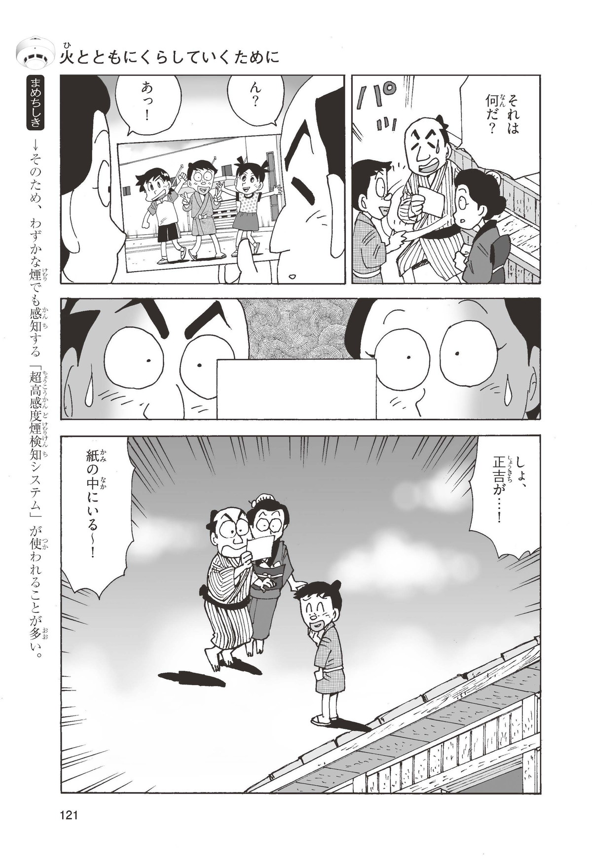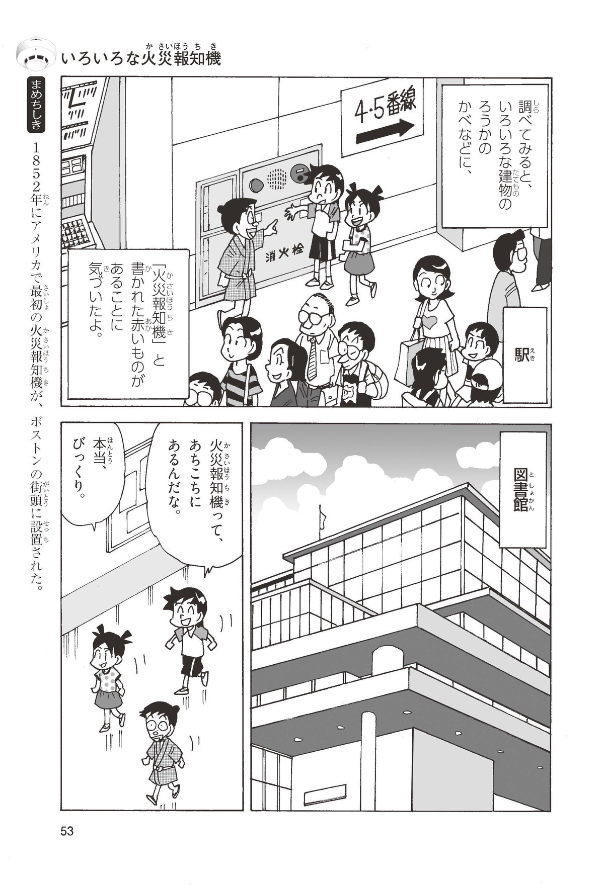 時は江戸時代、10さいの正吉(しょうきち)は、火事の火を消す火消(ひけし)である父ちゃんが心配で、火事にいち早く気づく方法を考えていたら、土手から落ちて現代にタイムスリップしちゃった!? 江戸時代に戻るため、現代で出会った小学5年生のハヤトとナナと一緒に、火事にいち早く気づくための装置……「火災報知機」についてしらべていくよ。いったいどうやって火事を見つけているのかな?