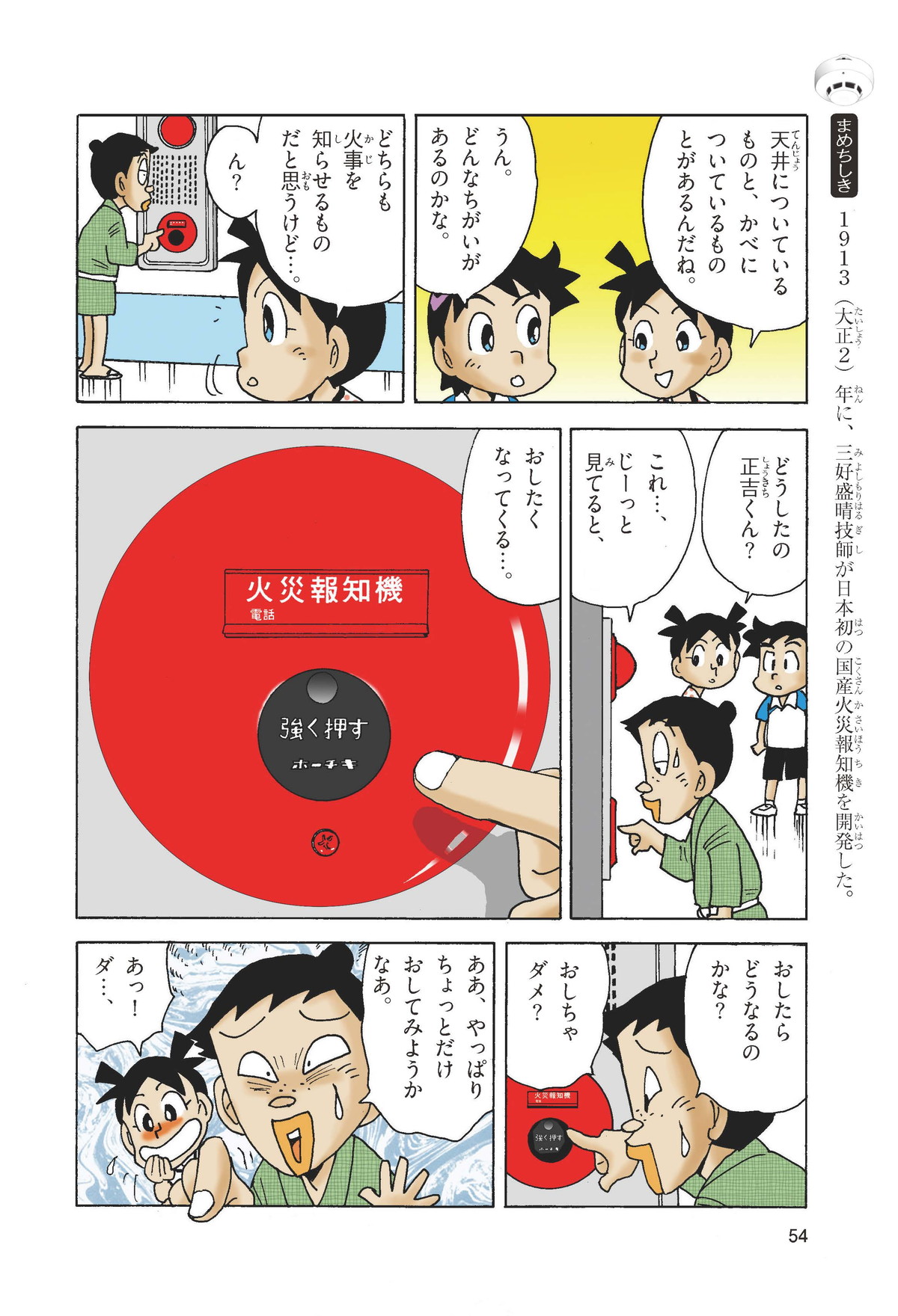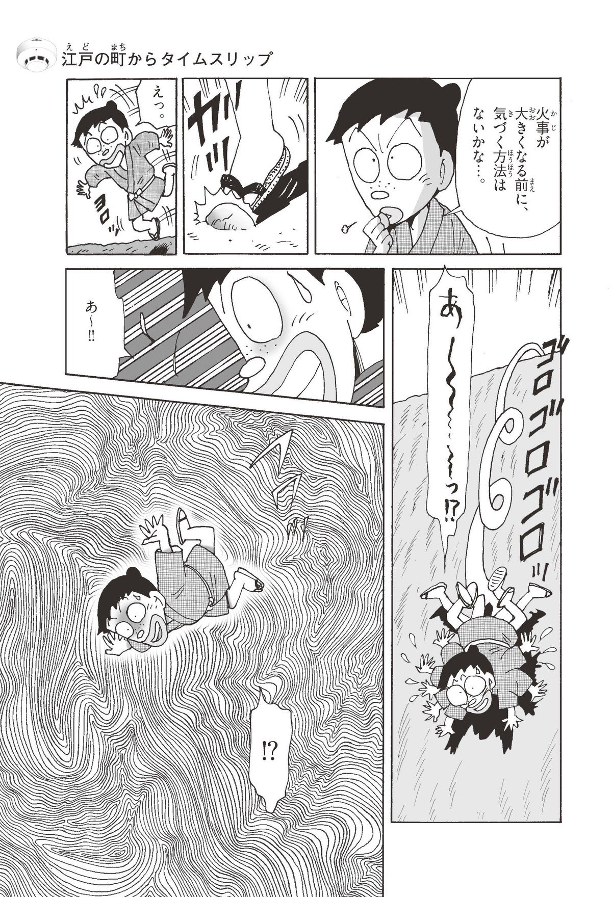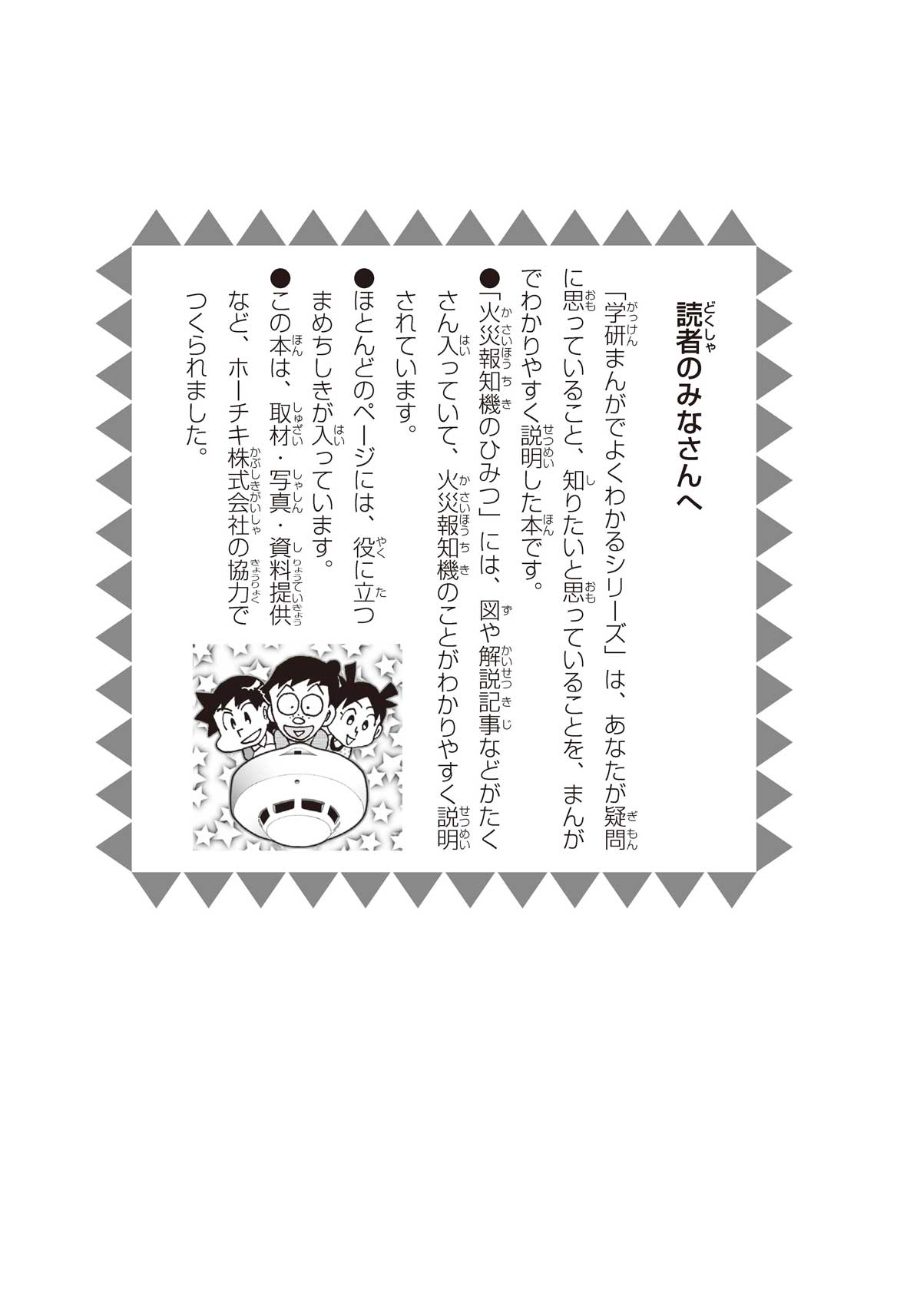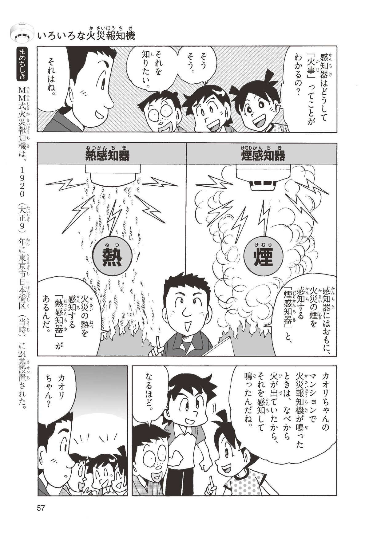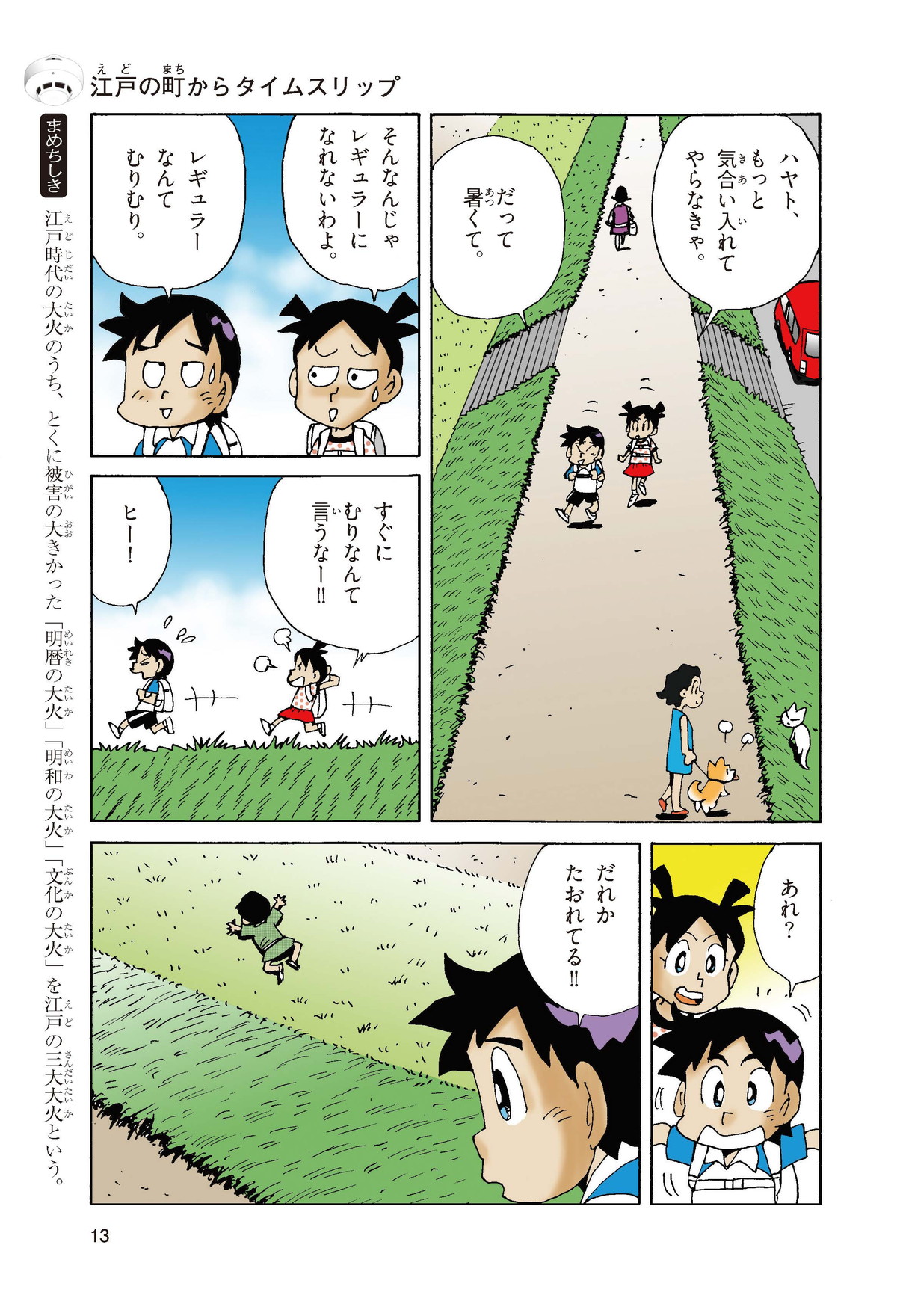時は江戸時代、10さいの正吉(しょうきち)は、火事の火を消す火消(ひけし)である父ちゃんが心配で、火事にいち早く気づく方法を考えていたら、土手から落ちて現代にタイムスリップしちゃった!? 江戸時代に戻るため、現代で出会った小学5年生のハヤトとナナと一緒に、火事にいち早く気づくための装置……「火災報知機」についてしらべていくよ。いったいどうやって火事を見つけているのかな?