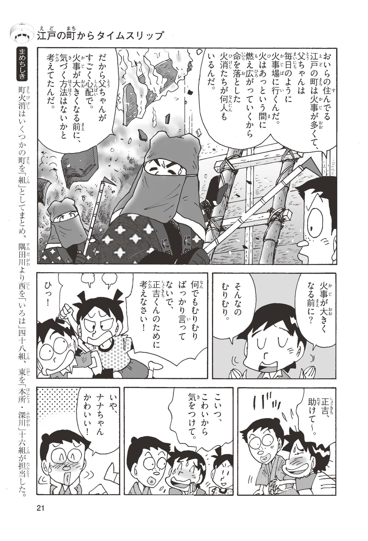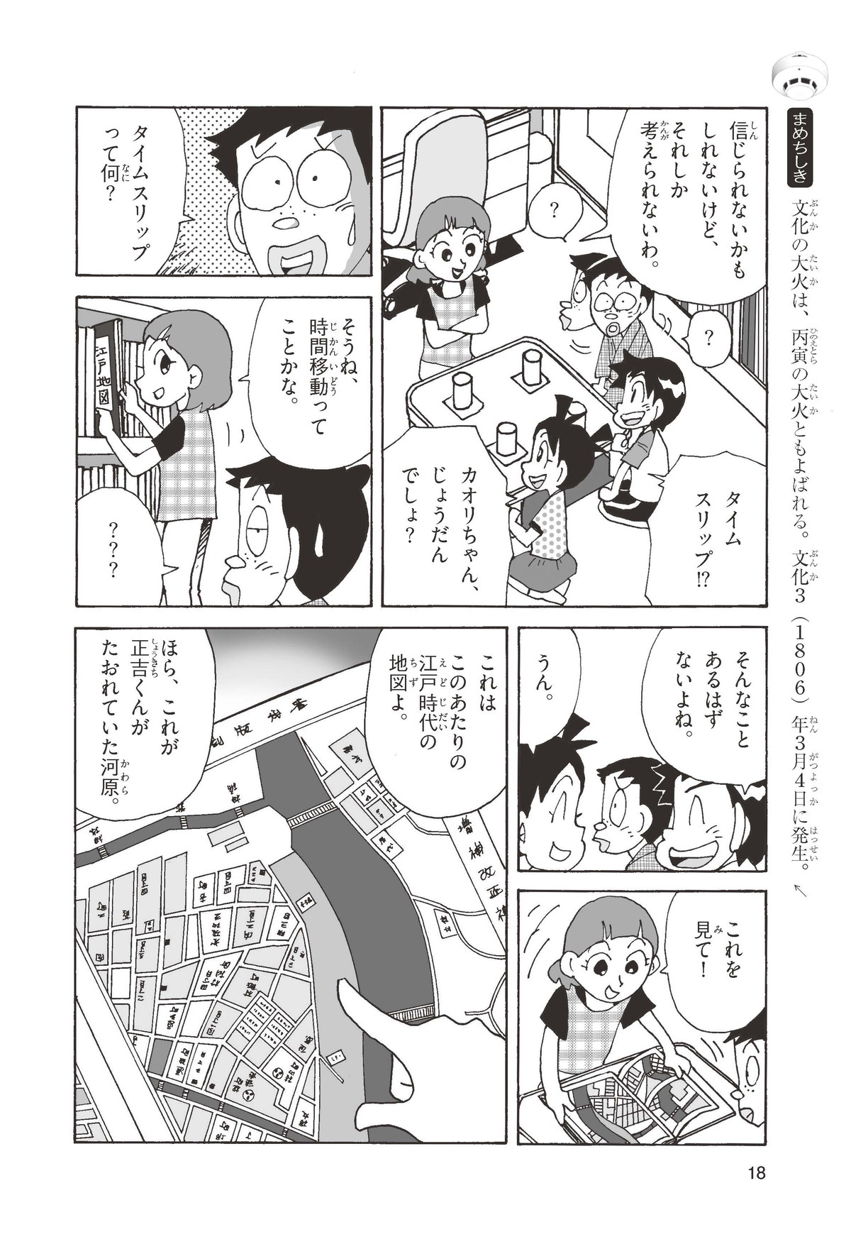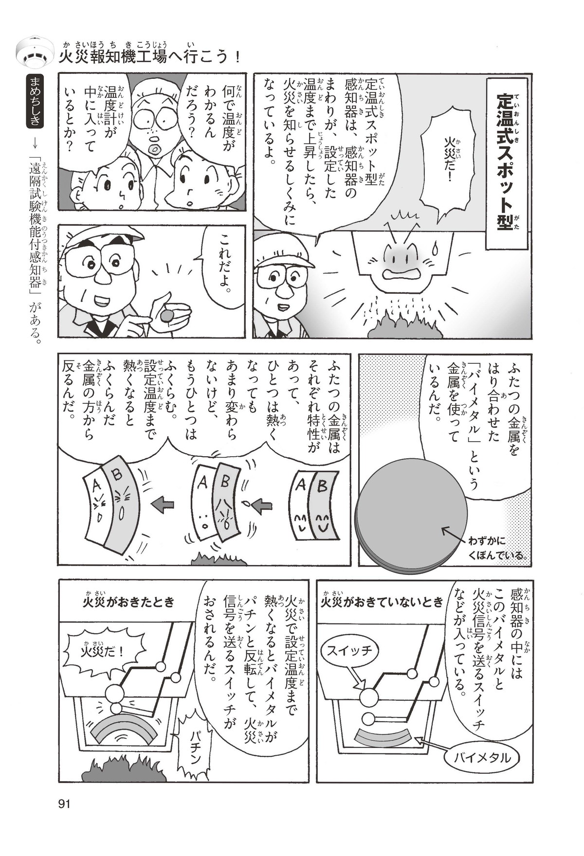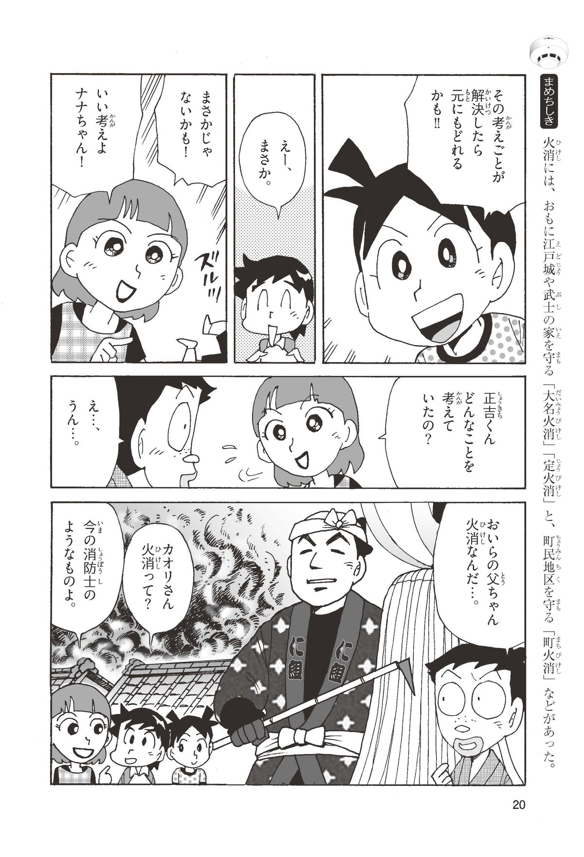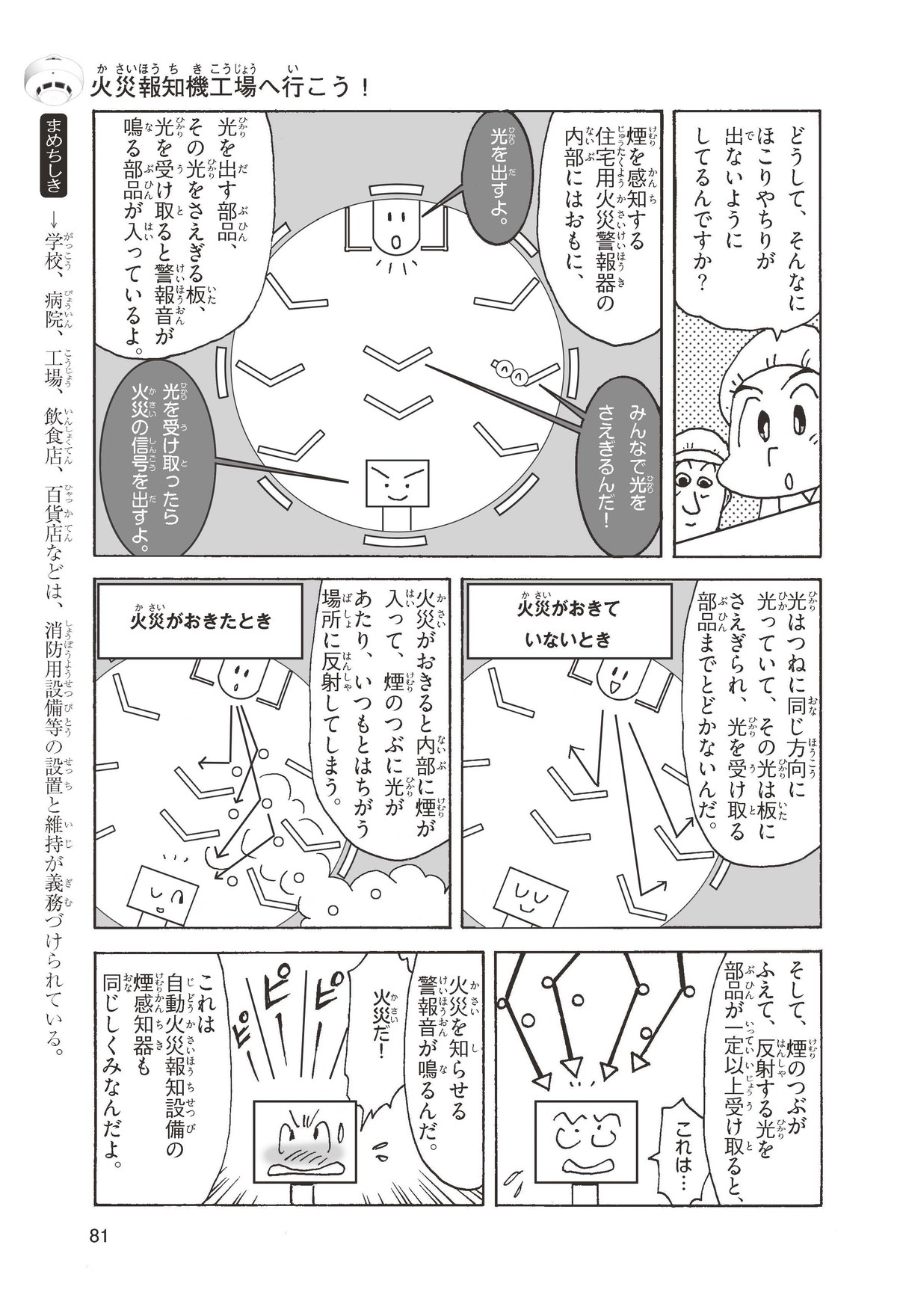 時は江戸時代、10さいの正吉(しょうきち)は、火事の火を消す火消(ひけし)である父ちゃんが心配で、火事にいち早く気づく方法を考えていたら、土手から落ちて現代にタイムスリップしちゃった!? 江戸時代に戻るため、現代で出会った小学5年生のハヤトとナナと一緒に、火事にいち早く気づくための装置……「火災報知機」についてしらべていくよ。いったいどうやって火事を見つけているのかな?
