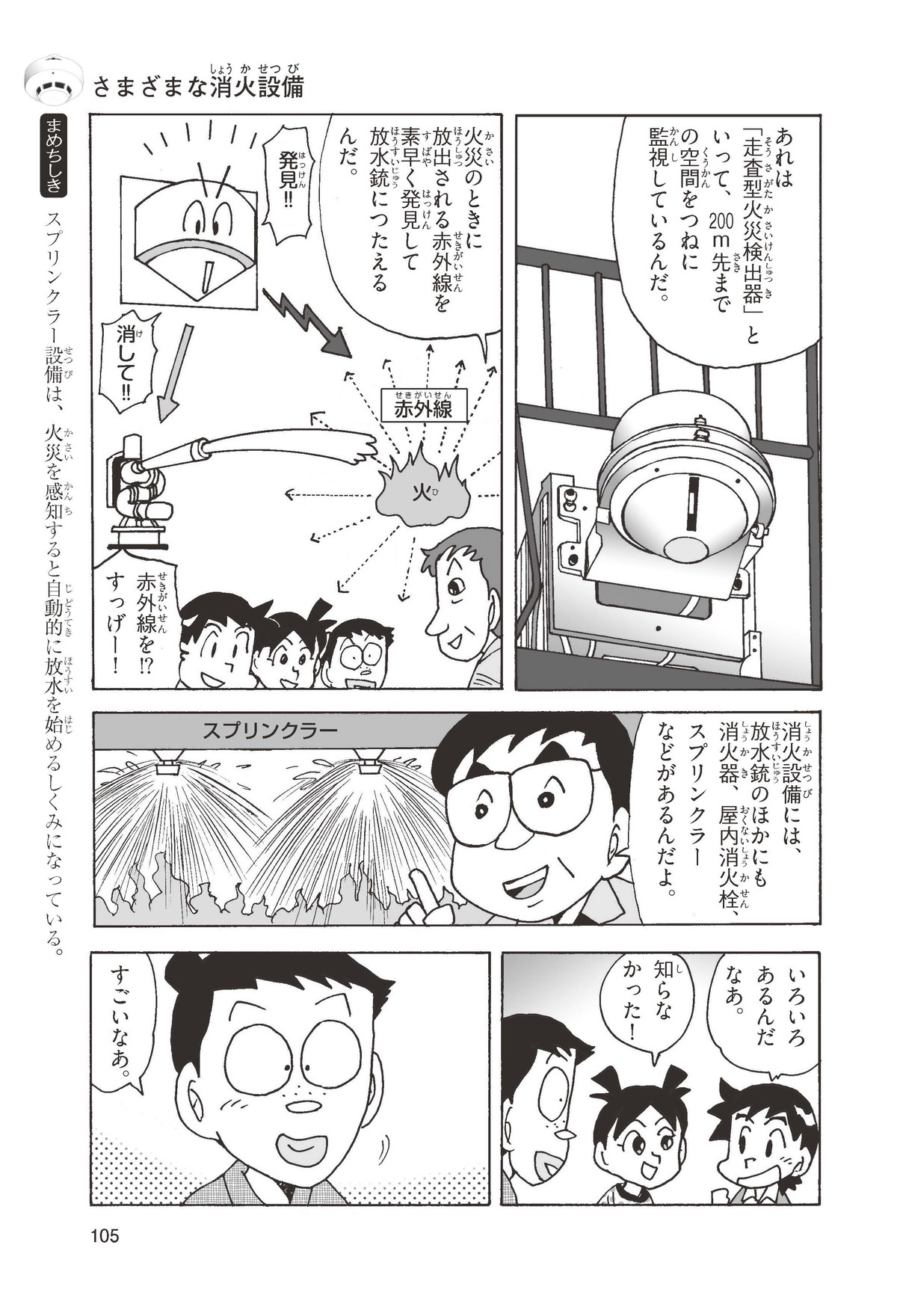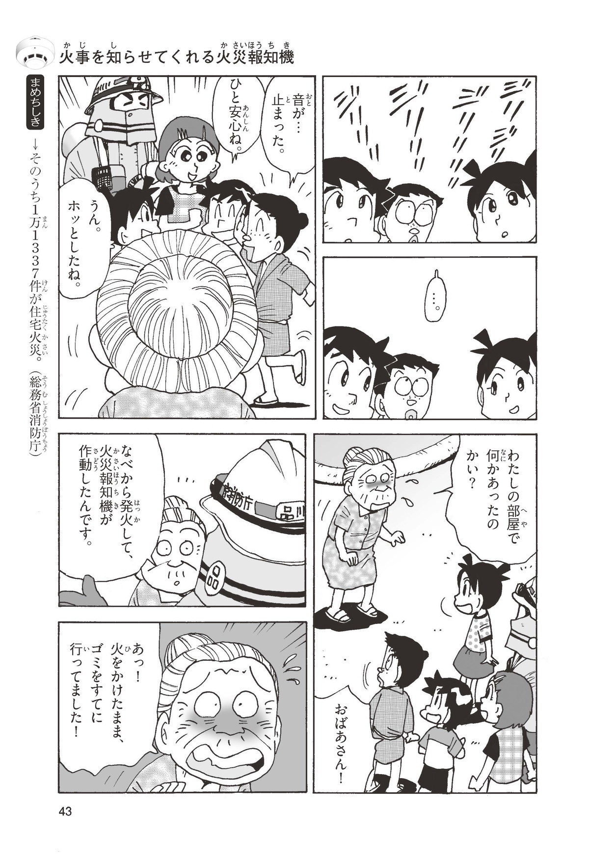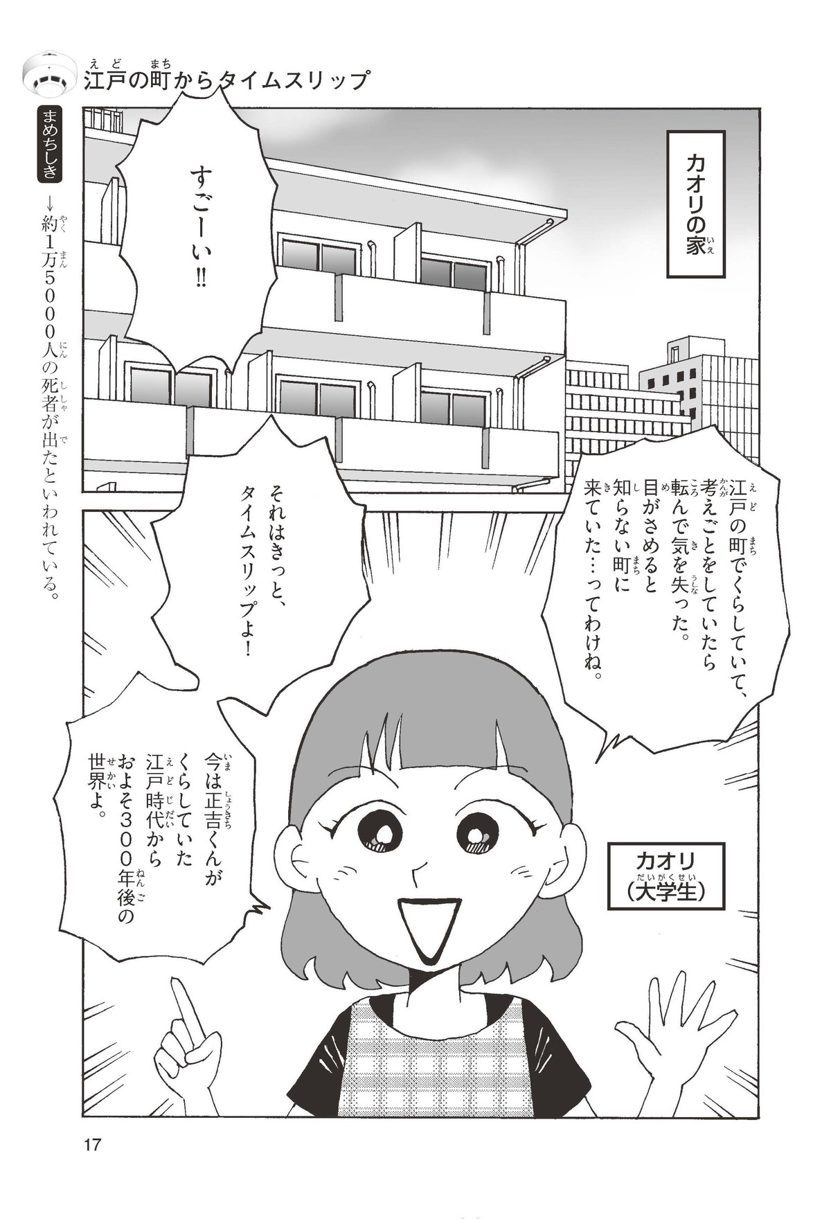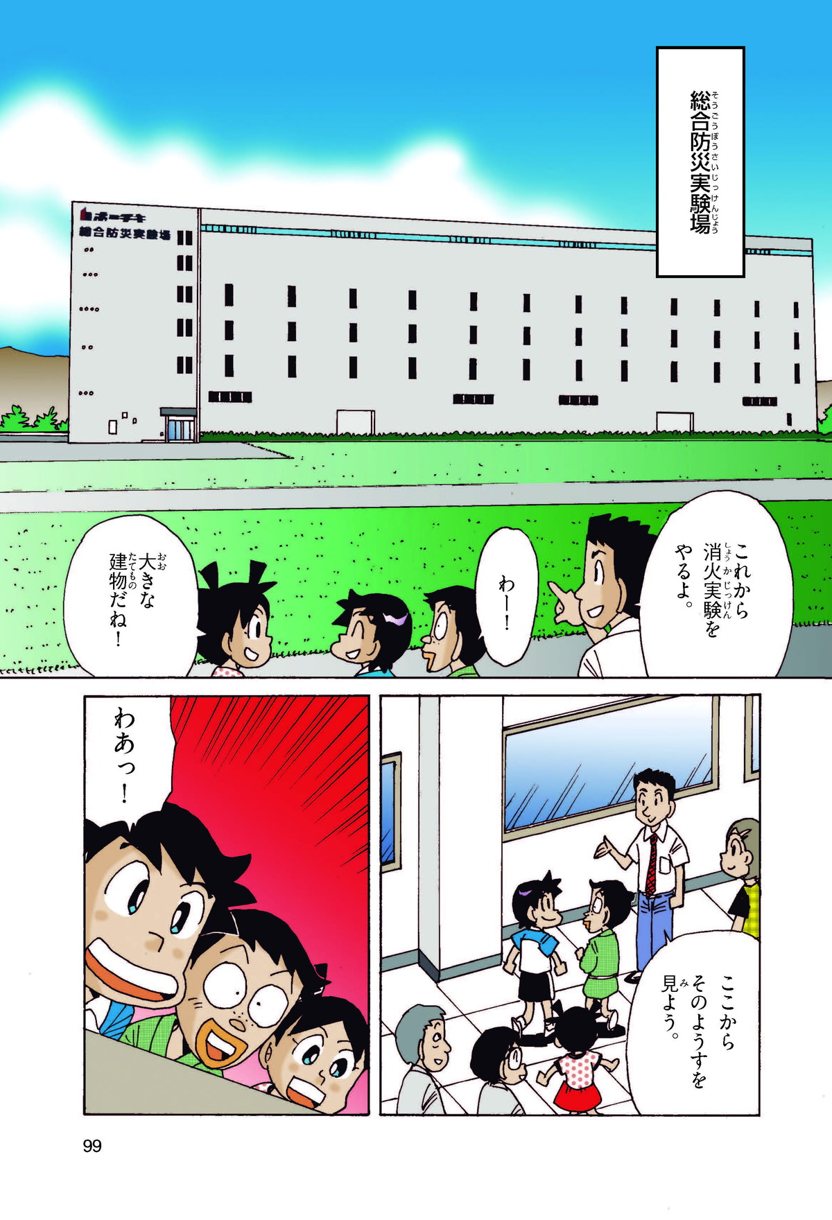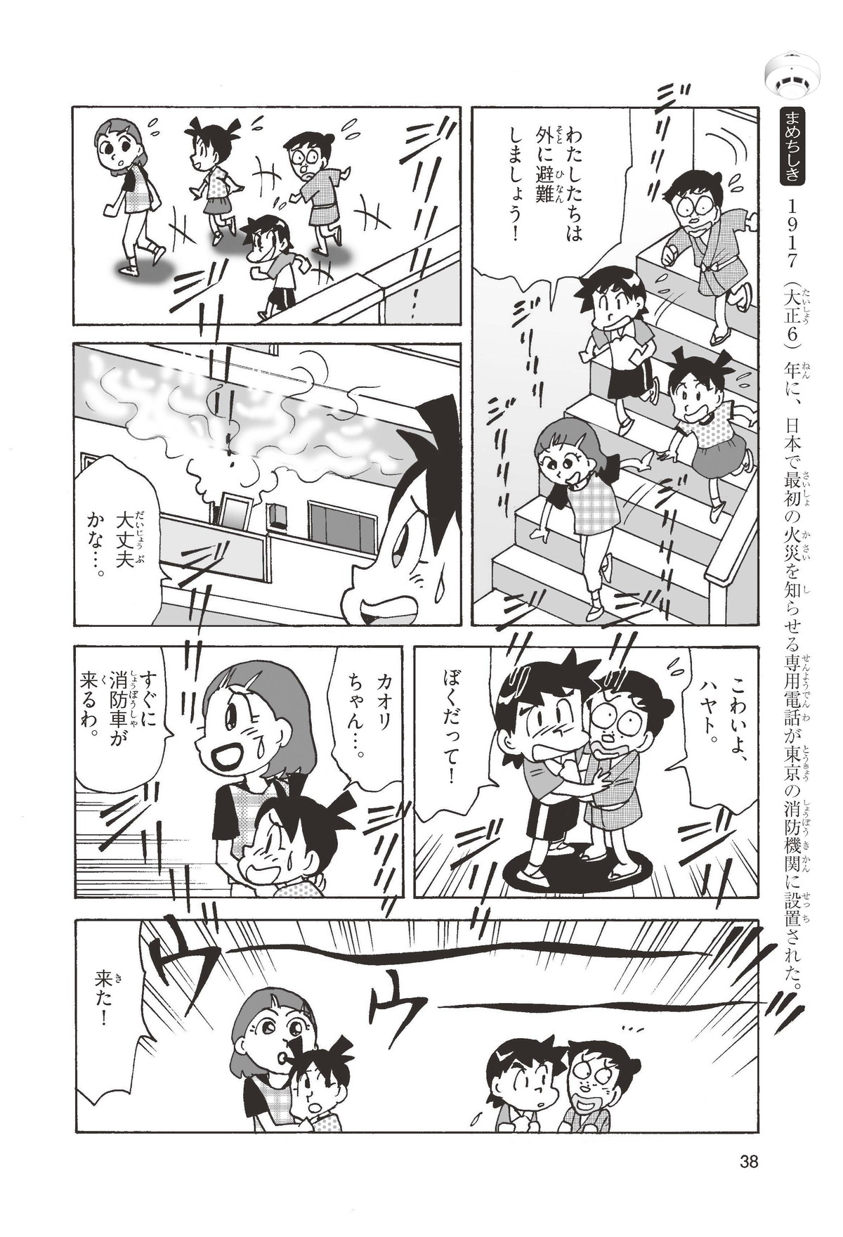 時は江戸時代、10さいの正吉(しょうきち)は、火事の火を消す火消(ひけし)である父ちゃんが心配で、火事にいち早く気づく方法を考えていたら、土手から落ちて現代にタイムスリップしちゃった!? 江戸時代に戻るため、現代で出会った小学5年生のハヤトとナナと一緒に、火事にいち早く気づくための装置……「火災報知機」についてしらべていくよ。いったいどうやって火事を見つけているのかな?