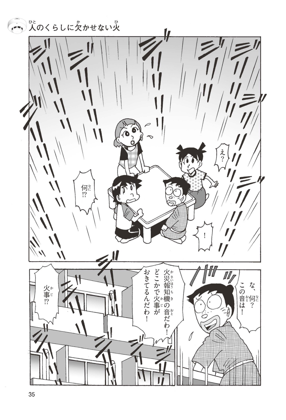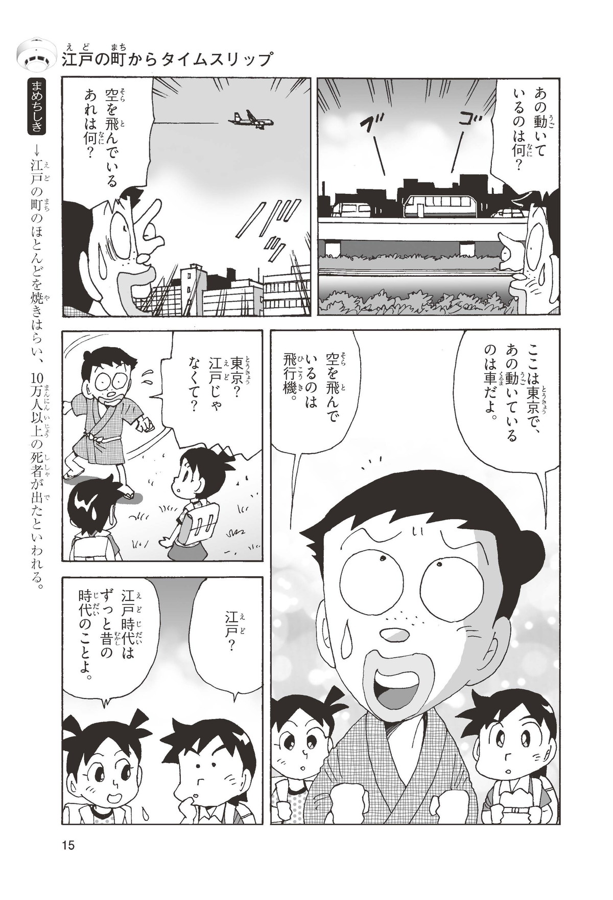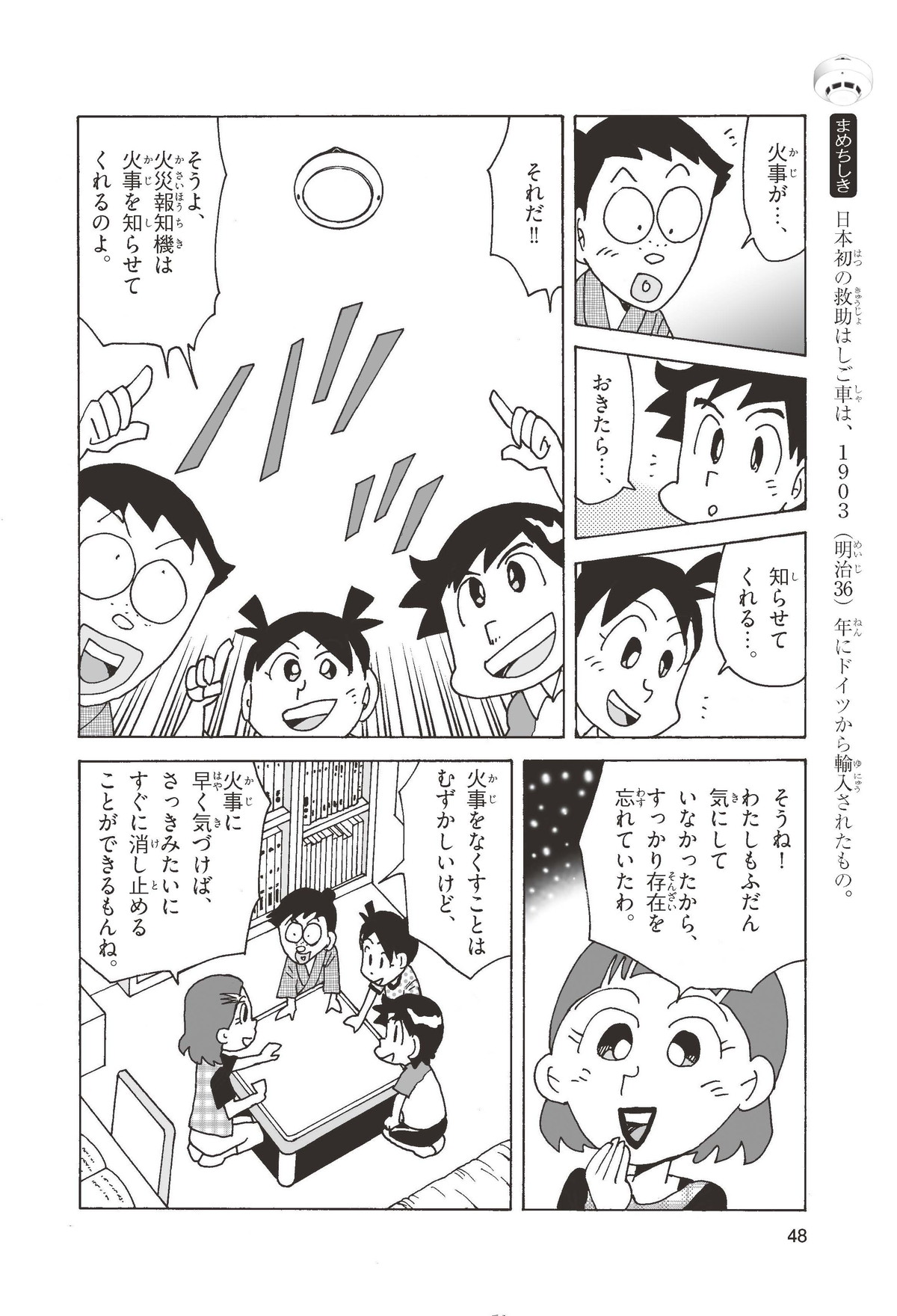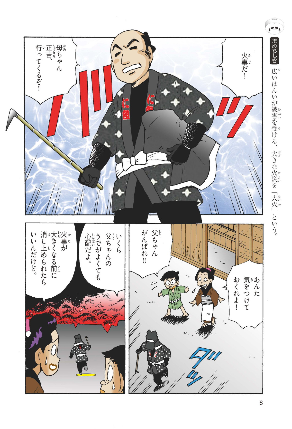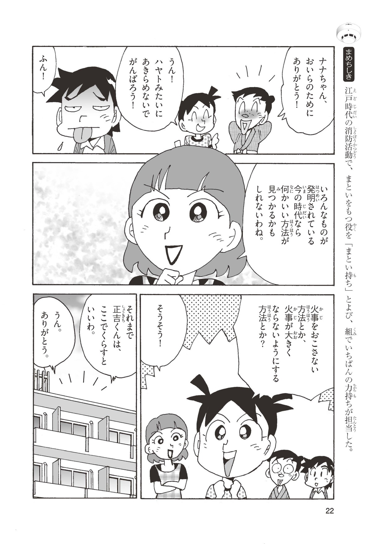時は江戸時代、10さいの正吉(しょうきち)は、火事の火を消す火消(ひけし)である父ちゃんが心配で、火事にいち早く気づく方法を考えていたら、土手から落ちて現代にタイムスリップしちゃった!? 江戸時代に戻るため、現代で出会った小学5年生のハヤトとナナと一緒に、火事にいち早く気づくための装置……「火災報知機」についてしらべていくよ。いったいどうやって火事を見つけているのかな?