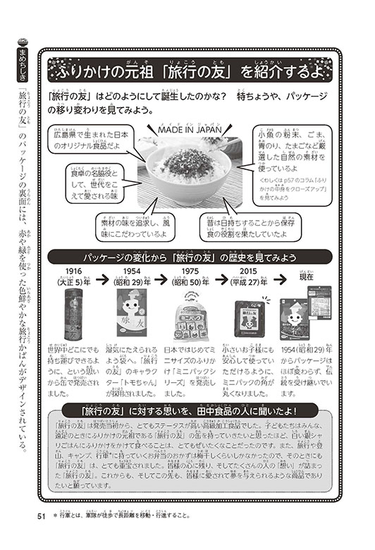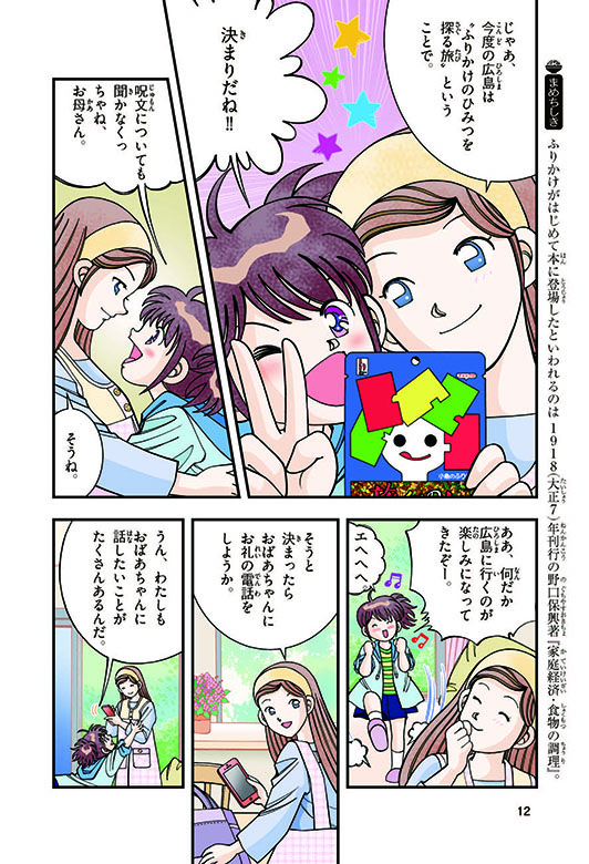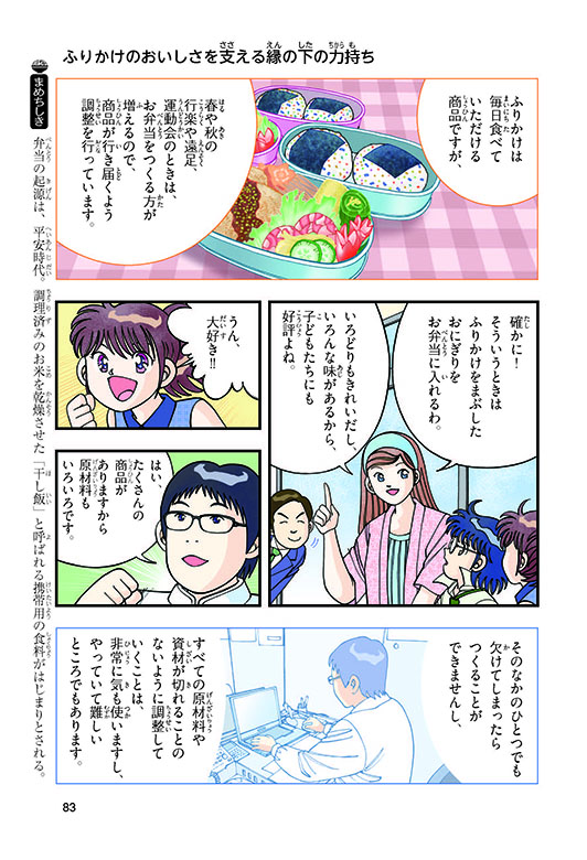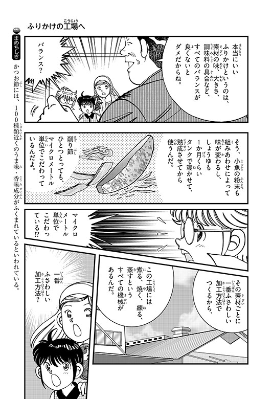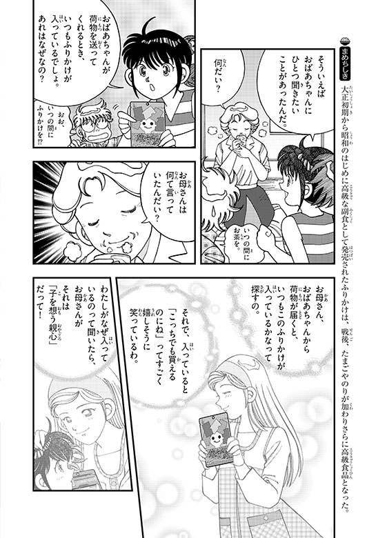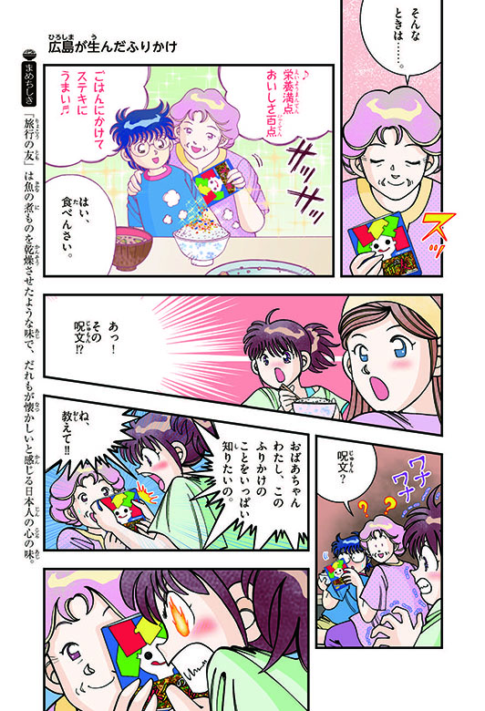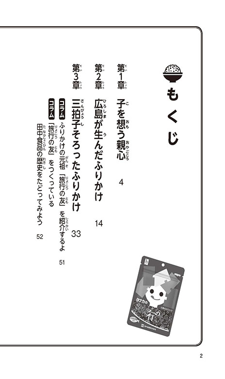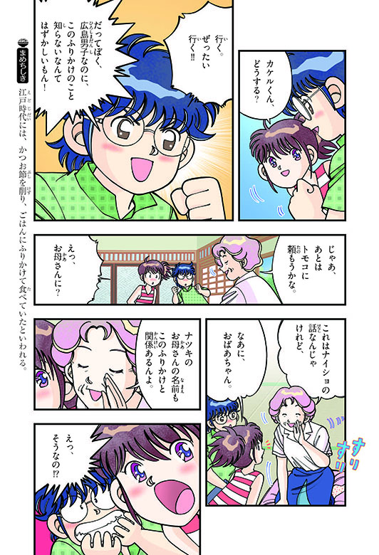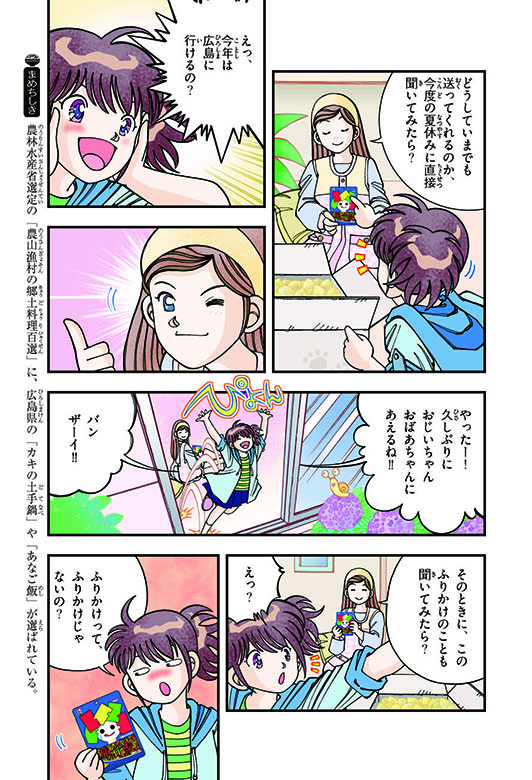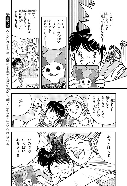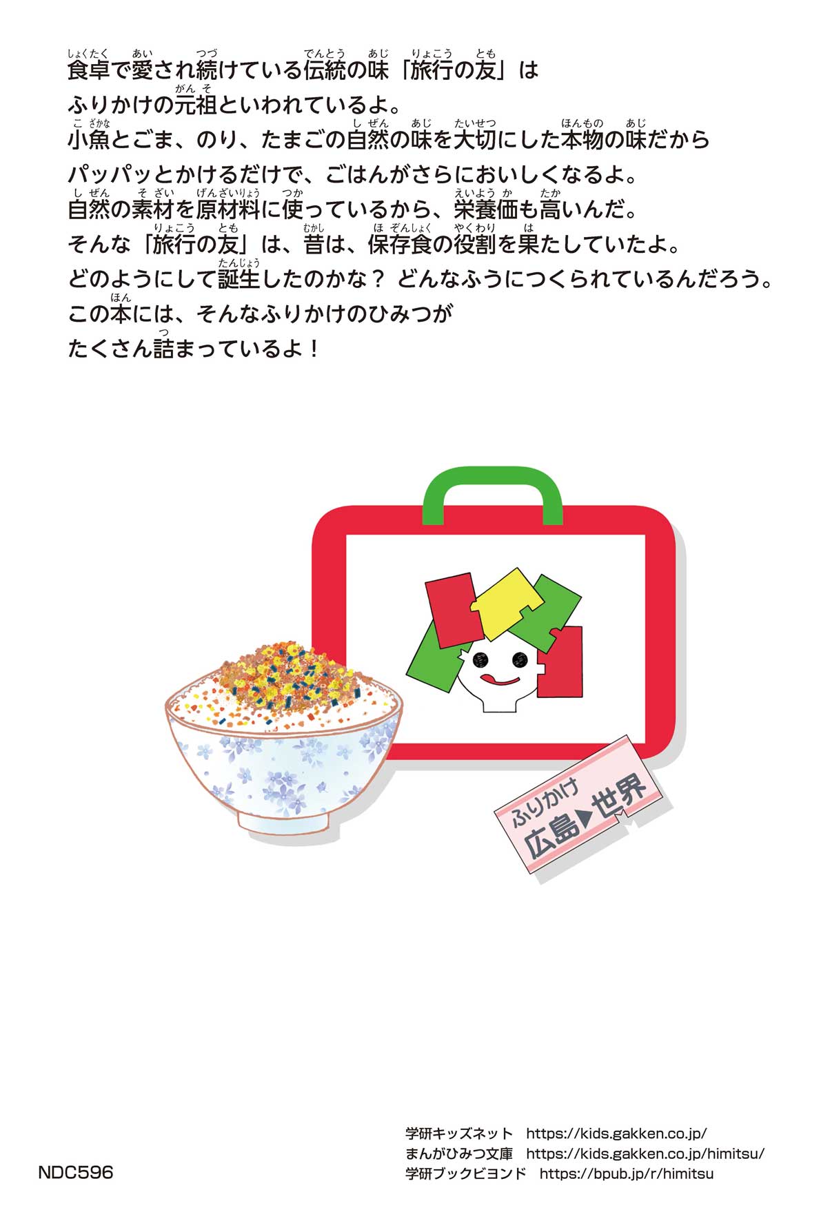 広島のおばあちゃんからの荷物にいつも入っている「ふりかけ」が気になる、小学5年生のナツキ。この「旅行の友」はふりかけの元祖といわれていて、パッパッとかけるだけで、ごはんがさらにおいしくなるよ。自然の素材を使っていて栄養価も高く、保存食でもあったんだって。いったいどうやって生まれて、どんなふうにつくられているんだろう。親戚のカケルといっしょに、ひみつをさぐりにいくよ。