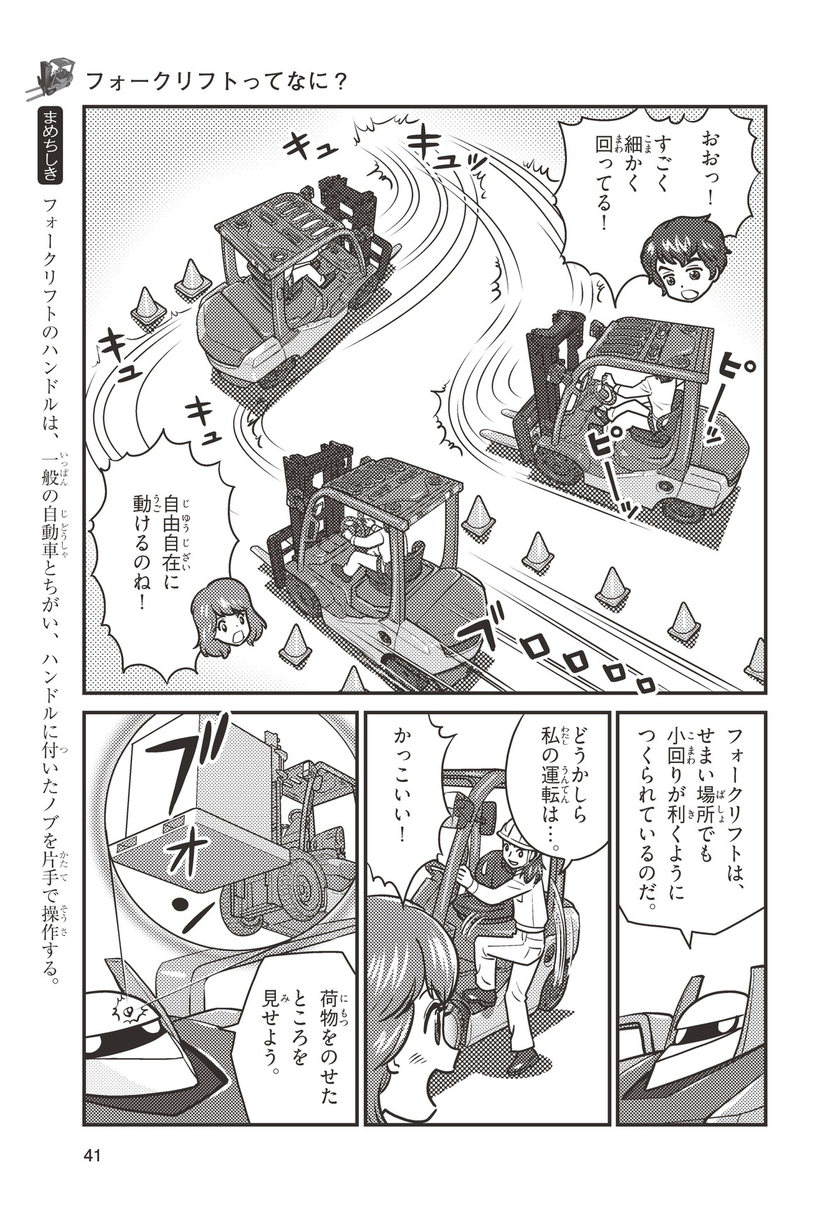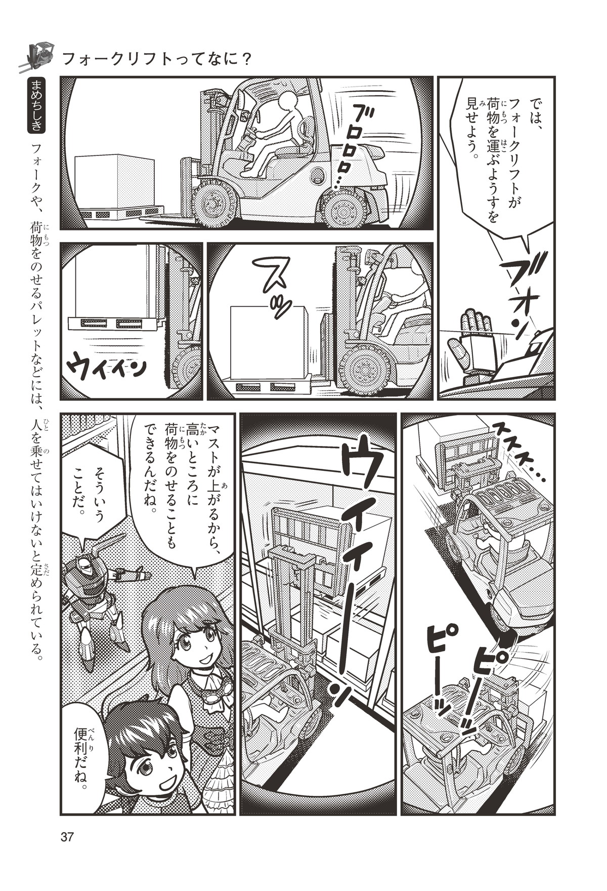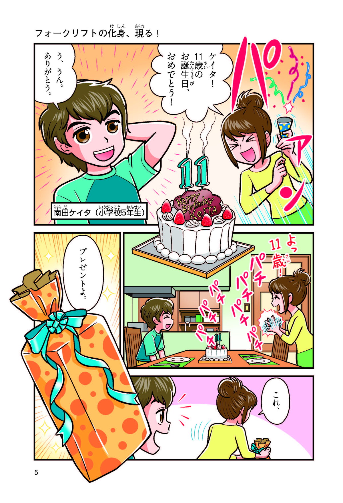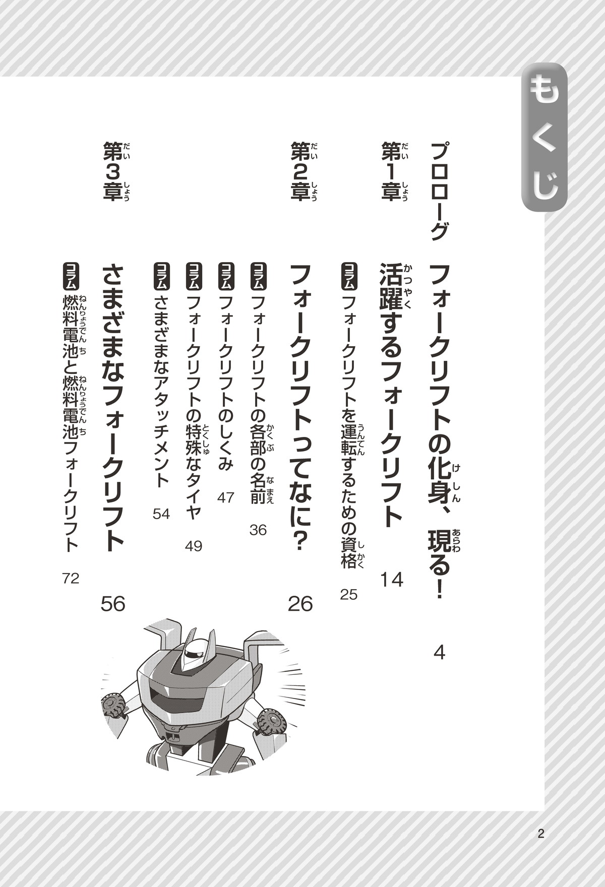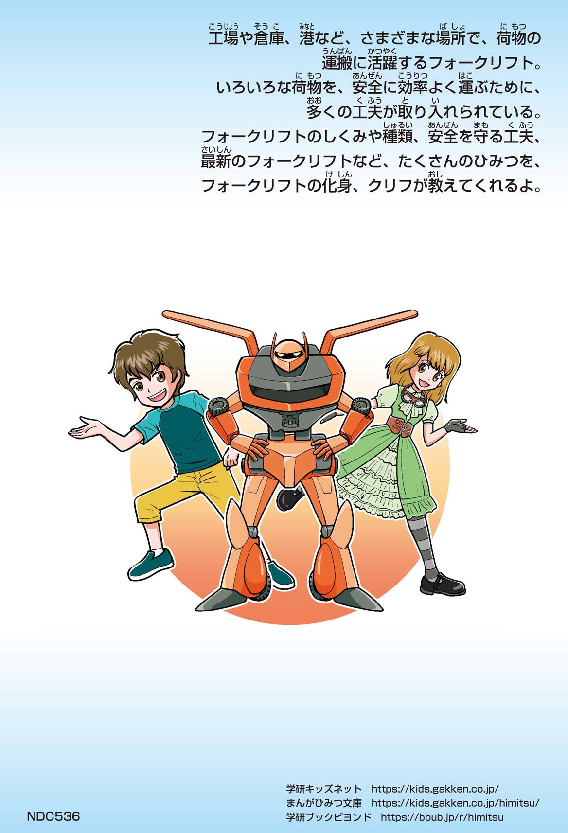 お父さんから誕生日プレゼントに「フォークリフト」のラジコンをもらった、小学5年生のケイタ。フォークリフトとは、工場や倉庫、港などで、荷物の運搬に活躍する自動車のこと。荷物を安全に効率よく運ぶために、多くの工夫がされているんだ。そんなフォークリフトのしくみや種類、最新のフォークリフトなど、たくさんのひみつを、フォークリフトの化身、クリフが教えてくれるよ。